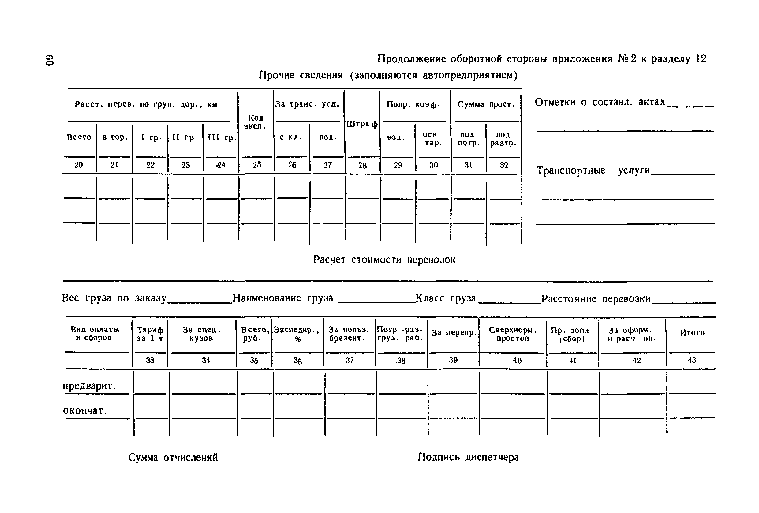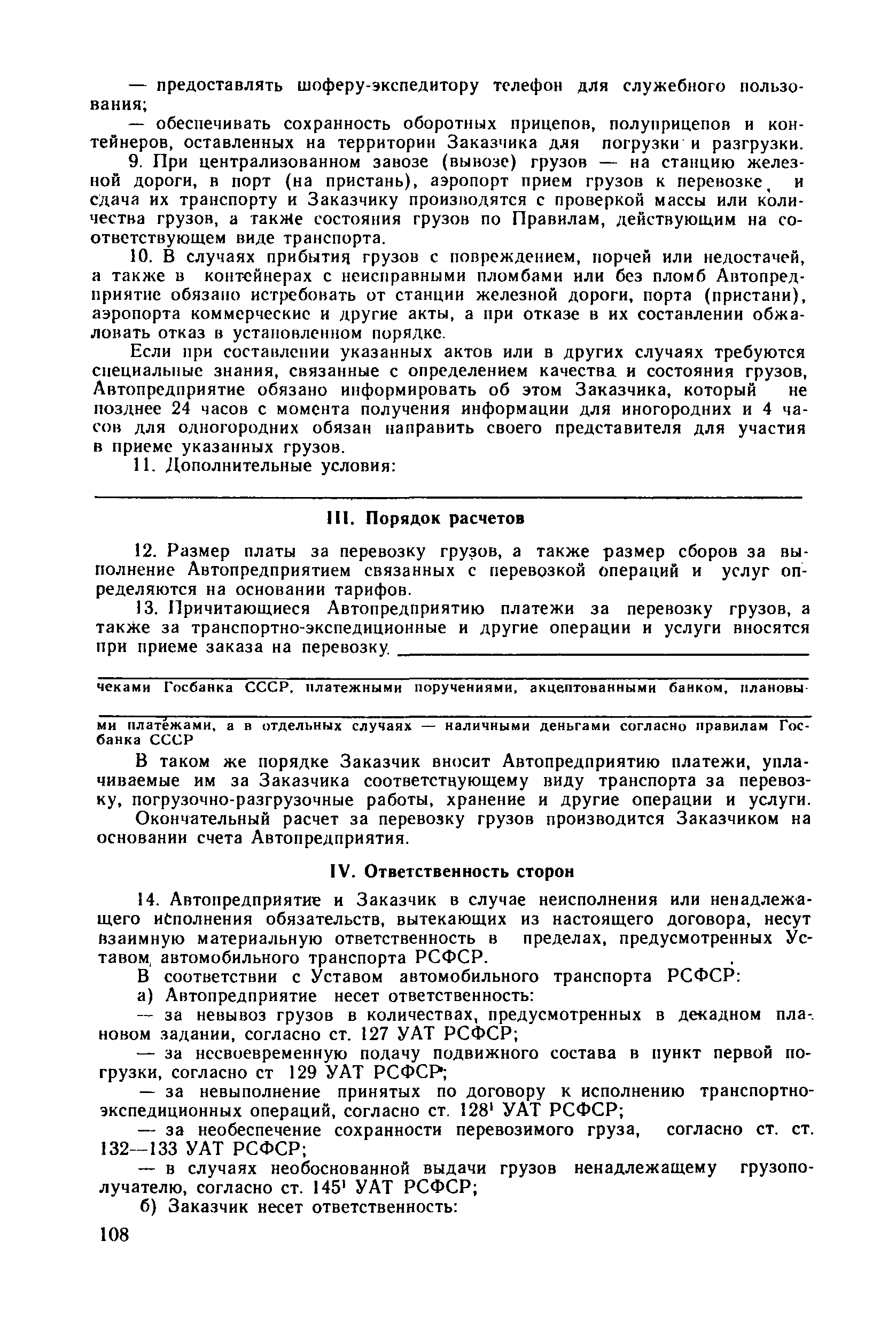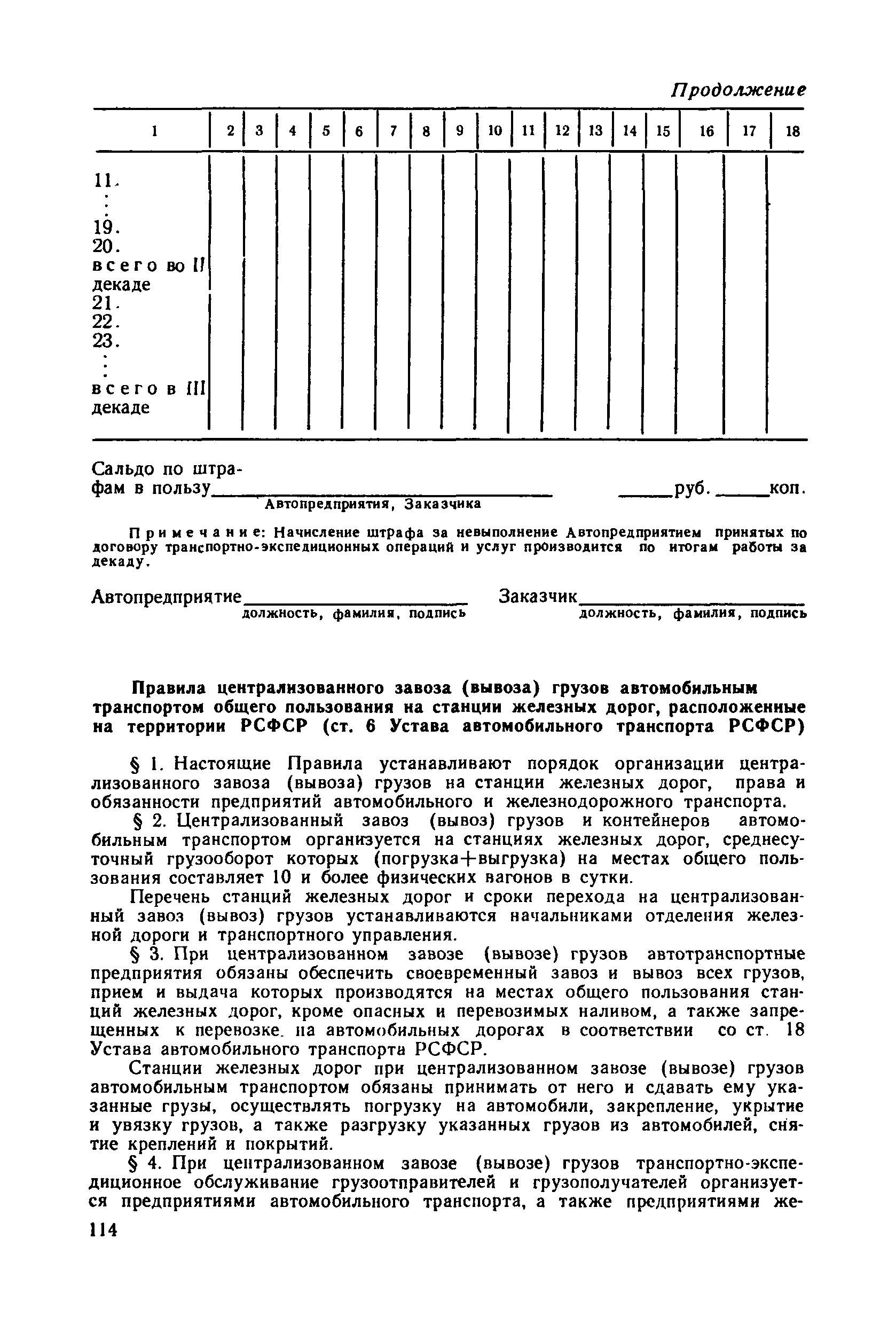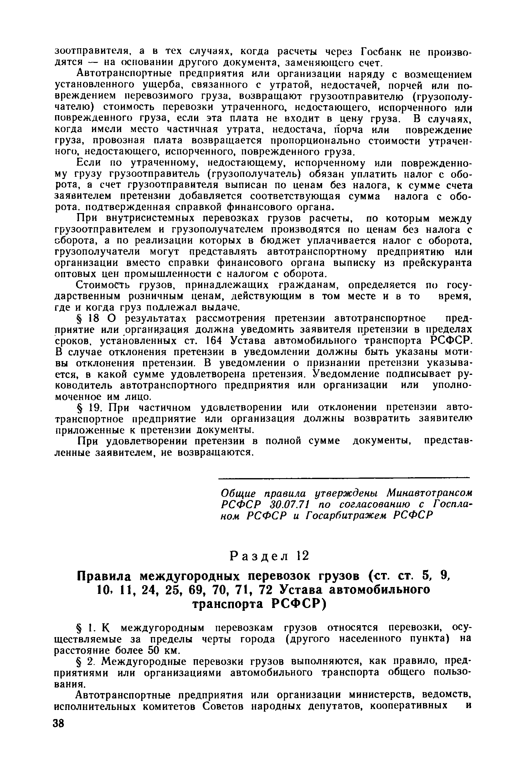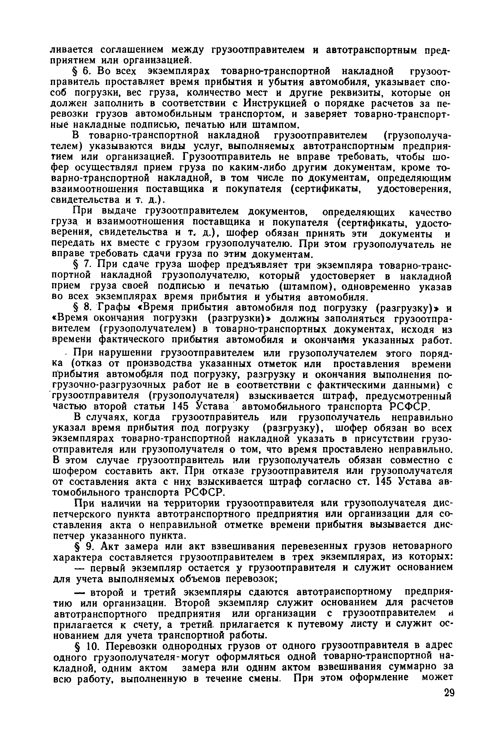 Правила перевозок грузов автомобильным транспортом| Статус: | справочные материалы, мп, тпр | | Название рус.: | Правила перевозок грузов автомобильным транспортом | | Дата добавления в базу: | 01.02.2020 | | Дата актуализации: | 01.01.2021 | | Оглавление: | Раздел 1 Правила заключения договоров на перевозку грузов автомобильным транспортом Раздел 2 Правила приема грузов к перевозке Раздел 3 Правила маркировки грузов Раздел 4 Плавира пломбирования и обандероливания грузов Раздел 5 Правила погрузки и разгрузки груза Раздел 6 Правила оформления перевозочных документов Раздел 7 Правила выдачи грузов Раздел 8 Правила переадресовки грузов Раздел 9 Расчеты за перевозки Раздел 10 Правила составления актов Раздел 11 Правила предъявления и рассмотрения претензий Раздел 12 Правила междугородных перевозок Раздел 13 Правила перевозок скоропортящихся грузов автомобильным транспортом в междугородном сообщении Раздел 14 Правила перевозок грузов в контейнерах автомобильным транспортом Раздел 15 Правила перевозок грузов пакетами Раздел 16 Правила перевозок шифера Раздел 17 Правила перевозок леса и пиломатериалов Раздел 18 Правила перевозок железобетонных изделий Раздел 19 Правила перевозок цемента Раздел 20 Правила перевозок молока и молочных продуктов Раздел 21 Правила перевозок хлебобулочных изделий Раздел 22 Правила перевозок тортов, пирожных и других мучнисто-кремовых изделий Раздел 23 Правила перевозок силосной массы Раздел 24 Правила перевозок зерна и сахарной свеклы Раздел 25 Правила перевозок животных и птиц Раздел 26 Правила перевозок грузов навалом Раздел 27 Правила транспортно-экспедиционного обслуживания предприятий, организаций и учреждений в РСФСР | | Утверждён: | Министерство автомобильного транспорта РСФСР