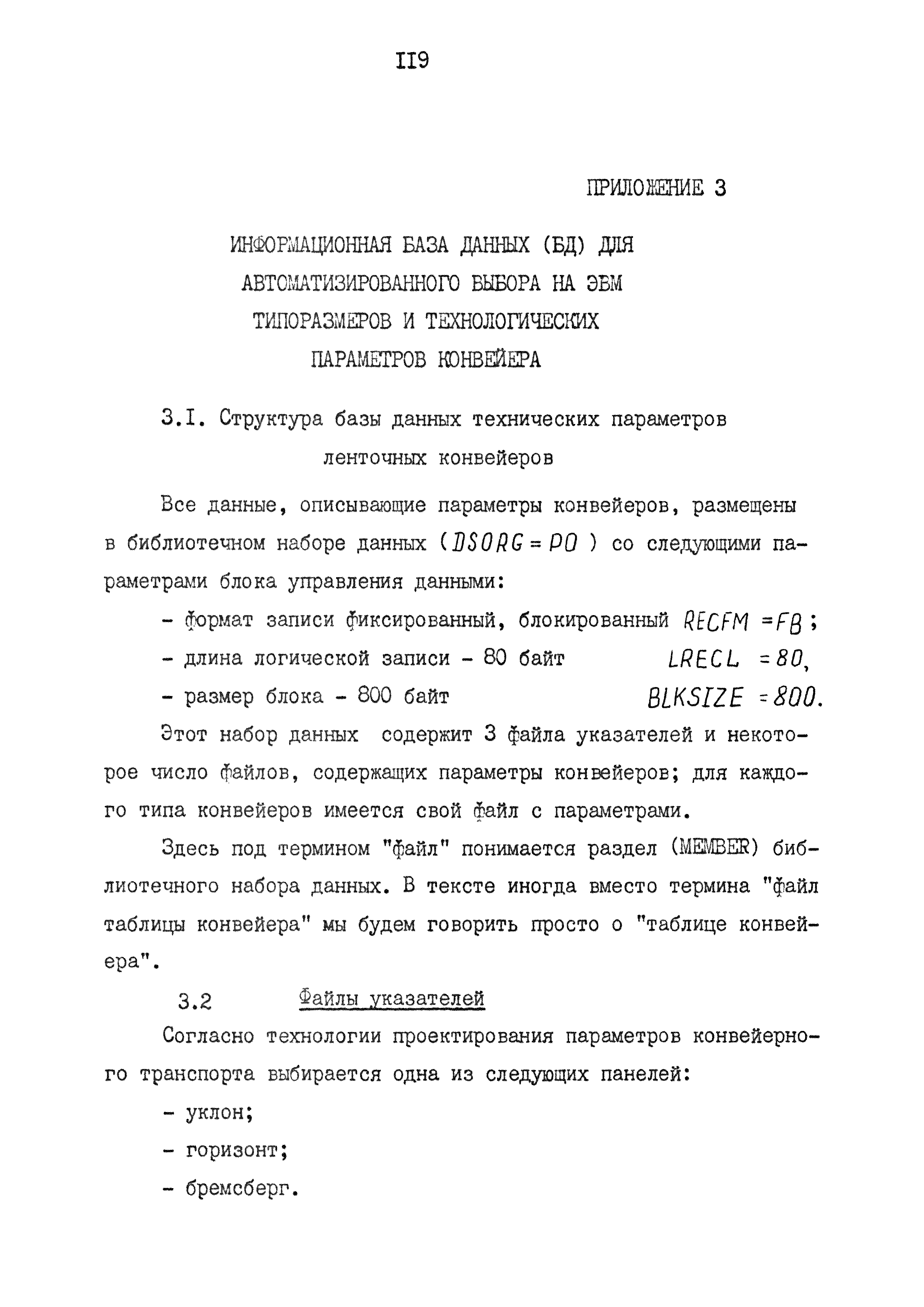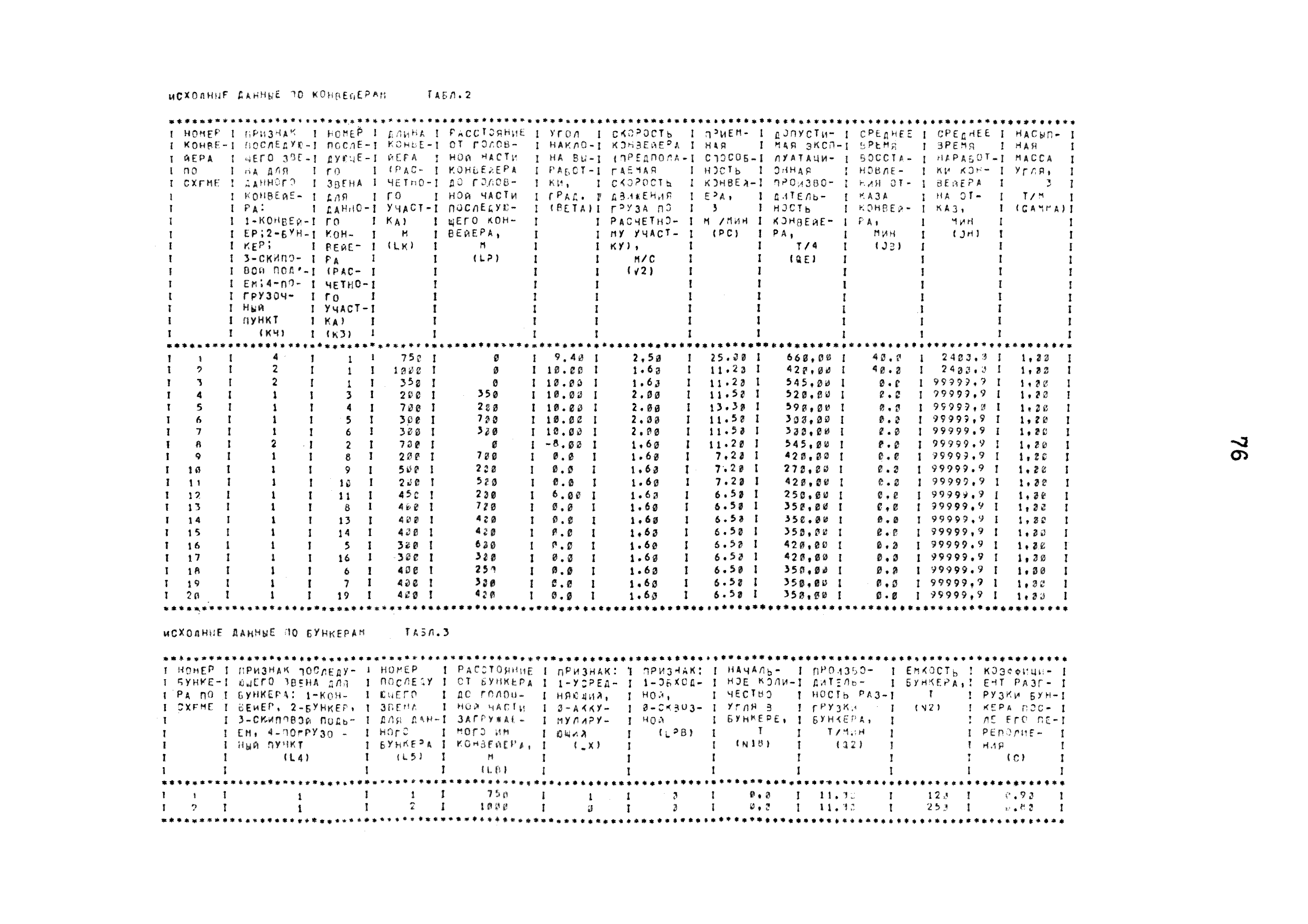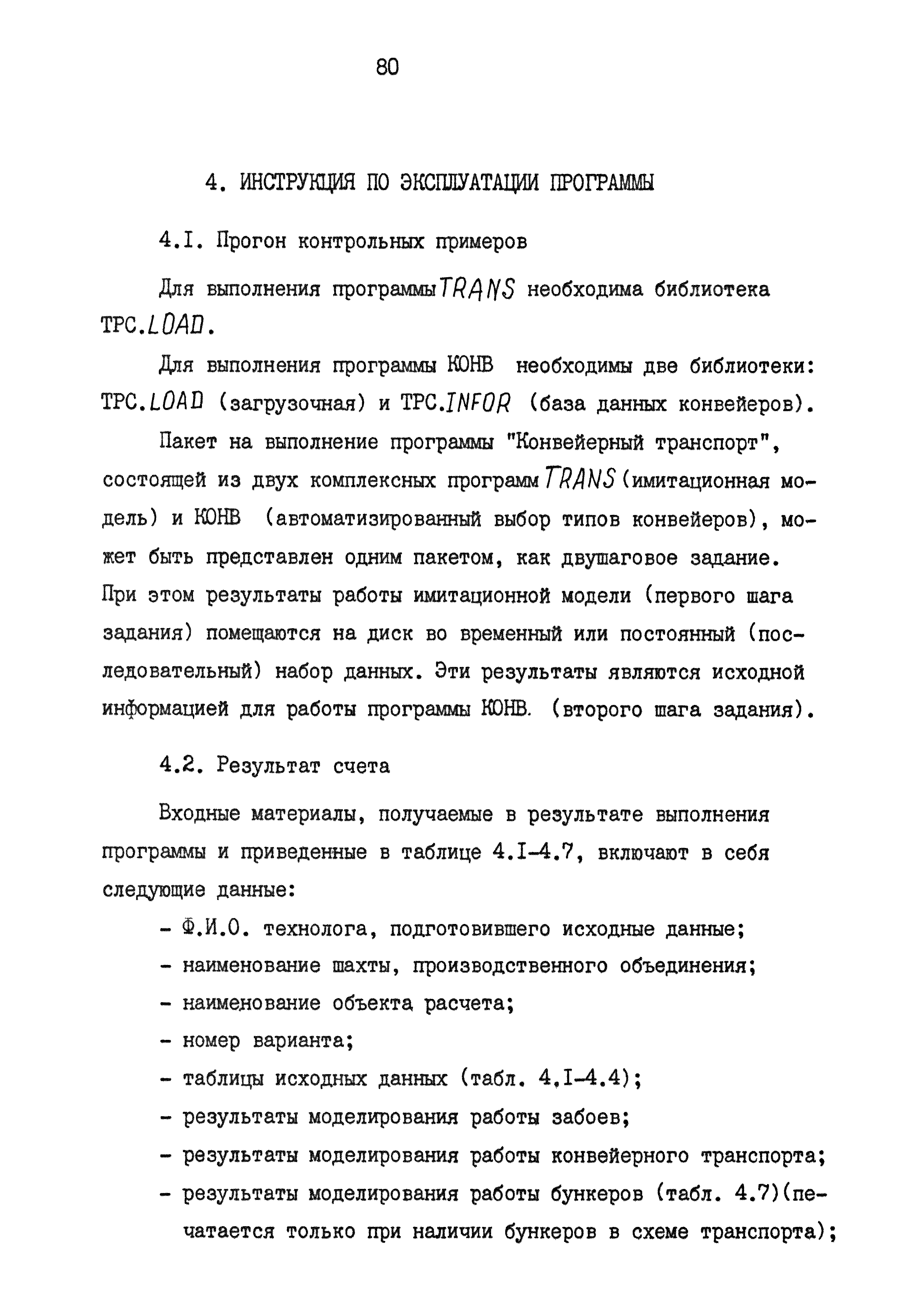 | Оглавление: | 1. Введение 2. Назначение и краткая характеристика специализированной программы "Конвейерный транспорт" 2.1. Назначение программы "Конвейерный транспорт" 2.2. Общая структура и основные принципы построения программы "Конвейерный транспорт" 2.3. Последовательность решения задач при помощи программы "Конвейерный транспорт" 3. Инструкция по подготовке исходных данных 3.1. Инструкция по заполнению входной документации в режиме выбора оборудования 3.2. Контрольный пример 3.3. Инструкция по заполнению входной документации в режиме оценки пропускной способности или экспертной оценки проектных решений 3.4. Контрольный пример 3.5. Инструкция по перфорации 4. Инструкция по эксплуатации программы 4.1. Прогон контрольных примеров 4.2. Результат счета 4.3. Анализ результата счета Приложение 1. Таблицы параметрического рада конвейеров Приложение 2. Тяговые характеристики параметрического рада конвейеров Приложение 3. Информационная база данных (БД) для автоматического выбора на ЭВМ типоразмеров и технологических параметров конвейеров 3.1 Структура БД 3.2 Файлы указателей 3.3 Файлы параметров конвейеров 3.4 Корректировка базы данных с дисплея |