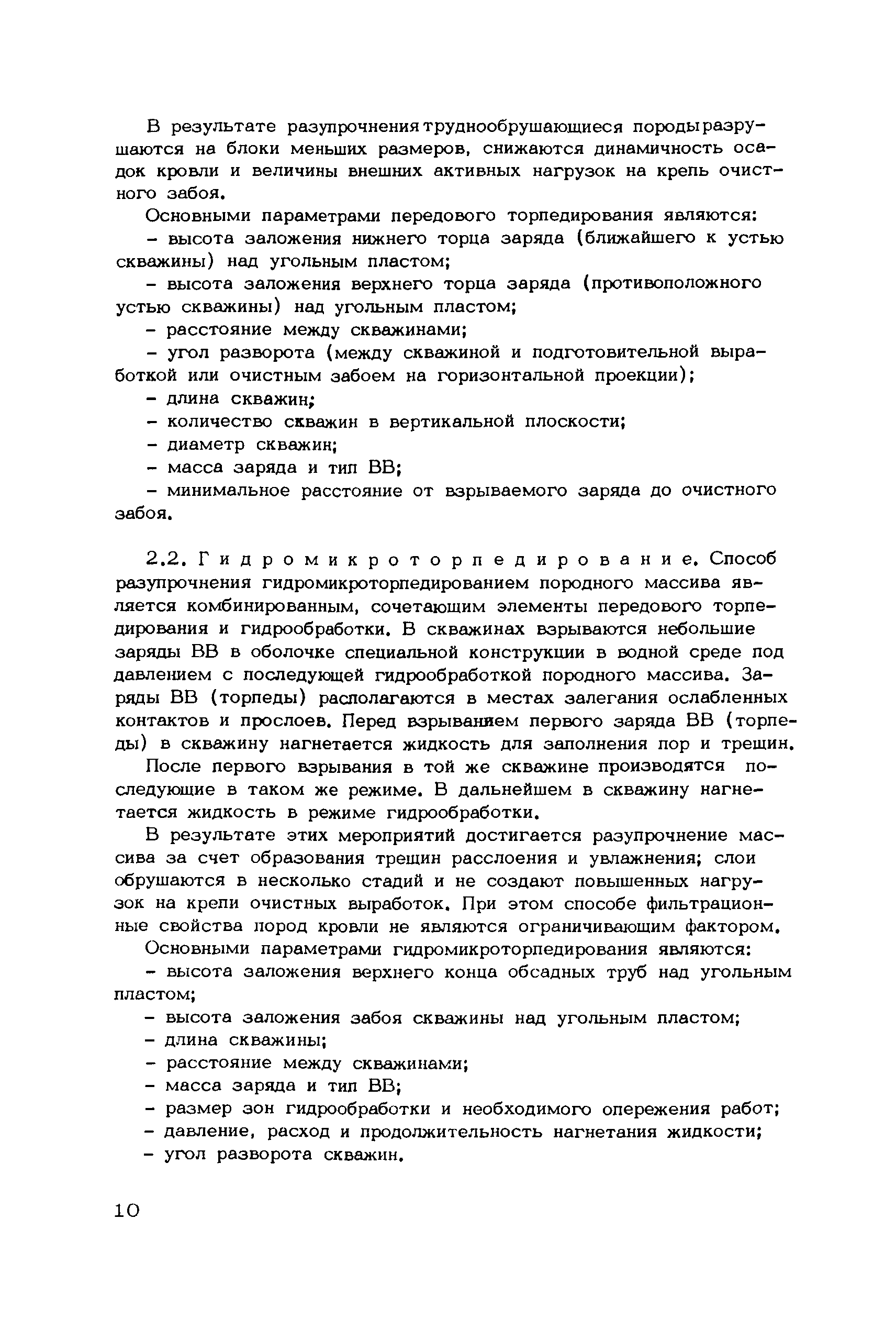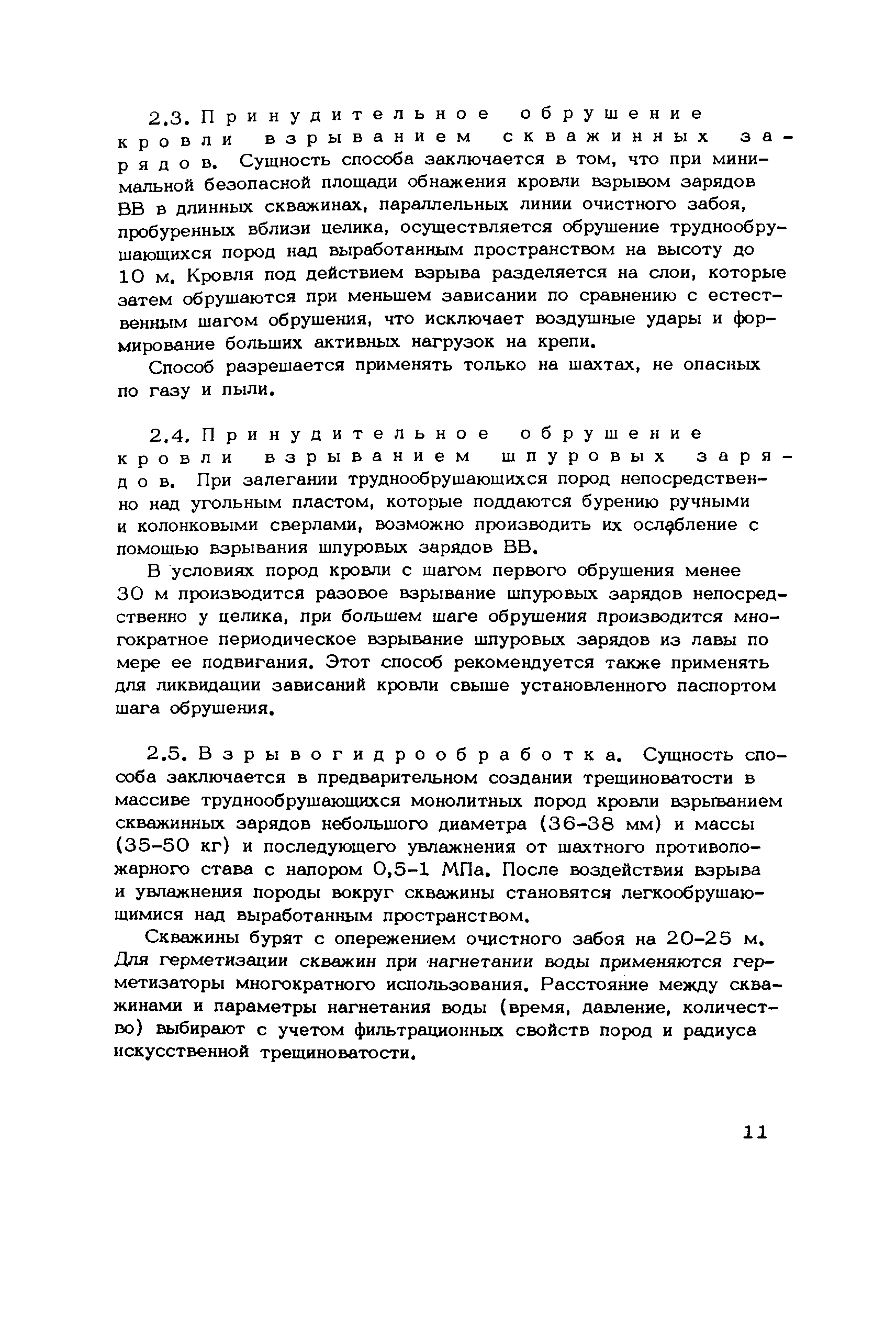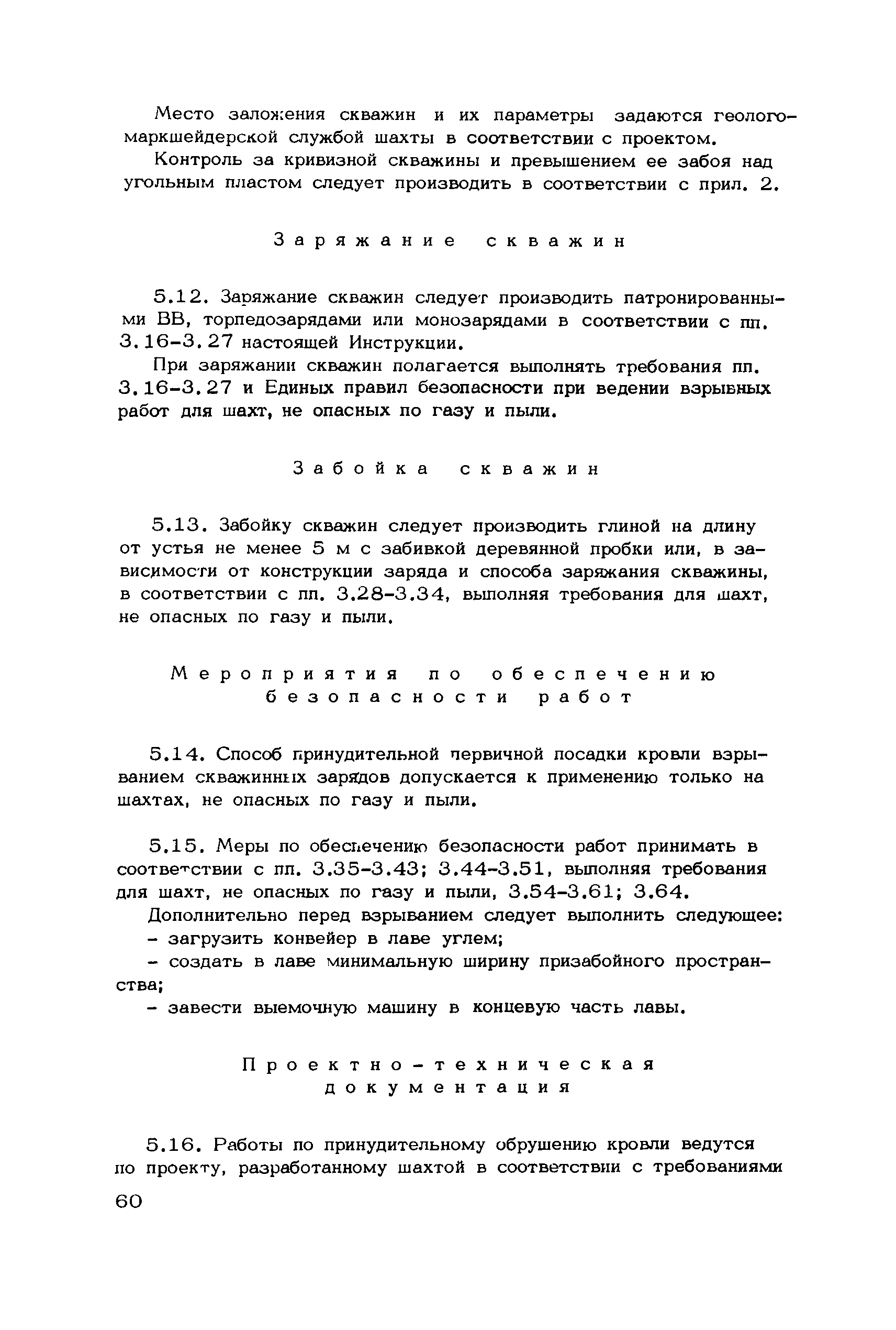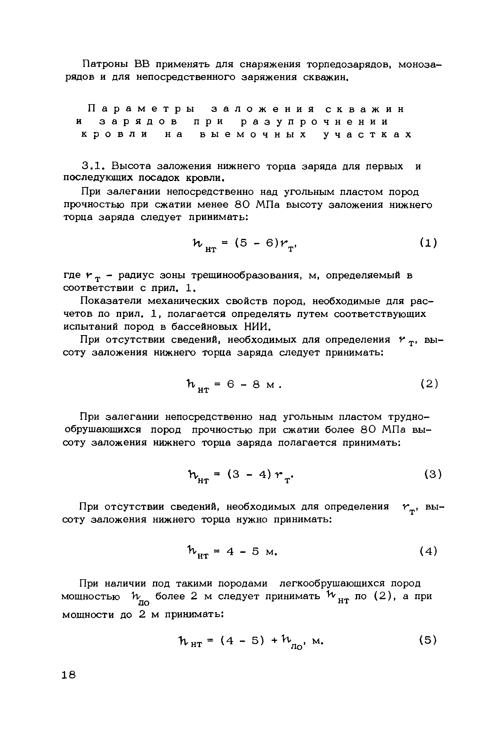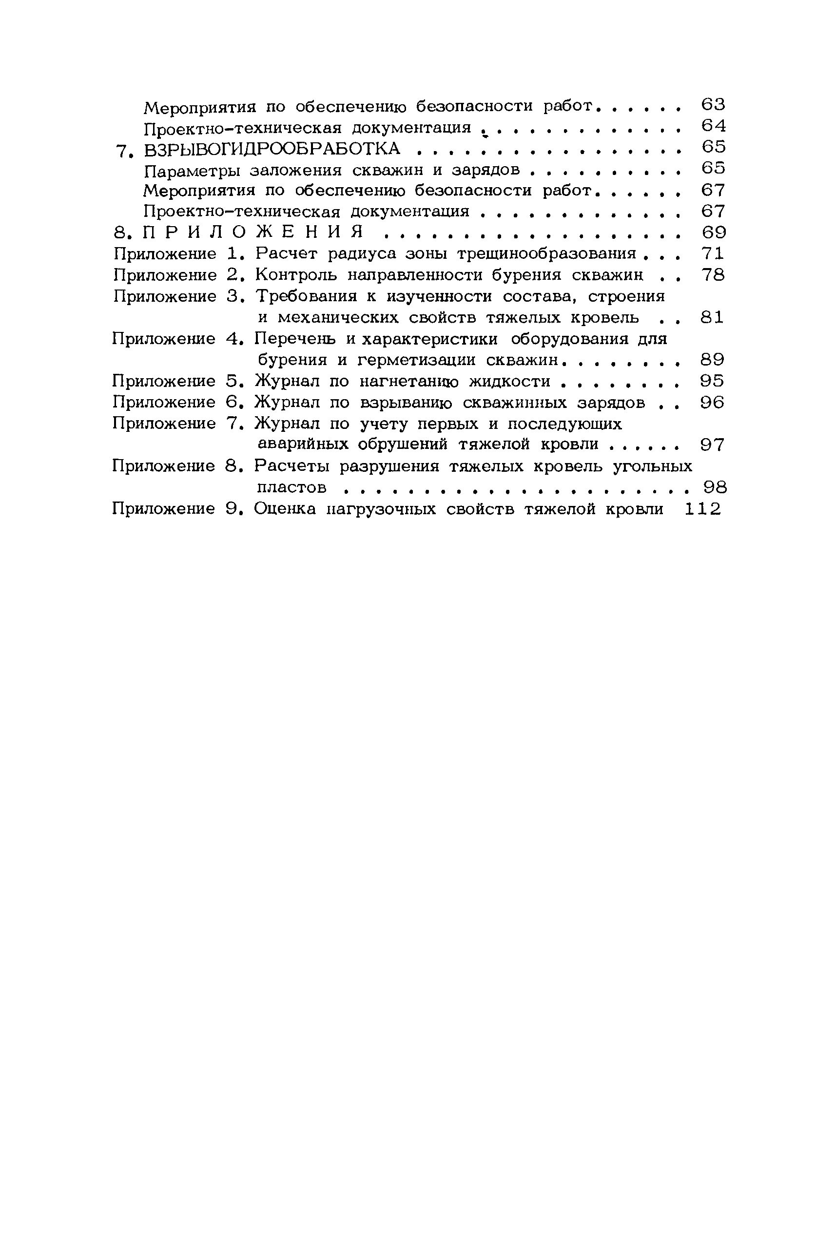 | Оглавление: | Введение 1. Общие положения 2. Сущность и выбор способа разупрочнения Сущность способов разупрочнения Схемы расположения скважин Выбор способа разупрочнения 3. Передовое торпедирование Параметры заложения скважин и зарядов при разупрочнении кровли на выемочных участках Параметры заложения скважин и зарядов для охраны подготовительных выработок при бесцеликовой технологии Конструкция торпед, торпедозарядов и монозарядов Заряжание скважин Забойка и герметизация устья скважин Мероприятия по обеспечению безопасности работ Требования техники безопасности при выполнении работ по бурению скважин Требования техники безопасности при выполнении работ по торпедированию Проектно-техническая документация 4. Гидромикроторпедирование Основные виды работ Параметры заложения скважин Масса заряда и расположение торпед в скважине Размеры зон гидрообработки Параметры нагнетания жидкости в скважины Конструкция торпед Заряжание скважин Герметизация скважин Технологическая схема работ по гидромикроторпедированию Мероприятия по обеспечению безопасности работ Проектно-техническая документация 5. Принудительная первичная посадка тяжелой кровли взрыванием скважинных зарядов Параметры заложения скважин и зарядов Бурение скважин Заряжание скважин Забойка скважин Мероприятия по обеспечению безопасности работ Проектно-техническая документация 6. Принудительное обрушение кровли взрыванием шпуровых зарядов Параметры заложения шпуров Технология работ Мероприятия по обеспечению безопасности работ Проектно-техническая документация 7. Взрывогидрообработка Параметры заложения скважин и зарядов Мероприятия по обеспечению безопасности работ Проектно-техническая документация Приложение 1. Расчет радиуса зоны трещинообразования Приложение 2. Контроль направленности бурения скважин Приложение 3. Требования к изученности состава, строения и механических свойств тяжелых кровель Приложение 4. Перечень и характеристики оборудования для бурения и герметизации скважин Приложение 5. Журнал по нагнетанию жидкости Приложение 6. Журнал по взрыванию скважинных зарядов Приложение 7. Журнал по учету первых и последующих аварийных обрушений тяжелой кровли Приложение 8. Расчеты разрушения тяжелых кровель угольных пластов Приложение 9. Оценка нагрузочных свойств тяжелой кровли |