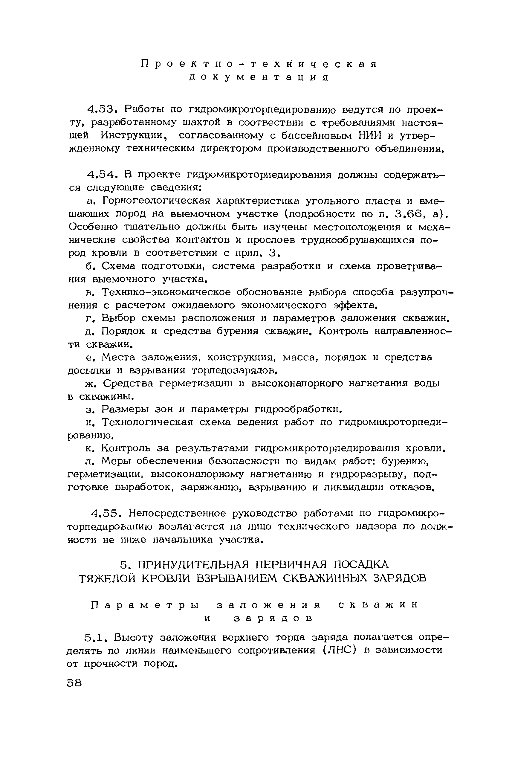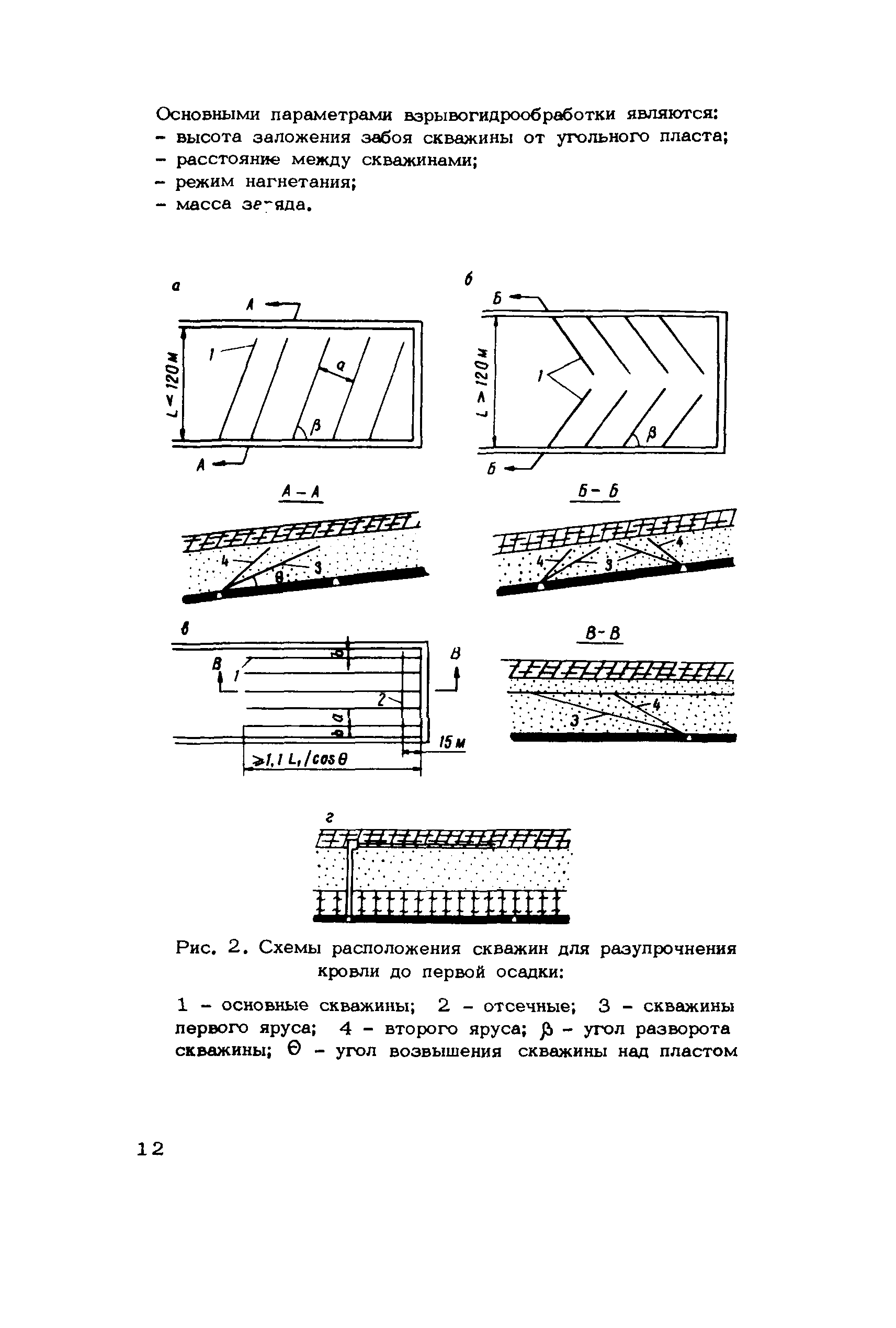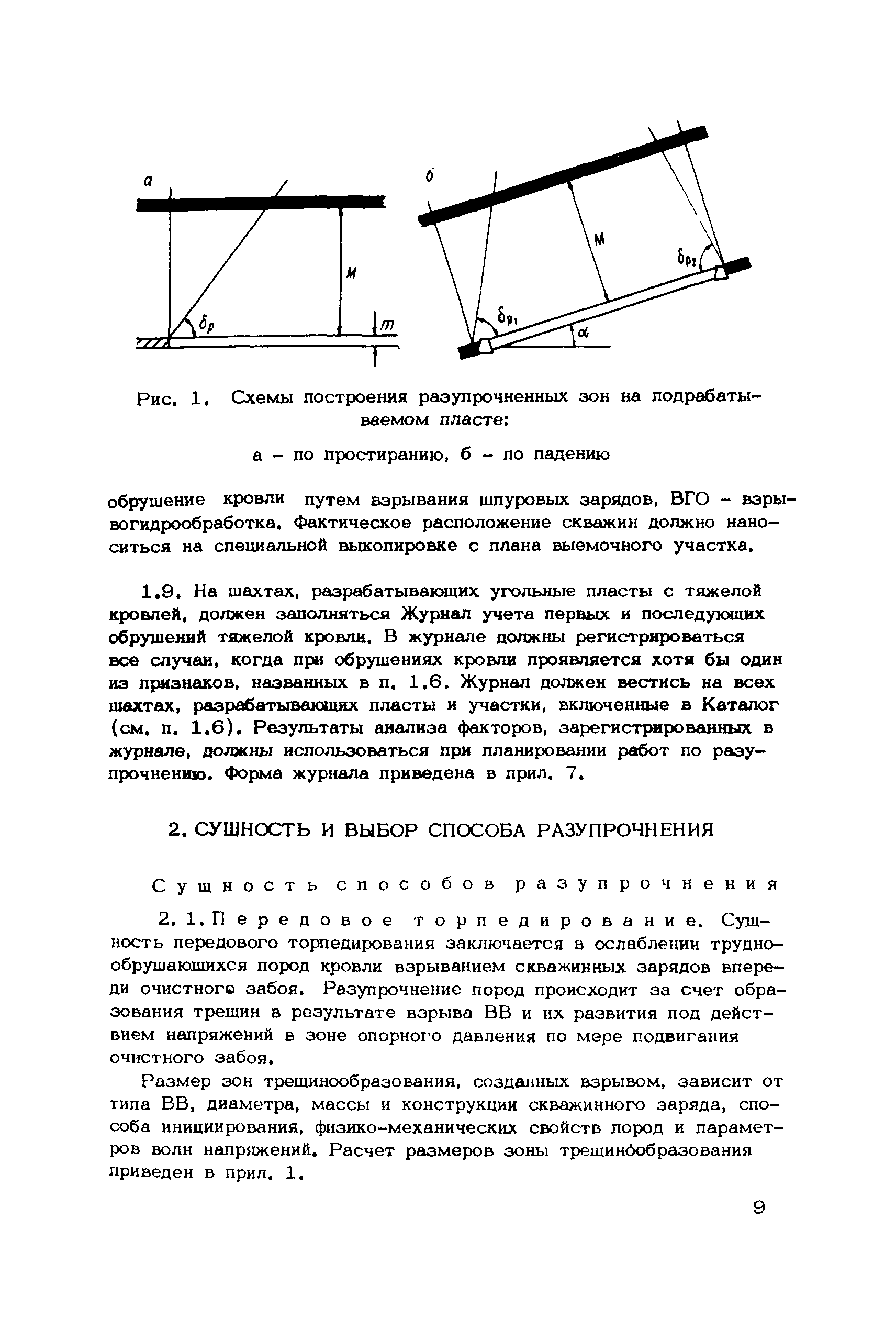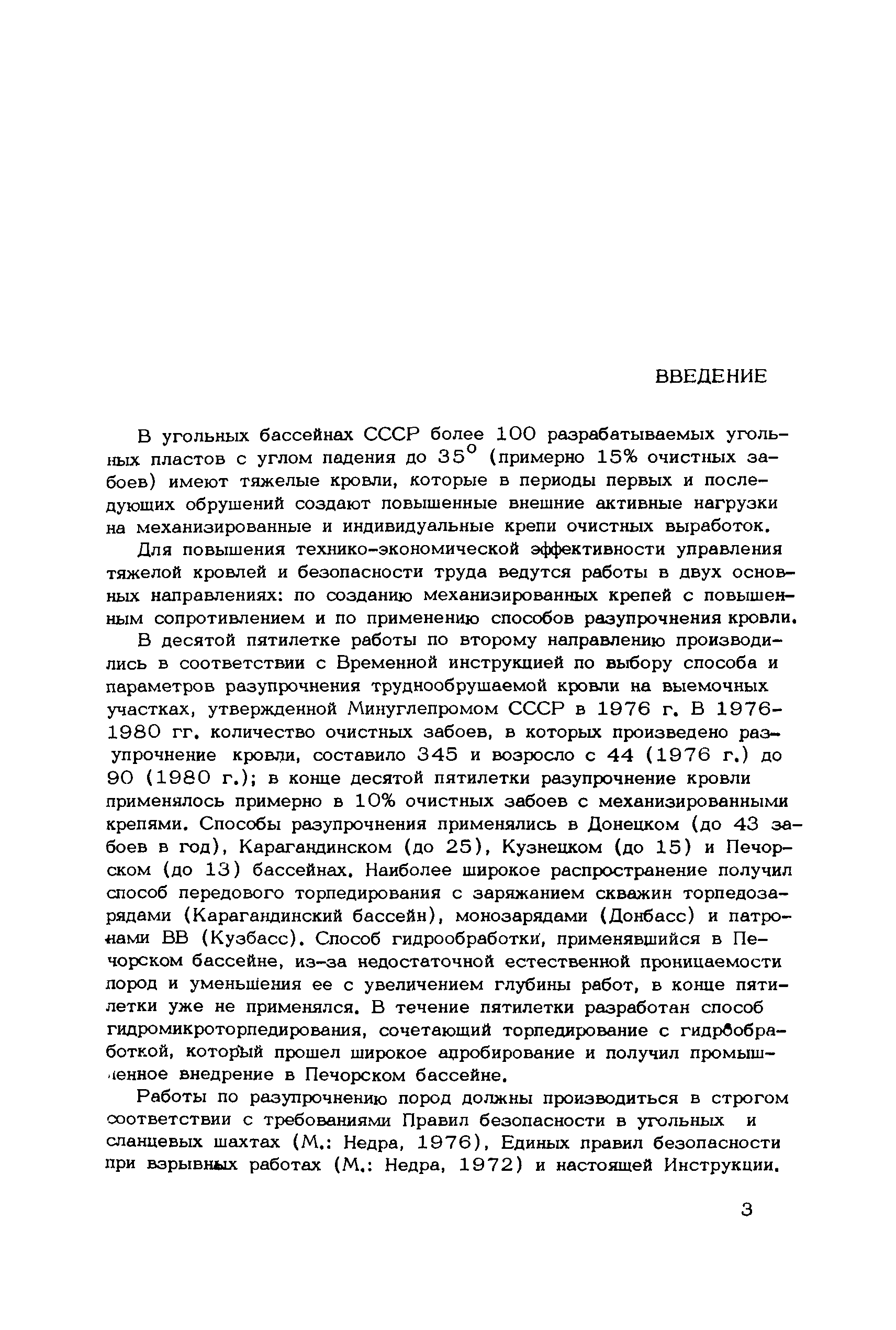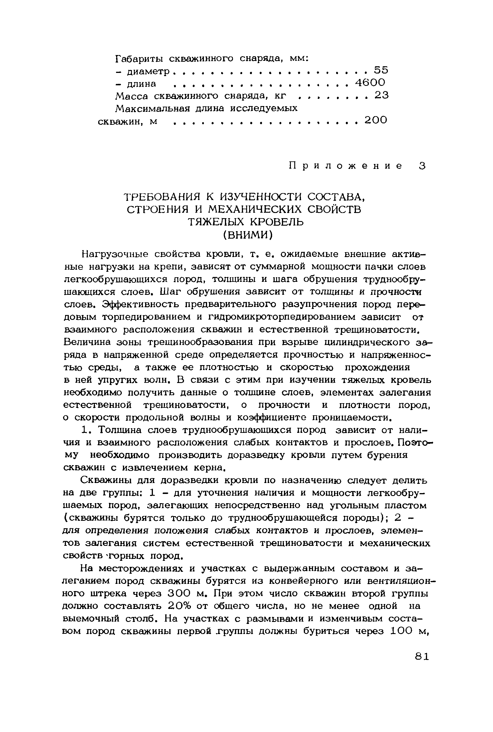 | Оглавление: | Введение 1. Общие положения 2. Сущность и выбор способа разупрочнения Сущность способов разупрочнения Схемы расположения скважин Выбор способа разупрочнения 3. Передовое торпедирование Параметры заложения скважин и зарядов при разупрочнении кровли на выемочных участках Параметры заложения скважин и зарядов для охраны подготовительных выработок при бесцеликовой технологии Конструкция торпед, торпедозарядов и монозарядов Заряжание скважин Забойка и герметизация устья скважин Мероприятия по обеспечению безопасности работ Требования техники безопасности при выполнении работ по бурению скважин Требования техники безопасности при выполнении работ по торпедированию Проектно-техническая документация 4. Гидромикроторпедирование Основные виды работ Параметры заложения скважин Масса заряда и расположение торпед в скважине Размеры зон гидрообработки Параметры нагнетания жидкости в скважины Конструкция торпед Заряжание скважин Герметизация скважин Технологическая схема работ по гидромикроторпедированию Мероприятия по обеспечению безопасности работ Проектно-техническая документация 5. Принудительная первичная посадка тяжелой кровли взрыванием скважинных зарядов Параметры заложения скважин и зарядов Бурение скважин Заряжание скважин Забойка скважин Мероприятия по обеспечению безопасности работ Проектно-техническая документация 6. Принудительное обрушение кровли взрыванием шпуровых зарядов Параметры заложения шпуров Технология работ Мероприятия по обеспечению безопасности работ Проектно-техническая документация 7. Взрывогидрообработка Параметры заложения скважин и зарядов Мероприятия по обеспечению безопасности работ Проектно-техническая документация Приложение 1. Расчет радиуса зоны трещинообразования Приложение 2. Контроль направленности бурения скважин Приложение 3. Требования к изученности состава, строения и механических свойств тяжелых кровель Приложение 4. Перечень и характеристики оборудования для бурения и герметизации скважин Приложение 5. Журнал по нагнетанию жидкости Приложение 6. Журнал по взрыванию скважинных зарядов Приложение 7. Журнал по учету первых и последующих аварийных обрушений тяжелой кровли Приложение 8. Расчеты разрушения тяжелых кровель угольных пластов Приложение 9. Оценка нагрузочных свойств тяжелой кровли |