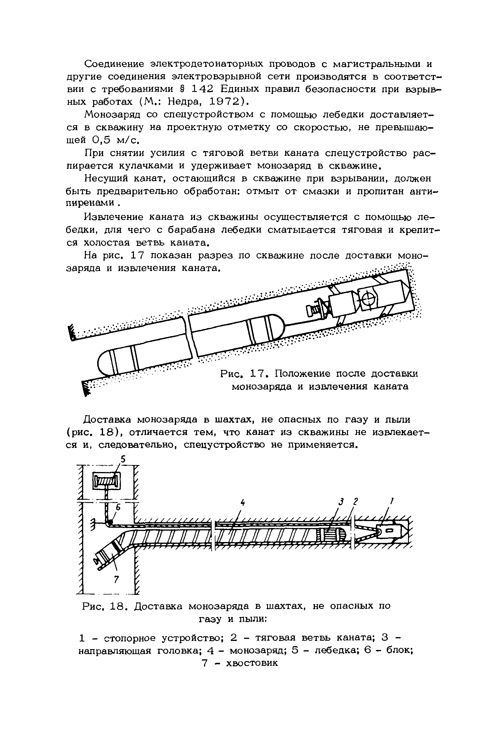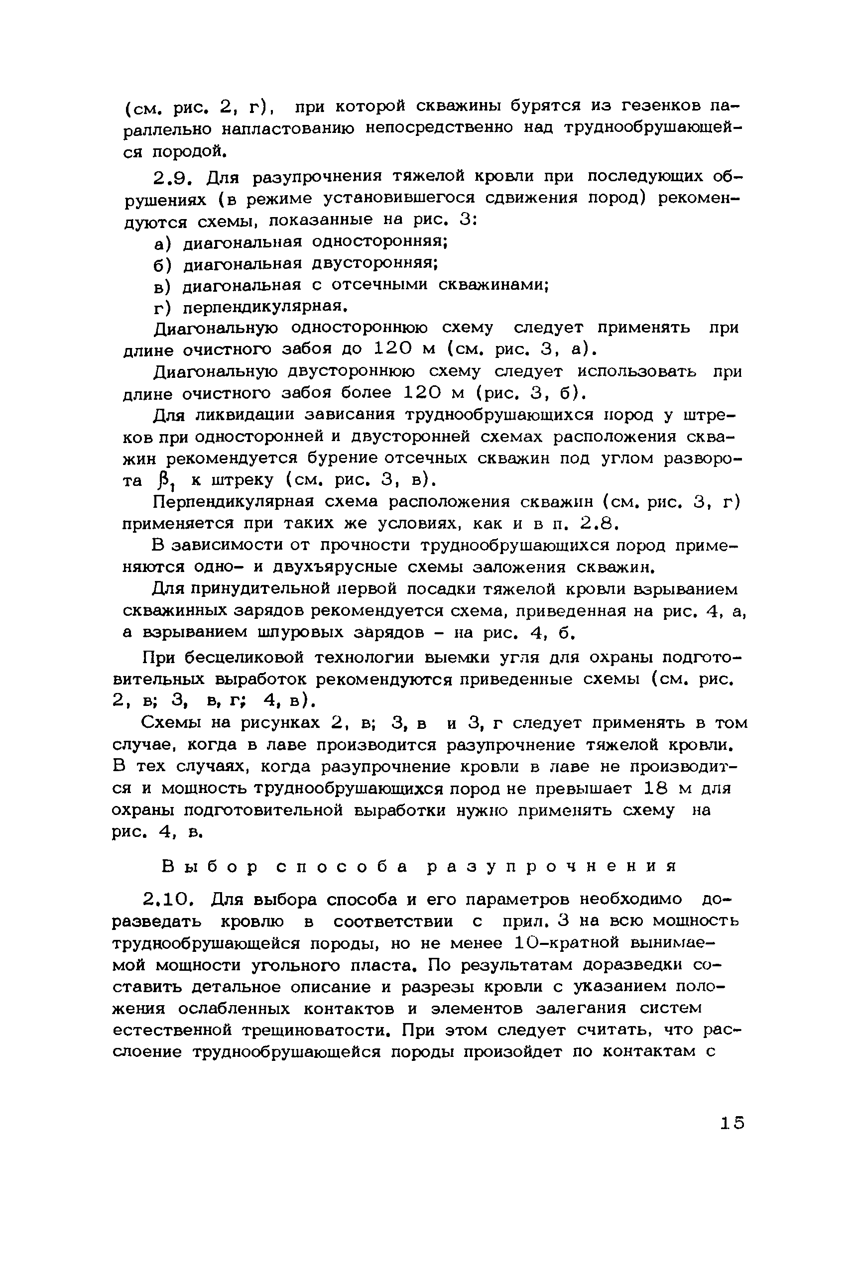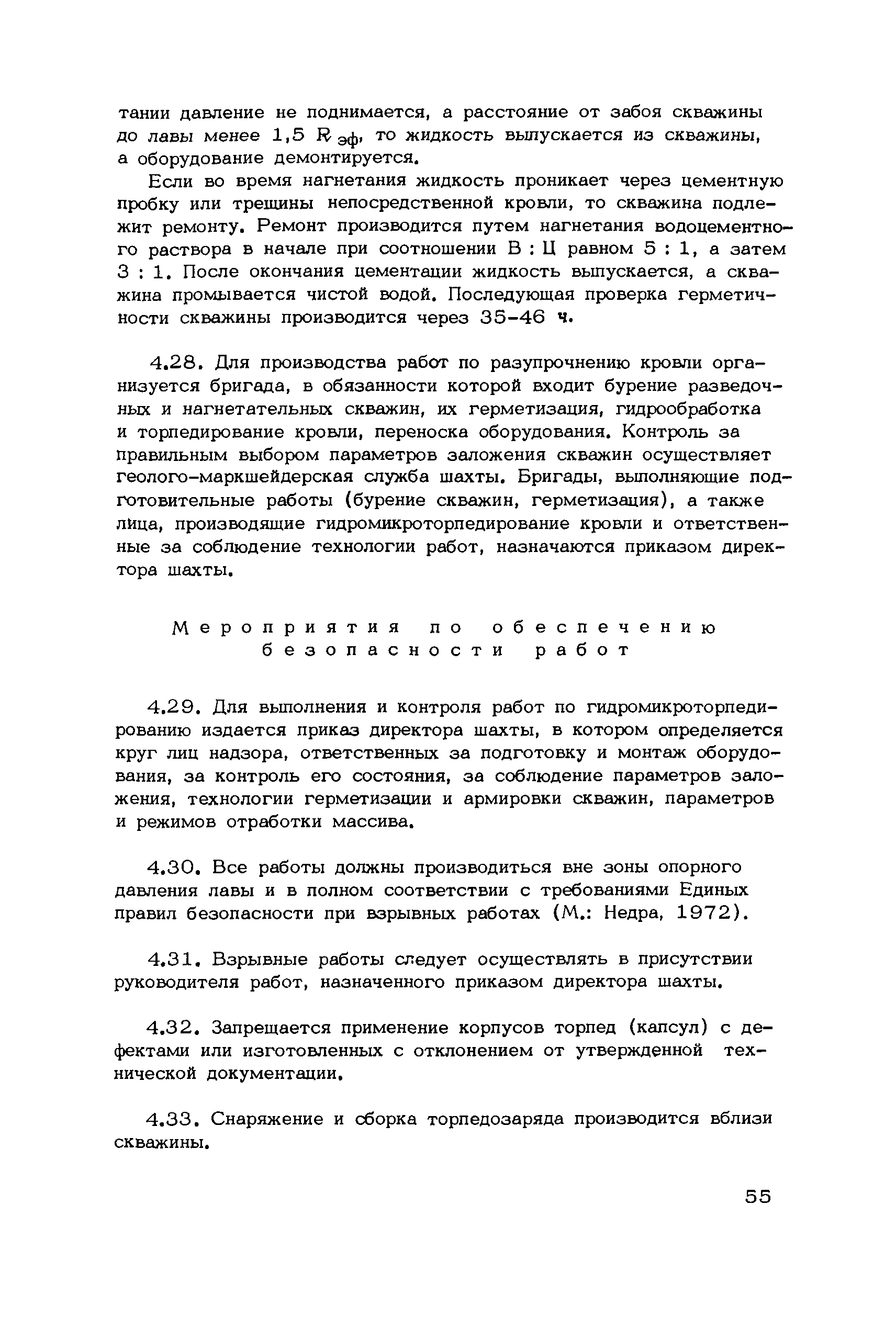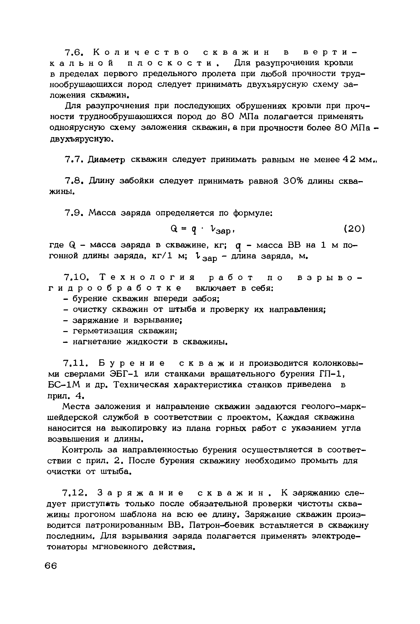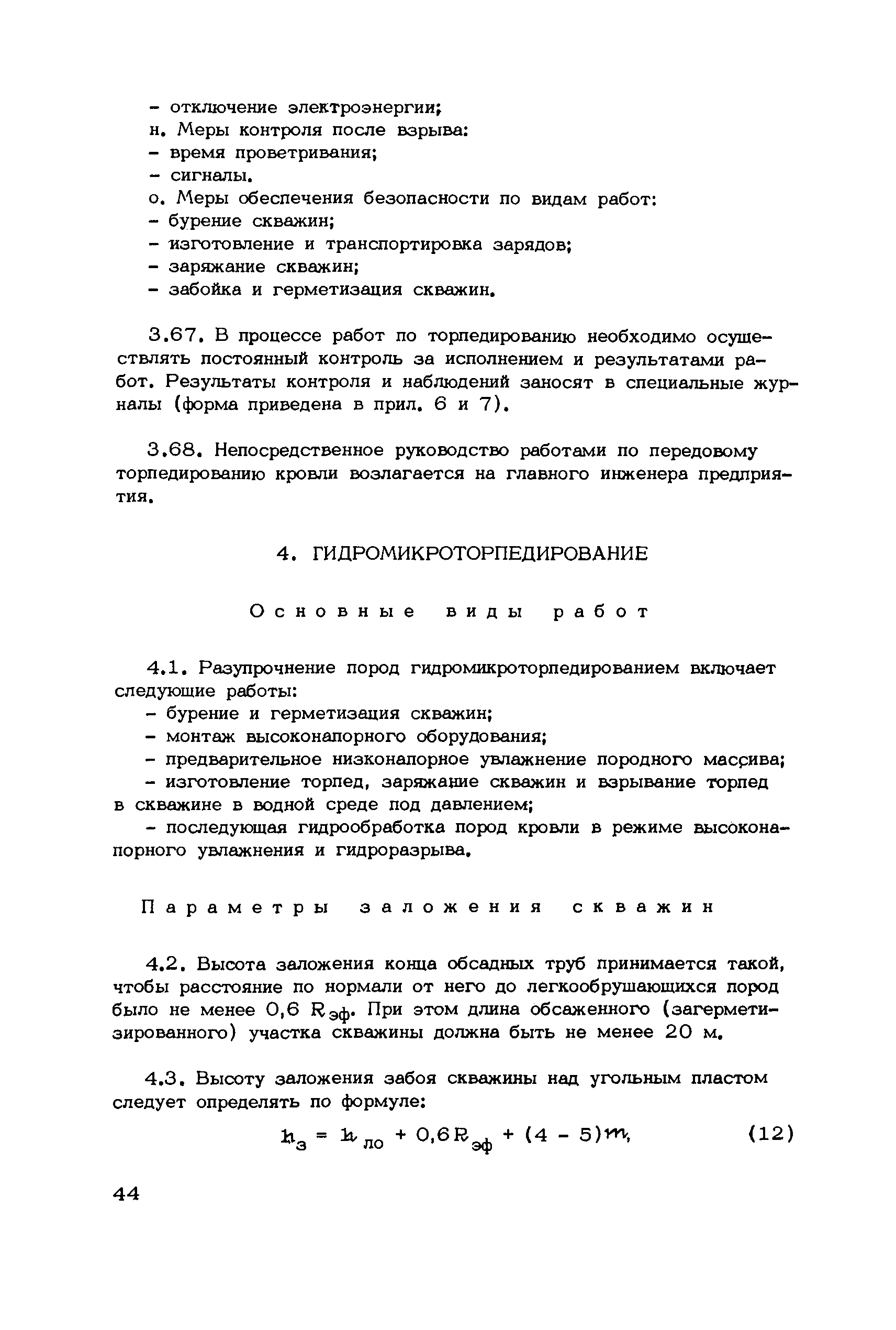 | Оглавление: | Введение 1. Общие положения 2. Сущность и выбор способа разупрочнения Сущность способов разупрочнения Схемы расположения скважин Выбор способа разупрочнения 3. Передовое торпедирование Параметры заложения скважин и зарядов при разупрочнении кровли на выемочных участках Параметры заложения скважин и зарядов для охраны подготовительных выработок при бесцеликовой технологии Конструкция торпед, торпедозарядов и монозарядов Заряжание скважин Забойка и герметизация устья скважин Мероприятия по обеспечению безопасности работ Требования техники безопасности при выполнении работ по бурению скважин Требования техники безопасности при выполнении работ по торпедированию Проектно-техническая документация 4. Гидромикроторпедирование Основные виды работ Параметры заложения скважин Масса заряда и расположение торпед в скважине Размеры зон гидрообработки Параметры нагнетания жидкости в скважины Конструкция торпед Заряжание скважин Герметизация скважин Технологическая схема работ по гидромикроторпедированию Мероприятия по обеспечению безопасности работ Проектно-техническая документация 5. Принудительная первичная посадка тяжелой кровли взрыванием скважинных зарядов Параметры заложения скважин и зарядов Бурение скважин Заряжание скважин Забойка скважин Мероприятия по обеспечению безопасности работ Проектно-техническая документация 6. Принудительное обрушение кровли взрыванием шпуровых зарядов Параметры заложения шпуров Технология работ Мероприятия по обеспечению безопасности работ Проектно-техническая документация 7. Взрывогидрообработка Параметры заложения скважин и зарядов Мероприятия по обеспечению безопасности работ Проектно-техническая документация Приложение 1. Расчет радиуса зоны трещинообразования Приложение 2. Контроль направленности бурения скважин Приложение 3. Требования к изученности состава, строения и механических свойств тяжелых кровель Приложение 4. Перечень и характеристики оборудования для бурения и герметизации скважин Приложение 5. Журнал по нагнетанию жидкости Приложение 6. Журнал по взрыванию скважинных зарядов Приложение 7. Журнал по учету первых и последующих аварийных обрушений тяжелой кровли Приложение 8. Расчеты разрушения тяжелых кровель угольных пластов Приложение 9. Оценка нагрузочных свойств тяжелой кровли |