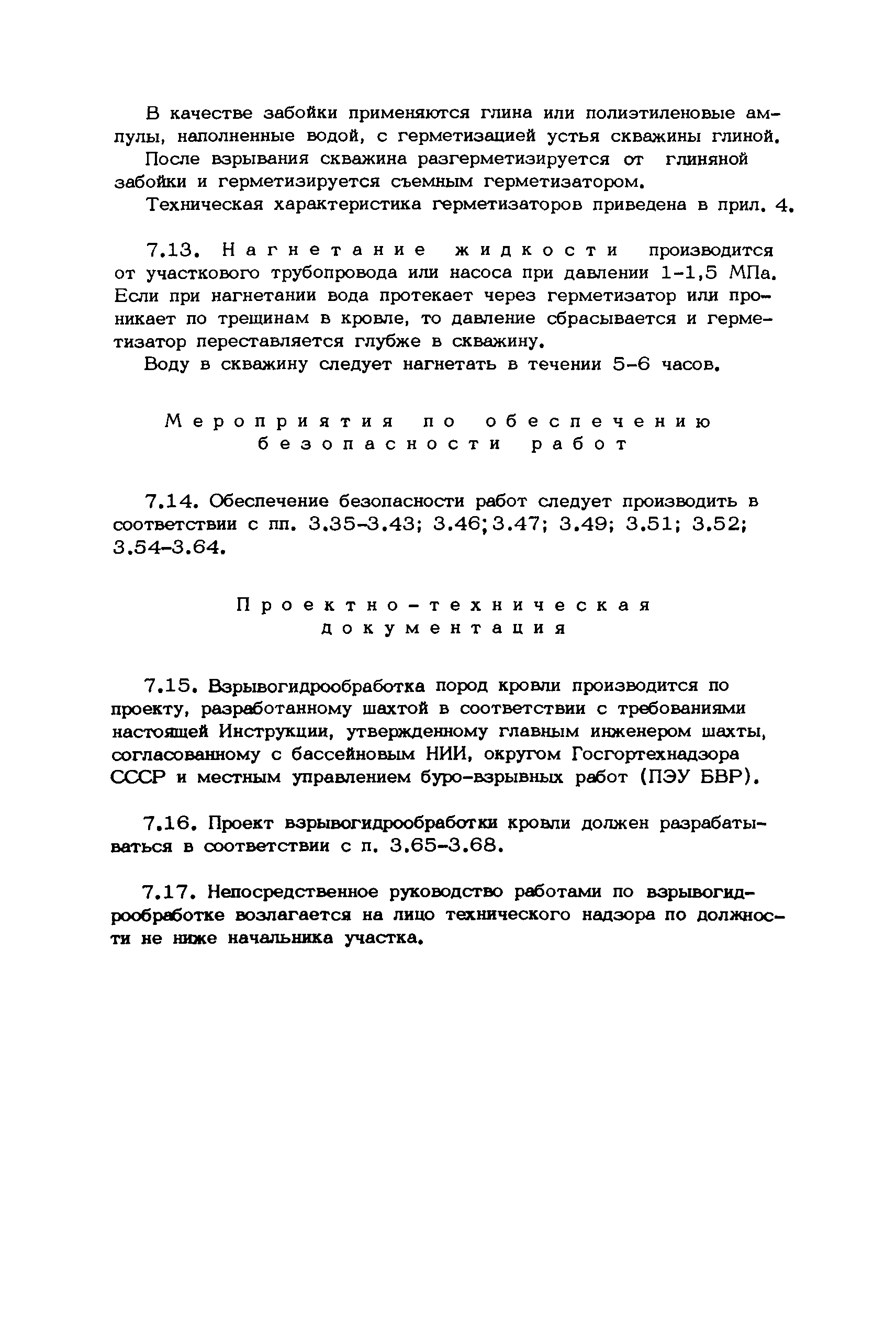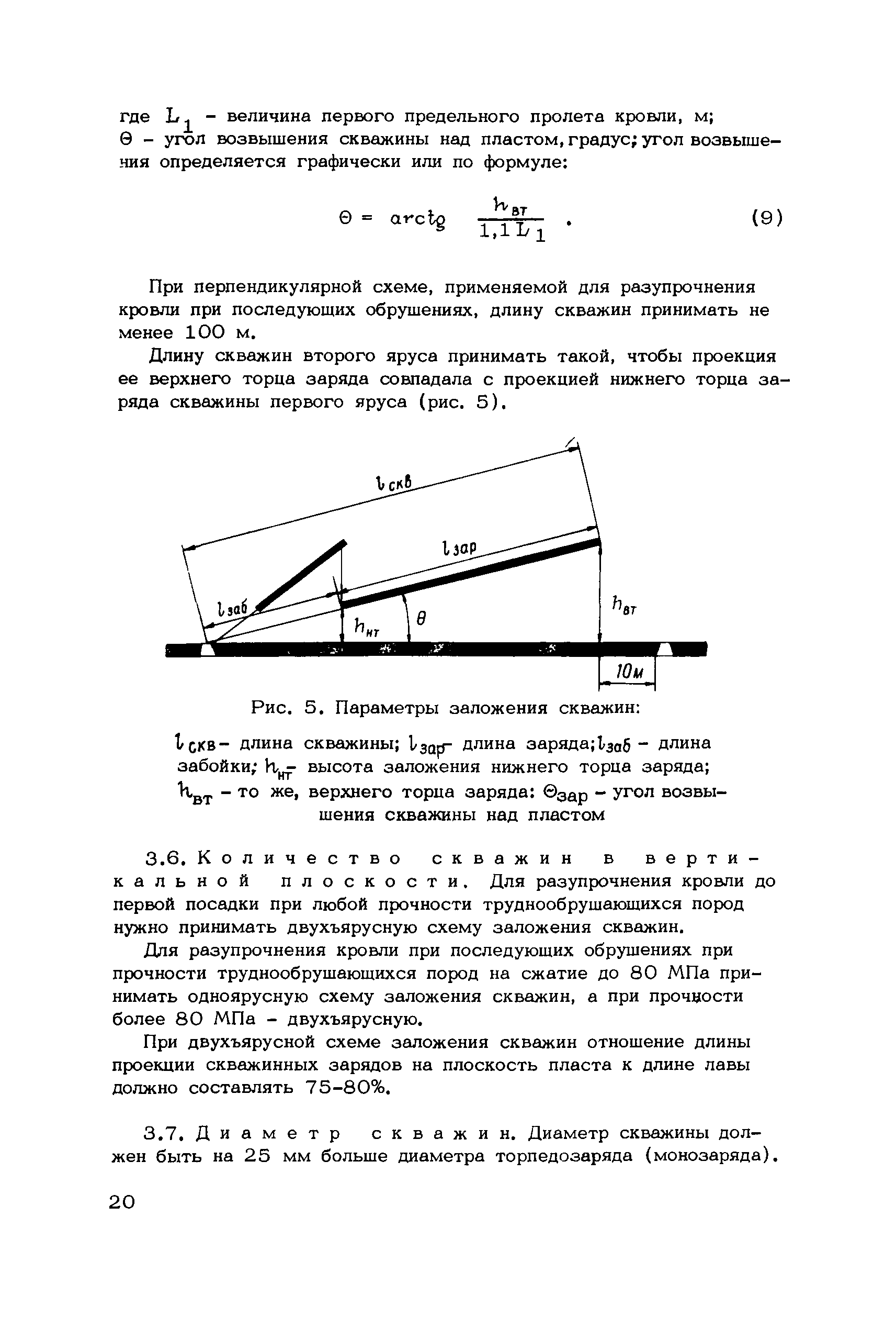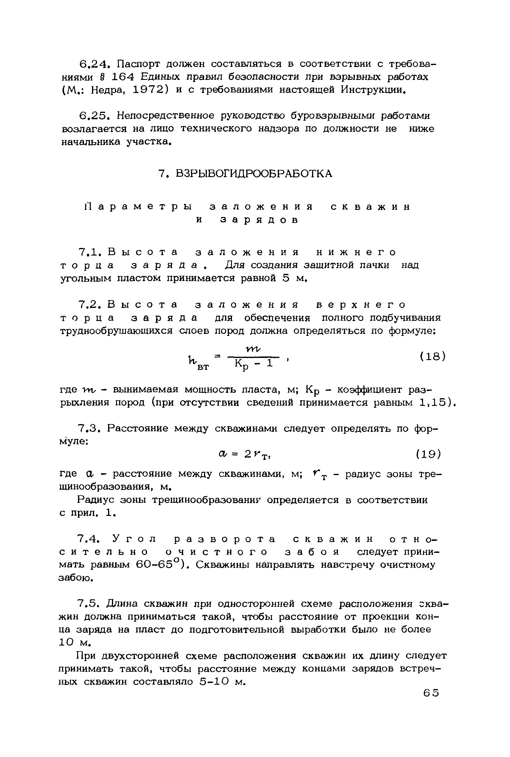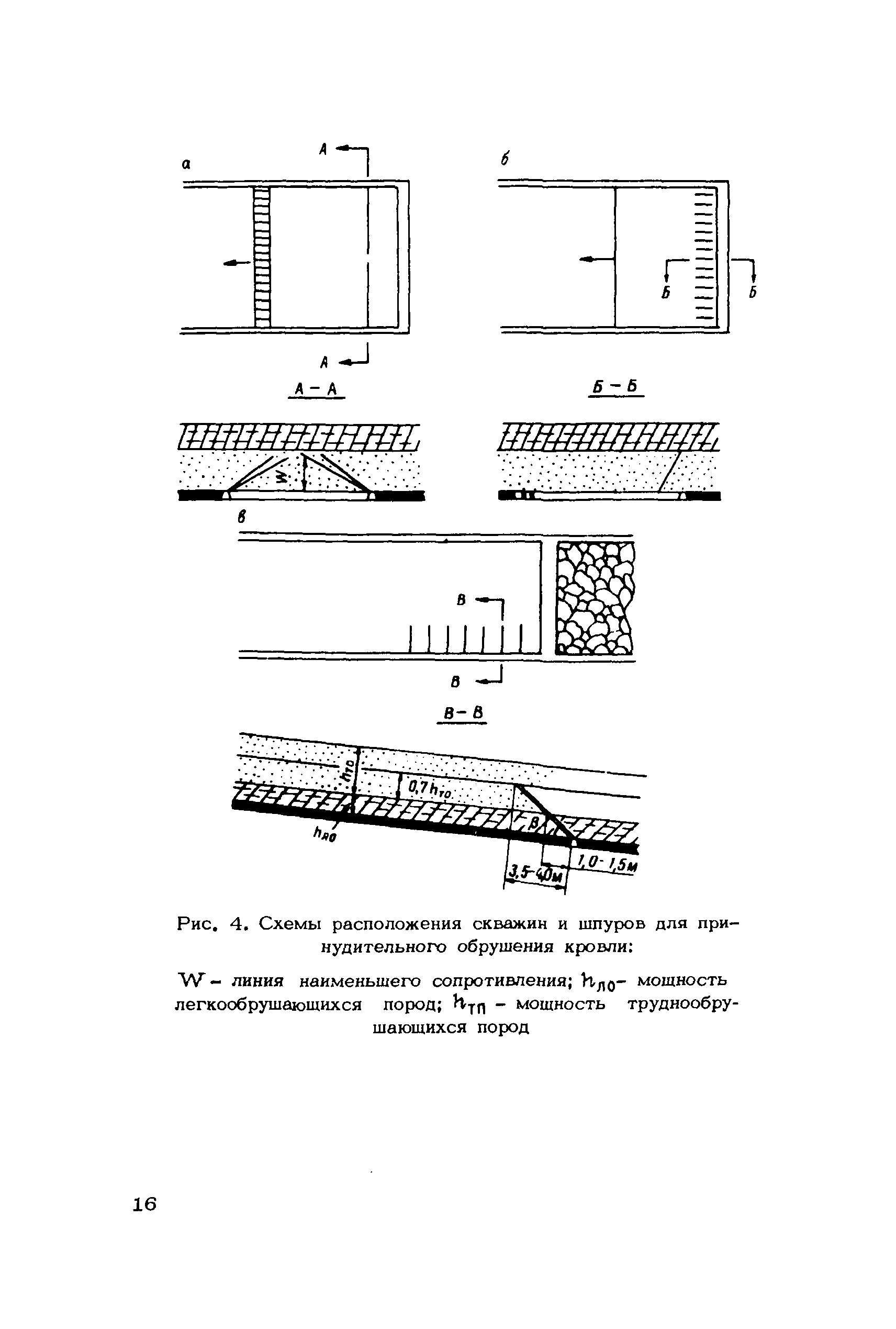 | Оглавление: | Введение 1. Общие положения 2. Сущность и выбор способа разупрочнения Сущность способов разупрочнения Схемы расположения скважин Выбор способа разупрочнения 3. Передовое торпедирование Параметры заложения скважин и зарядов при разупрочнении кровли на выемочных участках Параметры заложения скважин и зарядов для охраны подготовительных выработок при бесцеликовой технологии Конструкция торпед, торпедозарядов и монозарядов Заряжание скважин Забойка и герметизация устья скважин Мероприятия по обеспечению безопасности работ Требования техники безопасности при выполнении работ по бурению скважин Требования техники безопасности при выполнении работ по торпедированию Проектно-техническая документация 4. Гидромикроторпедирование Основные виды работ Параметры заложения скважин Масса заряда и расположение торпед в скважине Размеры зон гидрообработки Параметры нагнетания жидкости в скважины Конструкция торпед Заряжание скважин Герметизация скважин Технологическая схема работ по гидромикроторпедированию Мероприятия по обеспечению безопасности работ Проектно-техническая документация 5. Принудительная первичная посадка тяжелой кровли взрыванием скважинных зарядов Параметры заложения скважин и зарядов Бурение скважин Заряжание скважин Забойка скважин Мероприятия по обеспечению безопасности работ Проектно-техническая документация 6. Принудительное обрушение кровли взрыванием шпуровых зарядов Параметры заложения шпуров Технология работ Мероприятия по обеспечению безопасности работ Проектно-техническая документация 7. Взрывогидрообработка Параметры заложения скважин и зарядов Мероприятия по обеспечению безопасности работ Проектно-техническая документация Приложение 1. Расчет радиуса зоны трещинообразования Приложение 2. Контроль направленности бурения скважин Приложение 3. Требования к изученности состава, строения и механических свойств тяжелых кровель Приложение 4. Перечень и характеристики оборудования для бурения и герметизации скважин Приложение 5. Журнал по нагнетанию жидкости Приложение 6. Журнал по взрыванию скважинных зарядов Приложение 7. Журнал по учету первых и последующих аварийных обрушений тяжелой кровли Приложение 8. Расчеты разрушения тяжелых кровель угольных пластов Приложение 9. Оценка нагрузочных свойств тяжелой кровли |