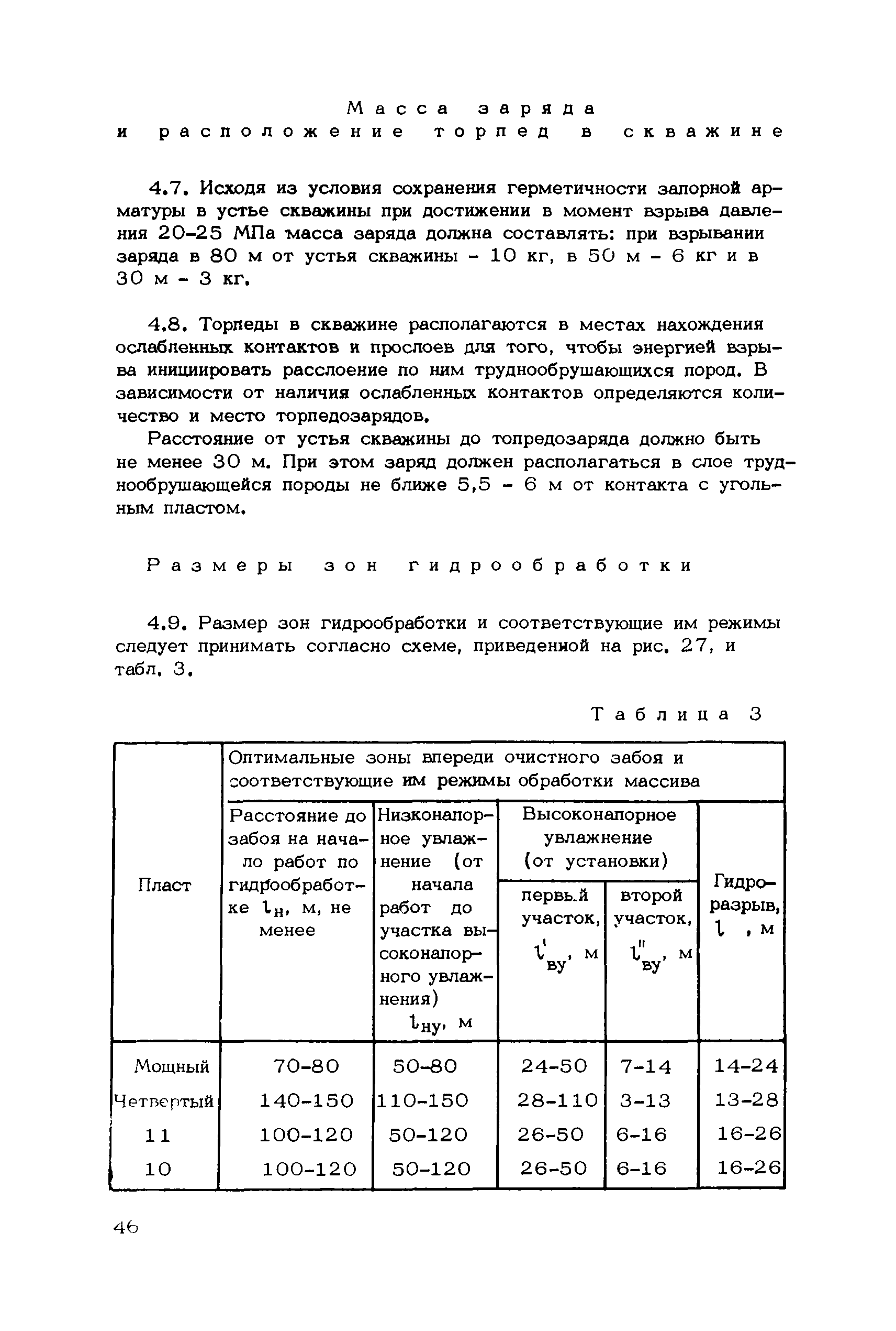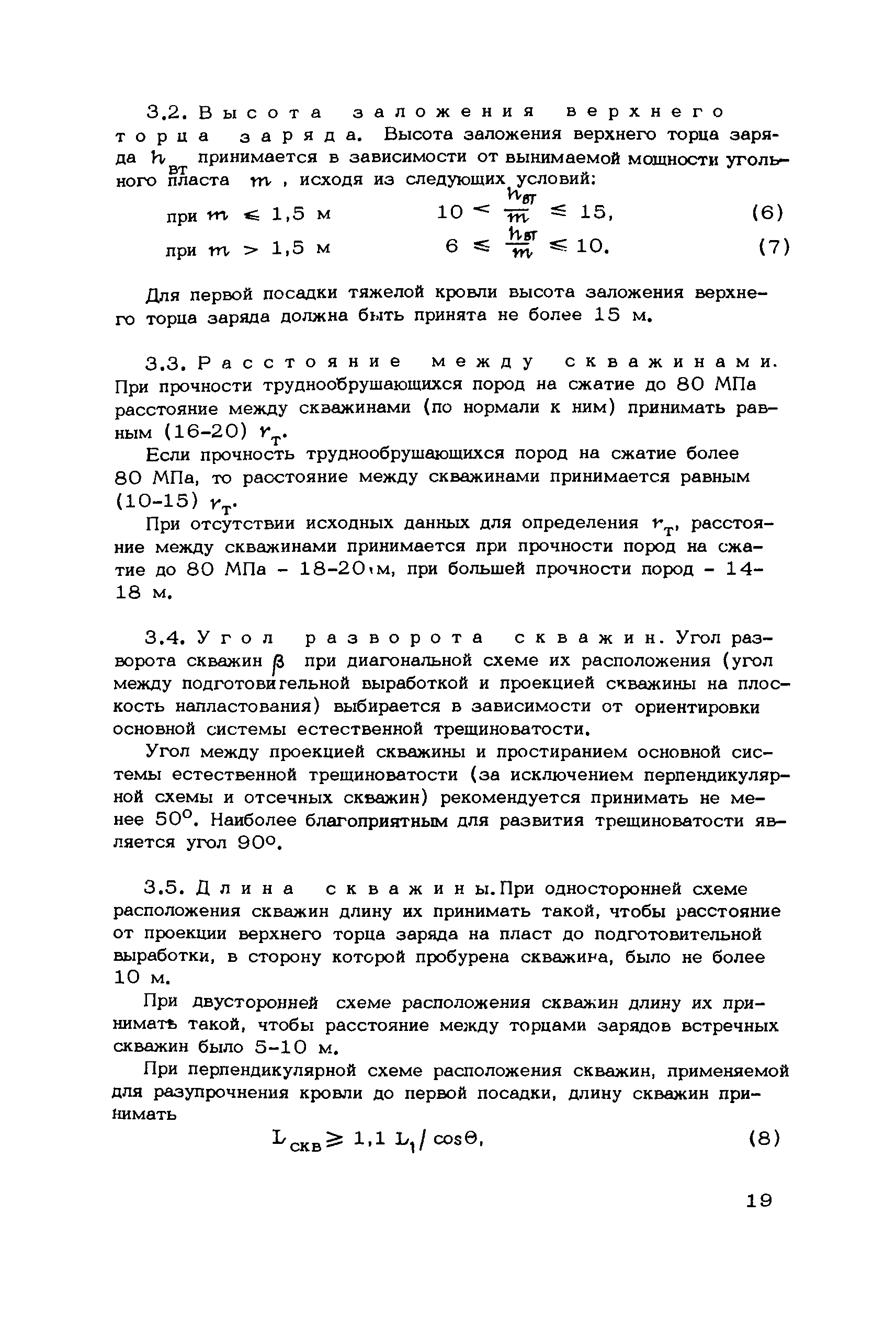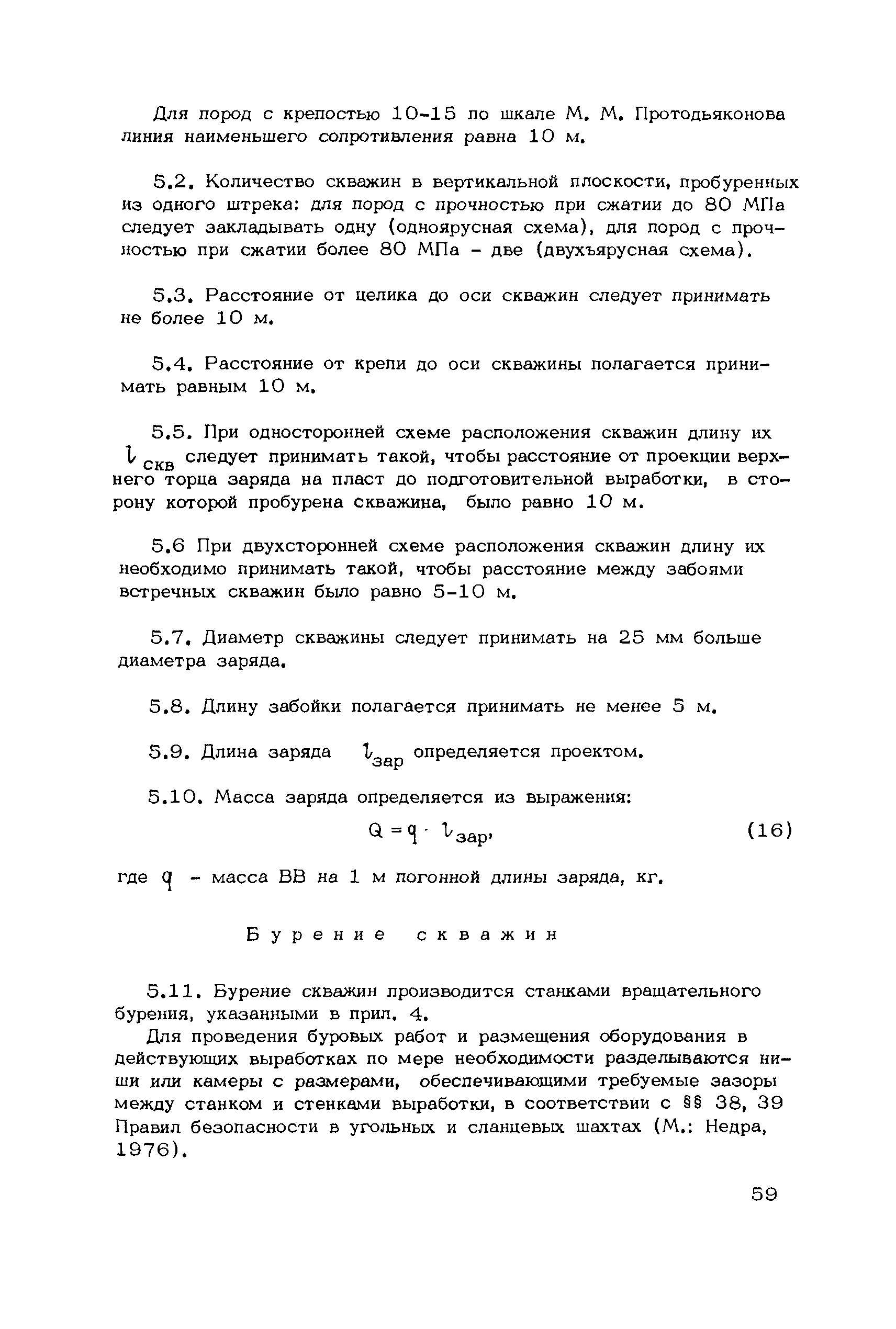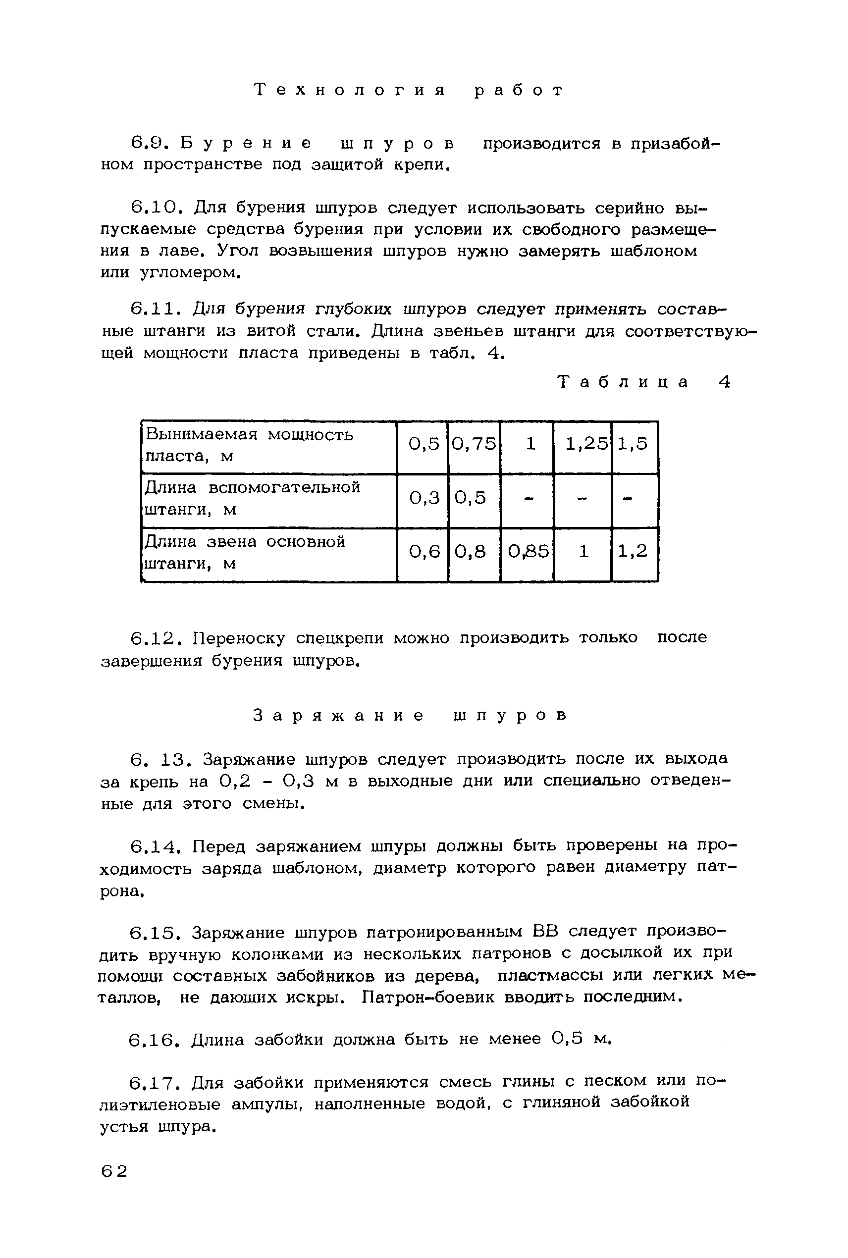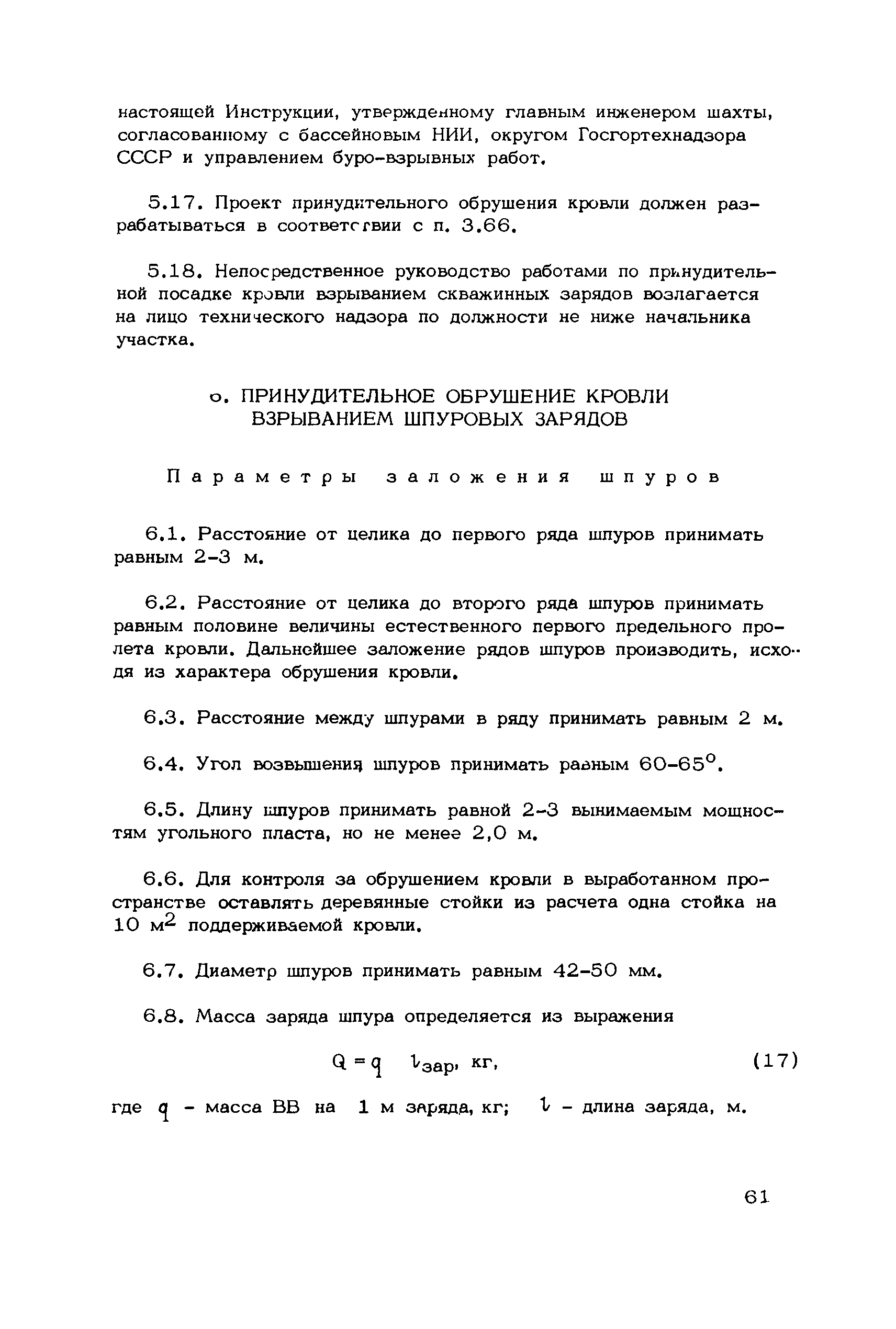 | Оглавление: | Введение 1. Общие положения 2. Сущность и выбор способа разупрочнения Сущность способов разупрочнения Схемы расположения скважин Выбор способа разупрочнения 3. Передовое торпедирование Параметры заложения скважин и зарядов при разупрочнении кровли на выемочных участках Параметры заложения скважин и зарядов для охраны подготовительных выработок при бесцеликовой технологии Конструкция торпед, торпедозарядов и монозарядов Заряжание скважин Забойка и герметизация устья скважин Мероприятия по обеспечению безопасности работ Требования техники безопасности при выполнении работ по бурению скважин Требования техники безопасности при выполнении работ по торпедированию Проектно-техническая документация 4. Гидромикроторпедирование Основные виды работ Параметры заложения скважин Масса заряда и расположение торпед в скважине Размеры зон гидрообработки Параметры нагнетания жидкости в скважины Конструкция торпед Заряжание скважин Герметизация скважин Технологическая схема работ по гидромикроторпедированию Мероприятия по обеспечению безопасности работ Проектно-техническая документация 5. Принудительная первичная посадка тяжелой кровли взрыванием скважинных зарядов Параметры заложения скважин и зарядов Бурение скважин Заряжание скважин Забойка скважин Мероприятия по обеспечению безопасности работ Проектно-техническая документация 6. Принудительное обрушение кровли взрыванием шпуровых зарядов Параметры заложения шпуров Технология работ Мероприятия по обеспечению безопасности работ Проектно-техническая документация 7. Взрывогидрообработка Параметры заложения скважин и зарядов Мероприятия по обеспечению безопасности работ Проектно-техническая документация Приложение 1. Расчет радиуса зоны трещинообразования Приложение 2. Контроль направленности бурения скважин Приложение 3. Требования к изученности состава, строения и механических свойств тяжелых кровель Приложение 4. Перечень и характеристики оборудования для бурения и герметизации скважин Приложение 5. Журнал по нагнетанию жидкости Приложение 6. Журнал по взрыванию скважинных зарядов Приложение 7. Журнал по учету первых и последующих аварийных обрушений тяжелой кровли Приложение 8. Расчеты разрушения тяжелых кровель угольных пластов Приложение 9. Оценка нагрузочных свойств тяжелой кровли |