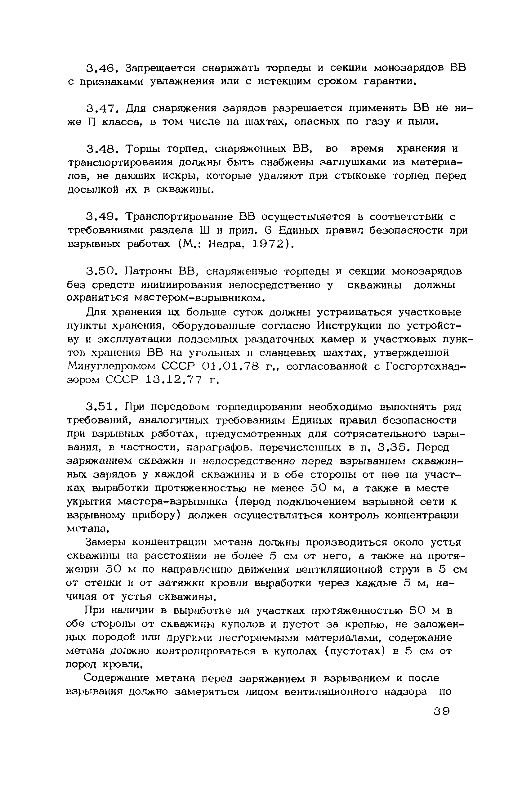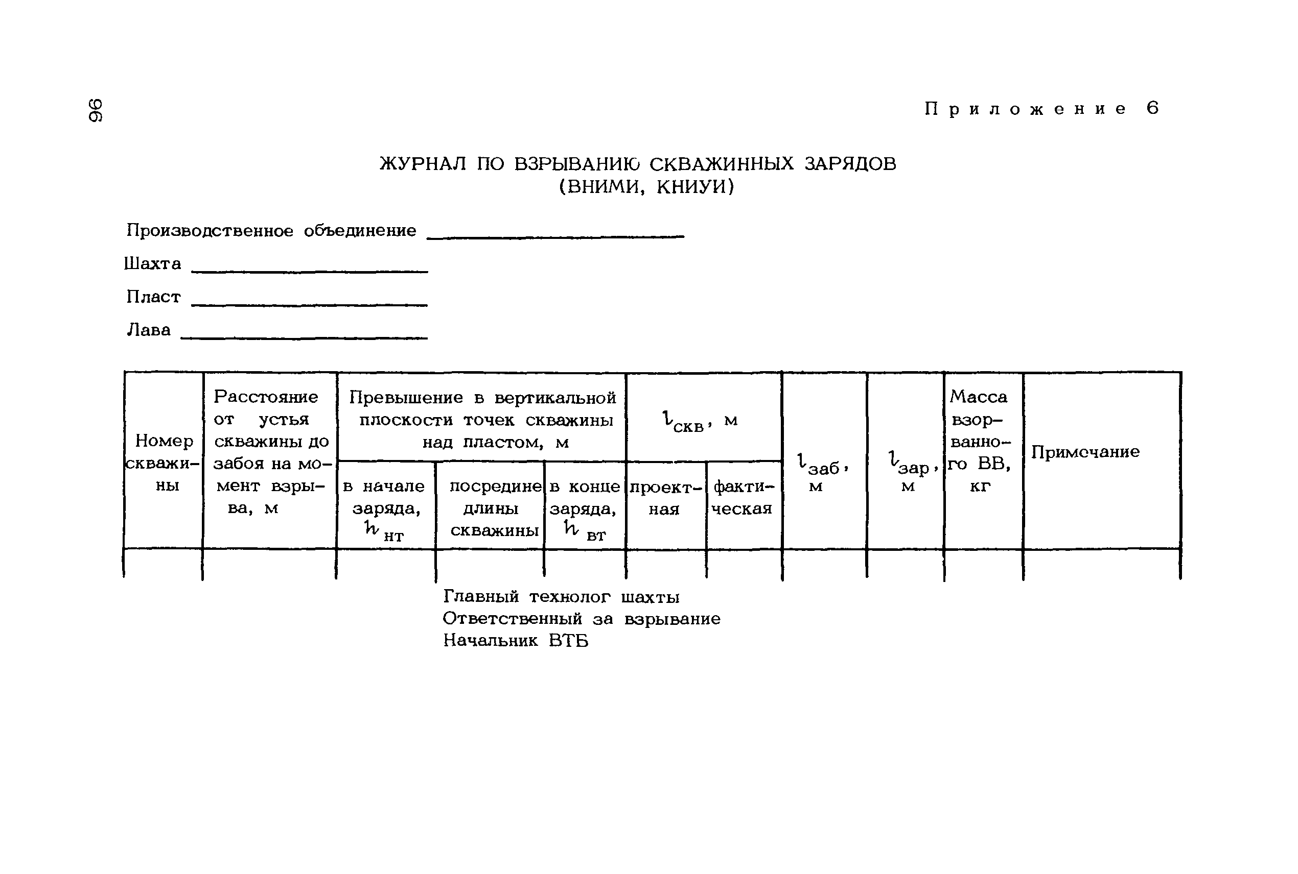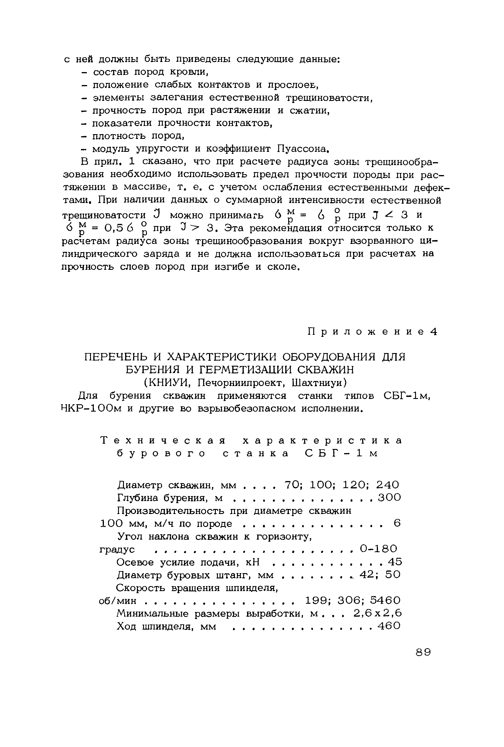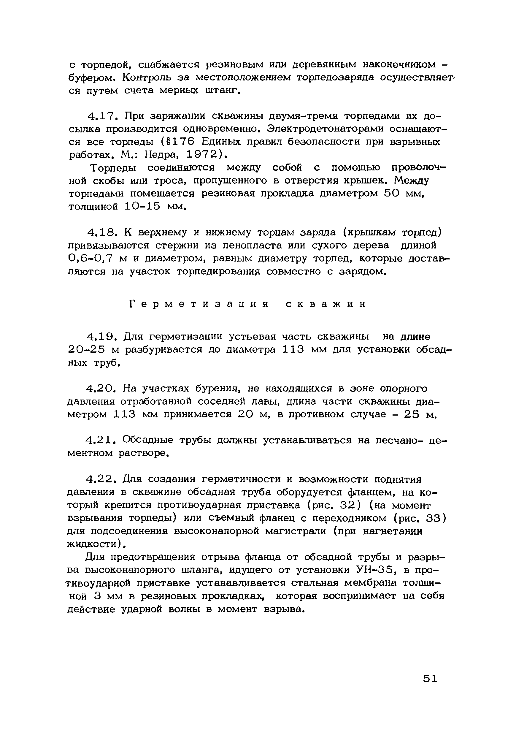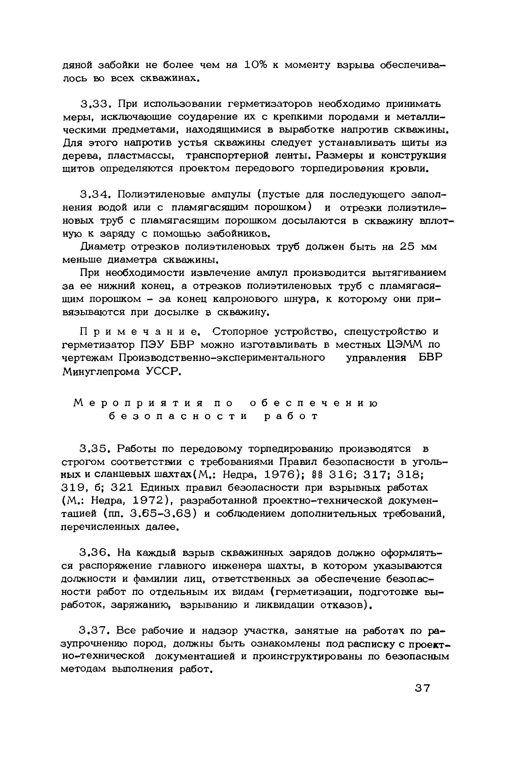 | Оглавление: | Введение 1. Общие положения 2. Сущность и выбор способа разупрочнения Сущность способов разупрочнения Схемы расположения скважин Выбор способа разупрочнения 3. Передовое торпедирование Параметры заложения скважин и зарядов при разупрочнении кровли на выемочных участках Параметры заложения скважин и зарядов для охраны подготовительных выработок при бесцеликовой технологии Конструкция торпед, торпедозарядов и монозарядов Заряжание скважин Забойка и герметизация устья скважин Мероприятия по обеспечению безопасности работ Требования техники безопасности при выполнении работ по бурению скважин Требования техники безопасности при выполнении работ по торпедированию Проектно-техническая документация 4. Гидромикроторпедирование Основные виды работ Параметры заложения скважин Масса заряда и расположение торпед в скважине Размеры зон гидрообработки Параметры нагнетания жидкости в скважины Конструкция торпед Заряжание скважин Герметизация скважин Технологическая схема работ по гидромикроторпедированию Мероприятия по обеспечению безопасности работ Проектно-техническая документация 5. Принудительная первичная посадка тяжелой кровли взрыванием скважинных зарядов Параметры заложения скважин и зарядов Бурение скважин Заряжание скважин Забойка скважин Мероприятия по обеспечению безопасности работ Проектно-техническая документация 6. Принудительное обрушение кровли взрыванием шпуровых зарядов Параметры заложения шпуров Технология работ Мероприятия по обеспечению безопасности работ Проектно-техническая документация 7. Взрывогидрообработка Параметры заложения скважин и зарядов Мероприятия по обеспечению безопасности работ Проектно-техническая документация Приложение 1. Расчет радиуса зоны трещинообразования Приложение 2. Контроль направленности бурения скважин Приложение 3. Требования к изученности состава, строения и механических свойств тяжелых кровель Приложение 4. Перечень и характеристики оборудования для бурения и герметизации скважин Приложение 5. Журнал по нагнетанию жидкости Приложение 6. Журнал по взрыванию скважинных зарядов Приложение 7. Журнал по учету первых и последующих аварийных обрушений тяжелой кровли Приложение 8. Расчеты разрушения тяжелых кровель угольных пластов Приложение 9. Оценка нагрузочных свойств тяжелой кровли |