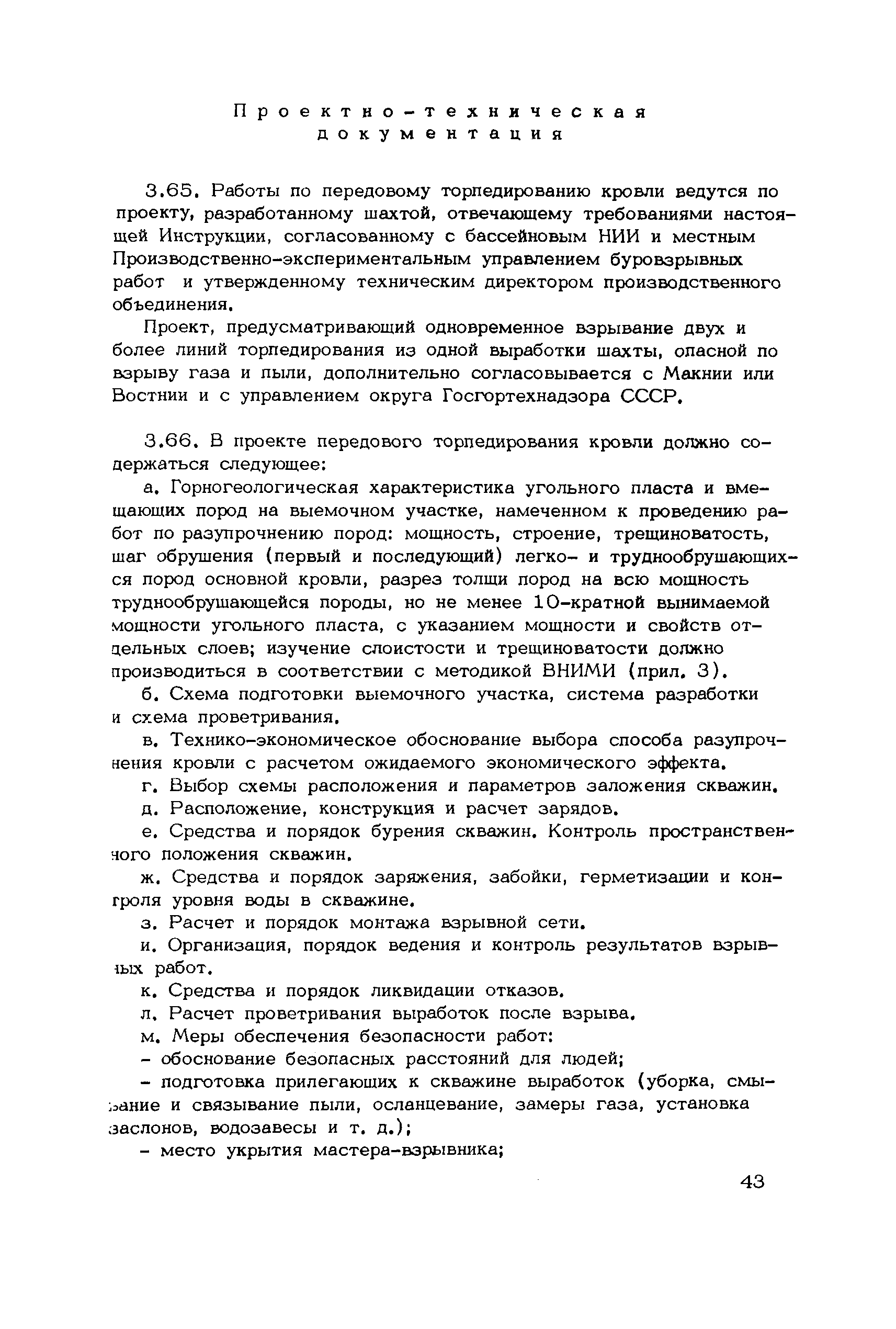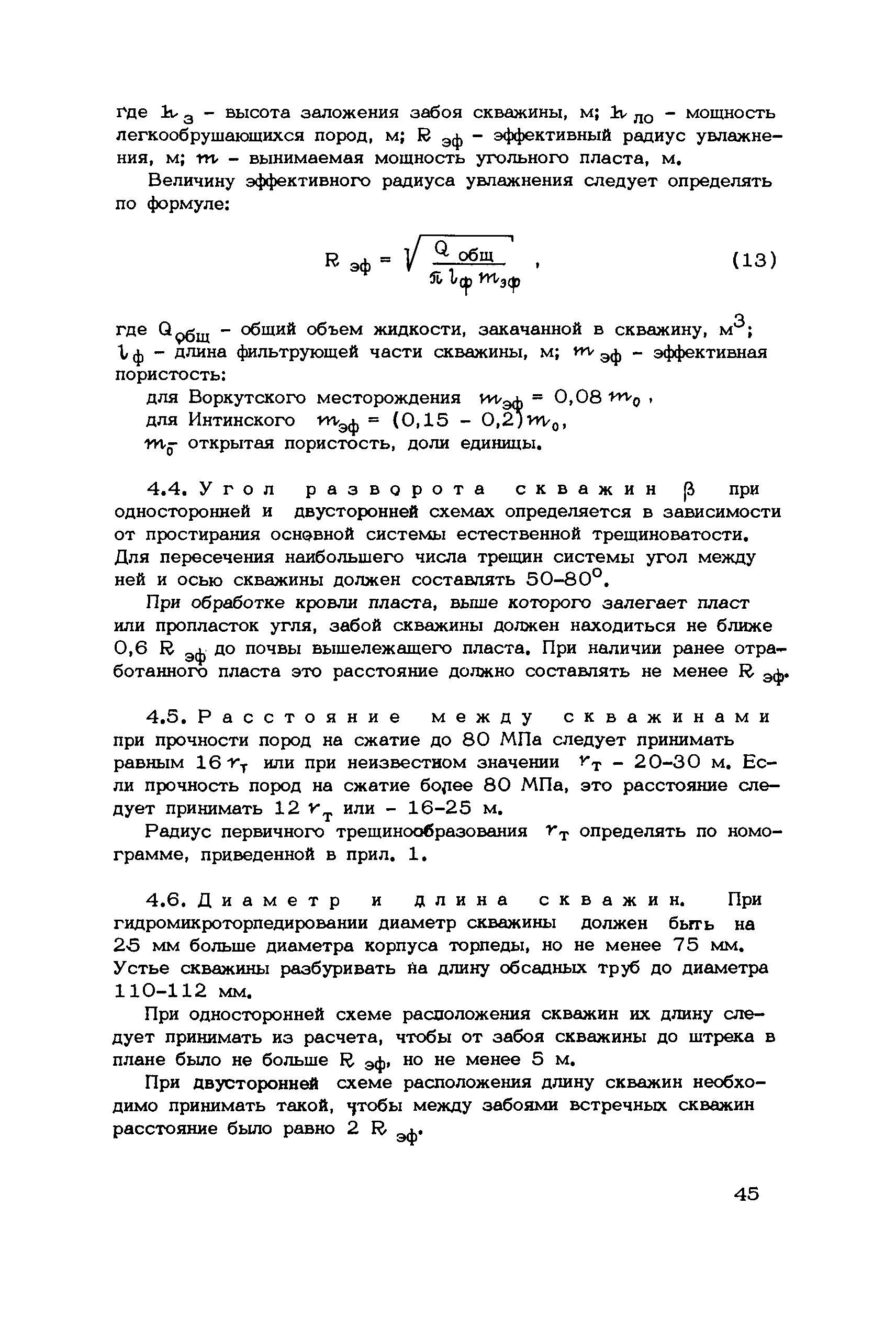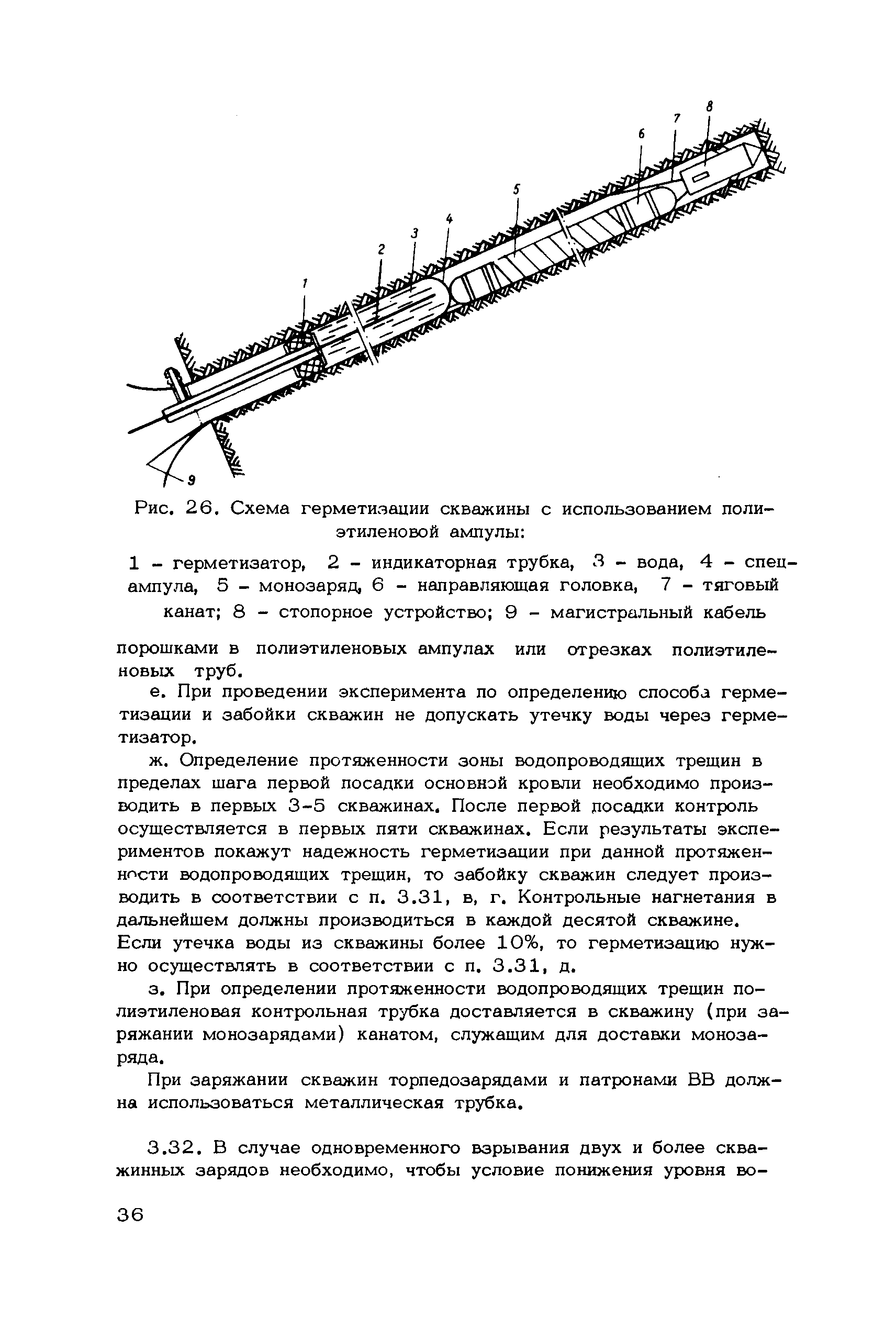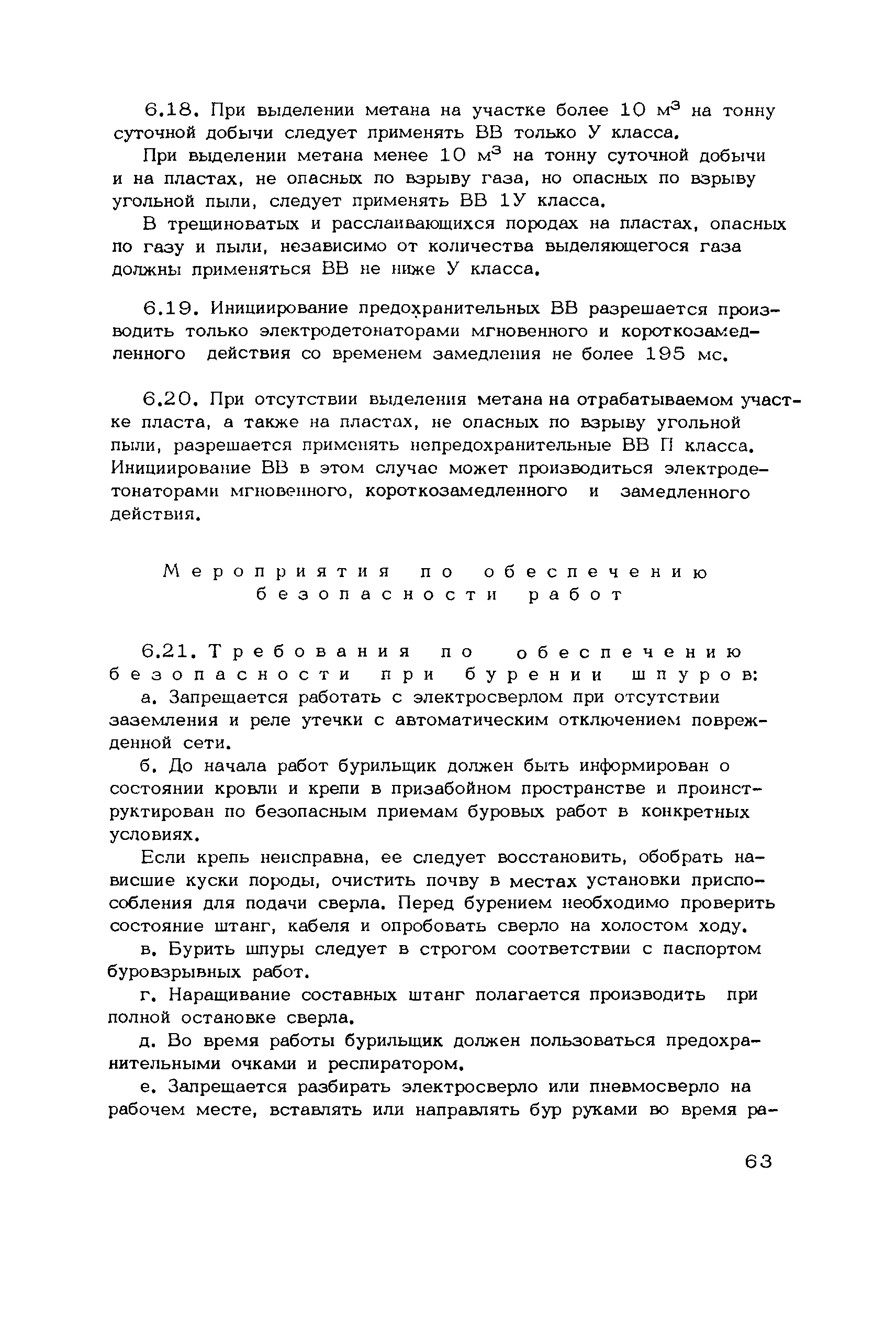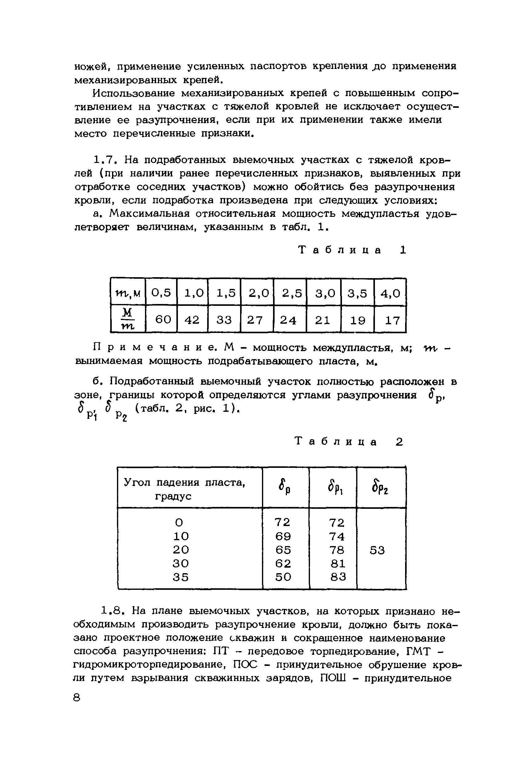 | Оглавление: | Введение 1. Общие положения 2. Сущность и выбор способа разупрочнения Сущность способов разупрочнения Схемы расположения скважин Выбор способа разупрочнения 3. Передовое торпедирование Параметры заложения скважин и зарядов при разупрочнении кровли на выемочных участках Параметры заложения скважин и зарядов для охраны подготовительных выработок при бесцеликовой технологии Конструкция торпед, торпедозарядов и монозарядов Заряжание скважин Забойка и герметизация устья скважин Мероприятия по обеспечению безопасности работ Требования техники безопасности при выполнении работ по бурению скважин Требования техники безопасности при выполнении работ по торпедированию Проектно-техническая документация 4. Гидромикроторпедирование Основные виды работ Параметры заложения скважин Масса заряда и расположение торпед в скважине Размеры зон гидрообработки Параметры нагнетания жидкости в скважины Конструкция торпед Заряжание скважин Герметизация скважин Технологическая схема работ по гидромикроторпедированию Мероприятия по обеспечению безопасности работ Проектно-техническая документация 5. Принудительная первичная посадка тяжелой кровли взрыванием скважинных зарядов Параметры заложения скважин и зарядов Бурение скважин Заряжание скважин Забойка скважин Мероприятия по обеспечению безопасности работ Проектно-техническая документация 6. Принудительное обрушение кровли взрыванием шпуровых зарядов Параметры заложения шпуров Технология работ Мероприятия по обеспечению безопасности работ Проектно-техническая документация 7. Взрывогидрообработка Параметры заложения скважин и зарядов Мероприятия по обеспечению безопасности работ Проектно-техническая документация Приложение 1. Расчет радиуса зоны трещинообразования Приложение 2. Контроль направленности бурения скважин Приложение 3. Требования к изученности состава, строения и механических свойств тяжелых кровель Приложение 4. Перечень и характеристики оборудования для бурения и герметизации скважин Приложение 5. Журнал по нагнетанию жидкости Приложение 6. Журнал по взрыванию скважинных зарядов Приложение 7. Журнал по учету первых и последующих аварийных обрушений тяжелой кровли Приложение 8. Расчеты разрушения тяжелых кровель угольных пластов Приложение 9. Оценка нагрузочных свойств тяжелой кровли |