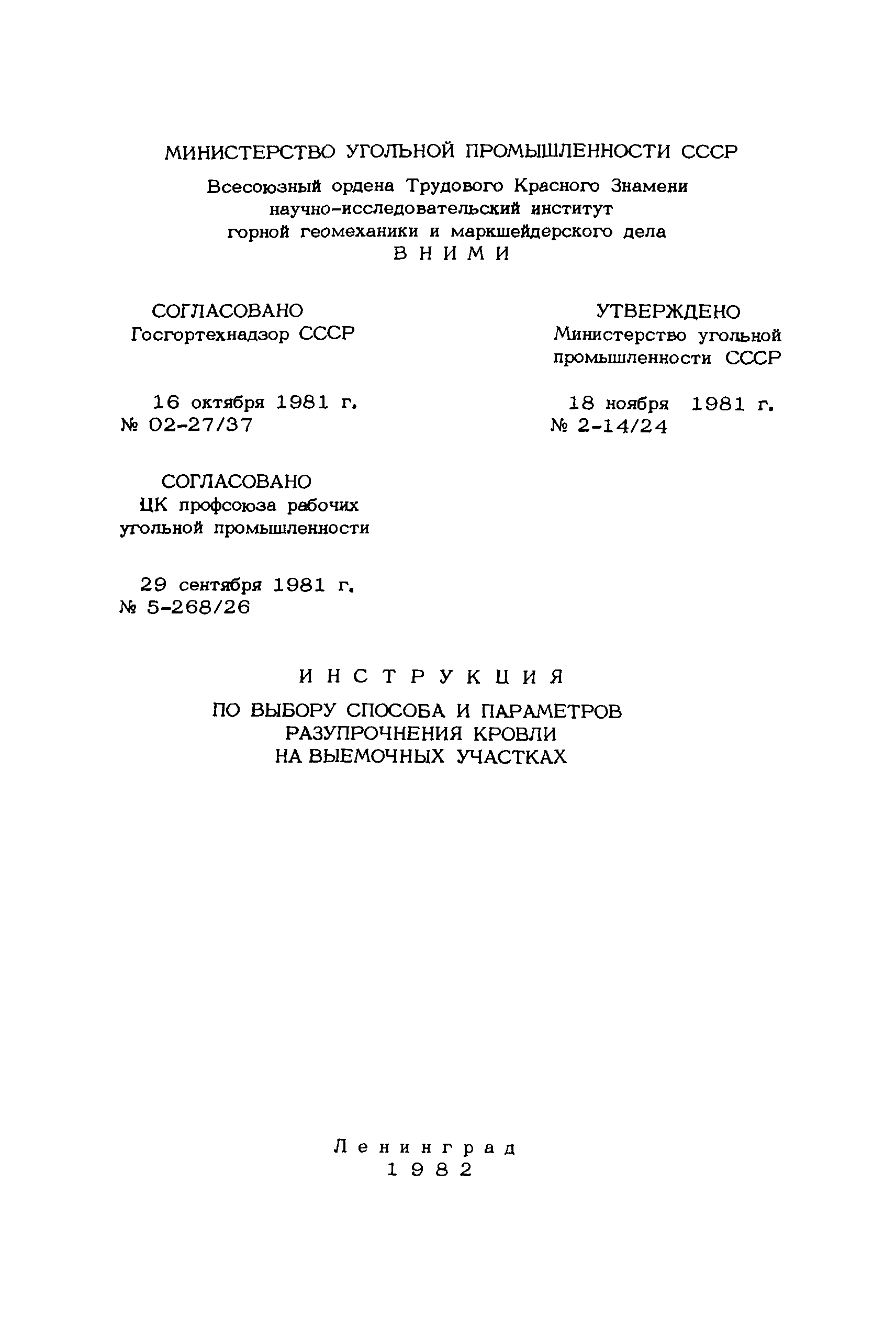 | Утверждён: | 18.11.1981 Министерство угольной промышленности СССР (USSR Ministry of the Coal Industry 2-14/24)