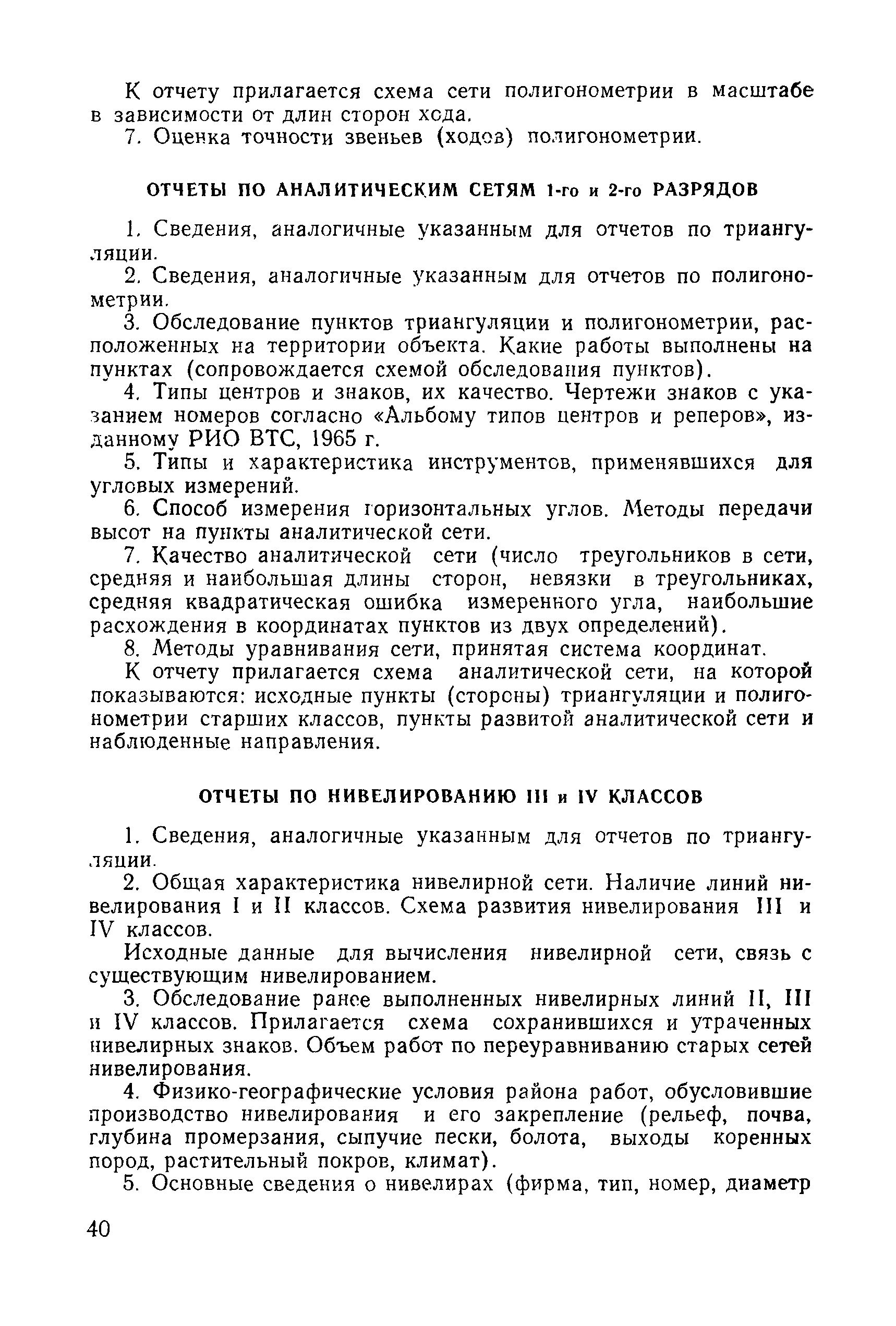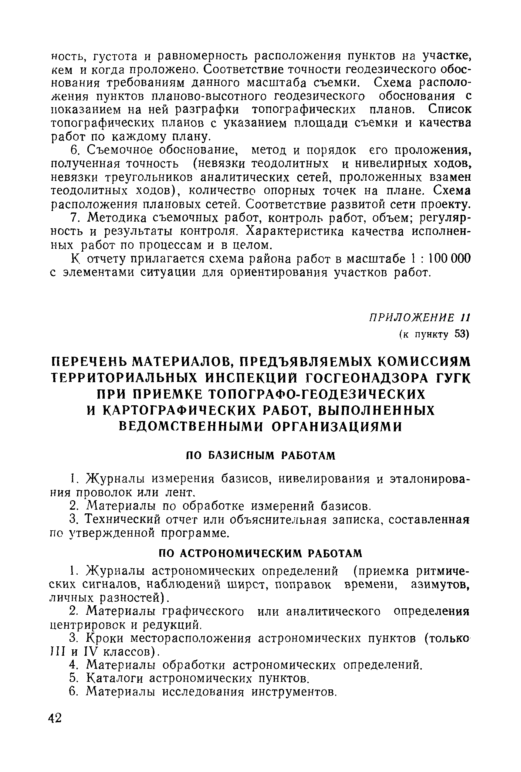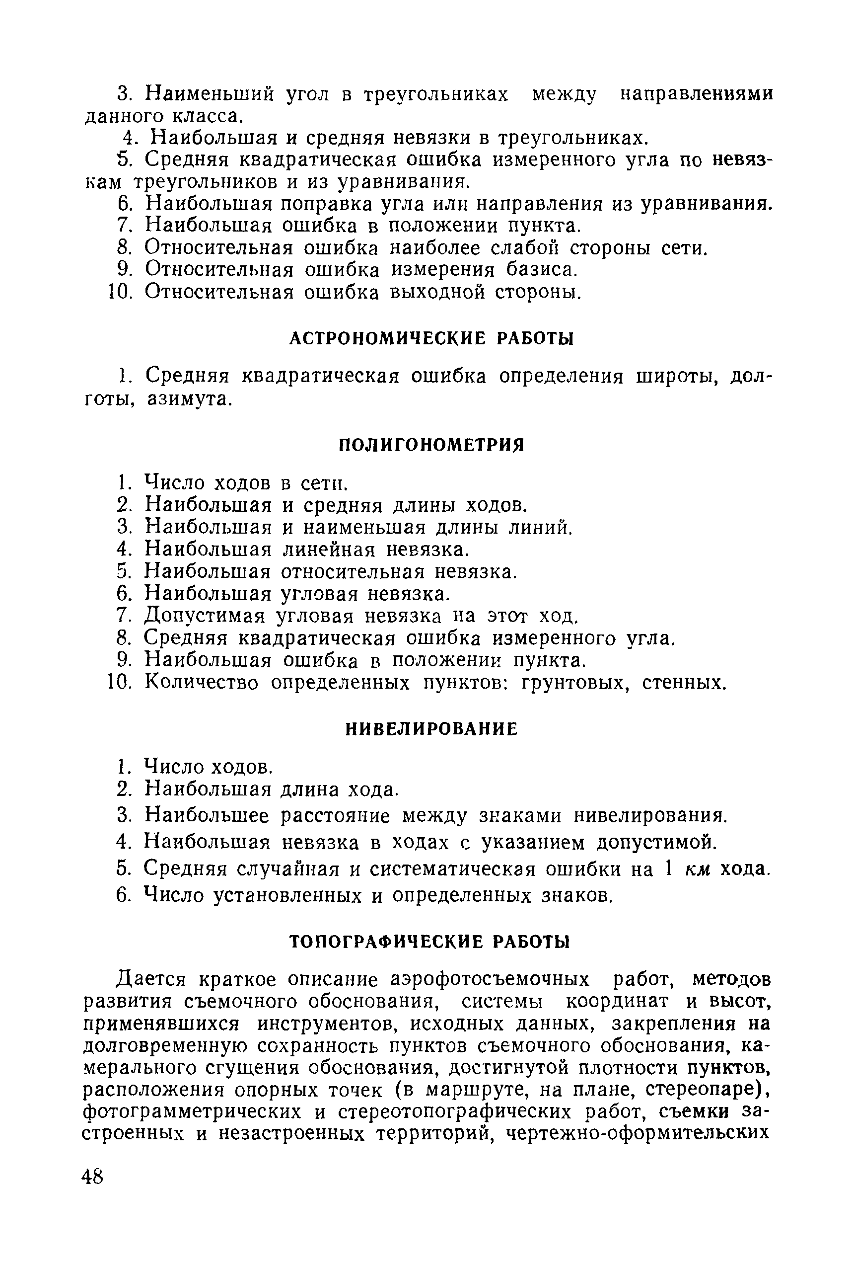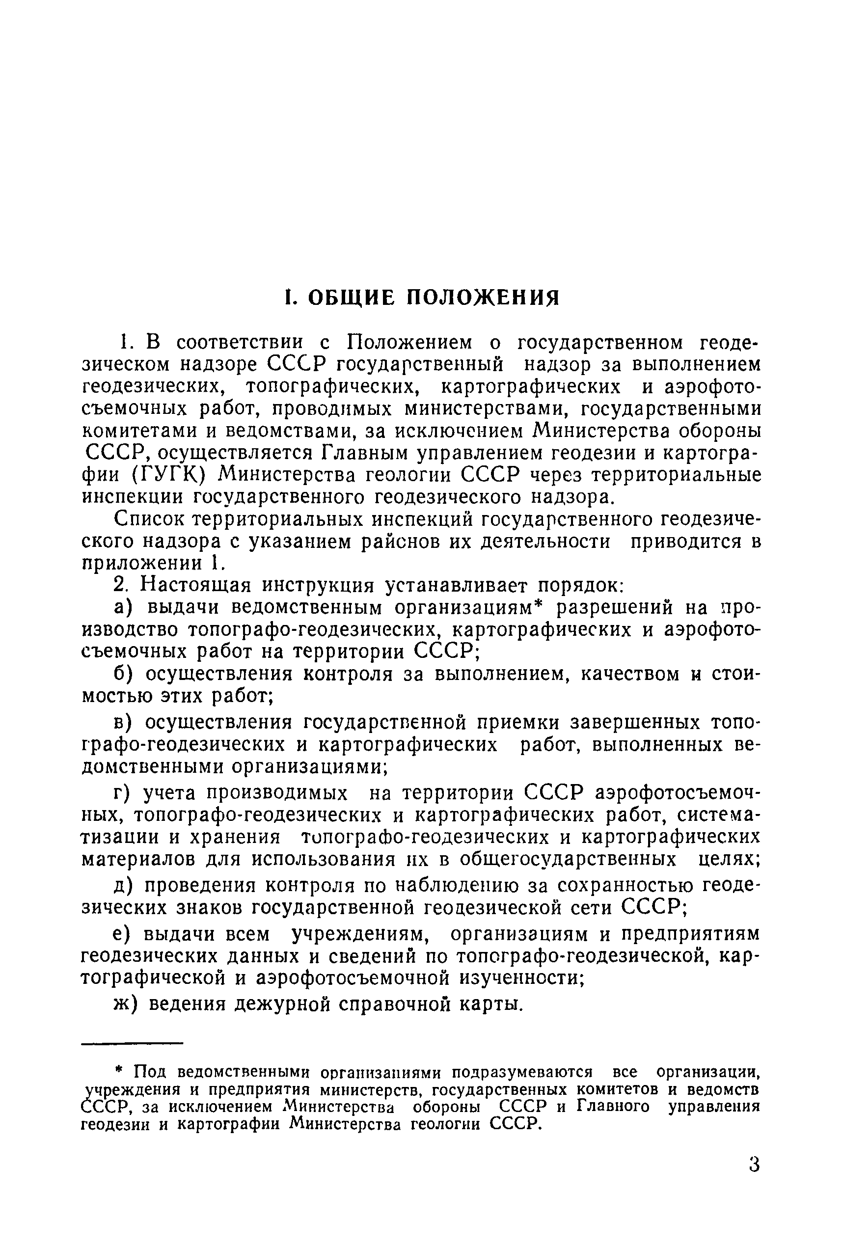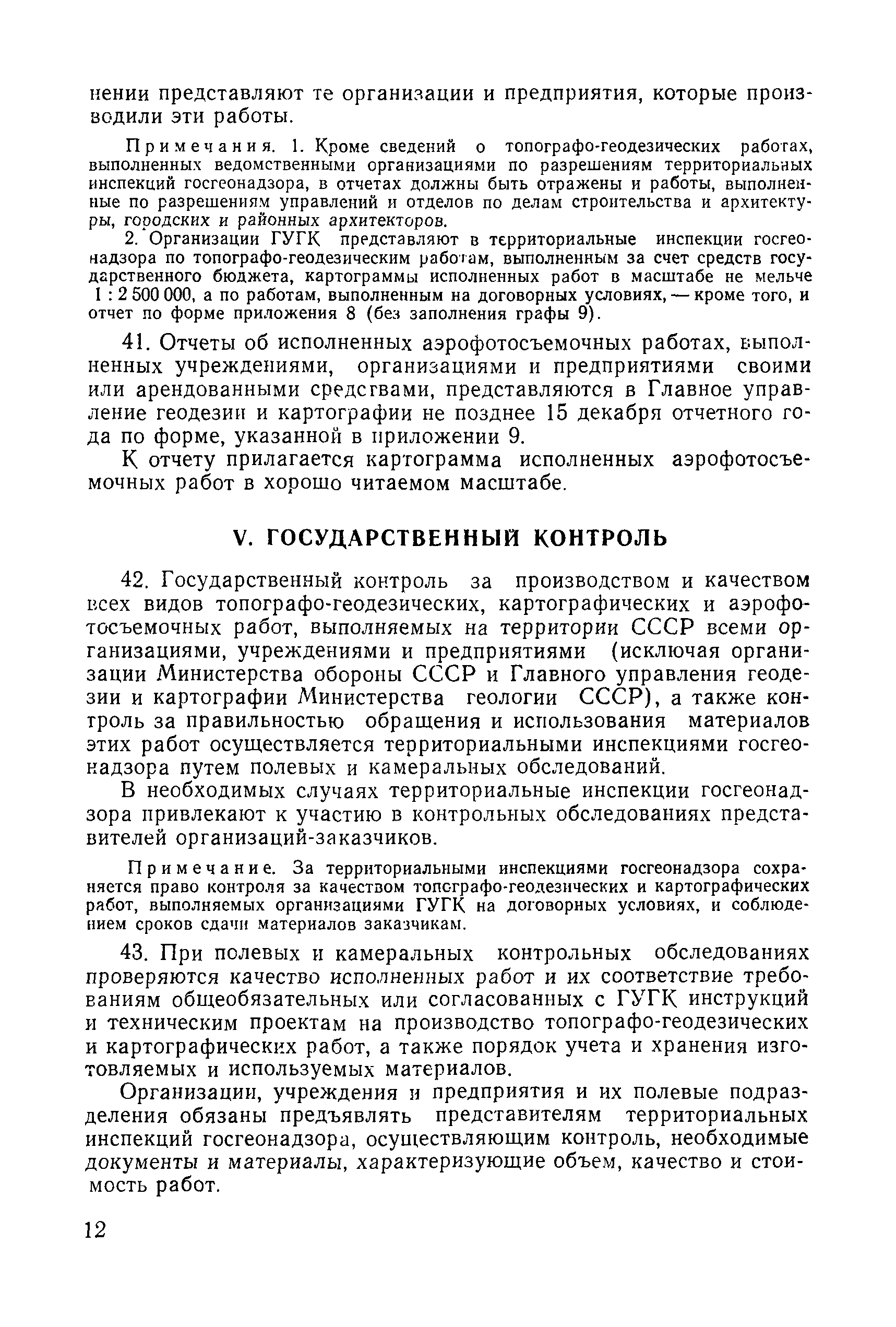 Инструкция о Государственном геодезическом надзоре| Статус: | заменен | | Название рус.: | Инструкция о Государственном геодезическом надзоре | | Дата добавления в базу: | 01.02.2020 | | Дата актуализации: | 01.01.2021 | | Область применения: | Инструкция обязательна для всех министерств, государственных комитетов, ведомств, организаций, учреждений и предприятий СССР, выполняющих топографо-геодезические. Картографические и аэрофотосъемочные работы | | Оглавление: | 1. Общие положения 2. Разрешение производства топографо-геодезических, картографических и аэрофотосъемочных работ 3. Внутриведомственный контроль и приемка работ 4. Отчеты по исполненным работам 5. Государственный контроль 6. Государственная приемка работ 7. Контроль по наблюдению за сохранностью геодезических знаков государственной геодезической сети СССР 8. Концентрация материалов и справочно-техническая работа 9. Ведение дежурной справочной карты Приложение 1. Список территориальных инспекций государственного геодезического надзора Главного управления геодезии и картографии Министерства геологии СССР с указанием районов их деятельности по состоянию на 1 июля 1966 г. Приложение 2. План топографо-геодезических и картографических работ Приложение 3. Заявление Приложение 4. Разрешение на производство топографо-геодезических работ Приложение 5. Заявление Приложение 6. Перечень сведений, представляемых организациями, ведомствами, предприятиями СССР в Главное управление геодезии и картографии МГ СССР при заявке на производство аэрофотосъемочных работ Приложение 7. Примерная программа контрольного обследования полевых топографо-геодезических работ и образец акта Приложение 8. Отчет о выполненных топографо-геодезических и картографических работах Приложение 9. Отчет о выполненных аэрофотосъемочных работах Приложение 10. Краткие указания по составлению технических отчетов по топографо-геодезическим работам Приложение 11. Перечень материалов, предъявляемых комиссиям территориальных инспекций госгеонадзора ГУГК при приемке топографо-геодезических и картографических работ, выполненных ведомственными организациями Приложение 12. Акт государственной приемки топографо-геодезических работ Приложение 13. Сводка о геодезических пунктах, на которых возобновлено наружное оформление мест расположения центров и реперов Приложение 14. Перечень материалов топографо-геодезических и картографических работ, принятых комиссиями по государственной приемке и подлежащих передаче на постоянное хранение в территориальные инспекции госгеонадзора и Центральный картографо-геодезический фонд Главного управления геодезии и картографии Министерства геологии СССР | | Утверждён: | Министерство геологии СССР