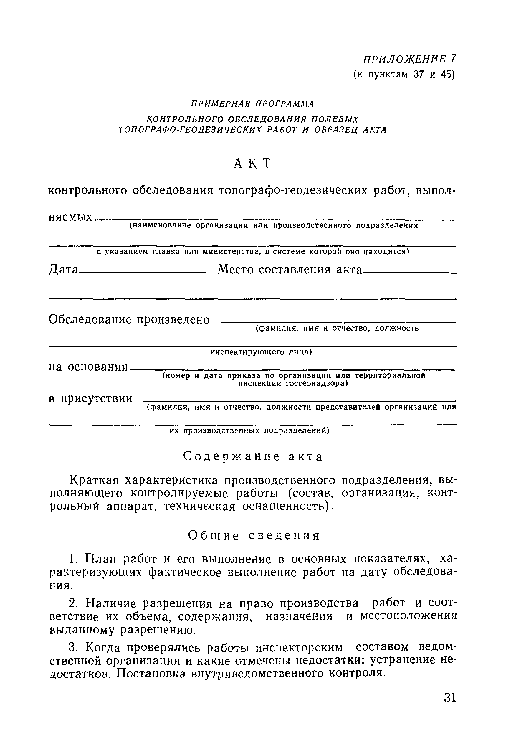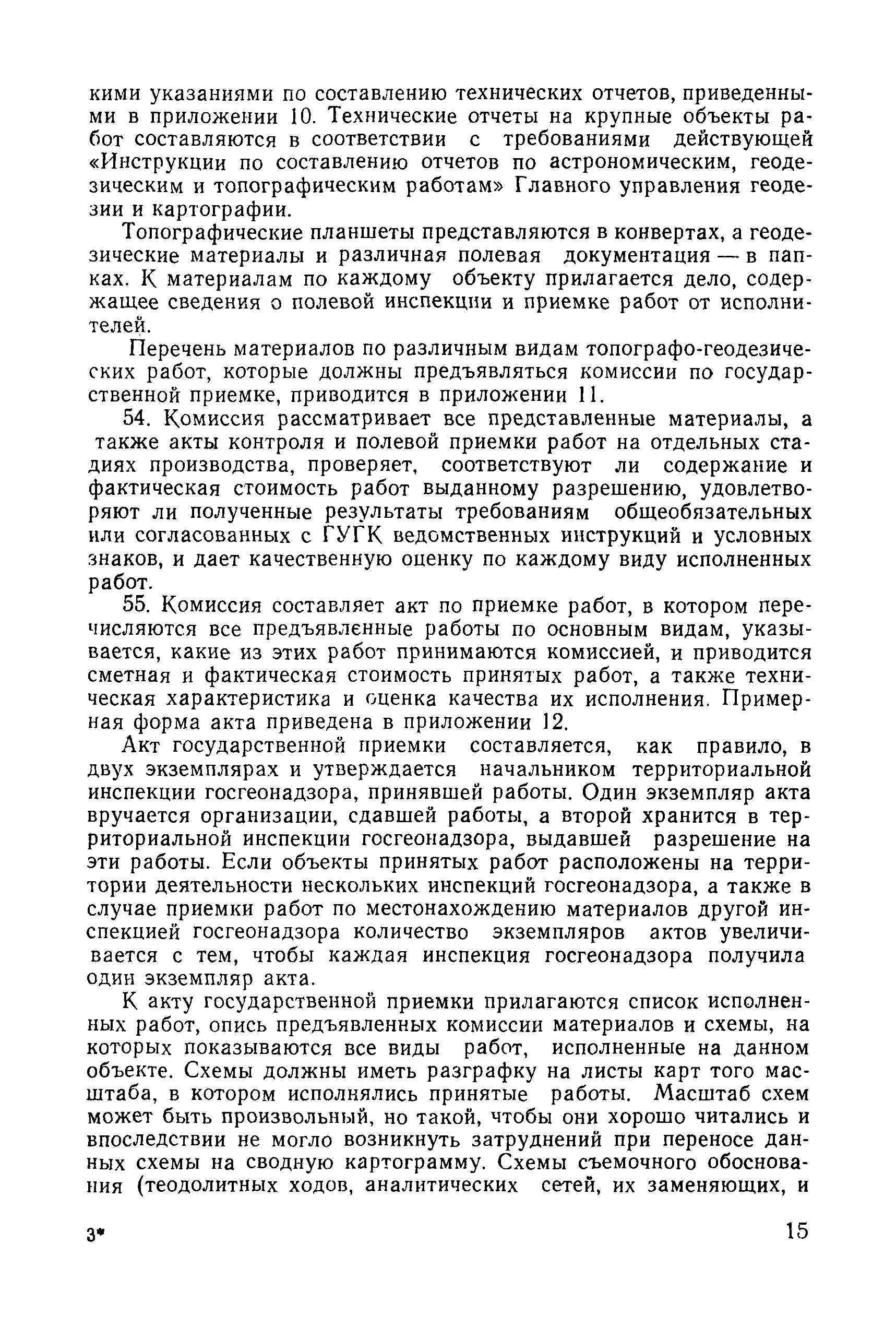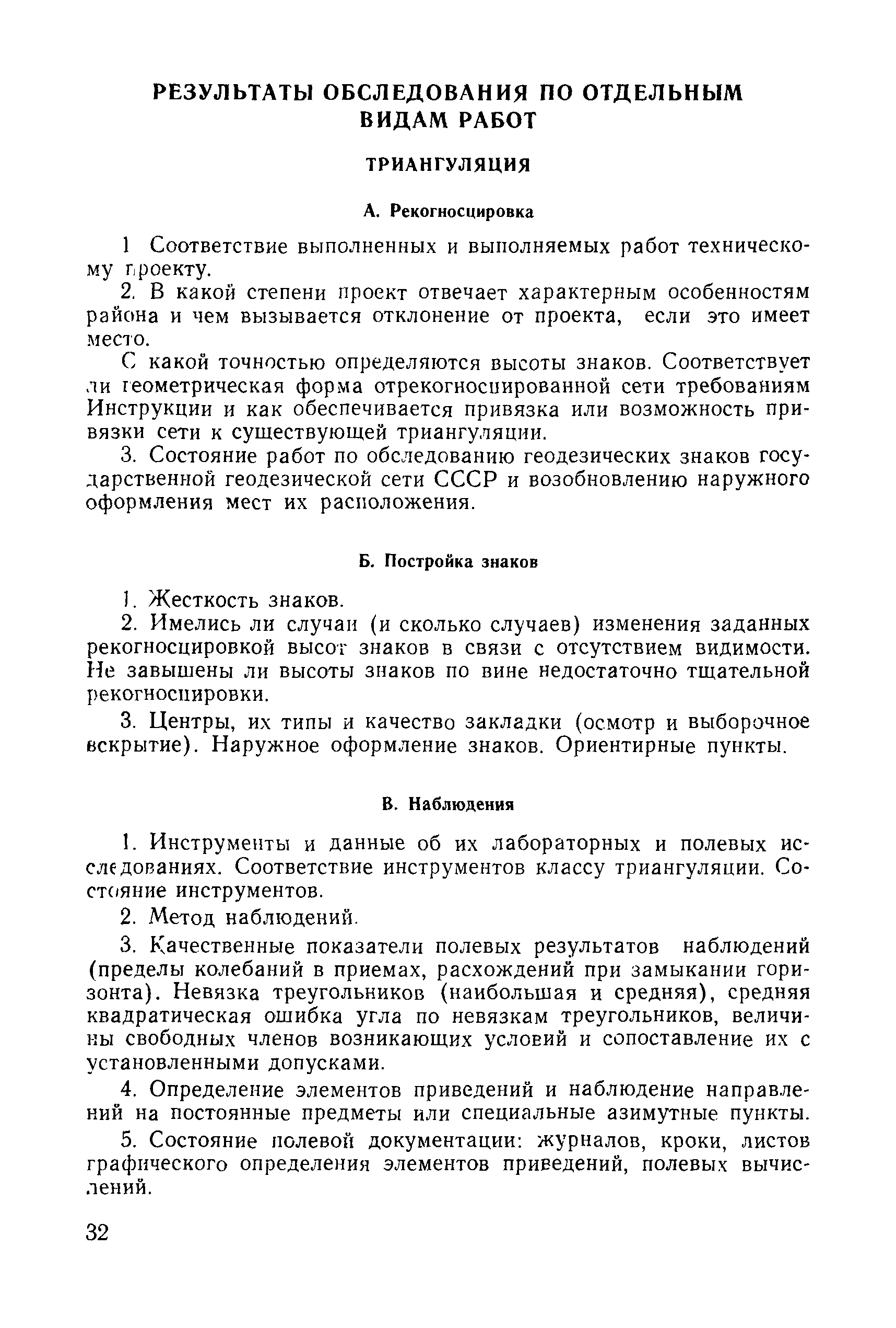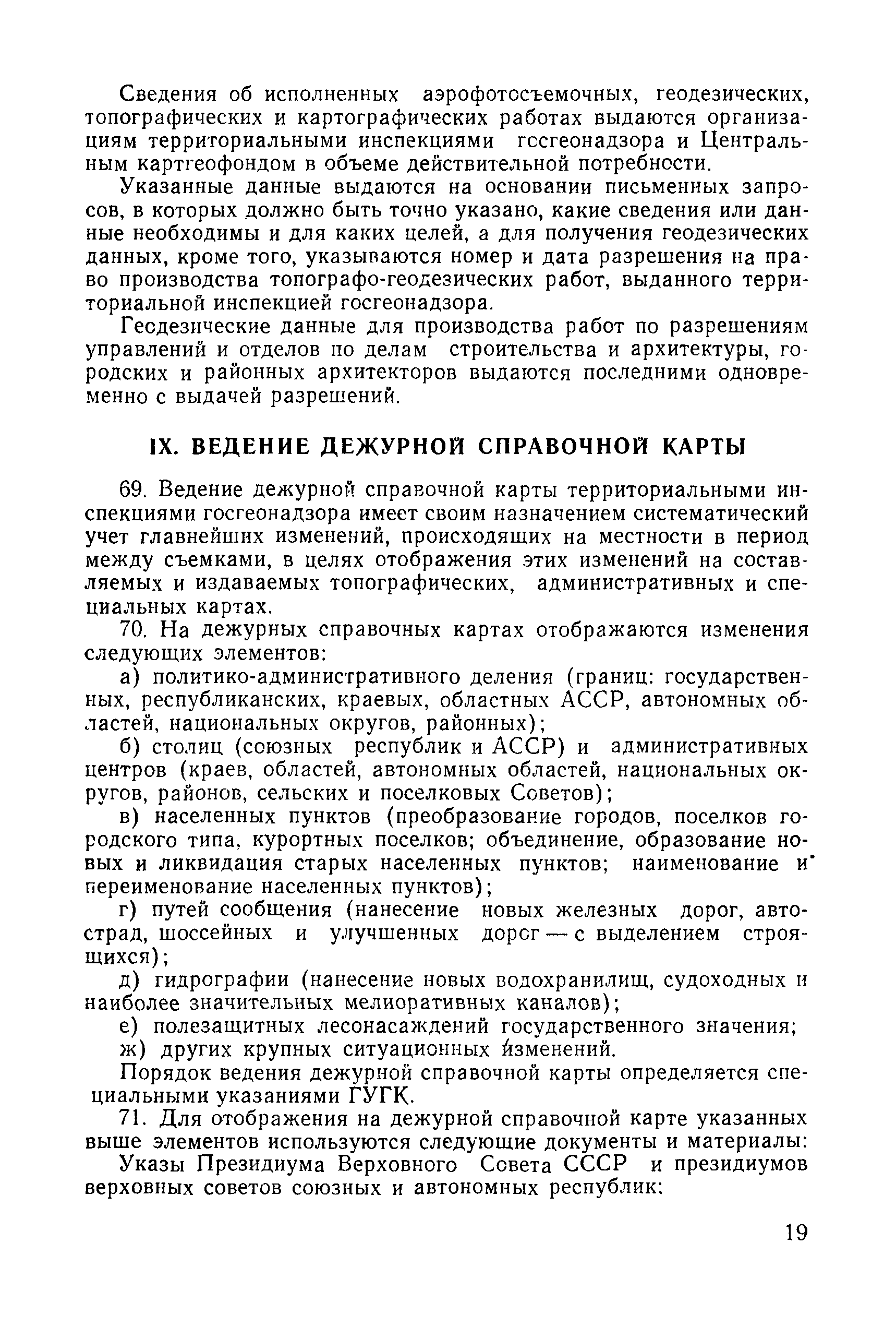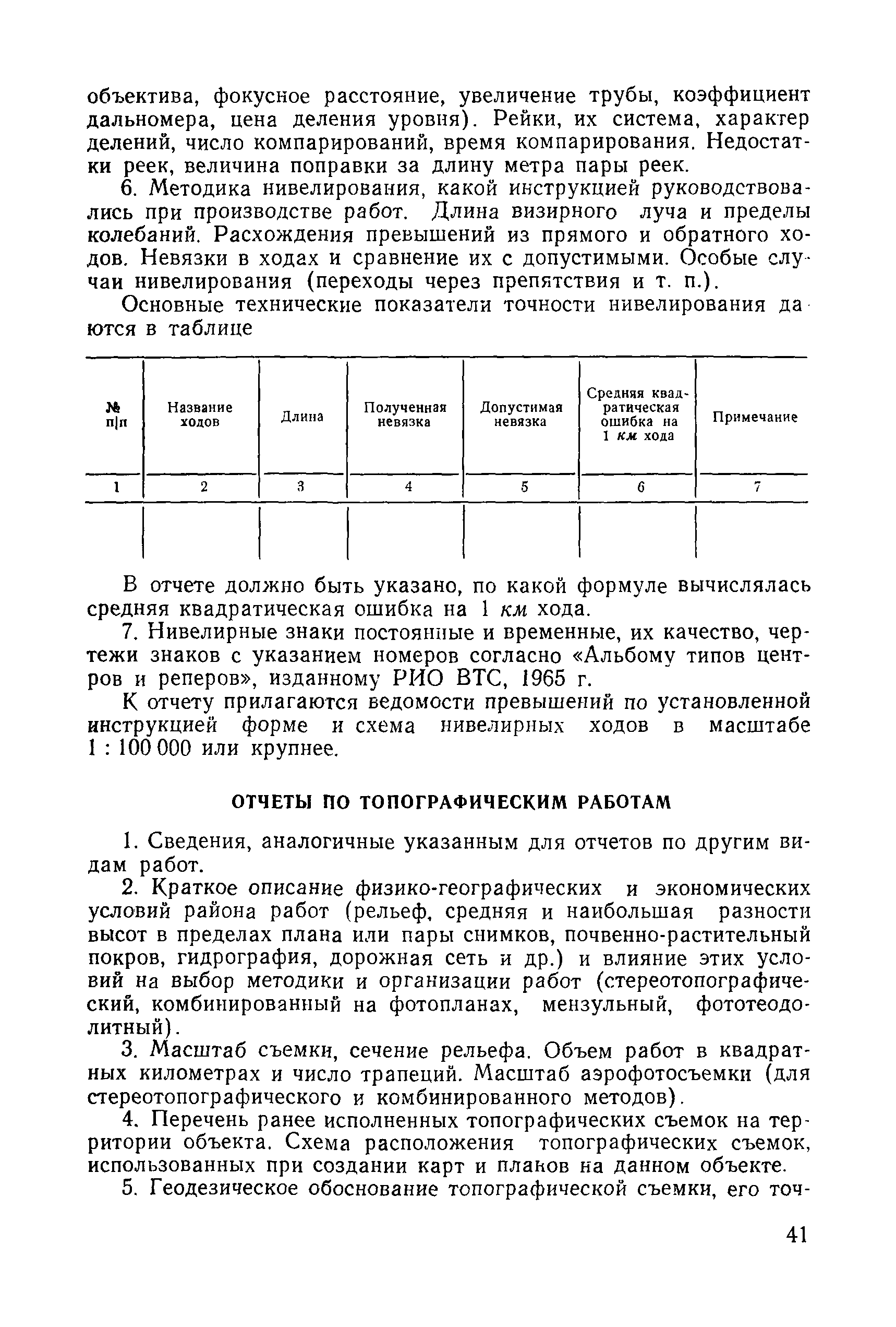 Инструкция о Государственном геодезическом надзоре| Статус: | заменен | | Название рус.: | Инструкция о Государственном геодезическом надзоре | | Дата добавления в базу: | 01.02.2020 | | Дата актуализации: | 01.01.2021 | | Область применения: | Инструкция обязательна для всех министерств, государственных комитетов, ведомств, организаций, учреждений и предприятий СССР, выполняющих топографо-геодезические. Картографические и аэрофотосъемочные работы | | Оглавление: | 1. Общие положения 2. Разрешение производства топографо-геодезических, картографических и аэрофотосъемочных работ 3. Внутриведомственный контроль и приемка работ 4. Отчеты по исполненным работам 5. Государственный контроль 6. Государственная приемка работ 7. Контроль по наблюдению за сохранностью геодезических знаков государственной геодезической сети СССР 8. Концентрация материалов и справочно-техническая работа 9. Ведение дежурной справочной карты Приложение 1. Список территориальных инспекций государственного геодезического надзора Главного управления геодезии и картографии Министерства геологии СССР с указанием районов их деятельности по состоянию на 1 июля 1966 г. Приложение 2. План топографо-геодезических и картографических работ Приложение 3. Заявление Приложение 4. Разрешение на производство топографо-геодезических работ Приложение 5. Заявление Приложение 6. Перечень сведений, представляемых организациями, ведомствами, предприятиями СССР в Главное управление геодезии и картографии МГ СССР при заявке на производство аэрофотосъемочных работ Приложение 7. Примерная программа контрольного обследования полевых топографо-геодезических работ и образец акта Приложение 8. Отчет о выполненных топографо-геодезических и картографических работах Приложение 9. Отчет о выполненных аэрофотосъемочных работах Приложение 10. Краткие указания по составлению технических отчетов по топографо-геодезическим работам Приложение 11. Перечень материалов, предъявляемых комиссиям территориальных инспекций госгеонадзора ГУГК при приемке топографо-геодезических и картографических работ, выполненных ведомственными организациями Приложение 12. Акт государственной приемки топографо-геодезических работ Приложение 13. Сводка о геодезических пунктах, на которых возобновлено наружное оформление мест расположения центров и реперов Приложение 14. Перечень материалов топографо-геодезических и картографических работ, принятых комиссиями по государственной приемке и подлежащих передаче на постоянное хранение в территориальные инспекции госгеонадзора и Центральный картографо-геодезический фонд Главного управления геодезии и картографии Министерства геологии СССР | | Утверждён: | Министерство геологии СССР