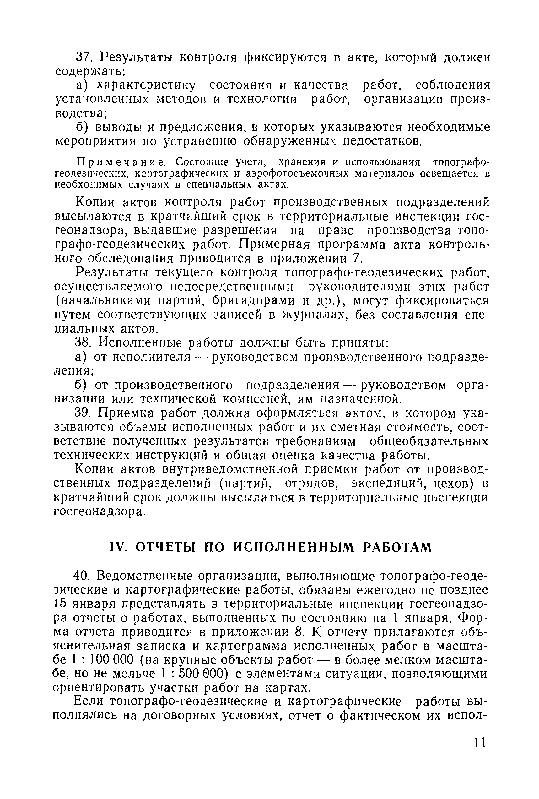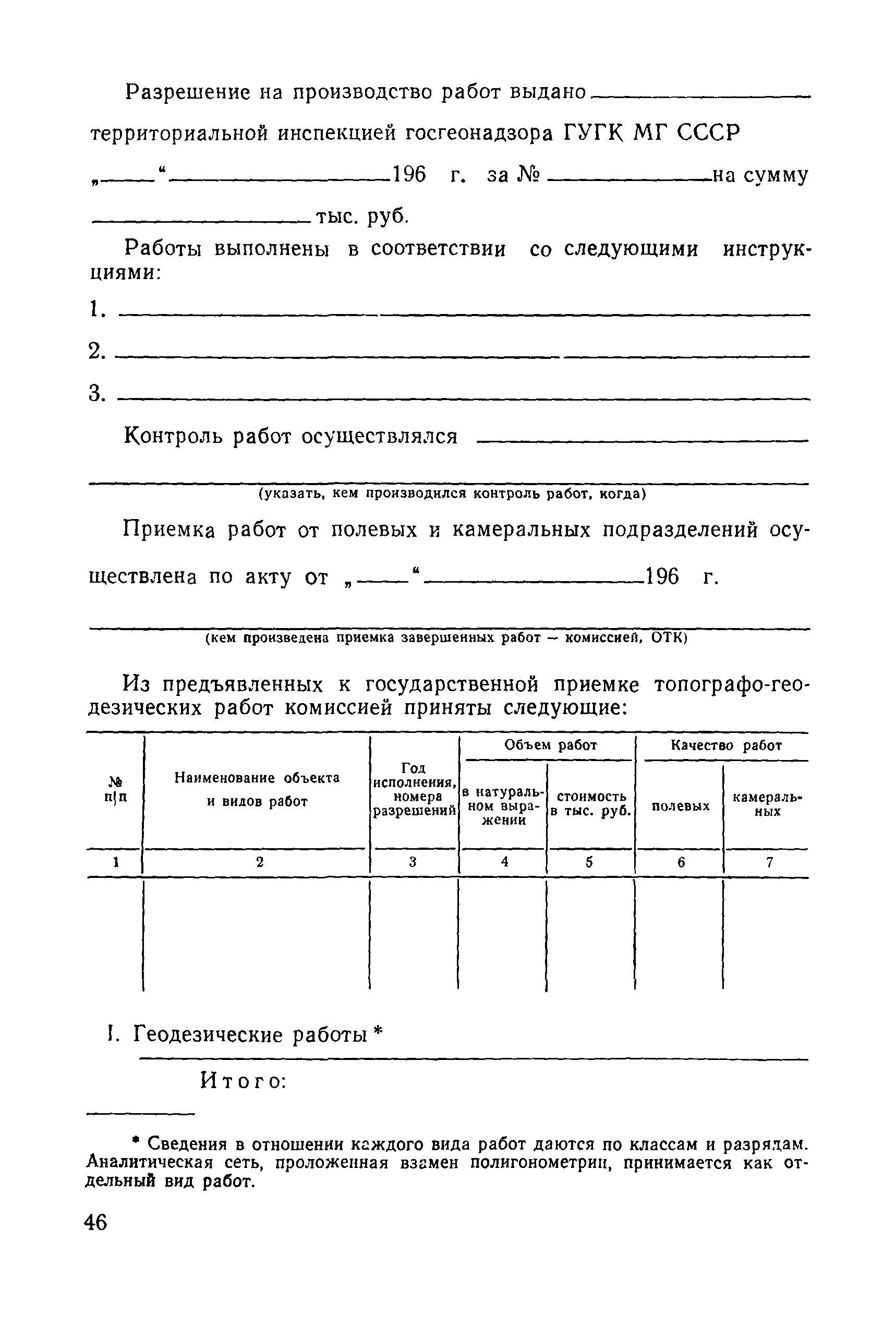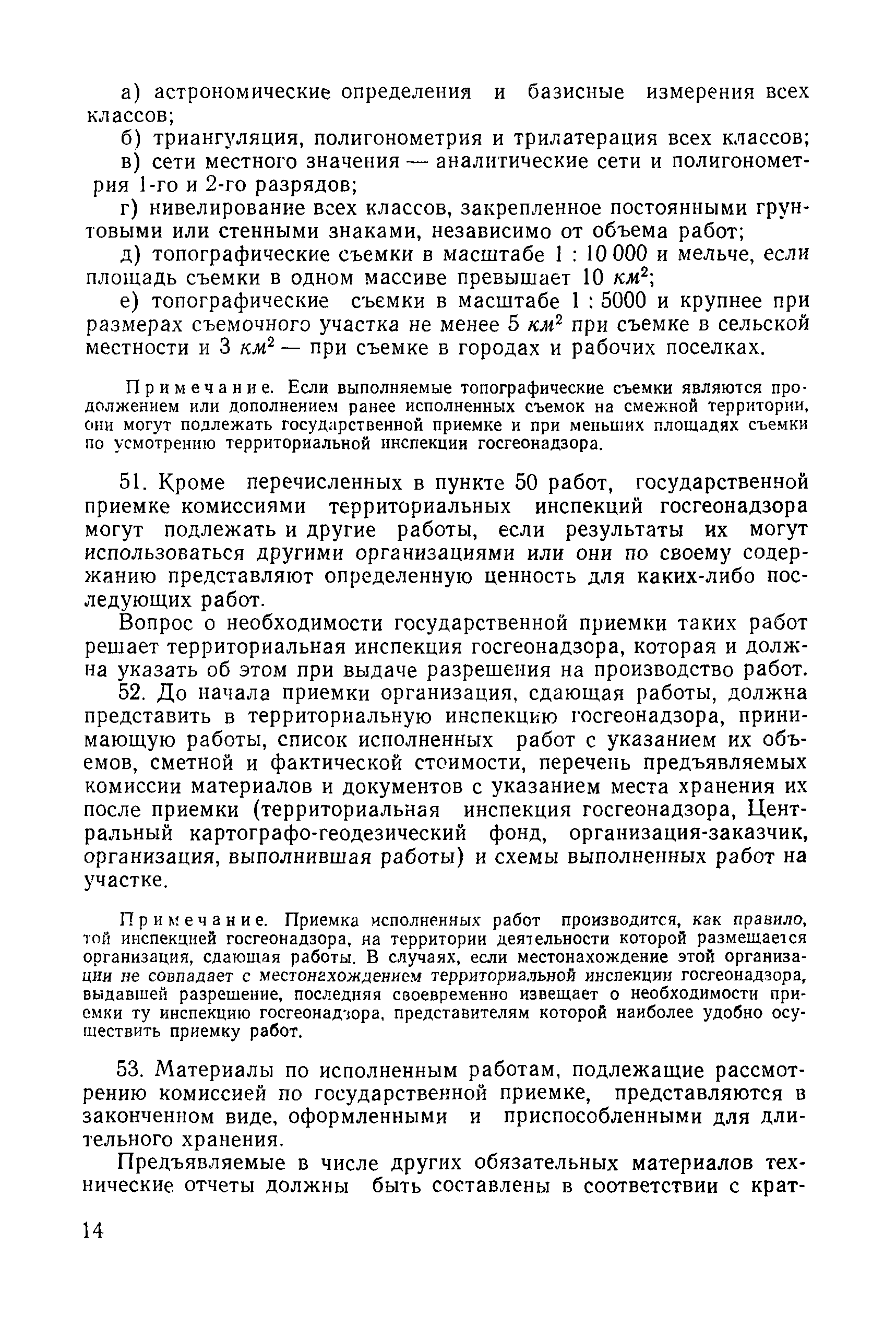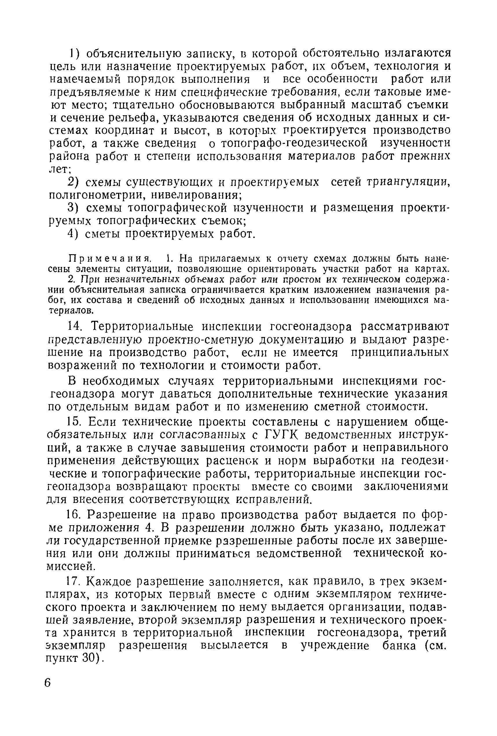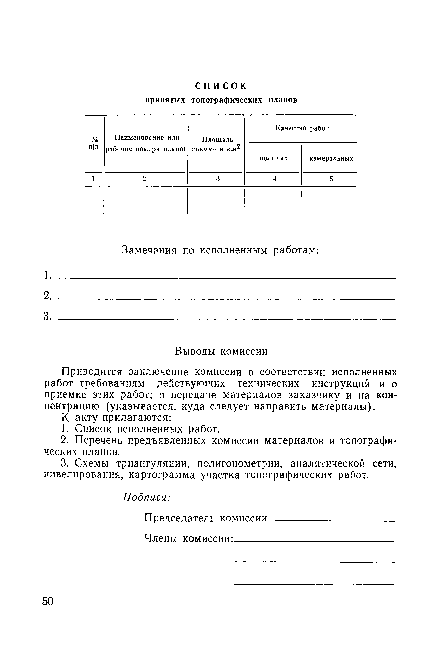 Инструкция о Государственном геодезическом надзоре| Статус: | заменен | | Название рус.: | Инструкция о Государственном геодезическом надзоре | | Дата добавления в базу: | 01.02.2020 | | Дата актуализации: | 01.01.2021 | | Область применения: | Инструкция обязательна для всех министерств, государственных комитетов, ведомств, организаций, учреждений и предприятий СССР, выполняющих топографо-геодезические. Картографические и аэрофотосъемочные работы | | Оглавление: | 1. Общие положения 2. Разрешение производства топографо-геодезических, картографических и аэрофотосъемочных работ 3. Внутриведомственный контроль и приемка работ 4. Отчеты по исполненным работам 5. Государственный контроль 6. Государственная приемка работ 7. Контроль по наблюдению за сохранностью геодезических знаков государственной геодезической сети СССР 8. Концентрация материалов и справочно-техническая работа 9. Ведение дежурной справочной карты Приложение 1. Список территориальных инспекций государственного геодезического надзора Главного управления геодезии и картографии Министерства геологии СССР с указанием районов их деятельности по состоянию на 1 июля 1966 г. Приложение 2. План топографо-геодезических и картографических работ Приложение 3. Заявление Приложение 4. Разрешение на производство топографо-геодезических работ Приложение 5. Заявление Приложение 6. Перечень сведений, представляемых организациями, ведомствами, предприятиями СССР в Главное управление геодезии и картографии МГ СССР при заявке на производство аэрофотосъемочных работ Приложение 7. Примерная программа контрольного обследования полевых топографо-геодезических работ и образец акта Приложение 8. Отчет о выполненных топографо-геодезических и картографических работах Приложение 9. Отчет о выполненных аэрофотосъемочных работах Приложение 10. Краткие указания по составлению технических отчетов по топографо-геодезическим работам Приложение 11. Перечень материалов, предъявляемых комиссиям территориальных инспекций госгеонадзора ГУГК при приемке топографо-геодезических и картографических работ, выполненных ведомственными организациями Приложение 12. Акт государственной приемки топографо-геодезических работ Приложение 13. Сводка о геодезических пунктах, на которых возобновлено наружное оформление мест расположения центров и реперов Приложение 14. Перечень материалов топографо-геодезических и картографических работ, принятых комиссиями по государственной приемке и подлежащих передаче на постоянное хранение в территориальные инспекции госгеонадзора и Центральный картографо-геодезический фонд Главного управления геодезии и картографии Министерства геологии СССР | | Утверждён: | Министерство геологии СССР