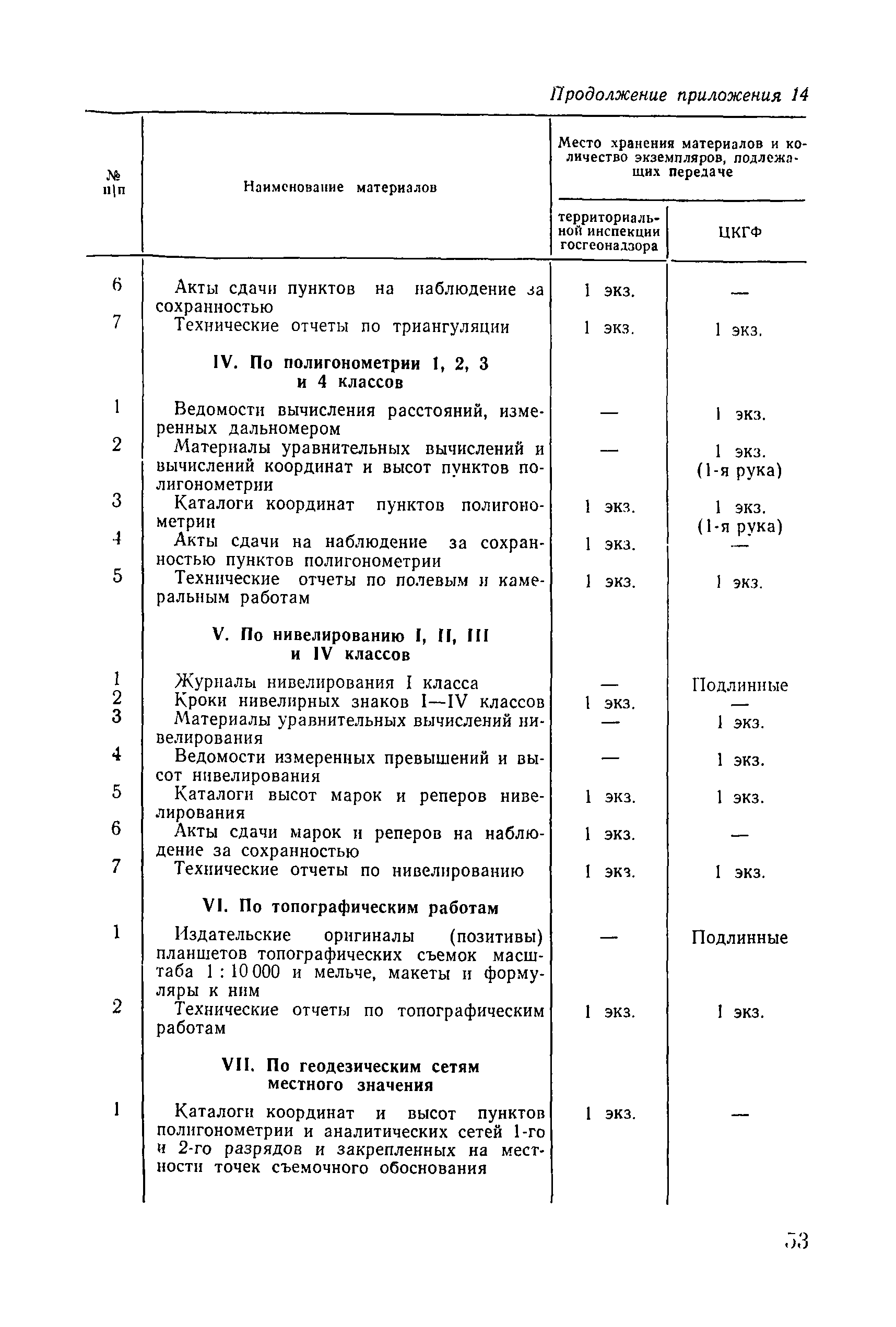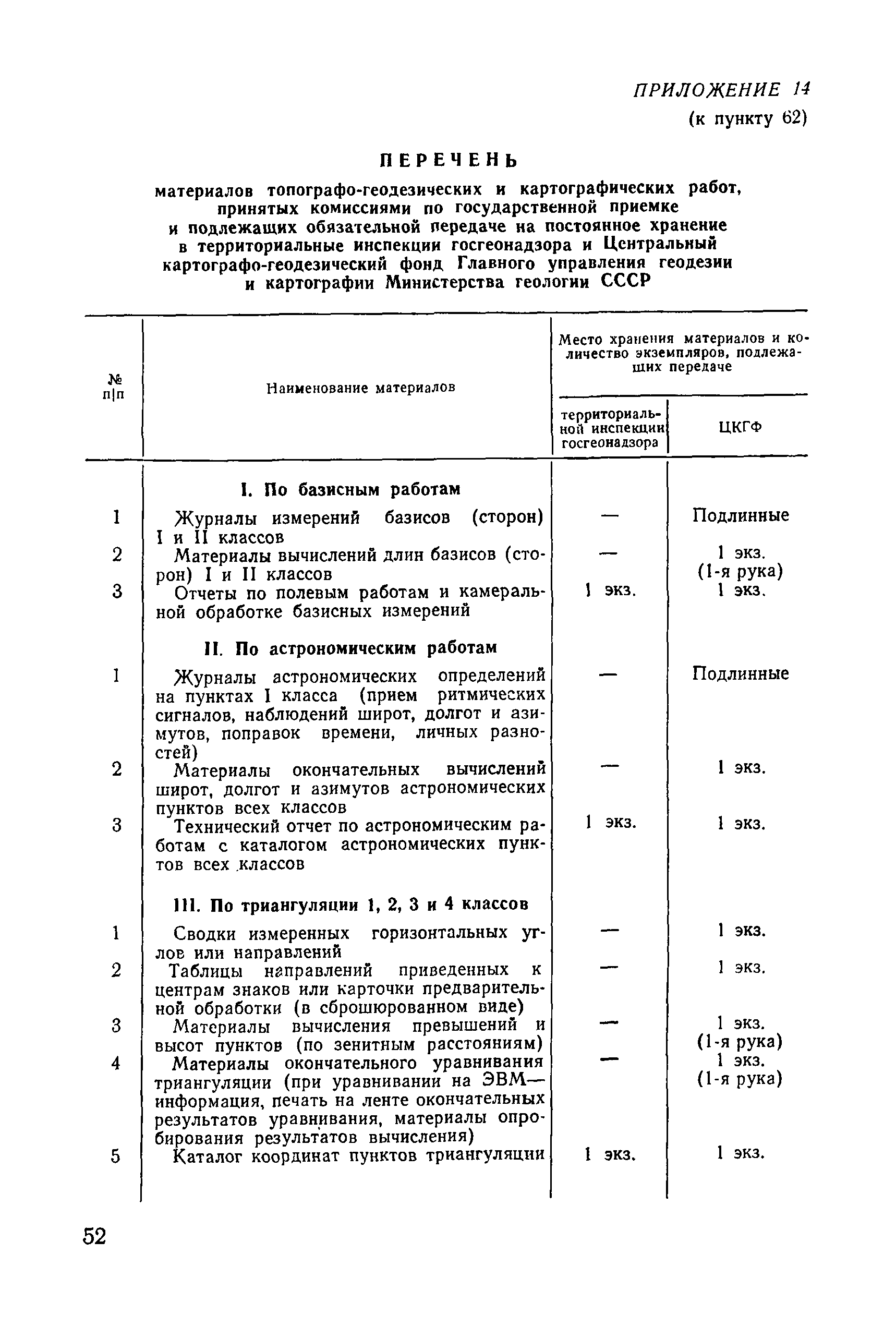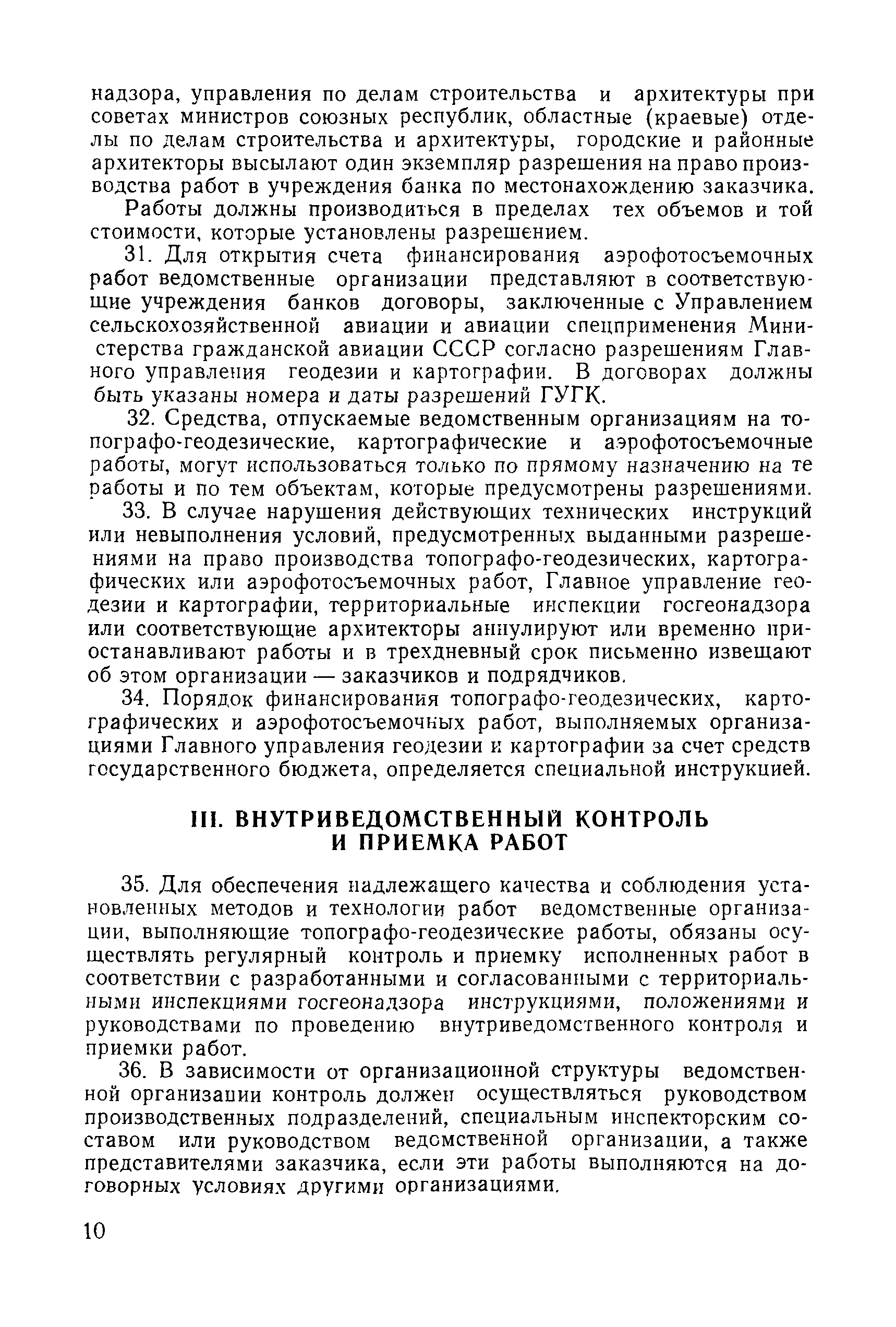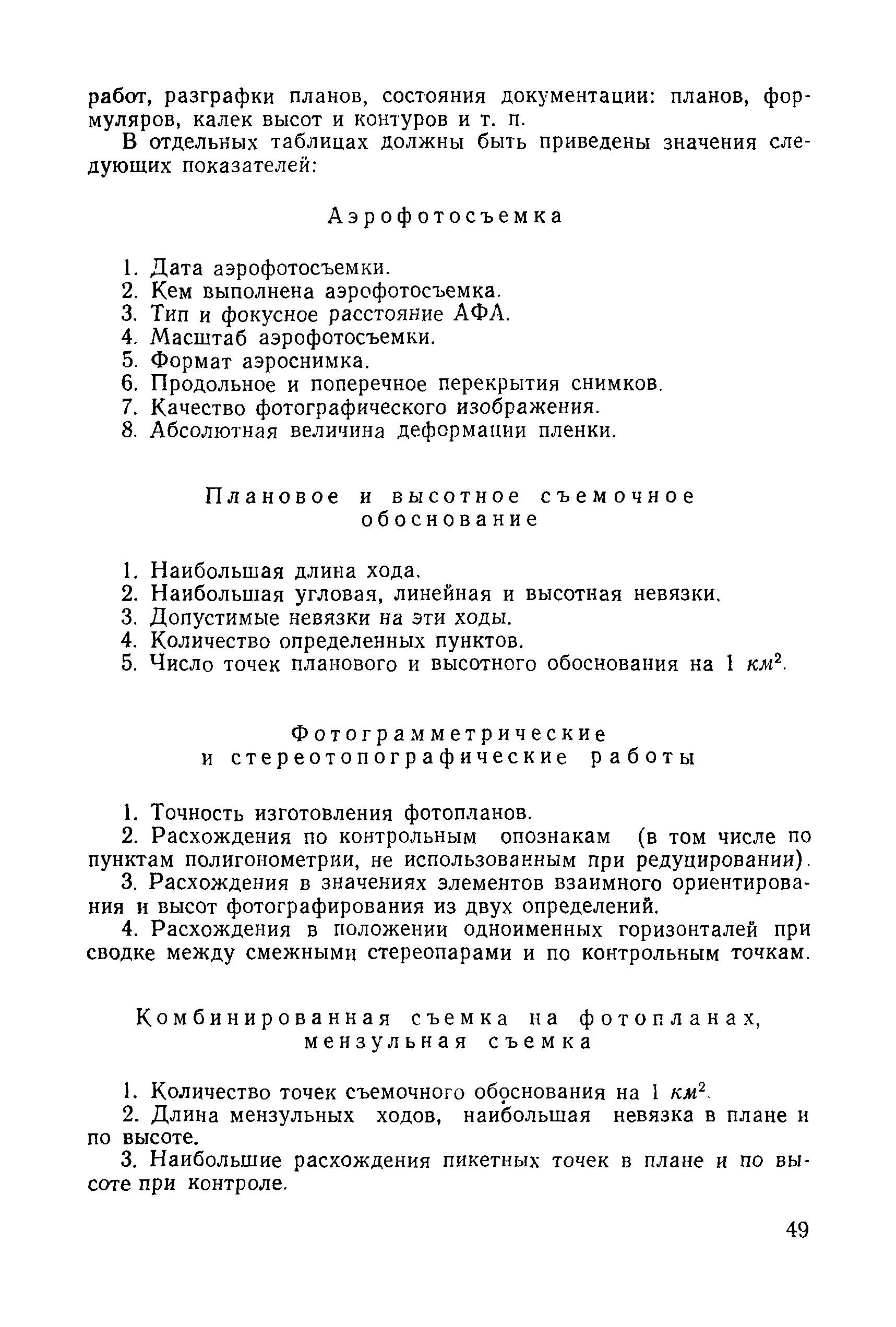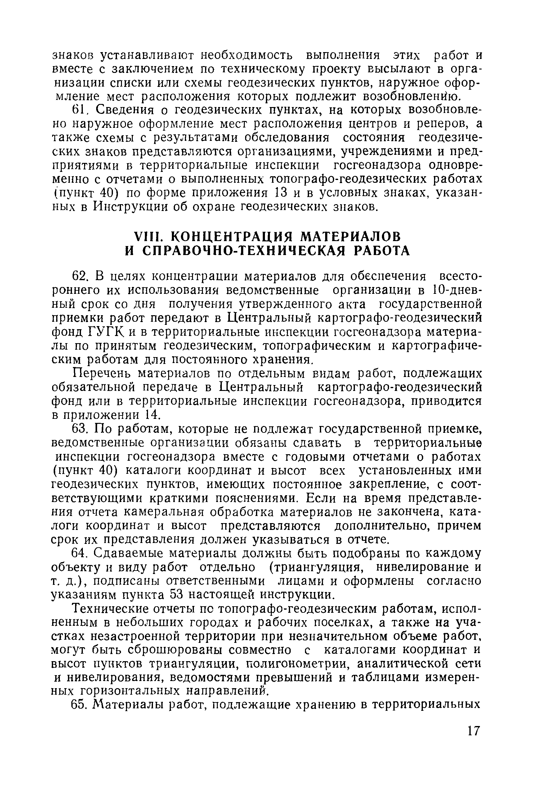 Инструкция о Государственном геодезическом надзоре| Статус: | заменен | | Название рус.: | Инструкция о Государственном геодезическом надзоре | | Дата добавления в базу: | 01.02.2020 | | Дата актуализации: | 01.01.2021 | | Область применения: | Инструкция обязательна для всех министерств, государственных комитетов, ведомств, организаций, учреждений и предприятий СССР, выполняющих топографо-геодезические. Картографические и аэрофотосъемочные работы | | Оглавление: | 1. Общие положения 2. Разрешение производства топографо-геодезических, картографических и аэрофотосъемочных работ 3. Внутриведомственный контроль и приемка работ 4. Отчеты по исполненным работам 5. Государственный контроль 6. Государственная приемка работ 7. Контроль по наблюдению за сохранностью геодезических знаков государственной геодезической сети СССР 8. Концентрация материалов и справочно-техническая работа 9. Ведение дежурной справочной карты Приложение 1. Список территориальных инспекций государственного геодезического надзора Главного управления геодезии и картографии Министерства геологии СССР с указанием районов их деятельности по состоянию на 1 июля 1966 г. Приложение 2. План топографо-геодезических и картографических работ Приложение 3. Заявление Приложение 4. Разрешение на производство топографо-геодезических работ Приложение 5. Заявление Приложение 6. Перечень сведений, представляемых организациями, ведомствами, предприятиями СССР в Главное управление геодезии и картографии МГ СССР при заявке на производство аэрофотосъемочных работ Приложение 7. Примерная программа контрольного обследования полевых топографо-геодезических работ и образец акта Приложение 8. Отчет о выполненных топографо-геодезических и картографических работах Приложение 9. Отчет о выполненных аэрофотосъемочных работах Приложение 10. Краткие указания по составлению технических отчетов по топографо-геодезическим работам Приложение 11. Перечень материалов, предъявляемых комиссиям территориальных инспекций госгеонадзора ГУГК при приемке топографо-геодезических и картографических работ, выполненных ведомственными организациями Приложение 12. Акт государственной приемки топографо-геодезических работ Приложение 13. Сводка о геодезических пунктах, на которых возобновлено наружное оформление мест расположения центров и реперов Приложение 14. Перечень материалов топографо-геодезических и картографических работ, принятых комиссиями по государственной приемке и подлежащих передаче на постоянное хранение в территориальные инспекции госгеонадзора и Центральный картографо-геодезический фонд Главного управления геодезии и картографии Министерства геологии СССР | | Утверждён: | Министерство геологии СССР