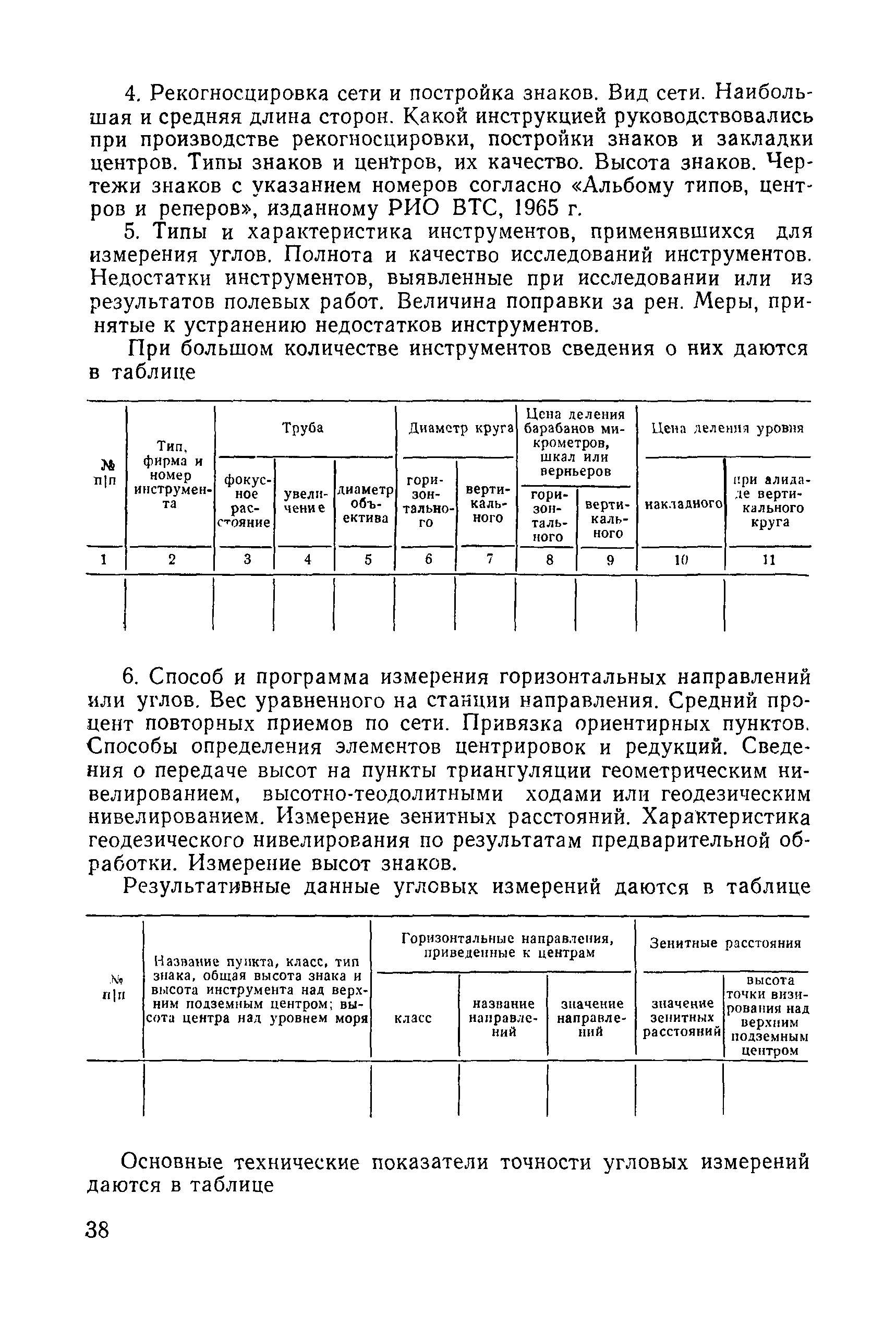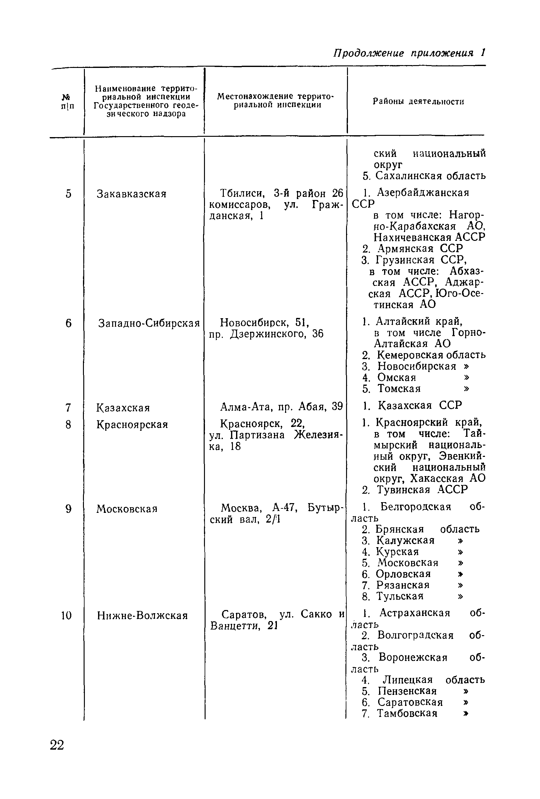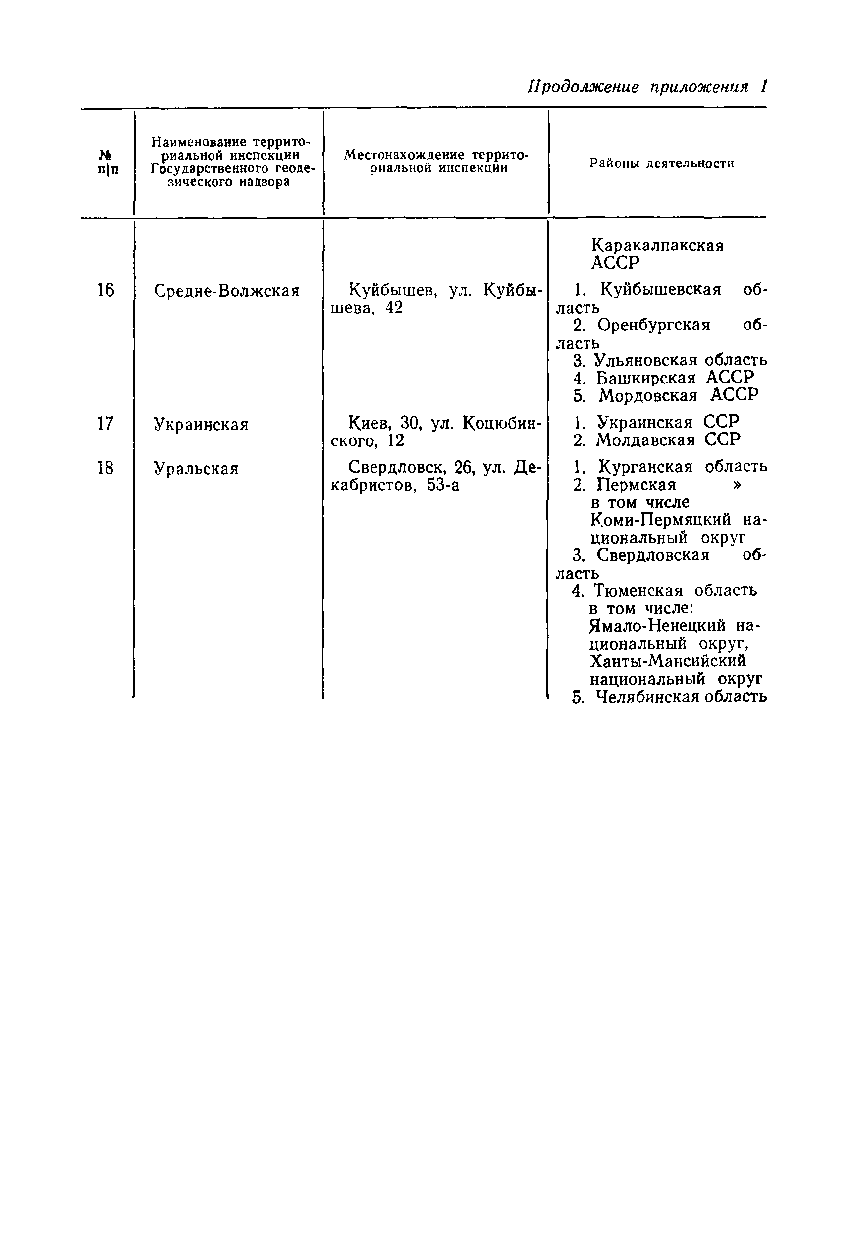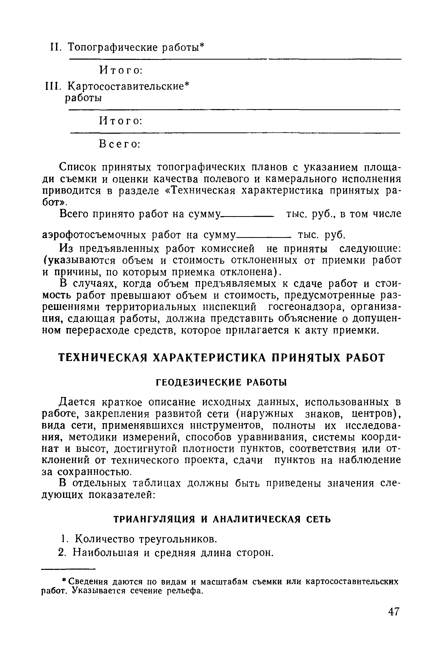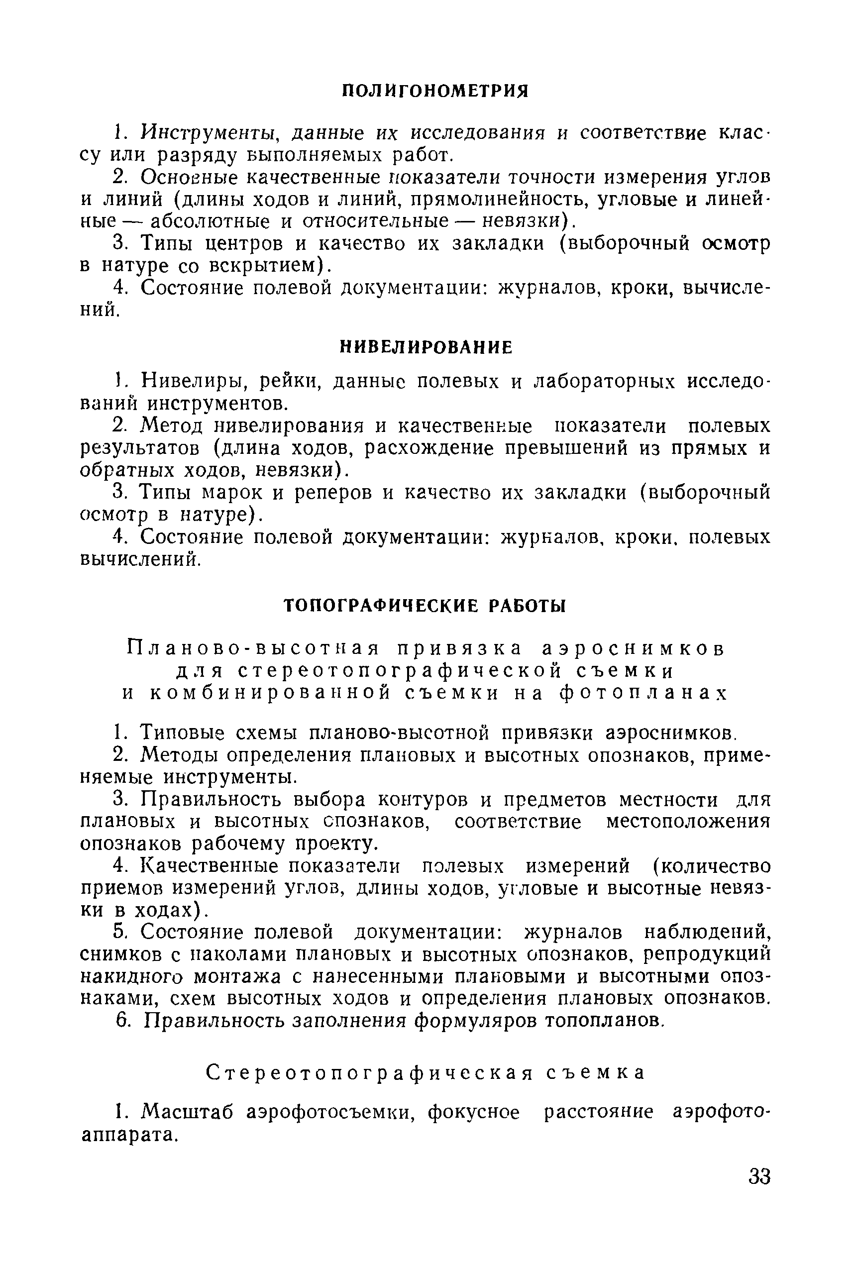 Инструкция о Государственном геодезическом надзоре| Статус: | заменен | | Название рус.: | Инструкция о Государственном геодезическом надзоре | | Дата добавления в базу: | 01.02.2020 | | Дата актуализации: | 01.01.2021 | | Область применения: | Инструкция обязательна для всех министерств, государственных комитетов, ведомств, организаций, учреждений и предприятий СССР, выполняющих топографо-геодезические. Картографические и аэрофотосъемочные работы | | Оглавление: | 1. Общие положения 2. Разрешение производства топографо-геодезических, картографических и аэрофотосъемочных работ 3. Внутриведомственный контроль и приемка работ 4. Отчеты по исполненным работам 5. Государственный контроль 6. Государственная приемка работ 7. Контроль по наблюдению за сохранностью геодезических знаков государственной геодезической сети СССР 8. Концентрация материалов и справочно-техническая работа 9. Ведение дежурной справочной карты Приложение 1. Список территориальных инспекций государственного геодезического надзора Главного управления геодезии и картографии Министерства геологии СССР с указанием районов их деятельности по состоянию на 1 июля 1966 г. Приложение 2. План топографо-геодезических и картографических работ Приложение 3. Заявление Приложение 4. Разрешение на производство топографо-геодезических работ Приложение 5. Заявление Приложение 6. Перечень сведений, представляемых организациями, ведомствами, предприятиями СССР в Главное управление геодезии и картографии МГ СССР при заявке на производство аэрофотосъемочных работ Приложение 7. Примерная программа контрольного обследования полевых топографо-геодезических работ и образец акта Приложение 8. Отчет о выполненных топографо-геодезических и картографических работах Приложение 9. Отчет о выполненных аэрофотосъемочных работах Приложение 10. Краткие указания по составлению технических отчетов по топографо-геодезическим работам Приложение 11. Перечень материалов, предъявляемых комиссиям территориальных инспекций госгеонадзора ГУГК при приемке топографо-геодезических и картографических работ, выполненных ведомственными организациями Приложение 12. Акт государственной приемки топографо-геодезических работ Приложение 13. Сводка о геодезических пунктах, на которых возобновлено наружное оформление мест расположения центров и реперов Приложение 14. Перечень материалов топографо-геодезических и картографических работ, принятых комиссиями по государственной приемке и подлежащих передаче на постоянное хранение в территориальные инспекции госгеонадзора и Центральный картографо-геодезический фонд Главного управления геодезии и картографии Министерства геологии СССР | | Утверждён: | Министерство геологии СССР