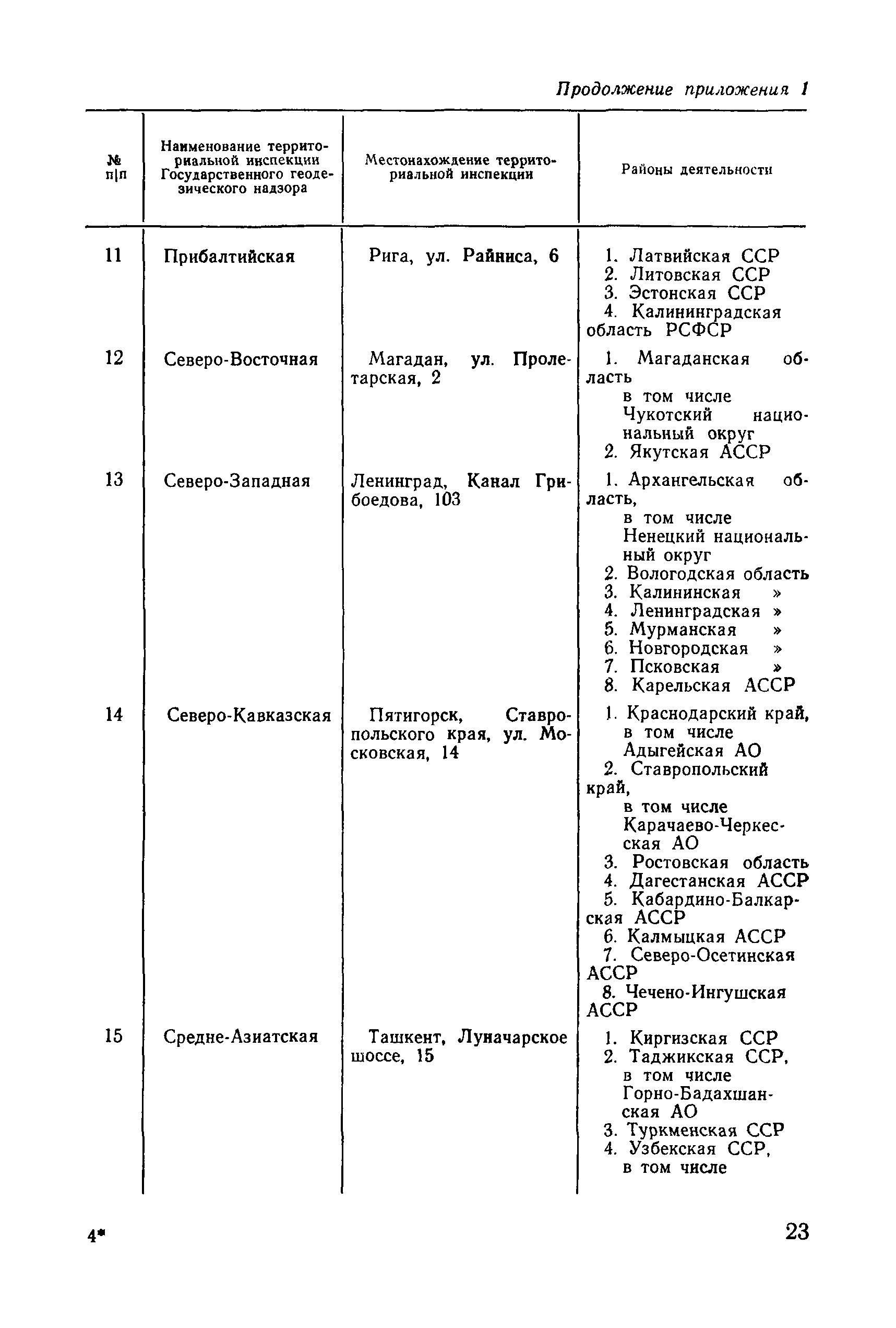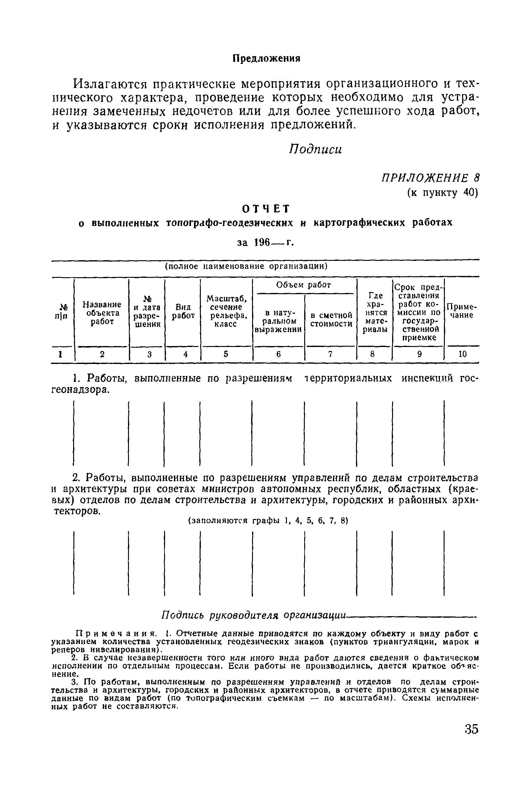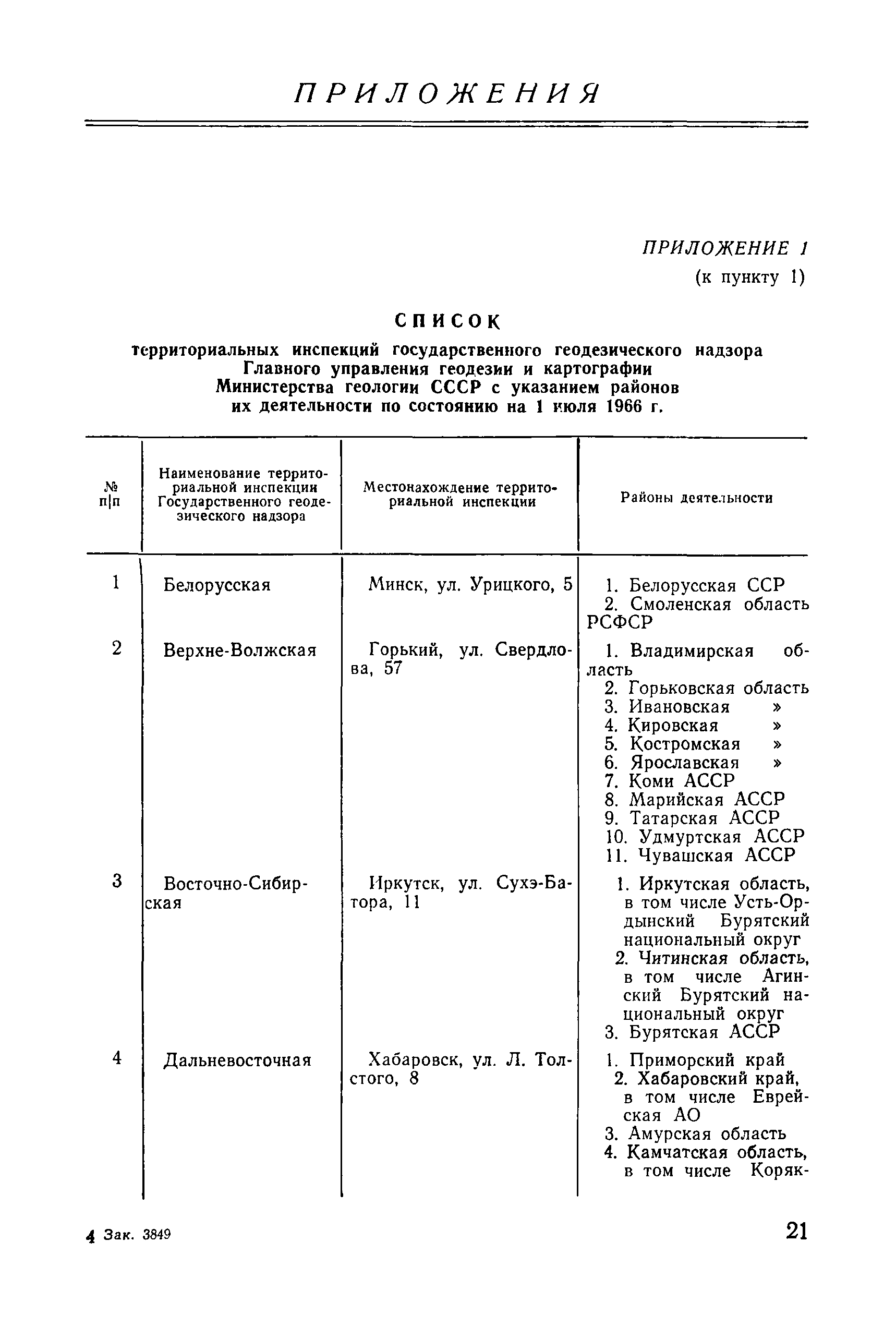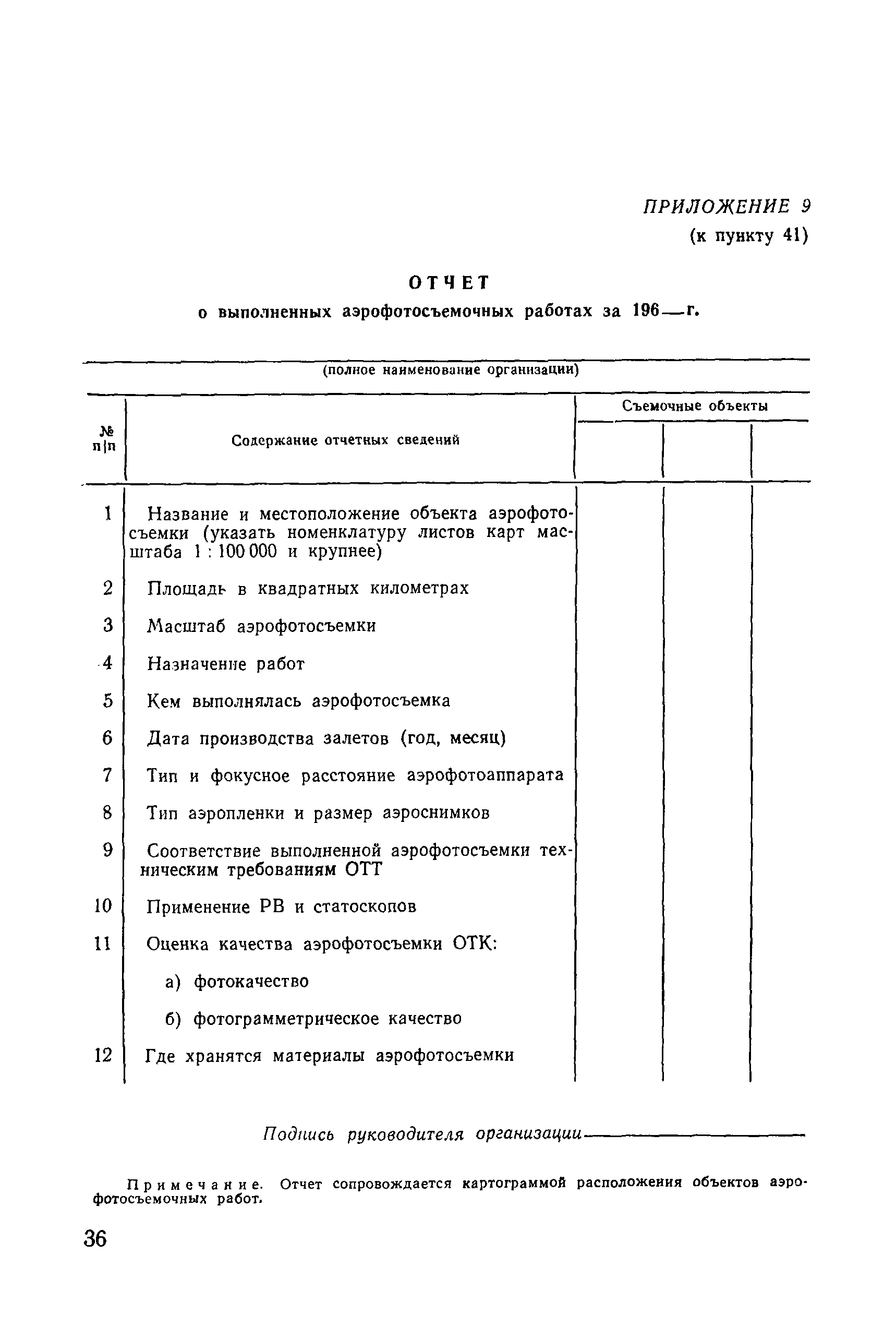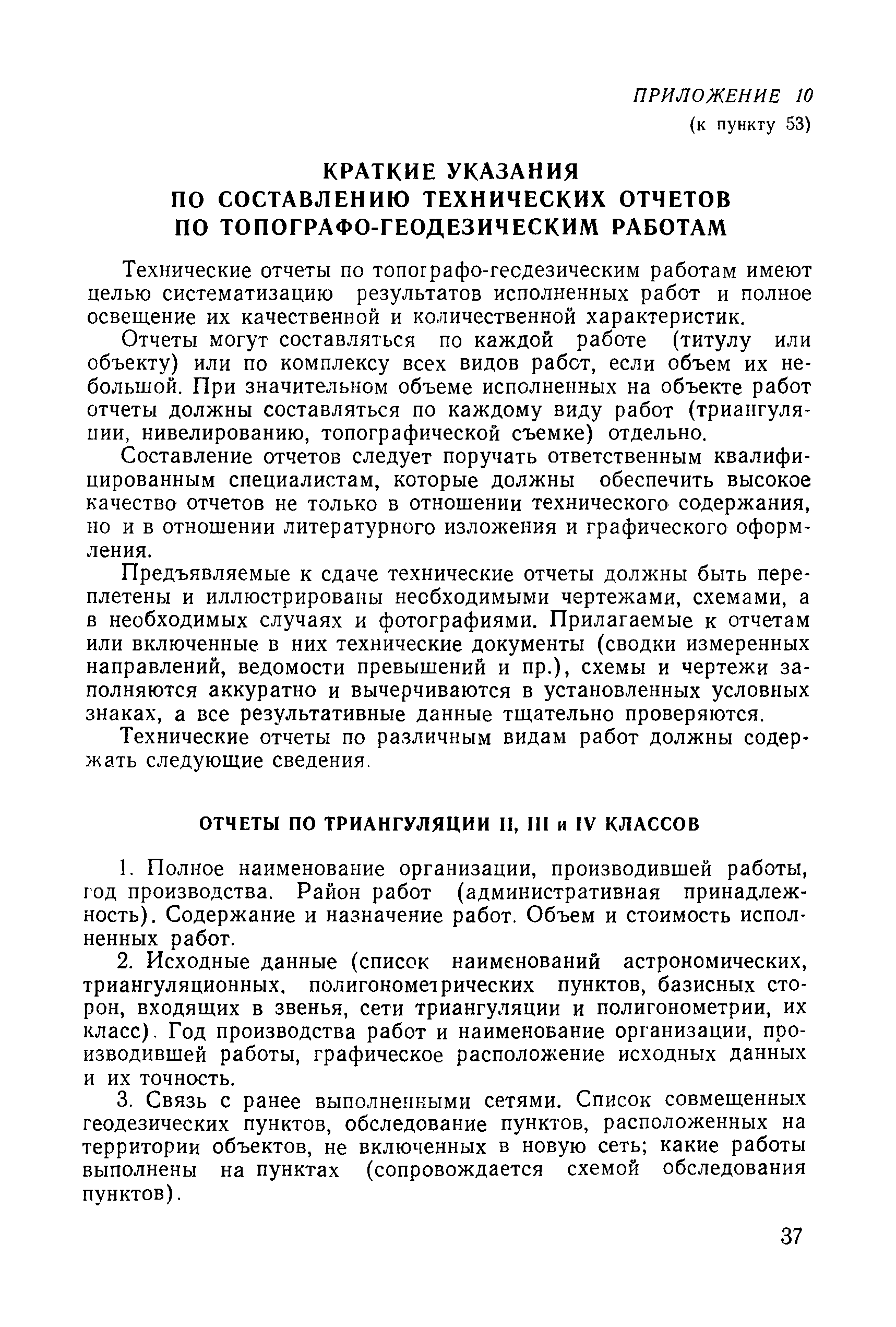 Инструкция о Государственном геодезическом надзоре| Статус: | заменен | | Название рус.: | Инструкция о Государственном геодезическом надзоре | | Дата добавления в базу: | 01.02.2020 | | Дата актуализации: | 01.01.2021 | | Область применения: | Инструкция обязательна для всех министерств, государственных комитетов, ведомств, организаций, учреждений и предприятий СССР, выполняющих топографо-геодезические. Картографические и аэрофотосъемочные работы | | Оглавление: | 1. Общие положения 2. Разрешение производства топографо-геодезических, картографических и аэрофотосъемочных работ 3. Внутриведомственный контроль и приемка работ 4. Отчеты по исполненным работам 5. Государственный контроль 6. Государственная приемка работ 7. Контроль по наблюдению за сохранностью геодезических знаков государственной геодезической сети СССР 8. Концентрация материалов и справочно-техническая работа 9. Ведение дежурной справочной карты Приложение 1. Список территориальных инспекций государственного геодезического надзора Главного управления геодезии и картографии Министерства геологии СССР с указанием районов их деятельности по состоянию на 1 июля 1966 г. Приложение 2. План топографо-геодезических и картографических работ Приложение 3. Заявление Приложение 4. Разрешение на производство топографо-геодезических работ Приложение 5. Заявление Приложение 6. Перечень сведений, представляемых организациями, ведомствами, предприятиями СССР в Главное управление геодезии и картографии МГ СССР при заявке на производство аэрофотосъемочных работ Приложение 7. Примерная программа контрольного обследования полевых топографо-геодезических работ и образец акта Приложение 8. Отчет о выполненных топографо-геодезических и картографических работах Приложение 9. Отчет о выполненных аэрофотосъемочных работах Приложение 10. Краткие указания по составлению технических отчетов по топографо-геодезическим работам Приложение 11. Перечень материалов, предъявляемых комиссиям территориальных инспекций госгеонадзора ГУГК при приемке топографо-геодезических и картографических работ, выполненных ведомственными организациями Приложение 12. Акт государственной приемки топографо-геодезических работ Приложение 13. Сводка о геодезических пунктах, на которых возобновлено наружное оформление мест расположения центров и реперов Приложение 14. Перечень материалов топографо-геодезических и картографических работ, принятых комиссиями по государственной приемке и подлежащих передаче на постоянное хранение в территориальные инспекции госгеонадзора и Центральный картографо-геодезический фонд Главного управления геодезии и картографии Министерства геологии СССР | | Утверждён: | Министерство геологии СССР