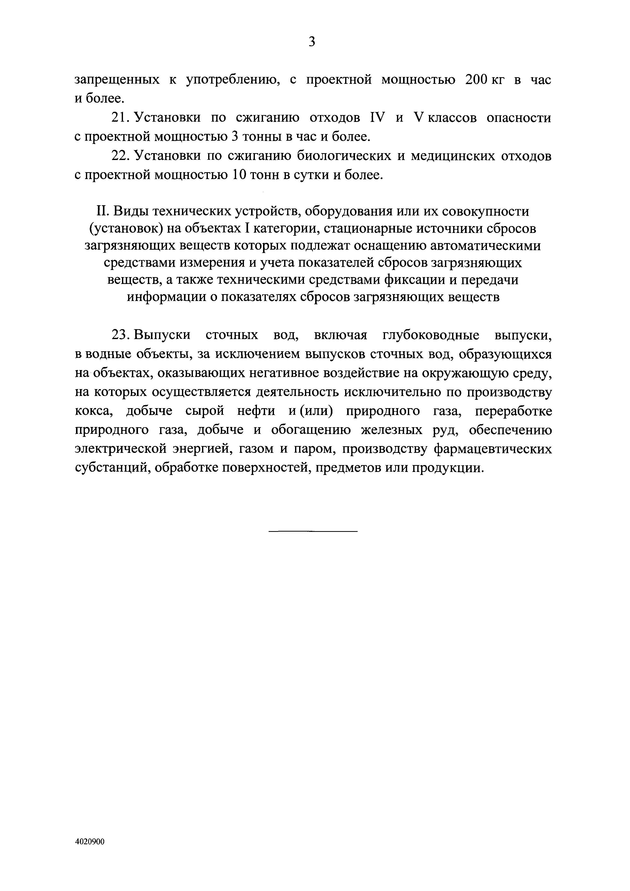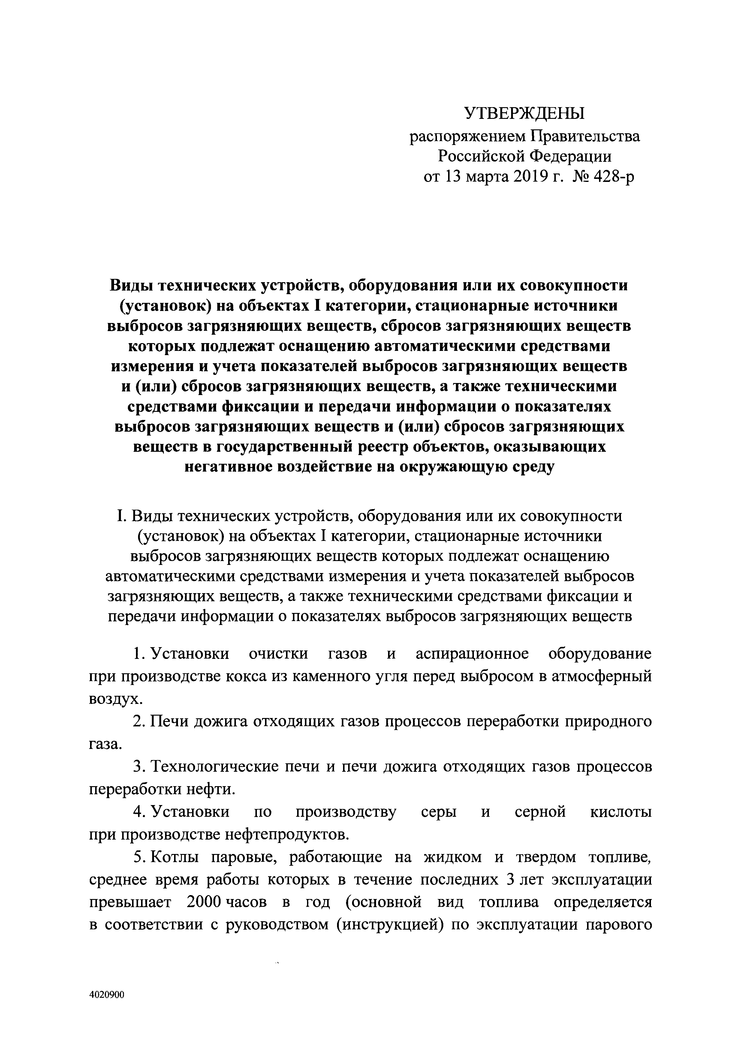 Виды технических устройств, оборудования или их совокупности (установок) на объектах I категории, стационарные источники выбросов загрязняющих веществ, сбросов загрязняющих веществ которых подлежат оснащению автоматическими средствами измерения и учета показателей выбросов загрязняющих веществ и (или) сбросов загрязняющих веществ, а также техническими средствами фиксации и передачи информации о показателях выбросов загрязняющих веществ и (или) сбросов загрязняющих веществ в государственный реестр объектов, оказывающих негативное воздействие на окружающую среду| Статус: | действует | | Название рус.: | Виды технических устройств, оборудования или их совокупности (установок) на объектах I категории, стационарные источники выбросов загрязняющих веществ, сбросов загрязняющих веществ которых подлежат оснащению автоматическими средствами измерения и учета показателей выбросов загрязняющих веществ и (или) сбросов загрязняющих веществ, а также техническими средствами фиксации и передачи информации о показателях выбросов загрязняющих веществ и (или) сбросов загрязняющих веществ в государственный реестр объектов, оказывающих негативное воздействие на окружающую среду | | Дата добавления в базу: | 01.02.2020 | | Дата актуализации: | 01.01.2021 | | Дата введения: | 26.03.2019 | | Оглавление: | I. Виды технических устройств, оборудования или их совокупности (установок) на объектах I категории, стационарные источники выбросов загрязняющих веществ которых подлежат оснащению автоматическими средствами измерения и учета показателей выбросов загрязняющих веществ, а также техническими средствами фиксации и передачи информации о показателях выбросов загрязняющих веществ II. Виды технических устройств, оборудования или их совокупности (установок) на объектах I категории, стационарные источники сбросов загрязняющих веществ которых подлежат оснащению автоматическими средствами измерения и учета показателей сбросов загрязняющих веществ, а также техническими средствами фиксации и передачи информации о показателях сбросов загрязняющих веществ | | Утверждён: | 13.03.2019 Правительство Российской Федерации (428-р)