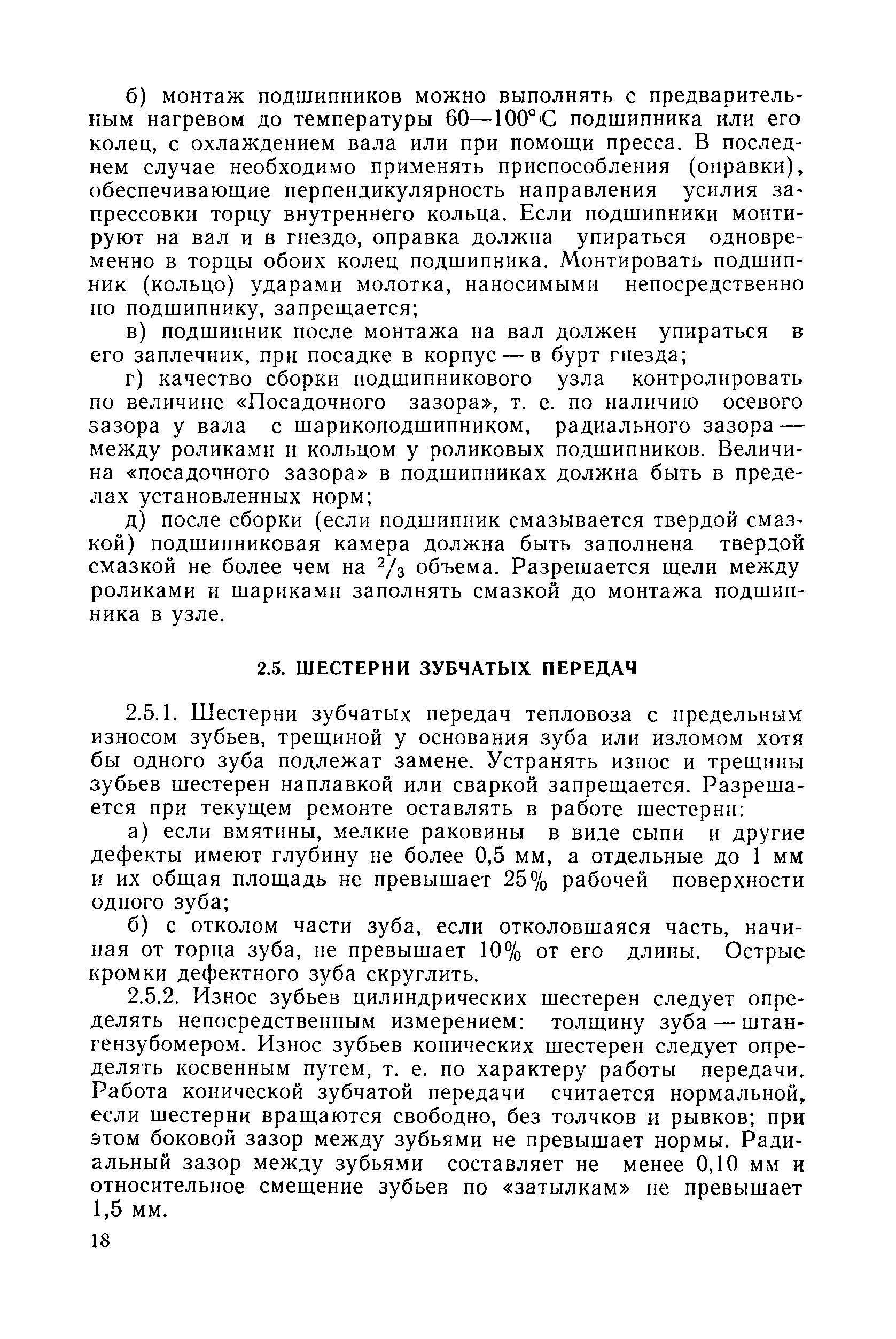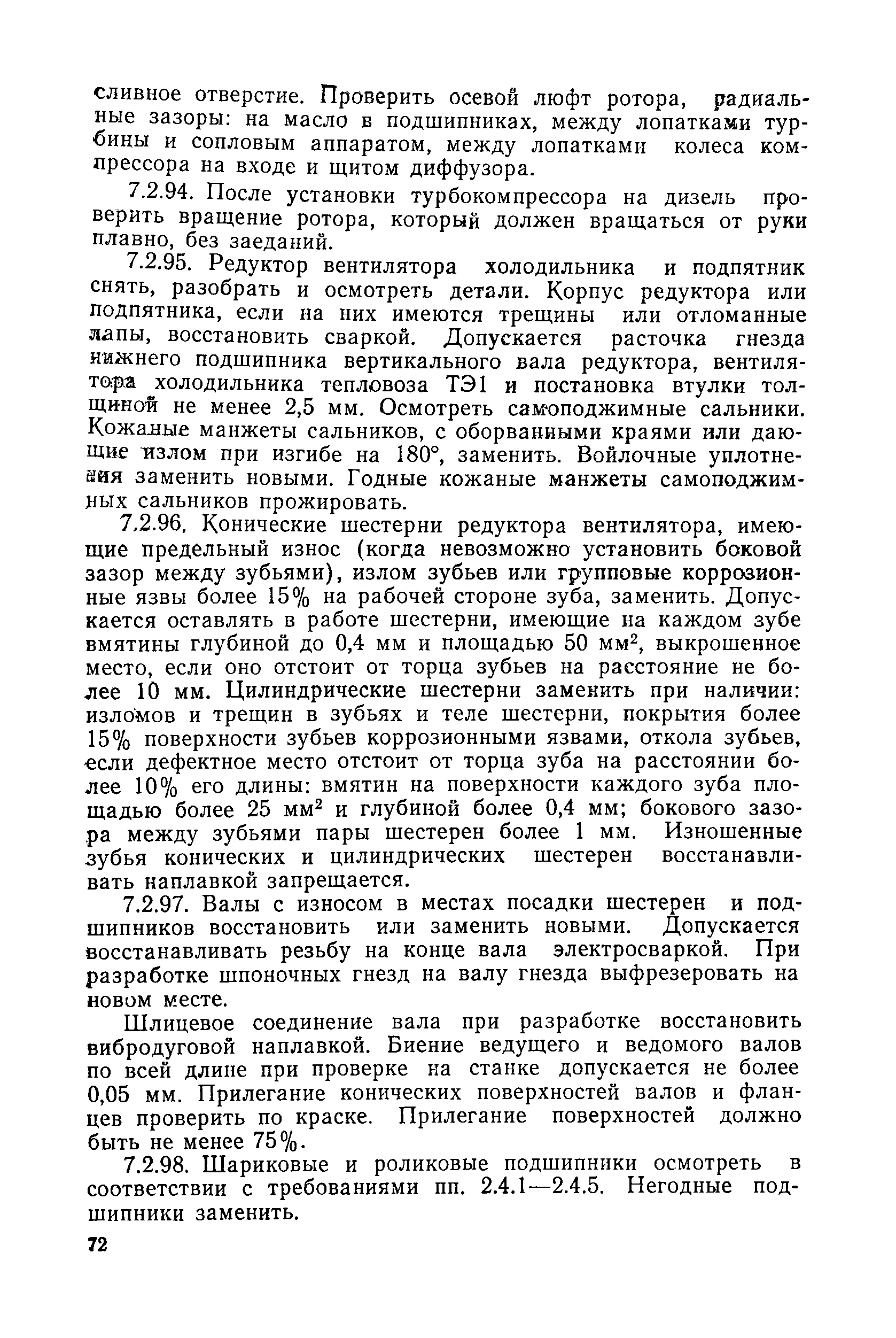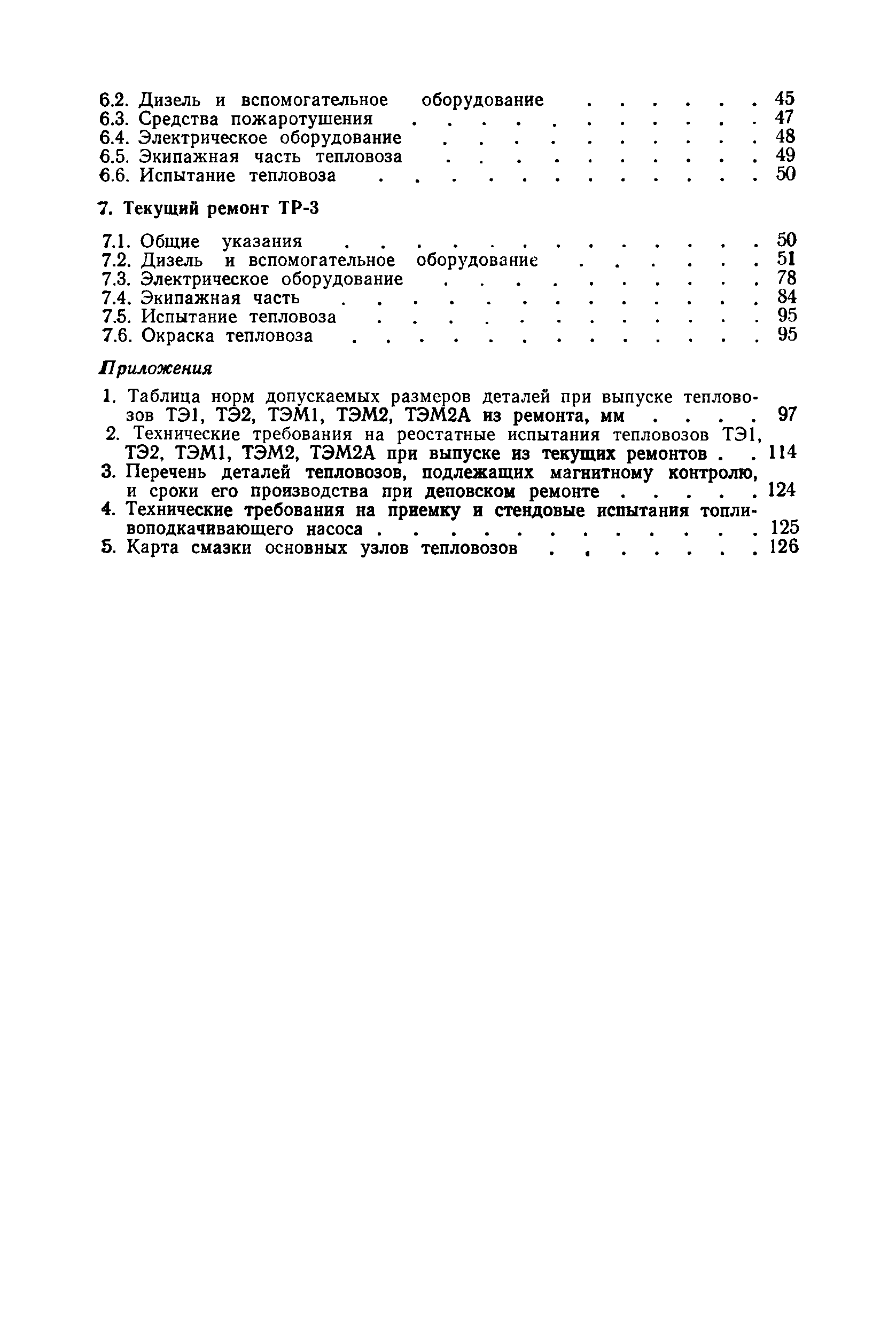 | Оглавление: | 1. Организация ремонта 1.1. Организация и планирование деповского ремонта тепловозов 1.2. Постановка тепловоза в ремонт и приемка из ремонта 2. Общие указания по ремонту тепловозов 2.1. Снятие, разборка и очистка узлов и агрегатов для ремонта 2.2. Контроль состояния (дефектация, браковка) деталей 2.3. Ремонт и сборка деталей типовых соединений и узлов 2.4. Узлы с подшипниками качения 2.5. Шестерни зубчатых передач 2.6. Узлы с сальниковыми уплотнениями 2.7. Муфты, трубопроводы 2.8. Пружины 2.9. Детали контактных соединений, гибкие соединения электрических цепей 2.10. Сборка, испытание и монтаж объекта ремонта 2.11. Устройства АЛСН, радио и скоростемера 3. Техническое обслуживание ТО-2 3.1. Общие указания 3.2. Дизель и вспомогательное оборудование 3.3. Электрооборудование 3.4. Экипажная часть 4. Техническое обслуживание ТО-3 4.1. Общие указания 4.2. Дизель и вспомогательное оборудование 4.3. Электрические машины 4.4. Электроаппаратура и электрические цепи 4.5. Аккумуляторная батарея 4.6. Экипажная часть 4.7. Испытание тепловоза 5. Текущий ремонт ТР-1 5.1. Общие указания 5.2. Дизель и вспомогательное оборудование 5.3. Электрическое оборудование 5.4. Экипажная часть 5.5. Испытание тепловоза 6. Текущий ремонт ТР-2 6.1. Общие указания 6.2. Дизель и вспомогательное оборудование 6.3. Средства пожаротушения 6.4. Электрическое оборудование 6.5. Экипажная часть тепловоза 6.6. Испытание тепловоза 7. Текущий ремонт ТР-3 7.1. Общие указания 7.2. Дизель и вспомогательное оборудование 7.3. Электрическое оборудование 7.4. Экипажная часть 7.5. Испытание тепловоза 7.6. Окраска тепловоза Приложение 1. Таблица норм допускаемых размеров деталей при выпуске тепловозов ТЭ1, ТЭ2, ТЭМ1, ТЭМ2, ТЭМ2А из ремонта, мм Приложение 2. Технические требования на реостатные испытания тепловозов ТЭ1, ТЭ2, ТЭМ1, ТЭМ2, ТЭМ2А при выпуске из текущих ремонтов Приложение 3. Перечень деталей тепловозов, подлежащих магнитному контролю, и сроки его производства при деповском ремонте Приложение 4. Технические требования на приемку и стендовые испытания топливоподкачивающего насоса Приложение 5. Карта смазки основных узлов тепловозов |