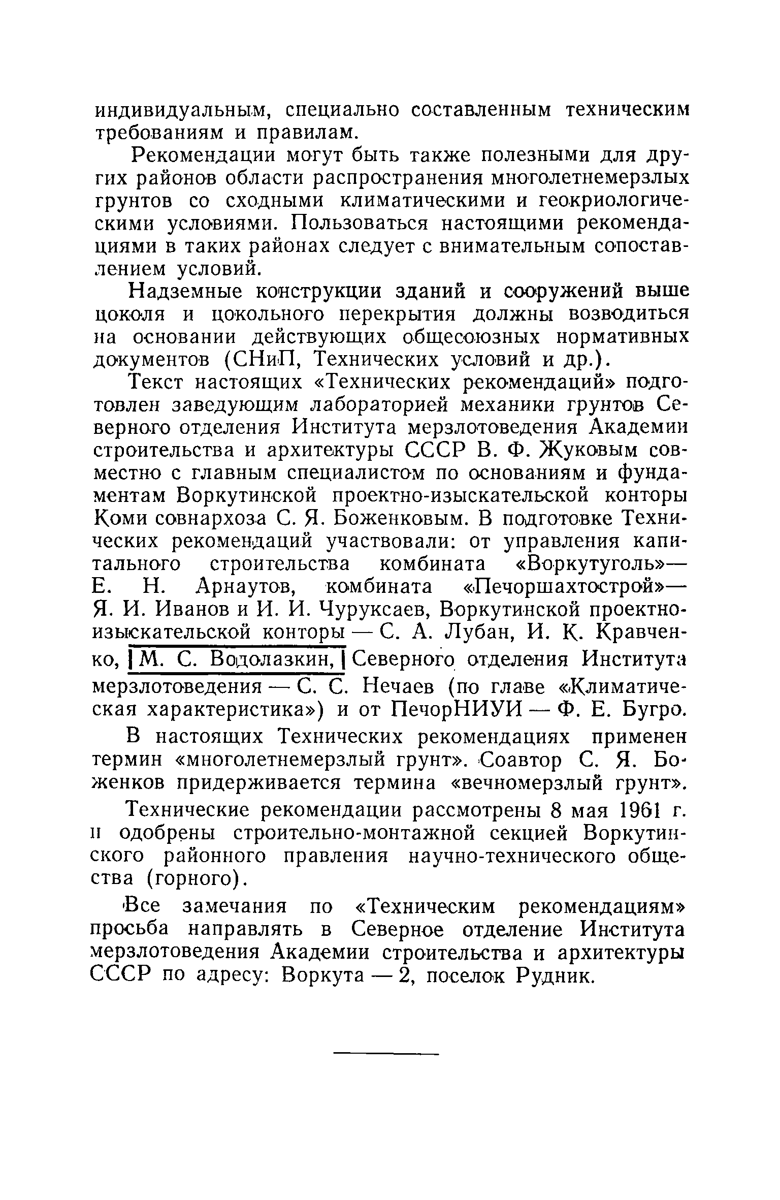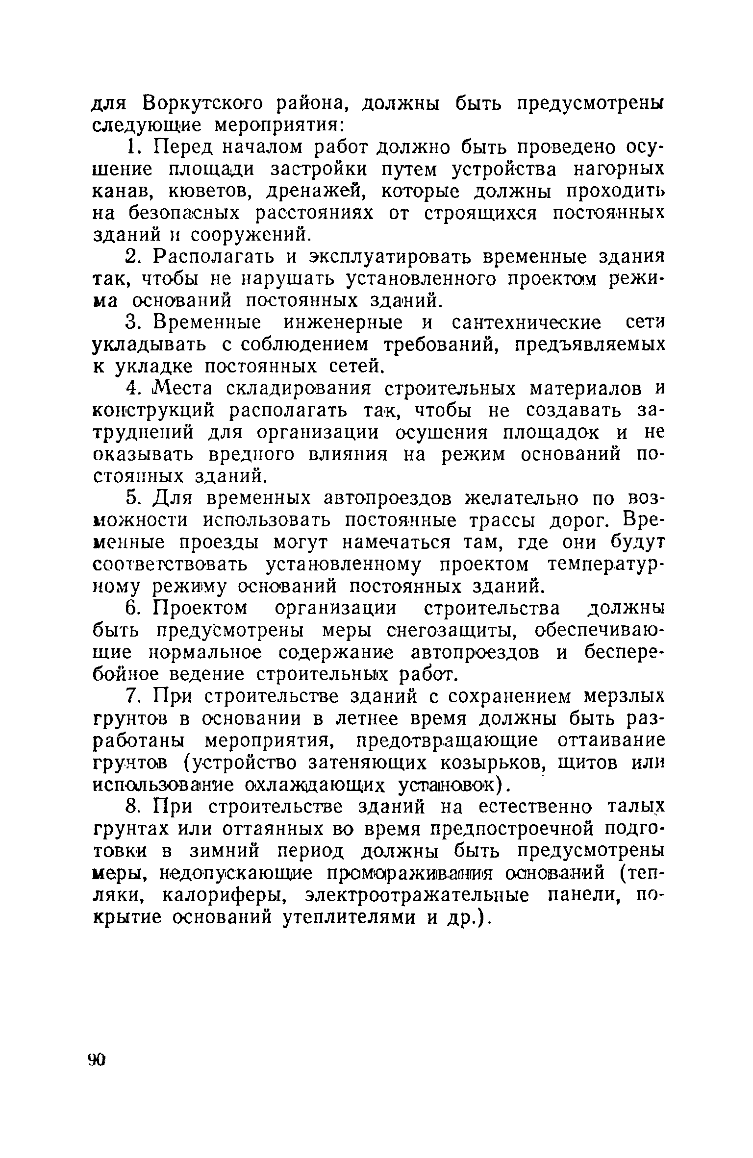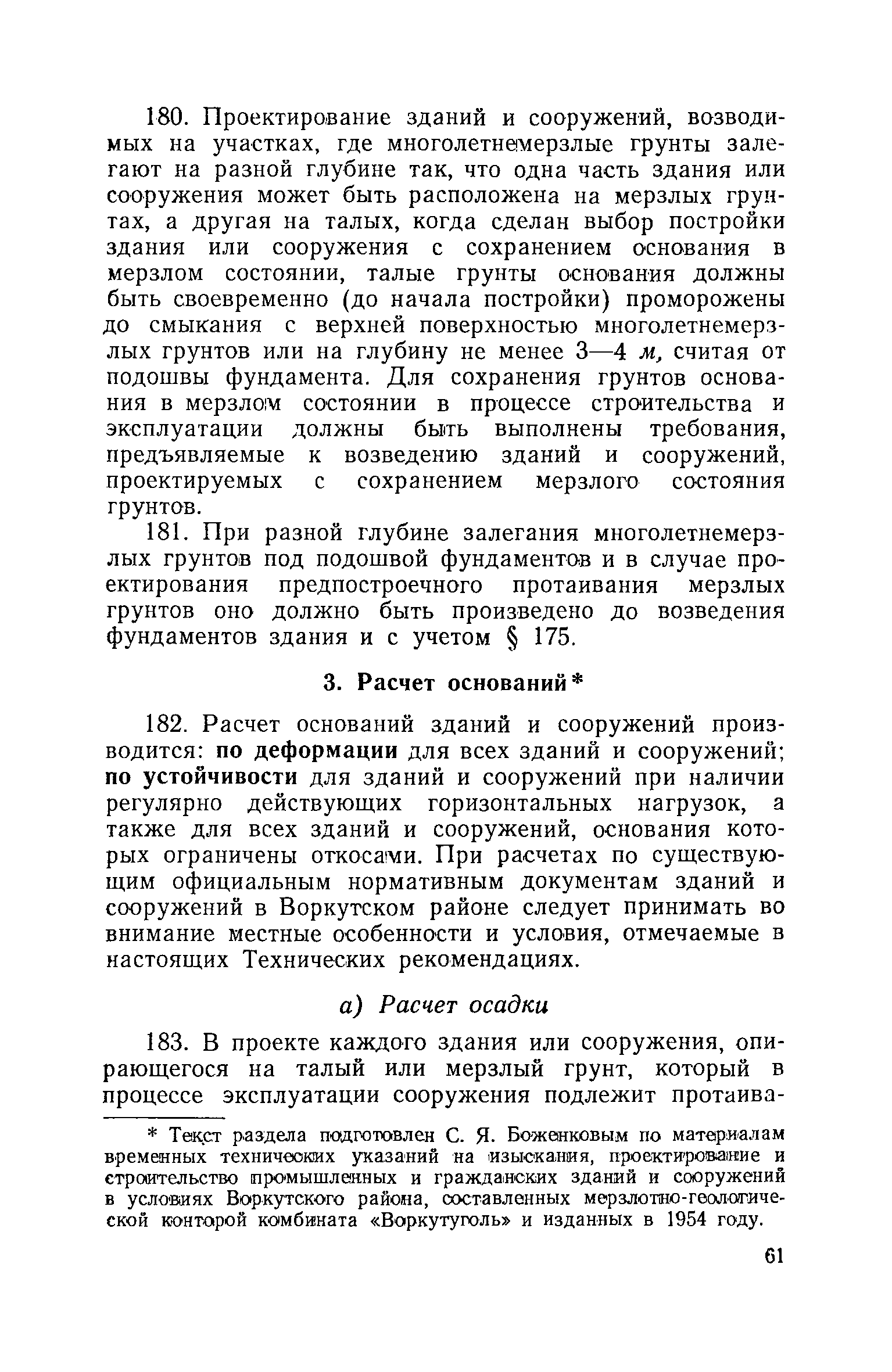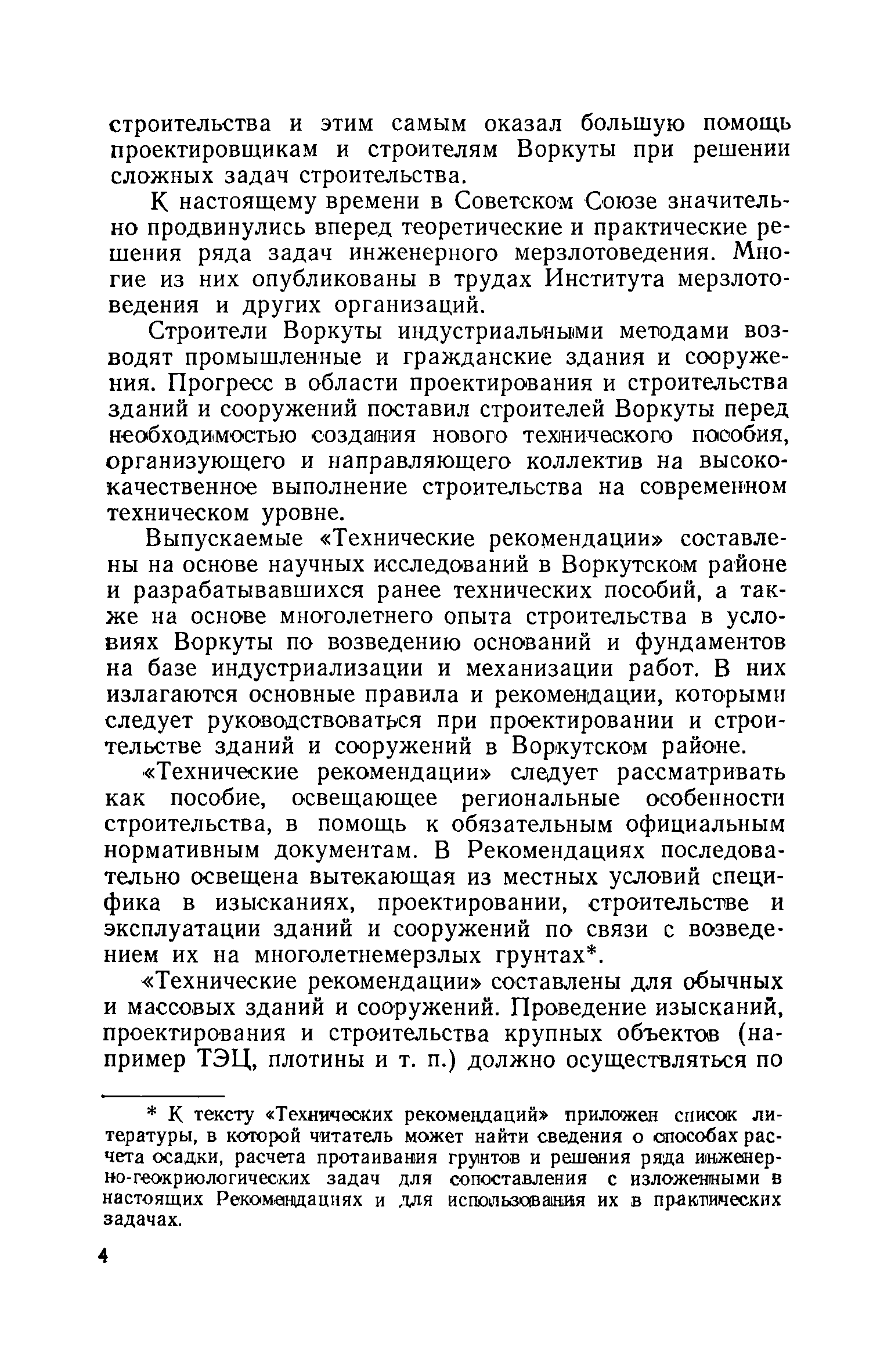 Технические рекомендации на изыскания, проектирование, строительство и эксплуатацию зданий и сооружений в Воркутском районе| Статус: | справочные материалы, мп, тпр | | Название рус.: | Технические рекомендации на изыскания, проектирование, строительство и эксплуатацию зданий и сооружений в Воркутском районе | | Дата добавления в базу: | 01.02.2020 | | Дата актуализации: | 01.01.2021 | | Область применения: | Технические рекомендации составлены на основе научных исследований в Воркутском районе и разрабатывавшихся ранее технических пособий, а также на основе многолетнего опыта строительства в условиях Воркуты по возведению оснований и фундаментов на базе индустриализации и механизации работ. В них излагаются основные правила и рекомендации, которыми следует руководствоваться при проектировании и строительстве зданий и сооружений в Воркутском районе. Технические рекомендации следует рассматривать как пособие, освещающее региональные особенности строительства, в помощь к обязательным официальным нормативным документам. В Рекомендациях последовательно освещена вытекающая из местных условий специфика в изысканиях, проектировании, строительстве и эксплуатации зданий и сооружений по связи с возведением их на многолетнемерзлых грунтах. Технические рекомендации составлены для обычных и массовых зданий и сооружений. Рекомендации могут быть также полезными для других районов области распространения многолетнемерзлых грунтов со сходными климатическими и геокриологическими условиями. | | Оглавление: | Часть I. Основные положения 1. Понятия и определения 2. Климатическая характеристика Воркутского района 3. Геологические условия Воркутского района 4. Гидрогеологические условия Воркутского района 5. Мерзлотная (геокриологическая характеристика Воркутского района) 6. Основные возможные причины деформации зданий и сооружений в Воркуте 7. Методы строительства зданий и сооружений на многолетнемерзлых грунтах в условиях Воркутского района 8. Основные мероприятия по обеспечению устойчивости сооружений Часть II. Изыскания 1. Общие указания 2. Рекопносцировочные изыскания 3. Предварительные изыскания 4. Окончательные изыскания Часть III. Проектирование 1. Общие положения 2. Проектирование зданий и сооружений в зависимости от метода строительства 3. Расчет оснований 4. Общие положения по планировке населенных мест 5. Устройство санитарно-технических сетей 6. Проект организации работ Часть IV. Строительство 1. Общие положения 2. Использование проектной документации в производстве и эксплуатации 3. Предпостроечная подготовка строительной площадки 4. Производство земляных работ под фундаменты 5. Фундаментные работы 6. Мероприятия по снегоборьбе 7. Устройство санитарно-технических сетей 8. Временная консервация работ по строительству зданий и сооружений Литература по вопросам инженерной геокриологии (мерзлотоведения) | | Разработан: | ПечорНИУИ Воркутауголь Институт мерзлотоведения Академии строительства и архитектуры СССР Печоршахтострой