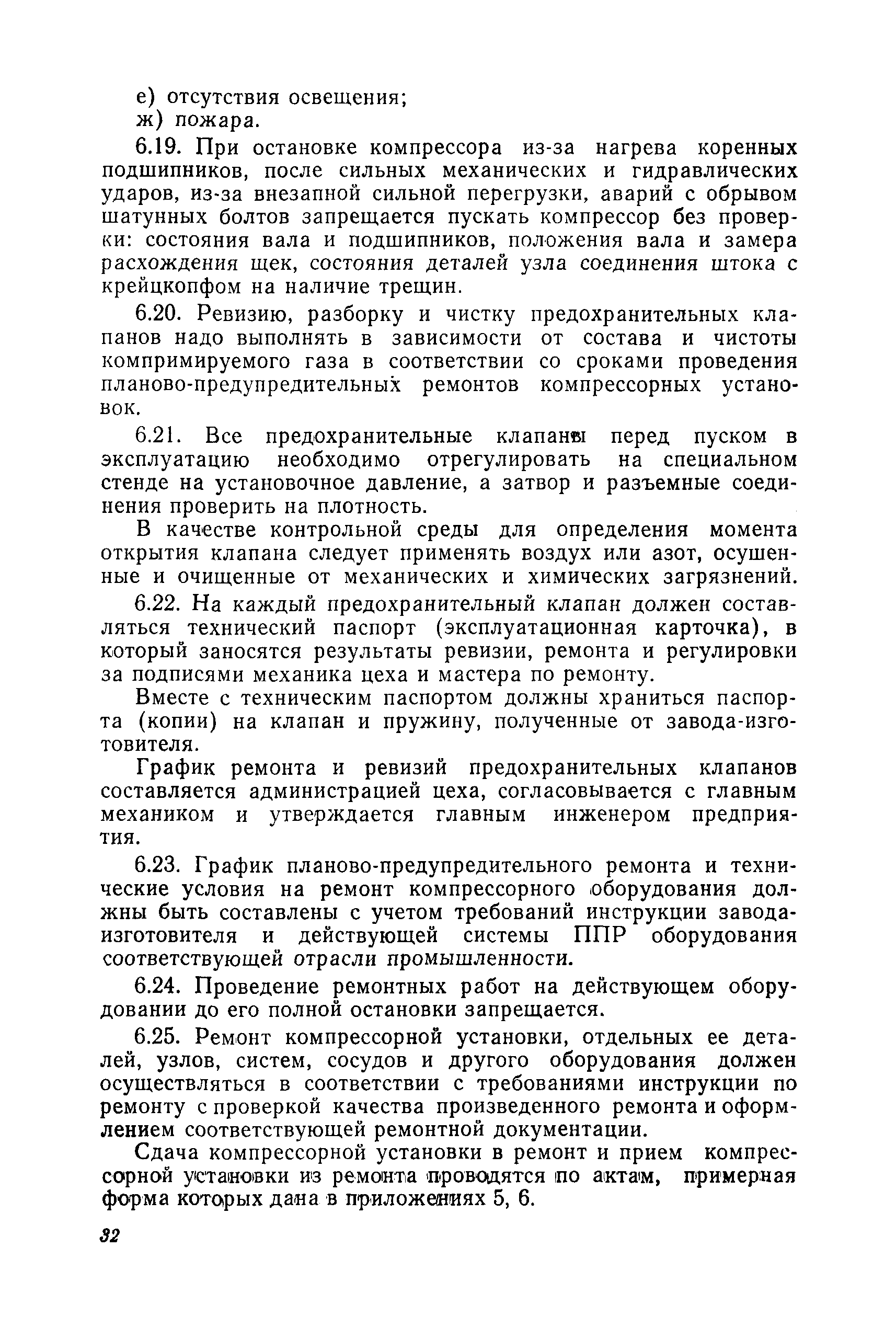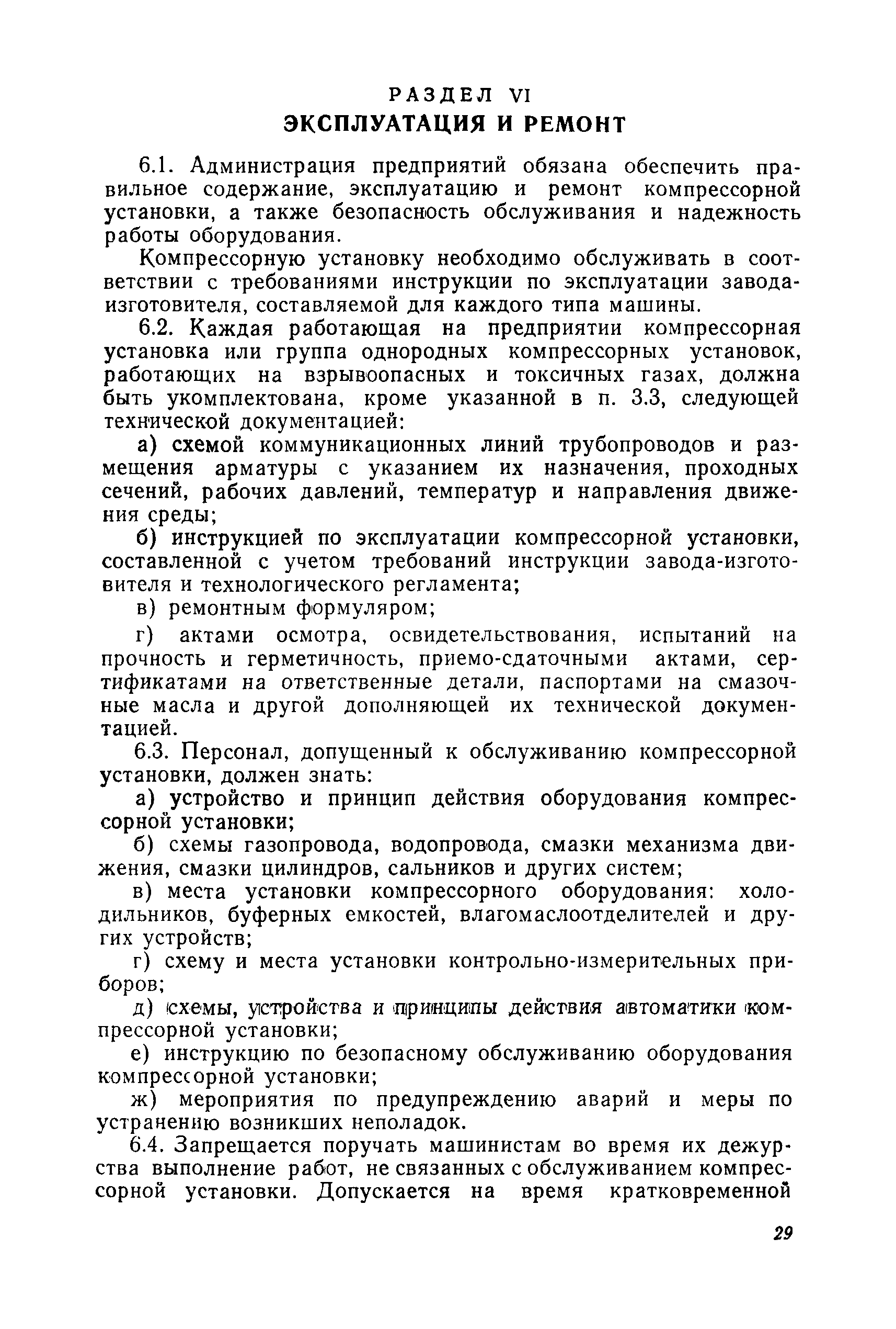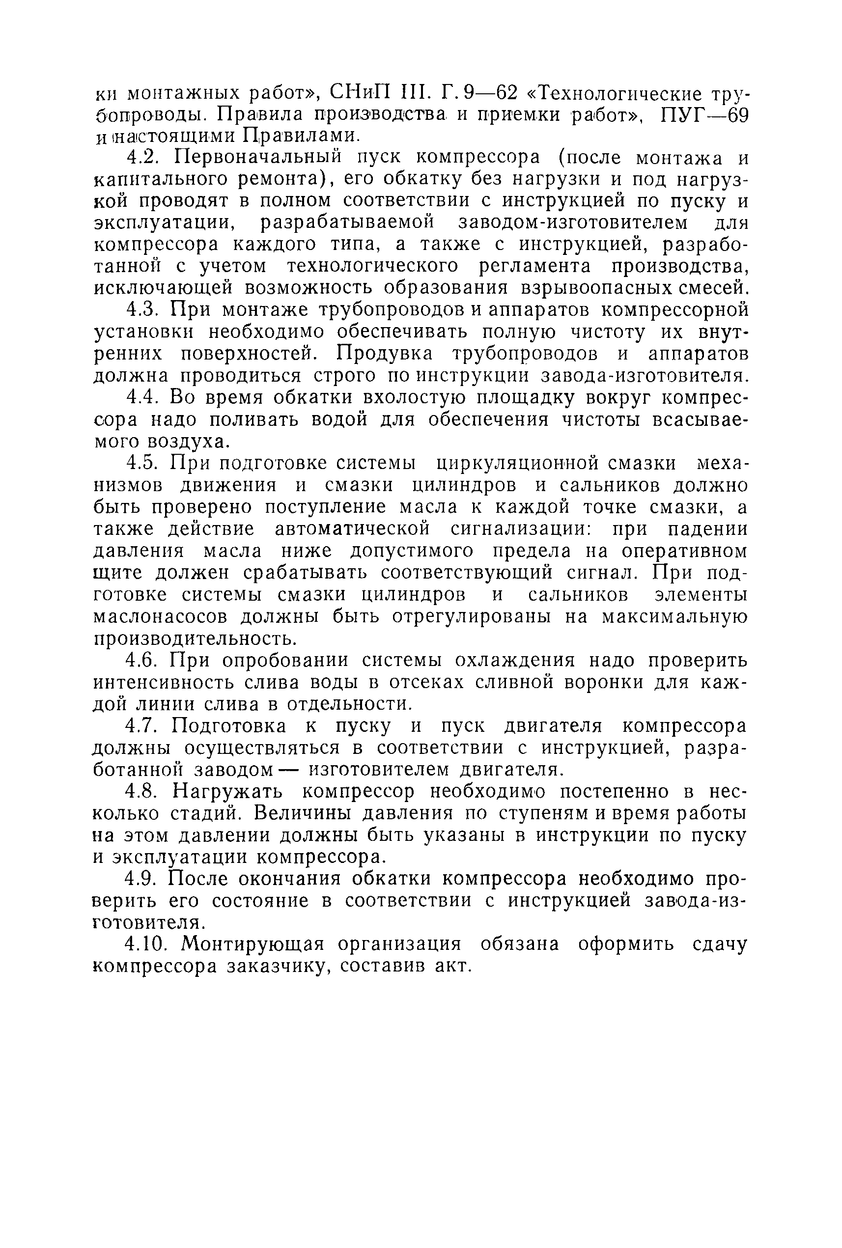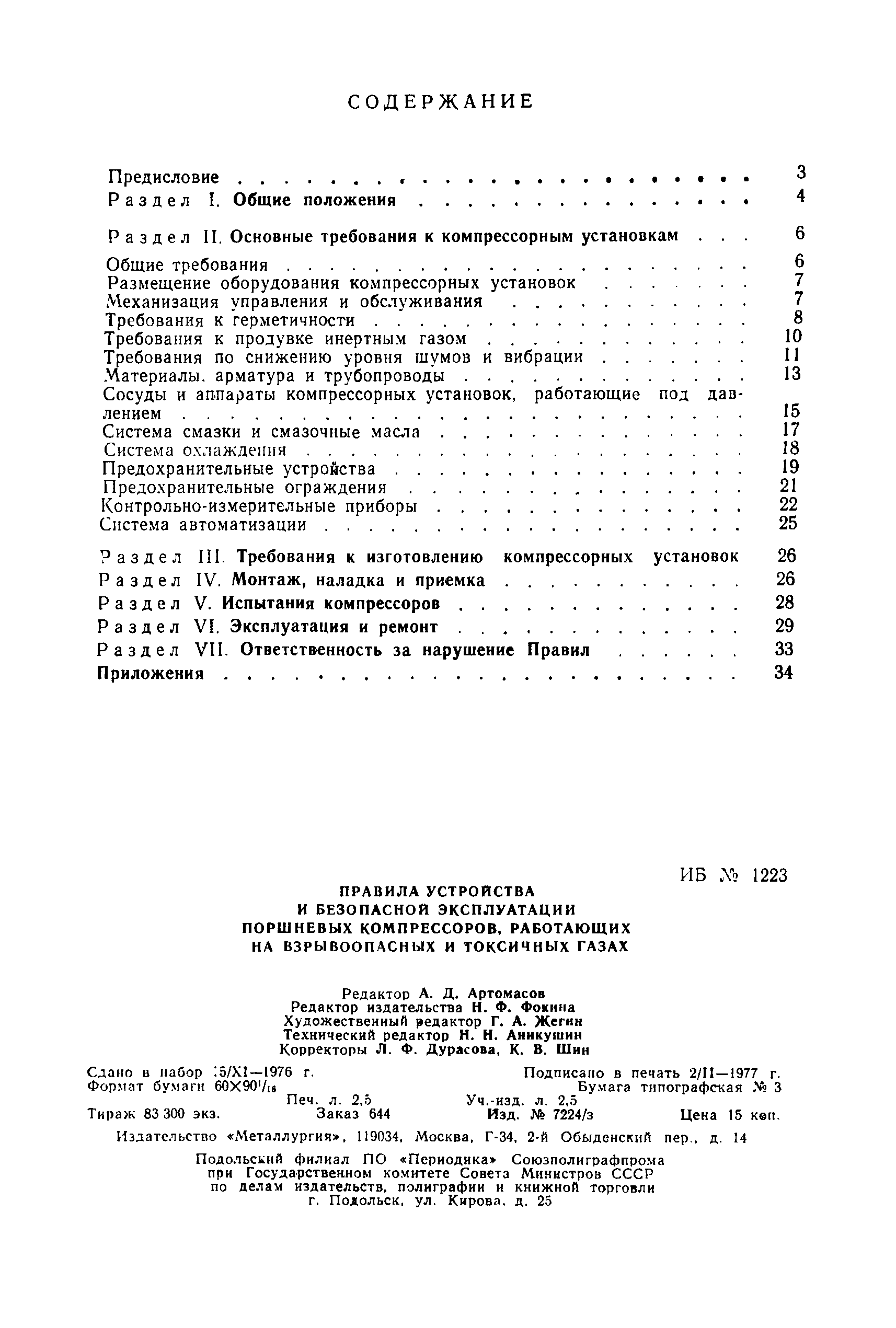 | Оглавление: | Предисловие Раздел 1. Общие положения Раздел 2. Основные требования к компрессорным установкам Общие требования Размещение оборудования компрессорных установок Механизация управления и обслуживания Требования к герметичности Требования к продувке инертным газом Требования по снижению уровня шумов и вибрации Материалы, арматура и трубопроводы Сосуды и аппараты компрессорных установок, работающие под давлением Система смазки и смазочные масла Система охлаждения Предохранительные устройства Предохранительные ограждения Контрольно-измерительные приборы Система автоматизации Раздел 3. Требования к изготовлению компрессорных установок Раздел 4. Монтаж, наладка и приемка Раздел 5. Испытания компрессоров Раздел 6. Эксплуатация и ремонт Раздел 7. Ответственность за нарушение Правил Приложение 1. Акт на сдачу трубопроводов в ремонт и для испытаний Приложение 2. Акт на ремонт, ревизию и испытание трубопроводов, транспортирующих токсичные и взрывоопасные продукты Приложение 3. Акт испытания арматуры Приложение 4. Журнал учета работы компрессора (примерная форма) Приложение 5. Акт на сдачу в капитальный ремонт изделия Приложение 6. Акт на выдачу из капитального ремонта |