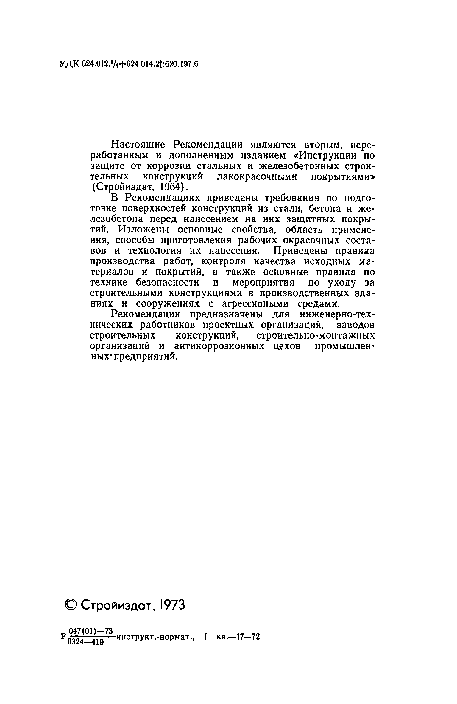 | Область применения: | Рекомендации предназначены для инженерно-технических работников проектных организаций, заводов строительных конструкций, строительно-монтажных организаций и антикоррозионных цехов промышленных предприятий. |