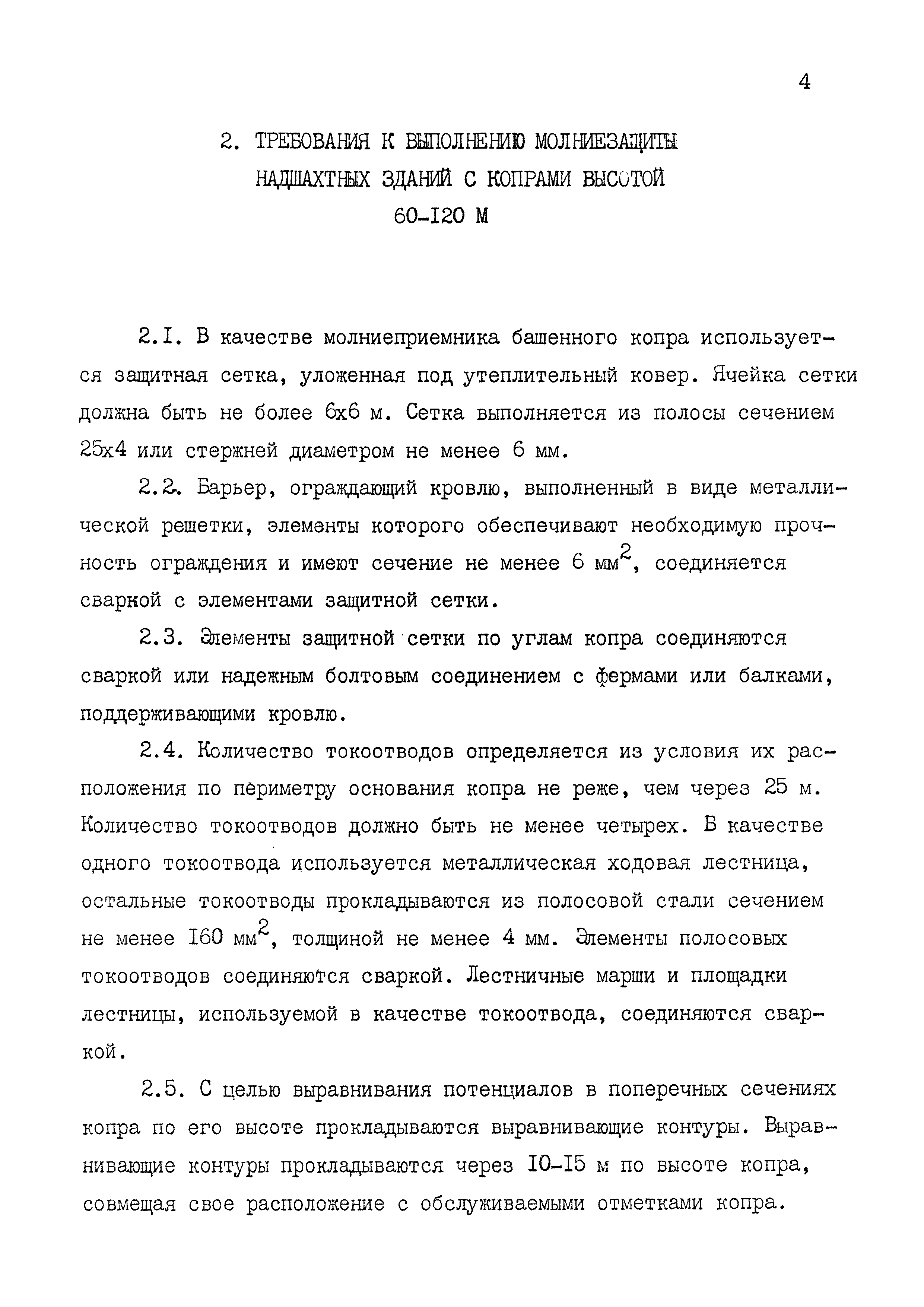 | Оглавление: | 1. Общие положения 2. Требования к выполнению молниезащиты надшахтных зданий с копрами высотой 60 - 120 м Приложение. Справочное. Обоснование принятых требований молниезащиты против заноса высоких потенциалов в подземные выработки |