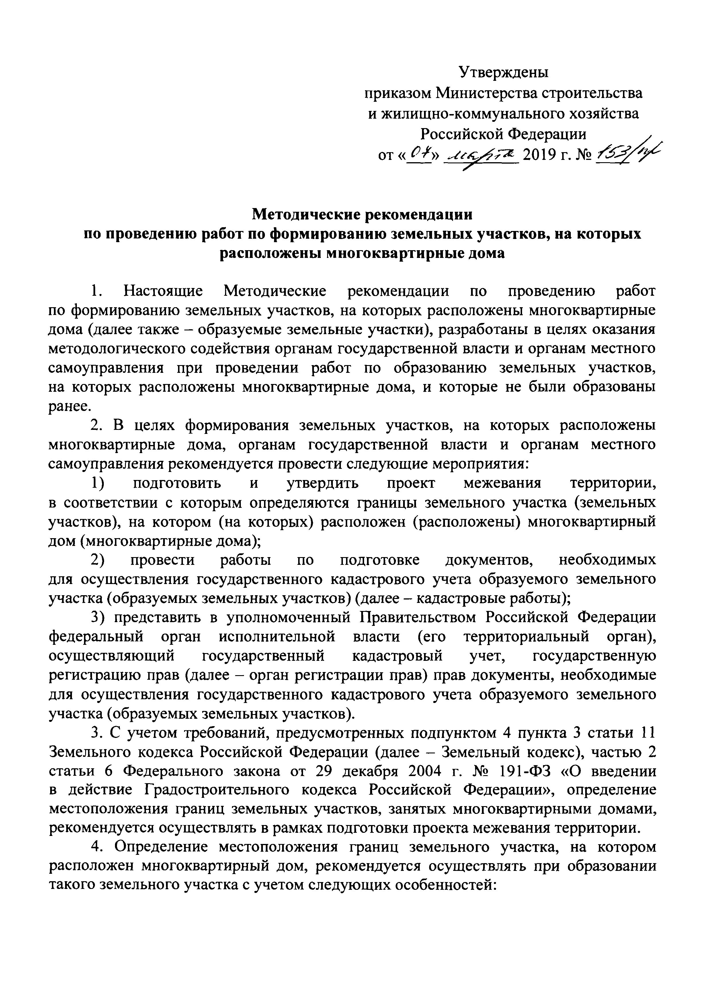 Методические рекомендации по проведению работ по формированию земельных участков, на которых расположены многоквартирные дома| Статус: | действует | | Название рус.: | Методические рекомендации по проведению работ по формированию земельных участков, на которых расположены многоквартирные дома | | Дата добавления в базу: | 01.02.2020 | | Дата актуализации: | 01.01.2021 | | Дата введения: | 07.03.2019 | | Область применения: | Методические рекомендации разработаны в целях оказания методологического содействия органам государственной власти и органам местного самоуправления при проведении работ по образованию земельных участков, на которых расположены многоквартирные дома, и которые не были образованы ранее | | Утверждён: | 07.03.2019 Министерство строительства и жилищно-коммунального хозяйства Российской Федерации (153/пр)