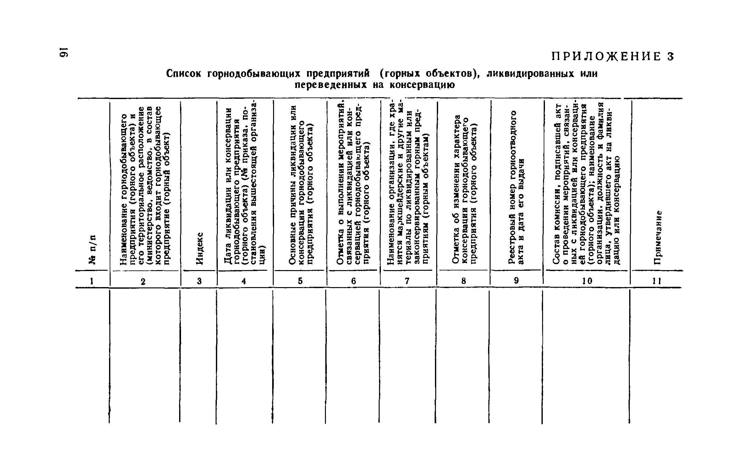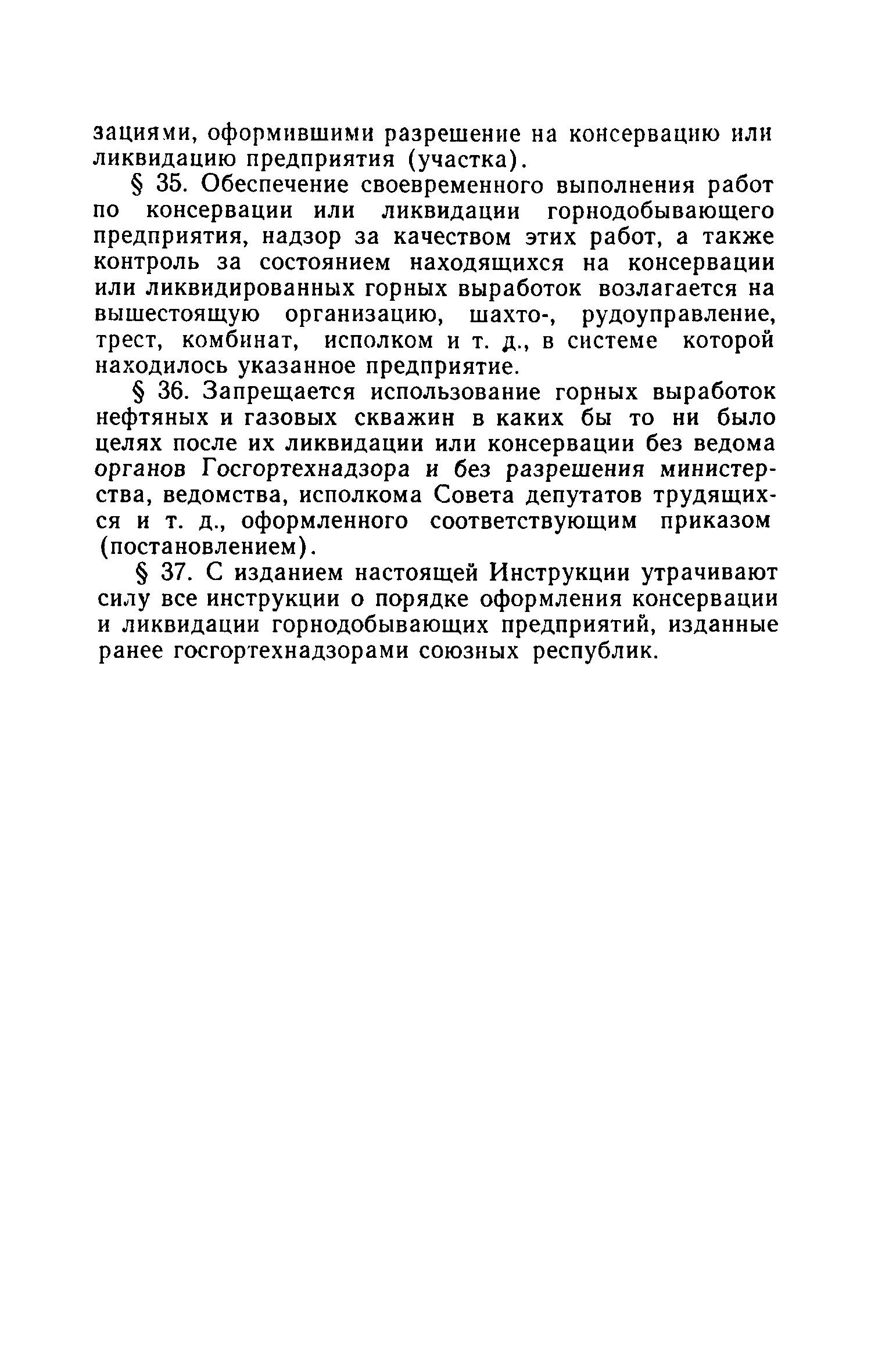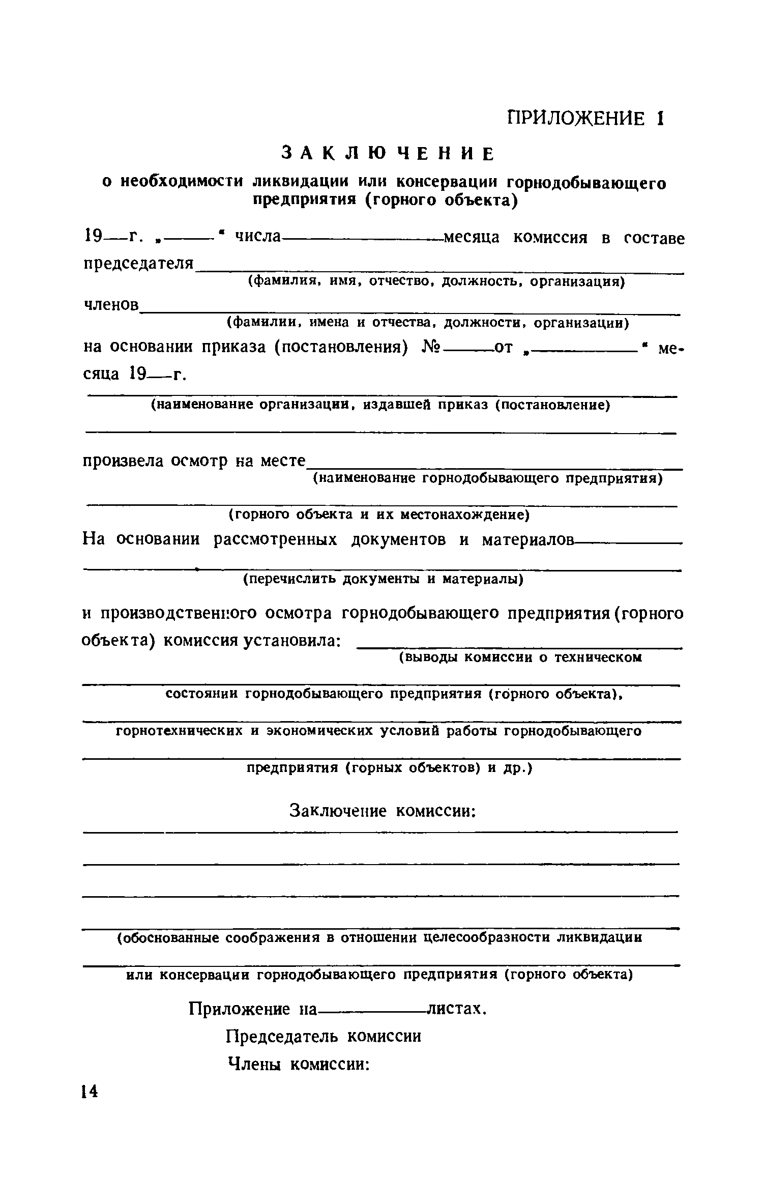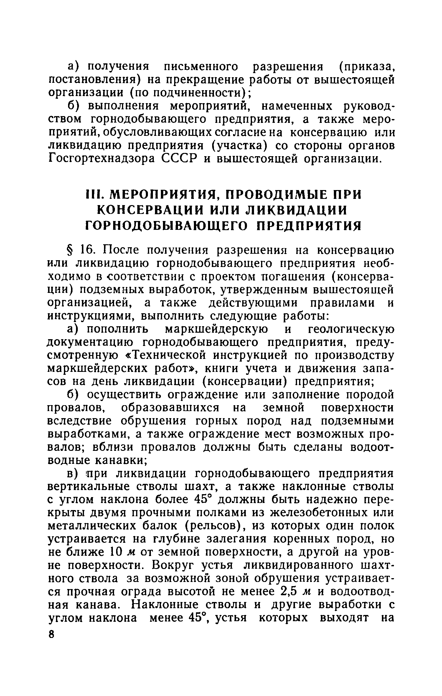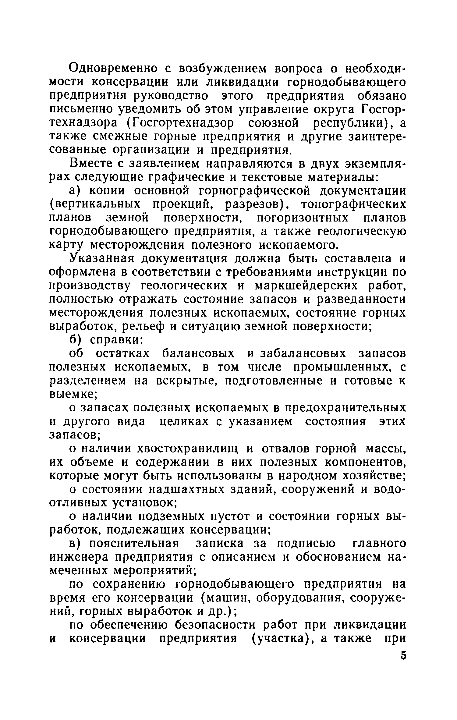 | Оглавление: | 1. Общие положения 2. Порядок получения и оформления разрешения на консервацию и ликвидацию горнодобывающего предприятия 3. Мероприятия, проводимые при консервации или ликвидации горнодобывающего предприятия Приложение 1. Форма заключения о необходимости ликвидации или консервации горнодобывающего предприятия (горного объекта) Приложение 2. Форма акта консервации или ликвидации Приложение 3. Список горнодобывающих предприятий (горных объектов), ликвидированных или переведенных на консервацию |