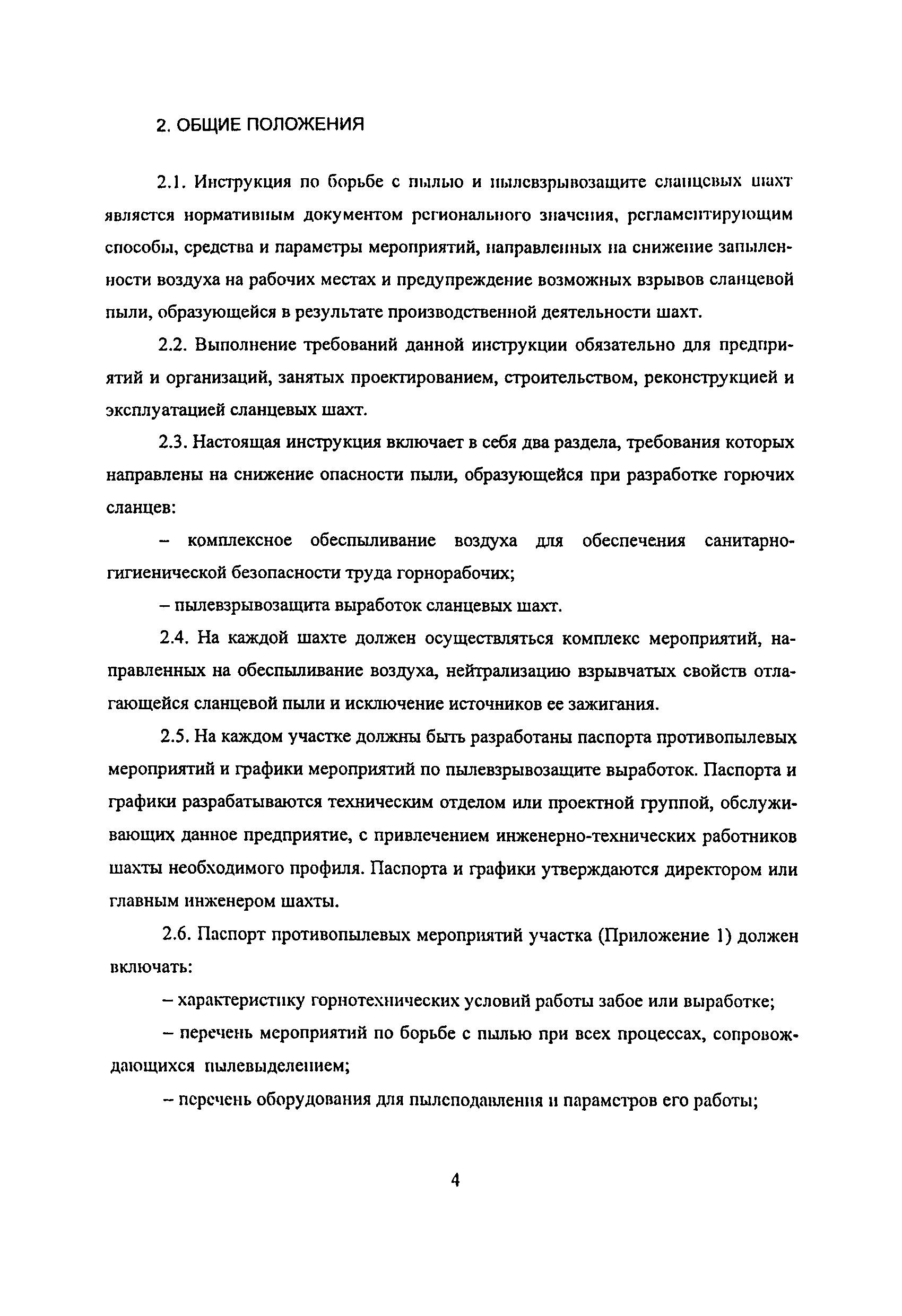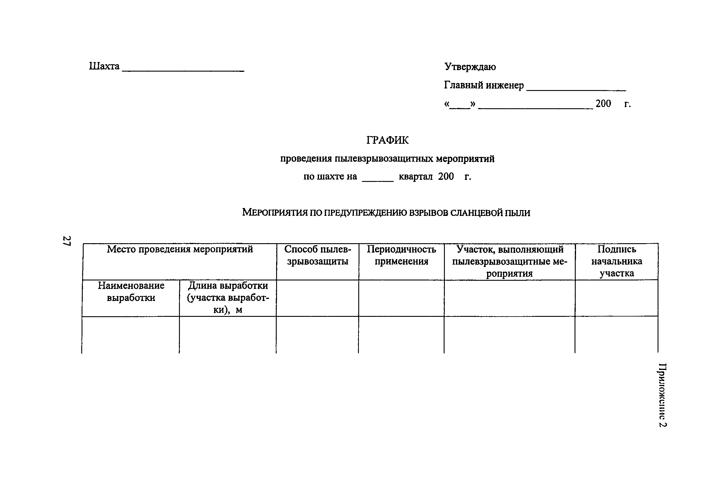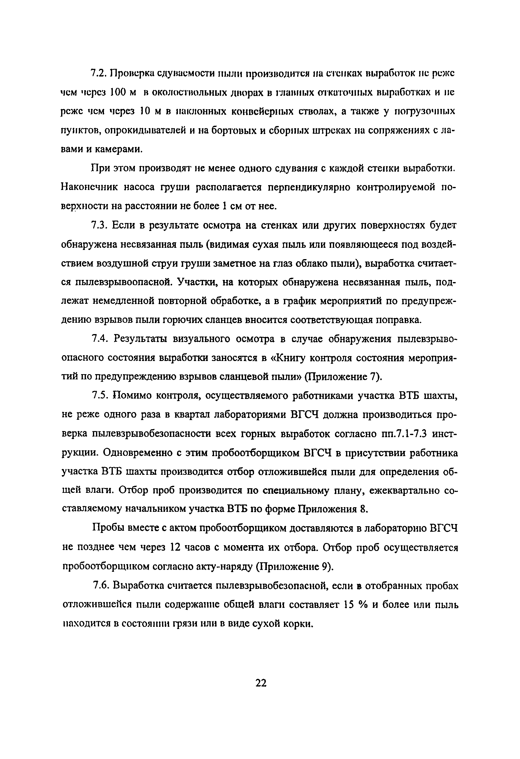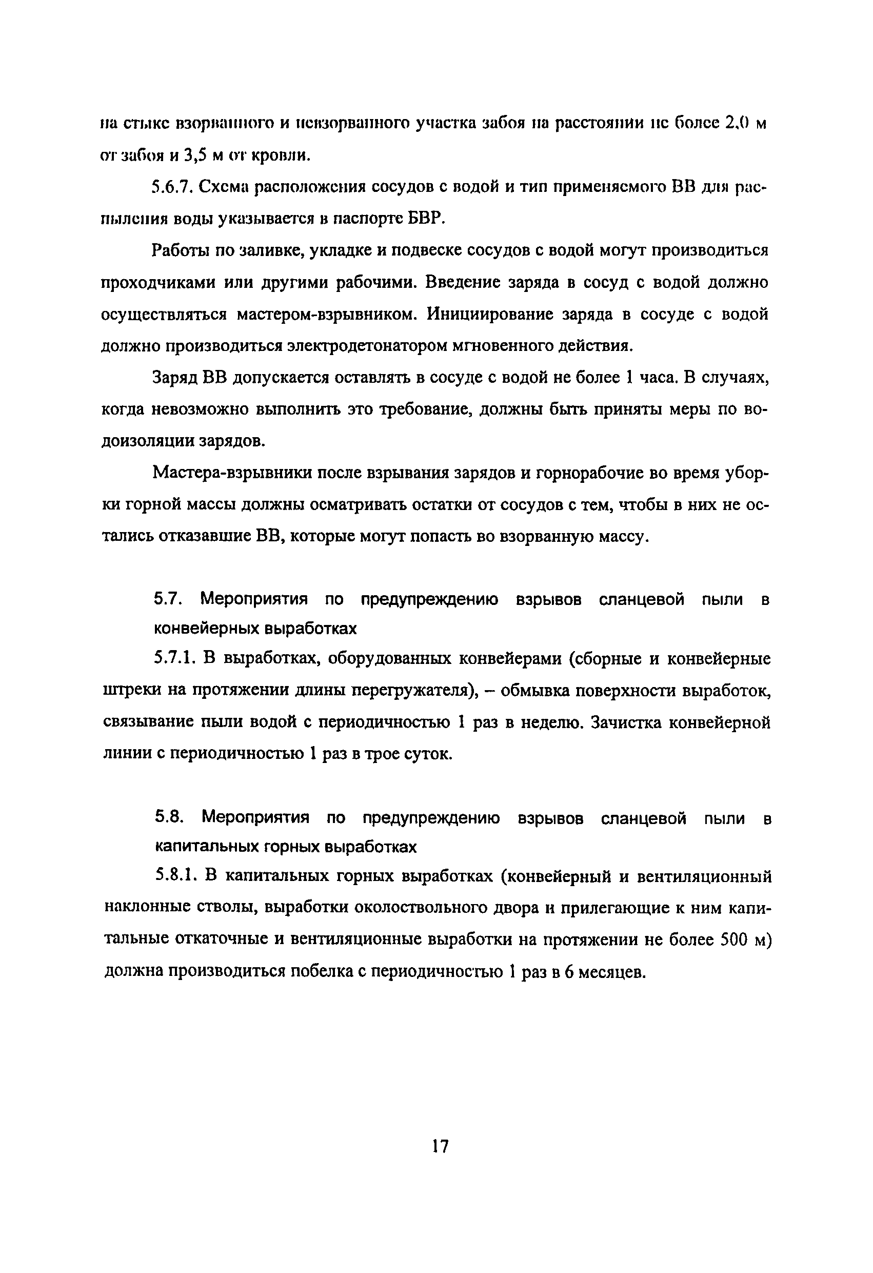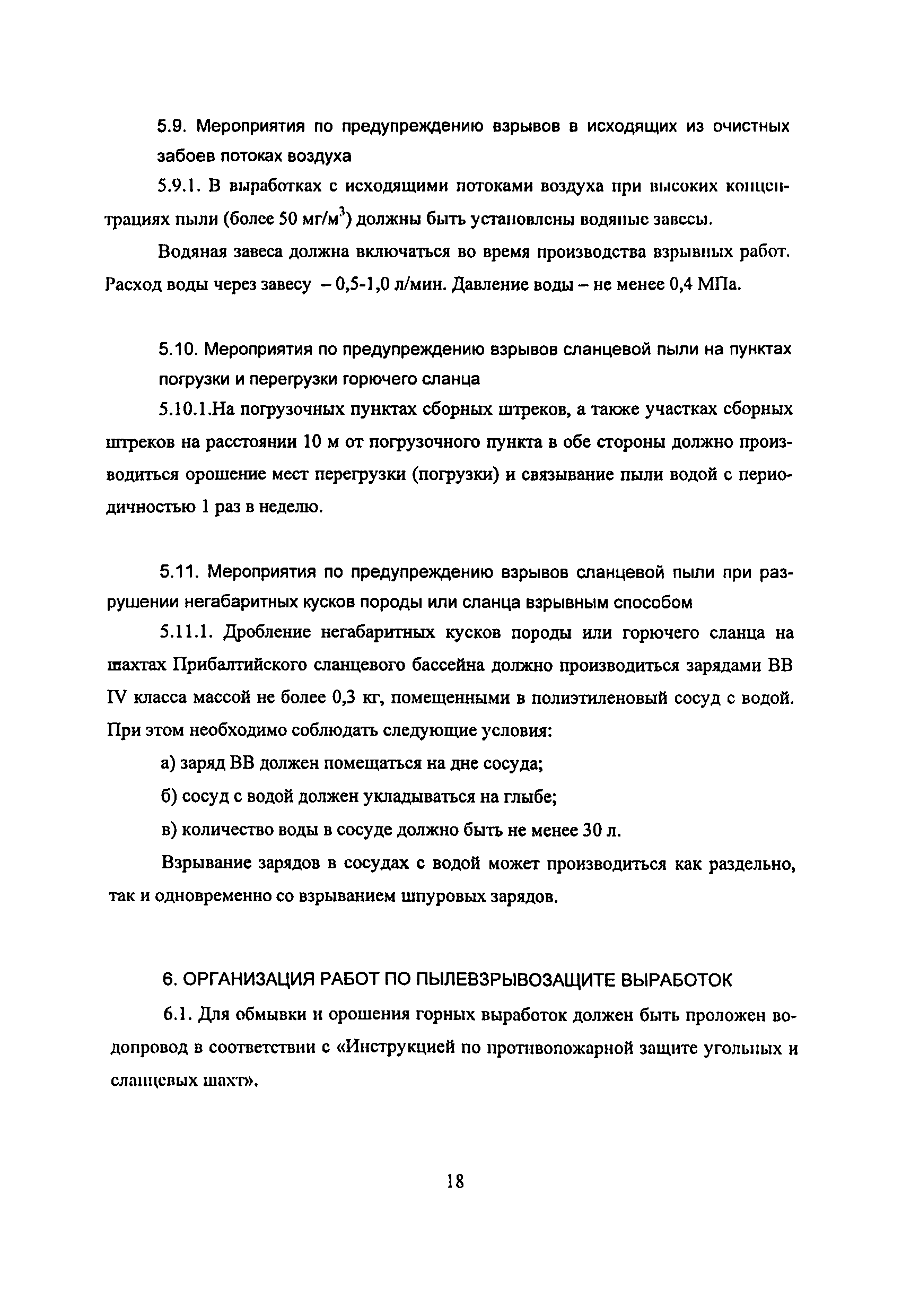 | Оглавление: | 1 Особенности разработки месторождения 2 Общие положения 3 Водоснабжение горных выработок и водоподготовка для борьбы с пылью в сланцевых шахтах 4 Комплексное обеспыливание воздуха при различных производственных процессах 5 Пылевзрывозащита горных выработок сланцевых щахт 6 Организация работ по пылевэрывозащите выработок 7 Контроль пылевзрывобезопасности горных выработок сланцевых шахт Приложение 1. Паспорт противопылевых мероприятий участка Приложение 2. График проведения пылевзрывозащитных мероприятий по шахте Приложение 3. График замера концентрации пыли в горных выработках шахты Приложение 4. Акт-наряд на измерение концентрации пыли Приложение 5. Форма извещения Приложение 6. Журнал учета концентрации пыли в горных выработках шахты Приложение 7. Книга контроля состояния мероприятий по предупреждению взрывов сланцевой пыли Приложение 8. План периодического контроля пылевзрывобезопасности горных выработок, отбора проб осланцованной пыли и угольной мелочи по шахте Приложение 9. Акт-наряд на отбор проб сланцевой пыли по шахте Приложение 10. Результаты контроля взрывобезопасности горных выработок и анализа проб сланцевой пыли |