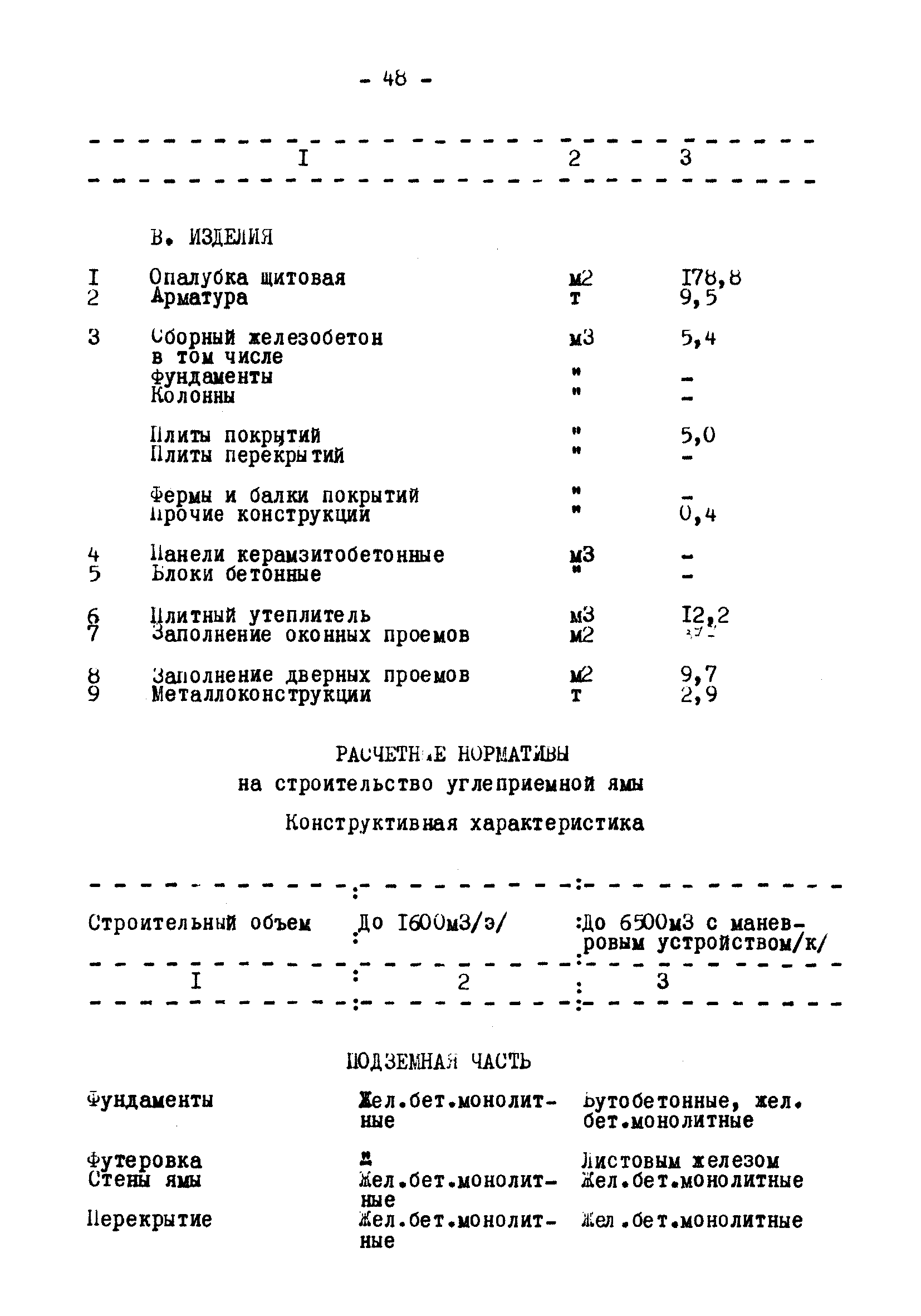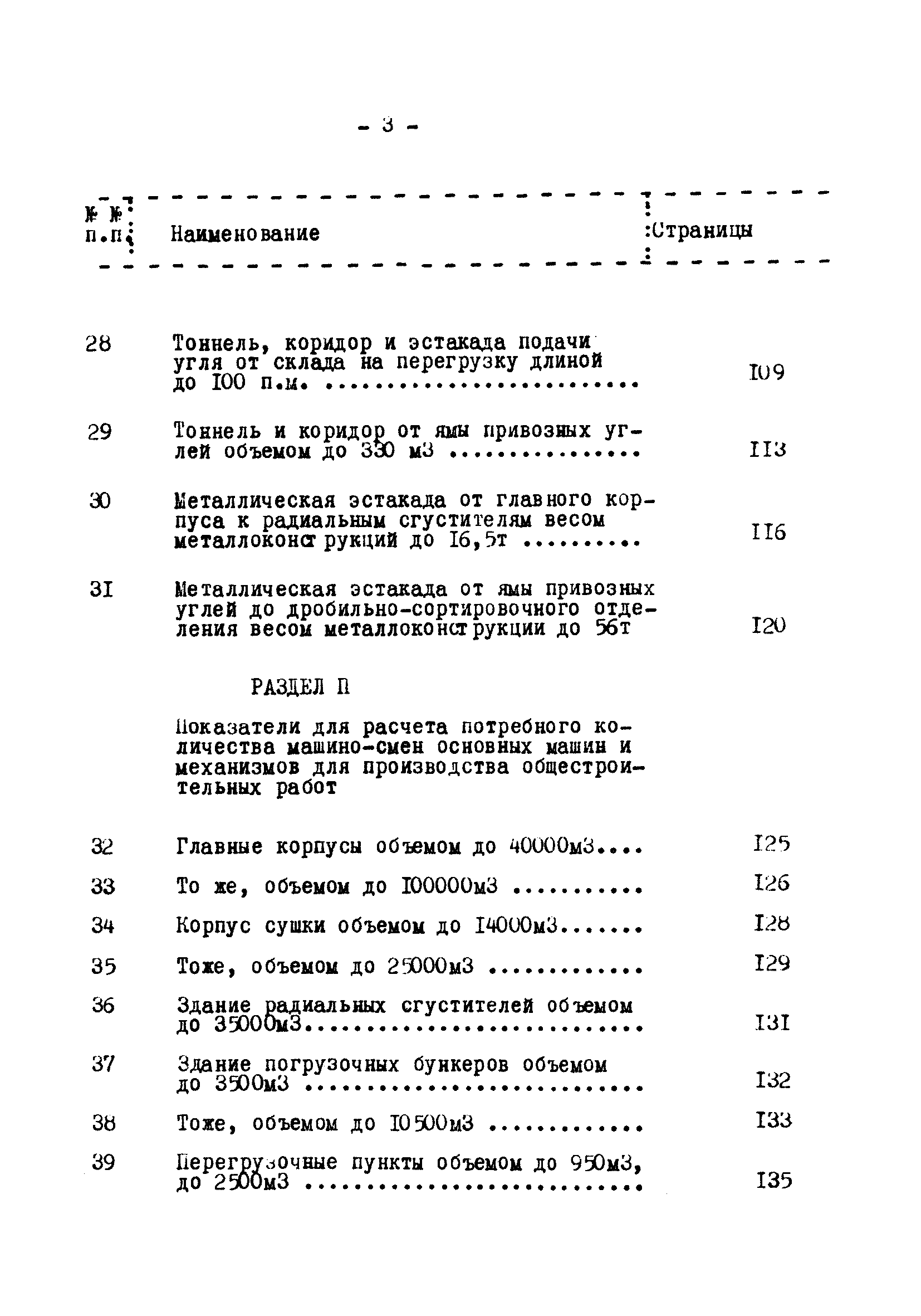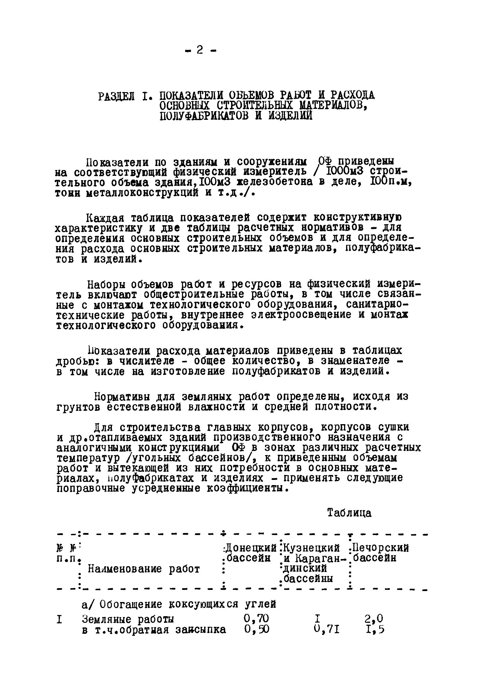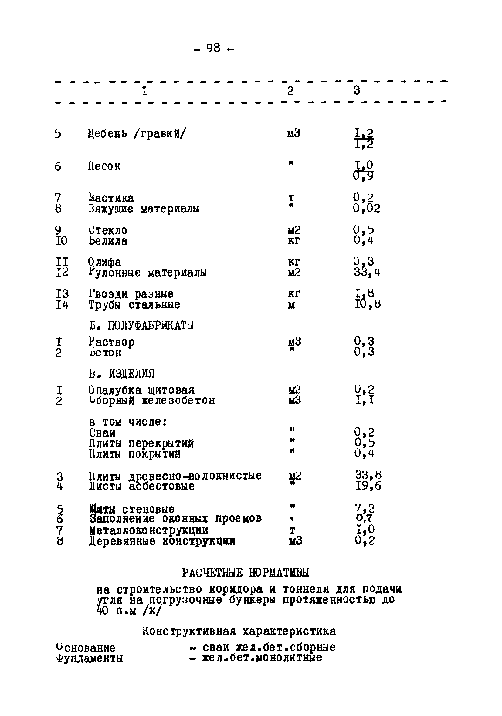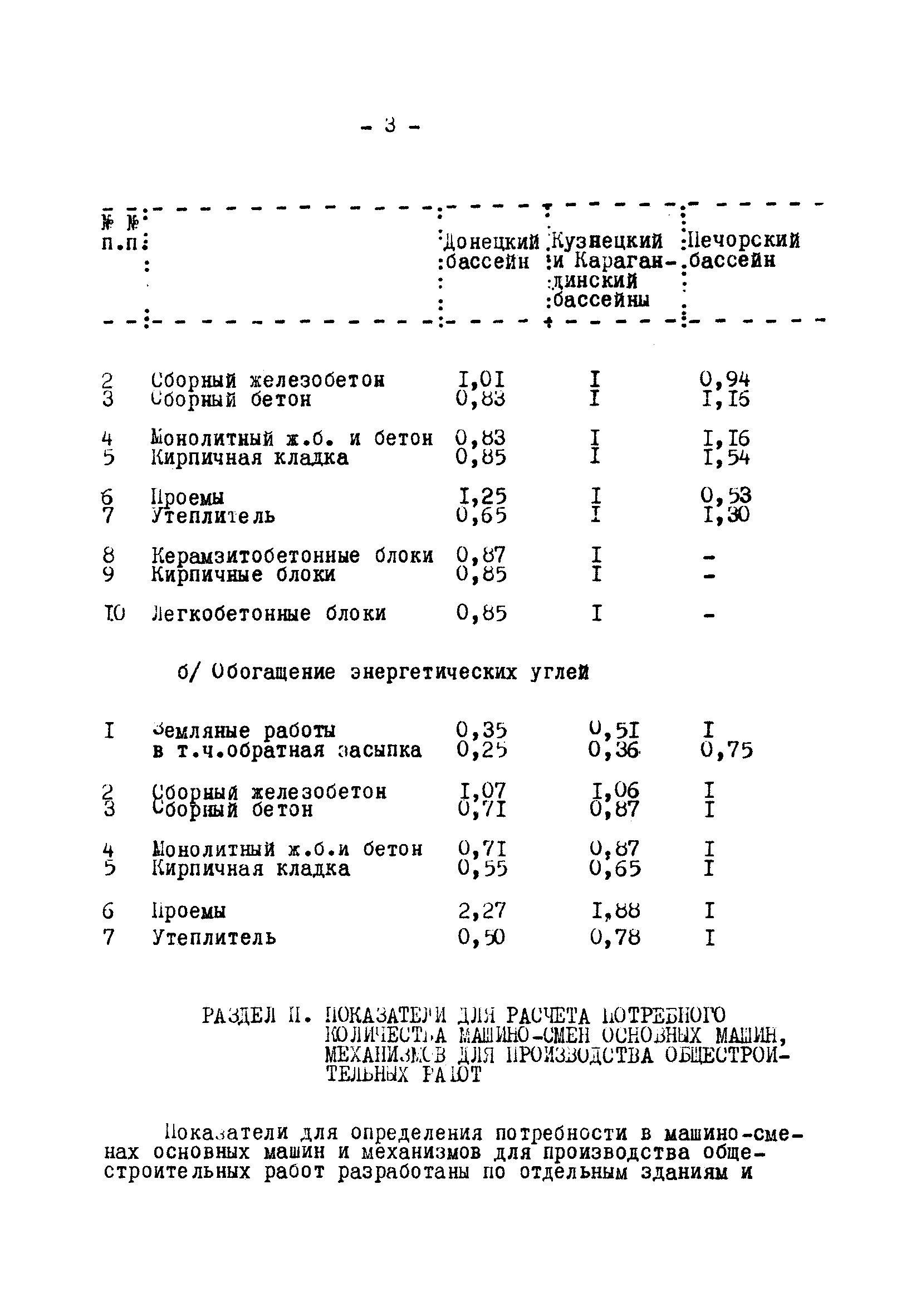 Расчетные нормативы для составления проектов организации строительства углеобогатительных фабрик| Статус: | справочные материалы, мп, тпр | | Название рус.: | Расчетные нормативы для составления проектов организации строительства углеобогатительных фабрик | | Дата добавления в базу: | 01.02.2020 | | Дата актуализации: | 01.01.2021 | | Область применения: | Нормативы предназначены для определения объемов основных работ и материально-технических ресурсов при составлении разделов "Организация строительства" проектного задания углеобогатительных фабрик | | Оглавление: | Раздел 1. Расчетные нормативы на строительство зданий и сооружений обогатительных фабрик 1 Главные корпусы ОФ объемом до 40000 м3, до 100000 м3 2 Корпус сушки объемом до 14000 м3 3 Здание радиальных сгустителей объемом до 35000 м3 4 Погрузочные пункты объемом до 3500 м3, 10500 м3 5 Перегрузочные пункты объемом до 950 м3, до 2500 м3 6 Шламовые бассейны объемом до 5600 м3 7 Контора с химлабораторией объемом до 2500 м3 8 Котельная объемом до 850 м3 9 Бункеры для золы объемом до 350 м3 10 Углеприемная яма объемом до 1600 м3, до 6500 м3 11 Материальный склад объемом до 3000 м3 12 Здание паровозо-ремонтного депо объемом до 8000 м3 13 Здание маневровой лебедки объемом до 650 м3 14 Оклад готовой продукции объемом до 750 м3 15 Склад реагентов и ГСМ объемом до 550 м3 16 Здание экспедиции объемом до 305 м3 17 Пункт технического осмотра вагонов объемом до 850 м3 18 Здание путевых рабочих объемом до 175 м3 19 Здание товарной конторы объемом до 300 м3 20 Насосная станция осветленных вод у шламонакопителя объемом до 170 м3 21 Шламопровод длиной до 70 м 22 Трубопровод осветленной воды длиной до 600 м 23 Металлическая эстакада весом металлоконструкций до 22 т 24 Металлическая галерея весом металлоконструкций до 65 т 25 Коридор и тоннель для подачи угля от здания перегрузки на погрузочные бункеры длиной до 40 м 26 Коридор и эстакада от перегрузки на склад длиной до 70 м 27 Кирпичный коридор и эстакада от главного корпуса на здание перегрузки длиной до 30 п.м. 28 Тоннель, коридор и эстакада подачи угля от склада на перегрузку длиной до 100 п.м. 29 Тоннель и коридор от ямы привозных углей объемом до 330 м3 30 Металлическая эстакада от главного корпуса к радиальным сгустителям весом металлоконструкций до 16,5 т 31 Металлическая эстакада от ямы привозных углей до дробильно-сортировочного отделения весом металлоконструкции до 56 т Раздел 2. Показатели для расчета потребного количества машино-смен основных машин и механизмов для производства общестроительных работ 32 Главные корпусы объемом до 40000 м3 33 То же, объемом до 100000 м3 34 Корпус сушки объемом до 14000 м3 35 Тоже, объемом до 23000 м3 36 Здание радиальных сгустителей объемом до 35000 м3 37 Здание погрузочных бункеров объемом до 3500 м3 38 Тоже, объемом до 10500 м3 39 Перегрузочные пункты объемом до 950 м3, 2500 м3 40 Шламовые бассейны до 5600 м3, до 24500 м3 41 Контора с химлабораторией объемом до 2500 м3 42 Углеприемная яма объемом до 1600 м3, до 6500 м3 43 Склад готовой продукции объемом жел. Бет. В деле до 750 м3 44 Склад реагентов и смазочных материалов объемом до 550 м3 Раздел 3. Показатели для расчета потребного количества автотранспорта для строительства зданий и сооружений ОФ 45 Показатели для определения потребного списочного парка автомашин при строительстве ОФ Раздел 4. Показатели для расчета потребного количества электроэнергии, пара и воды для строительства зданий и сооружений ОФ 46 Показате