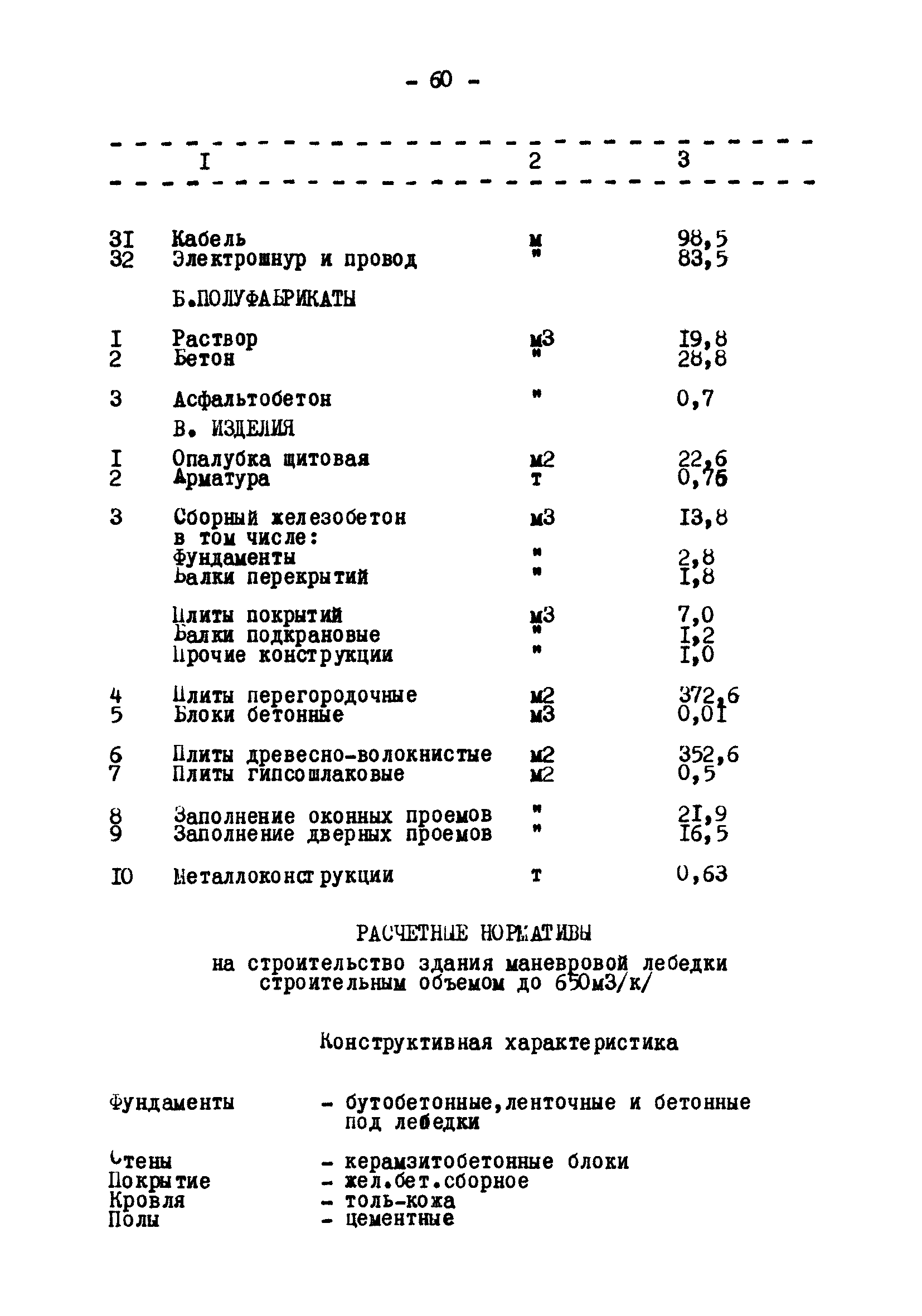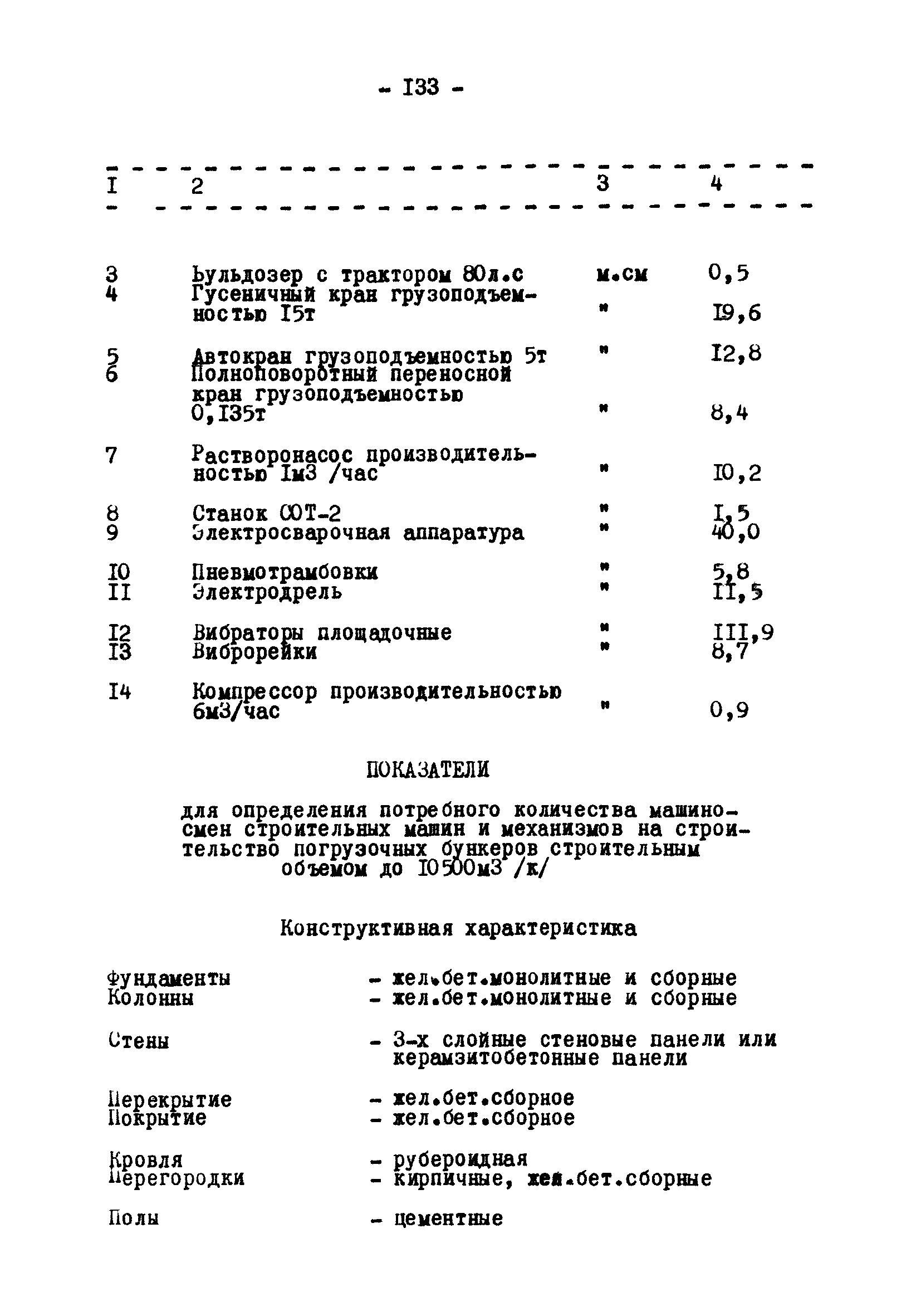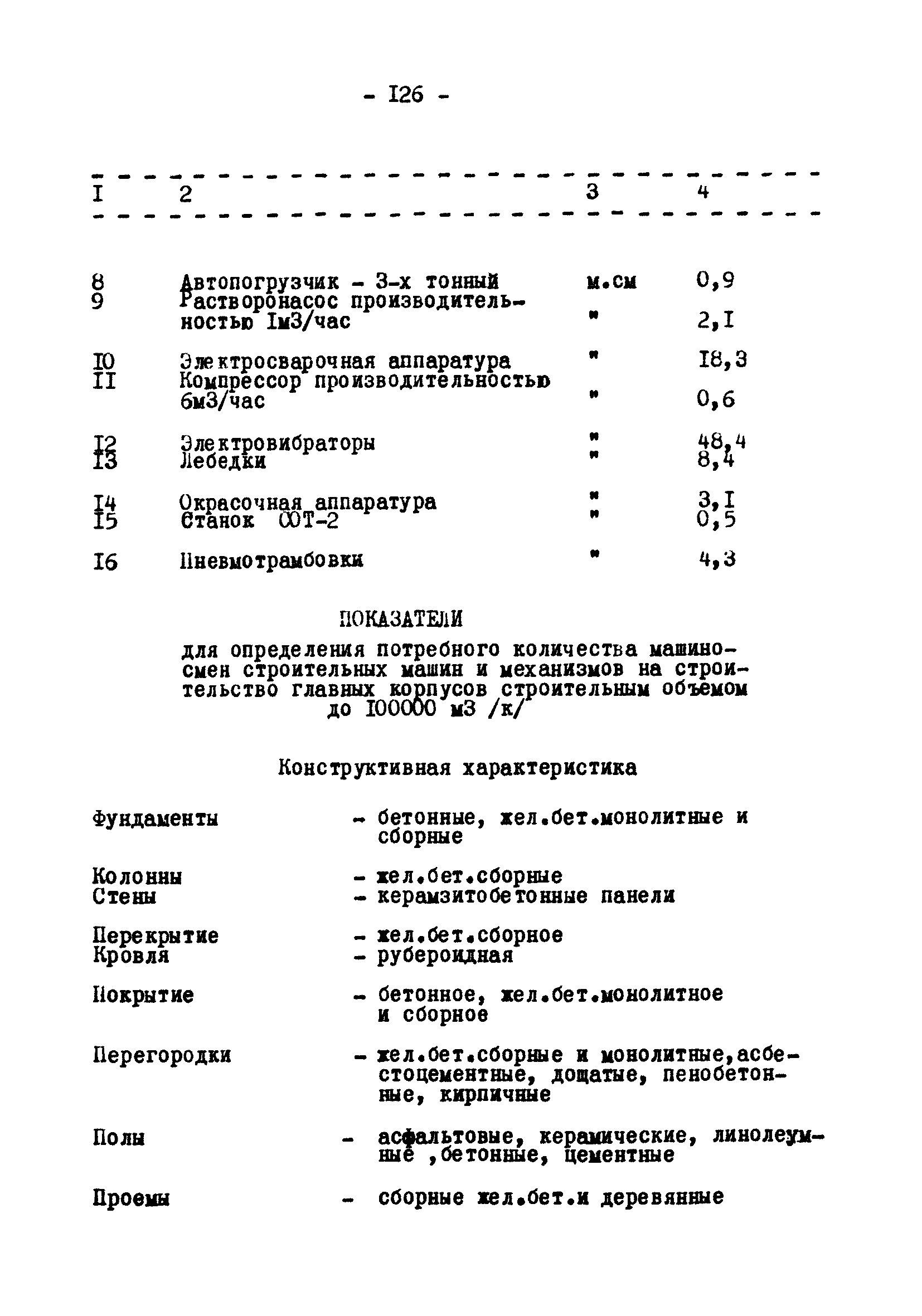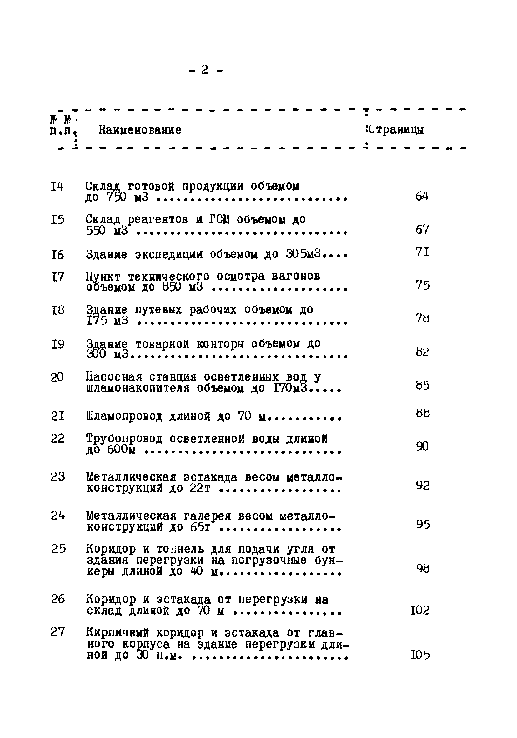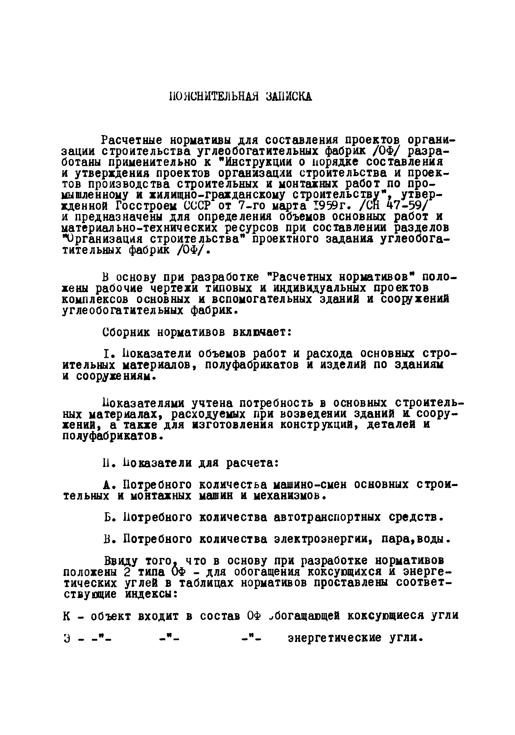 Расчетные нормативы для составления проектов организации строительства углеобогатительных фабрик| Статус: | справочные материалы, мп, тпр | | Название рус.: | Расчетные нормативы для составления проектов организации строительства углеобогатительных фабрик | | Дата добавления в базу: | 01.02.2020 | | Дата актуализации: | 01.01.2021 | | Область применения: | Нормативы предназначены для определения объемов основных работ и материально-технических ресурсов при составлении разделов "Организация строительства" проектного задания углеобогатительных фабрик | | Оглавление: | Раздел 1. Расчетные нормативы на строительство зданий и сооружений обогатительных фабрик 1 Главные корпусы ОФ объемом до 40000 м3, до 100000 м3 2 Корпус сушки объемом до 14000 м3 3 Здание радиальных сгустителей объемом до 35000 м3 4 Погрузочные пункты объемом до 3500 м3, 10500 м3 5 Перегрузочные пункты объемом до 950 м3, до 2500 м3 6 Шламовые бассейны объемом до 5600 м3 7 Контора с химлабораторией объемом до 2500 м3 8 Котельная объемом до 850 м3 9 Бункеры для золы объемом до 350 м3 10 Углеприемная яма объемом до 1600 м3, до 6500 м3 11 Материальный склад объемом до 3000 м3 12 Здание паровозо-ремонтного депо объемом до 8000 м3 13 Здание маневровой лебедки объемом до 650 м3 14 Оклад готовой продукции объемом до 750 м3 15 Склад реагентов и ГСМ объемом до 550 м3 16 Здание экспедиции объемом до 305 м3 17 Пункт технического осмотра вагонов объемом до 850 м3 18 Здание путевых рабочих объемом до 175 м3 19 Здание товарной конторы объемом до 300 м3 20 Насосная станция осветленных вод у шламонакопителя объемом до 170 м3 21 Шламопровод длиной до 70 м 22 Трубопровод осветленной воды длиной до 600 м 23 Металлическая эстакада весом металлоконструкций до 22 т 24 Металлическая галерея весом металлоконструкций до 65 т 25 Коридор и тоннель для подачи угля от здания перегрузки на погрузочные бункеры длиной до 40 м 26 Коридор и эстакада от перегрузки на склад длиной до 70 м 27 Кирпичный коридор и эстакада от главного корпуса на здание перегрузки длиной до 30 п.м. 28 Тоннель, коридор и эстакада подачи угля от склада на перегрузку длиной до 100 п.м. 29 Тоннель и коридор от ямы привозных углей объемом до 330 м3 30 Металлическая эстакада от главного корпуса к радиальным сгустителям весом металлоконструкций до 16,5 т 31 Металлическая эстакада от ямы привозных углей до дробильно-сортировочного отделения весом металлоконструкции до 56 т Раздел 2. Показатели для расчета потребного количества машино-смен основных машин и механизмов для производства общестроительных работ 32 Главные корпусы объемом до 40000 м3 33 То же, объемом до 100000 м3 34 Корпус сушки объемом до 14000 м3 35 Тоже, объемом до 23000 м3 36 Здание радиальных сгустителей объемом до 35000 м3 37 Здание погрузочных бункеров объемом до 3500 м3 38 Тоже, объемом до 10500 м3 39 Перегрузочные пункты объемом до 950 м3, 2500 м3 40 Шламовые бассейны до 5600 м3, до 24500 м3 41 Контора с химлабораторией объемом до 2500 м3 42 Углеприемная яма объемом до 1600 м3, до 6500 м3 43 Склад готовой продукции объемом жел. Бет. В деле до 750 м3 44 Склад реагентов и смазочных материалов объемом до 550 м3 Раздел 3. Показатели для расчета потребного количества автотранспорта для строительства зданий и сооружений ОФ 45 Показатели для определения потребного списочного парка автомашин при строительстве ОФ Раздел 4. Показатели для расчета потребного количества электроэнергии, пара и воды для строительства зданий и сооружений ОФ 46 Показате