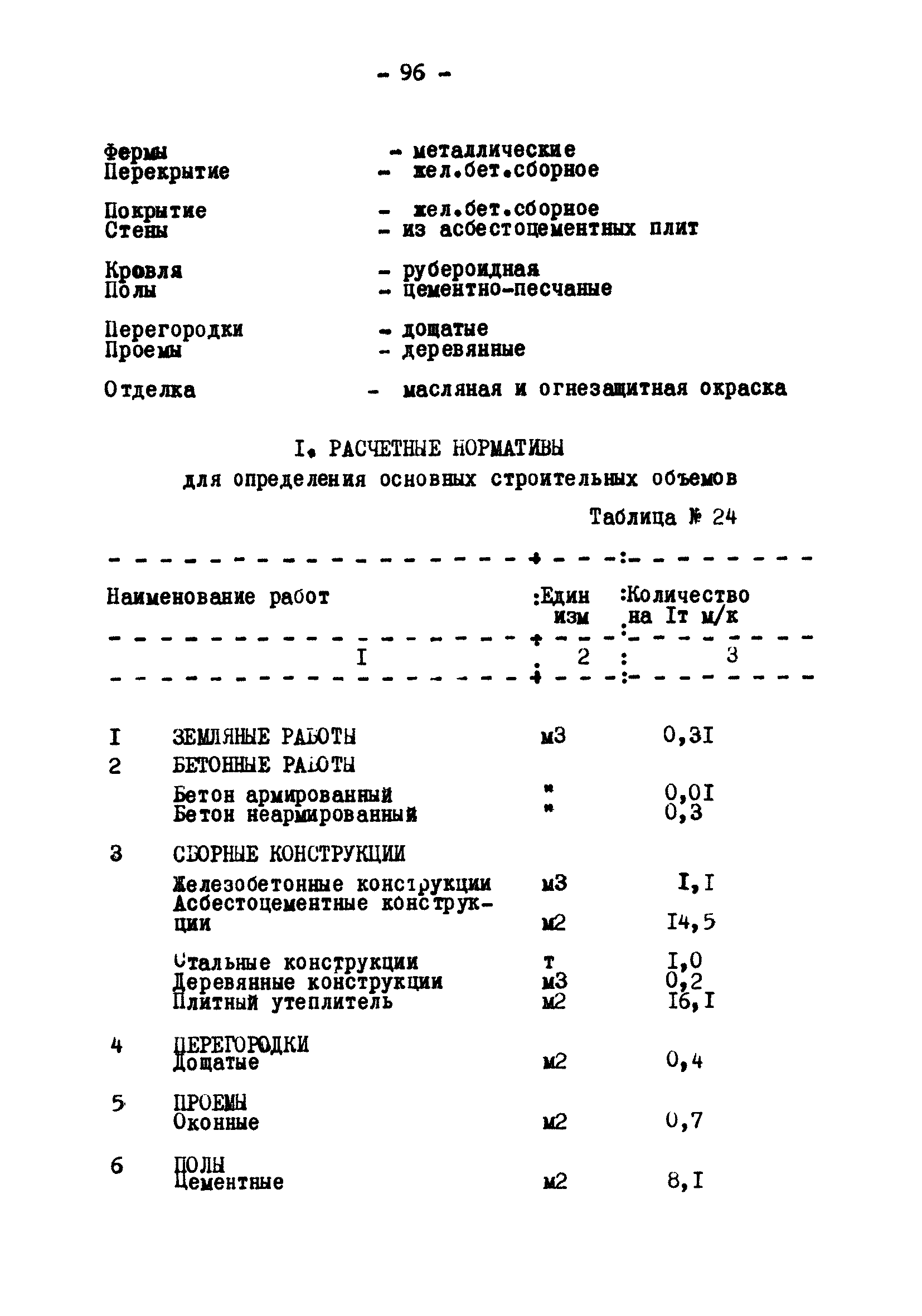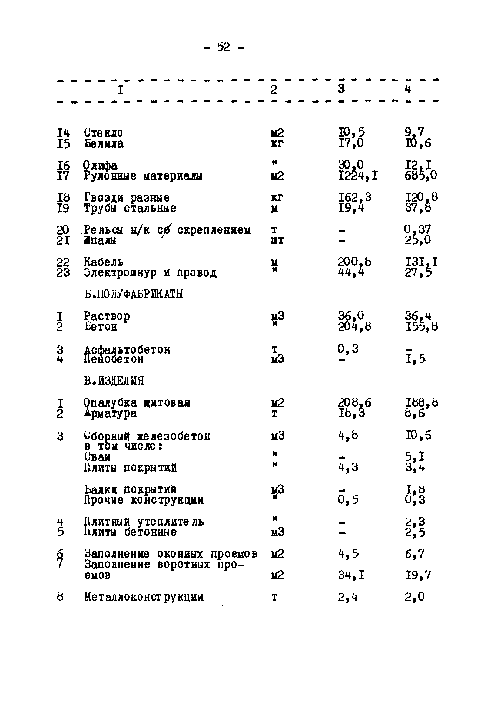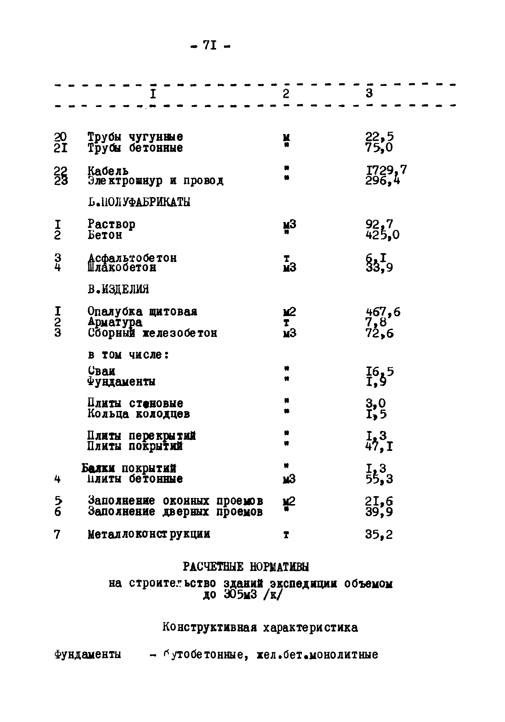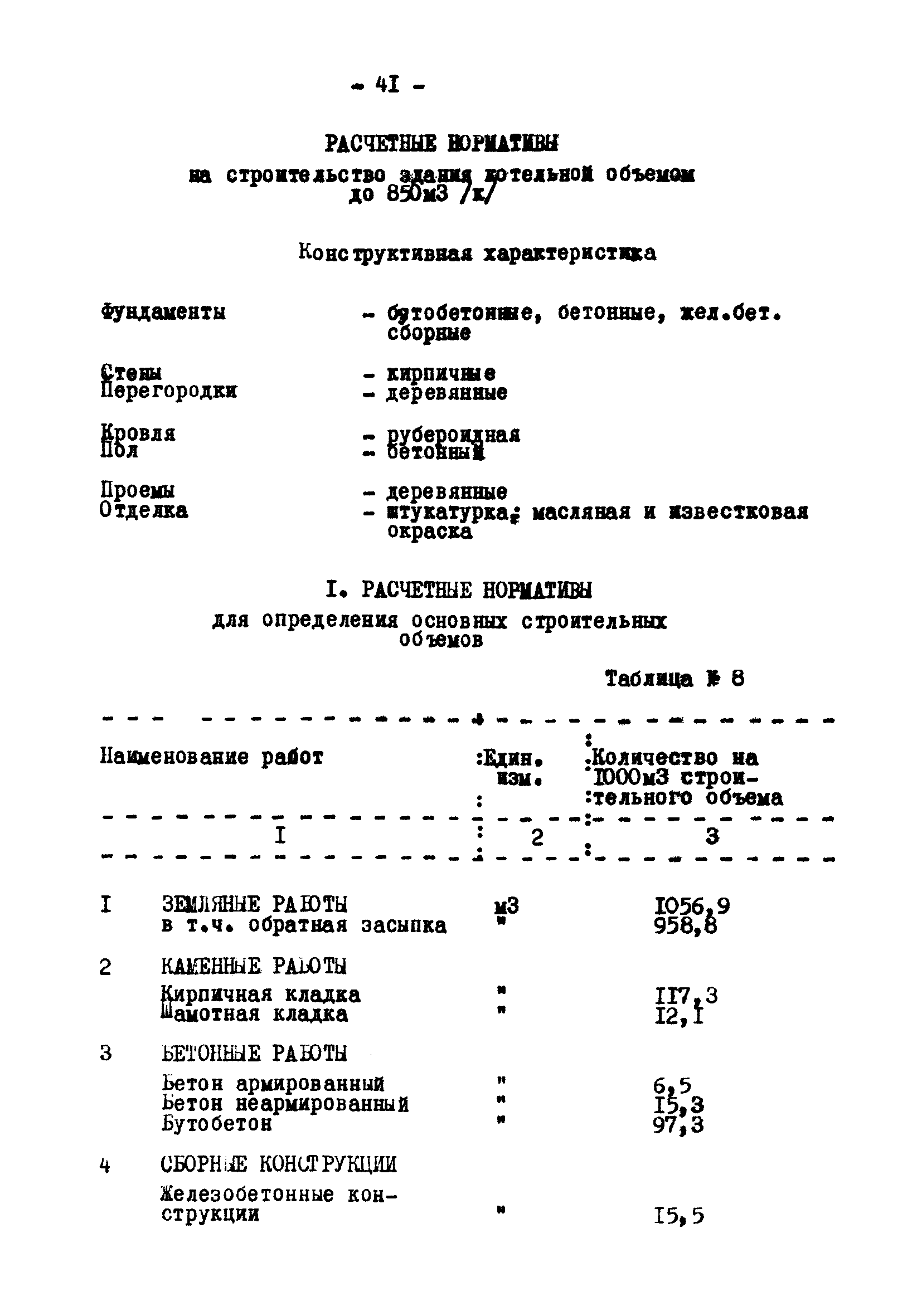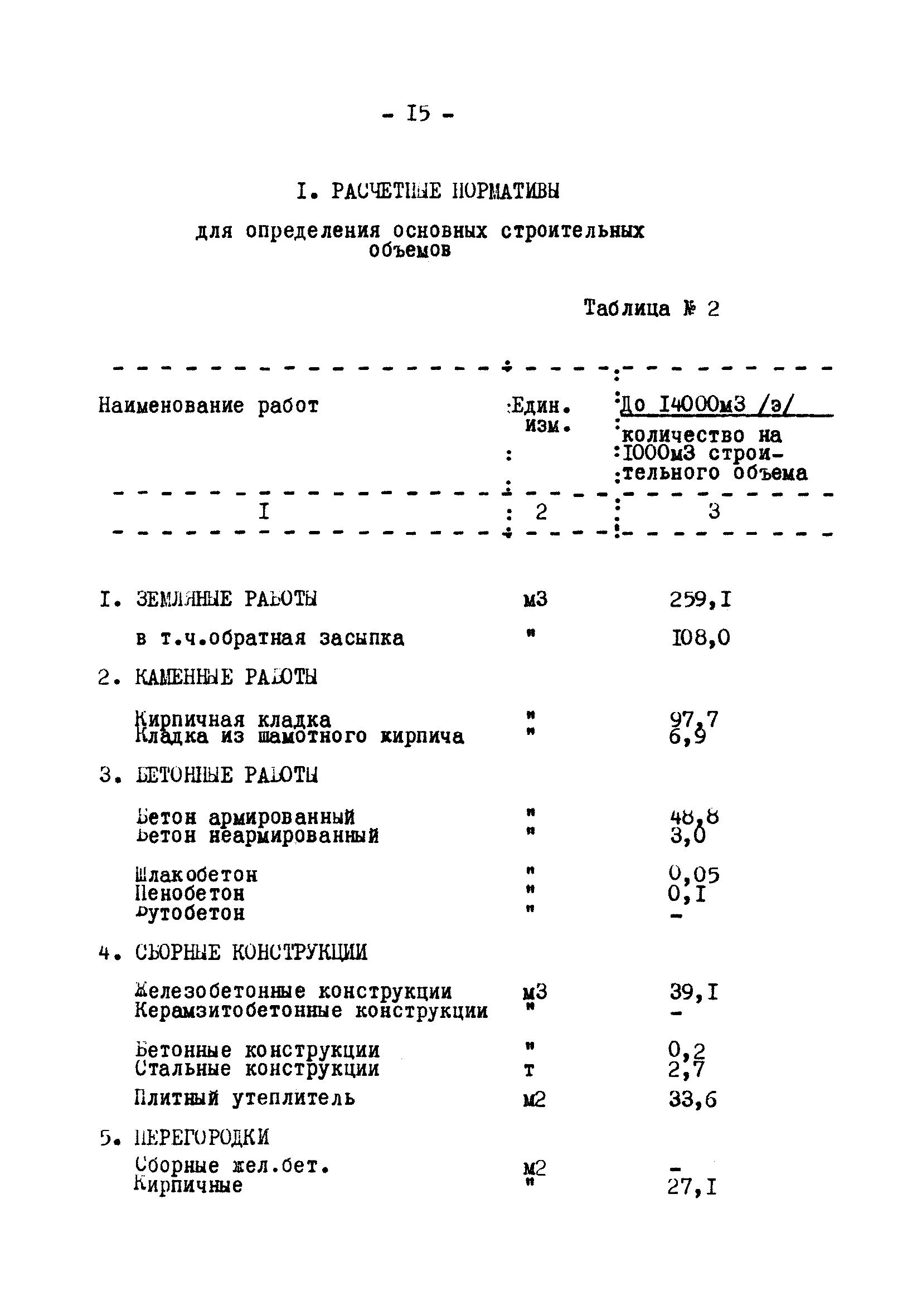 Расчетные нормативы для составления проектов организации строительства углеобогатительных фабрик| Статус: | справочные материалы, мп, тпр | | Название рус.: | Расчетные нормативы для составления проектов организации строительства углеобогатительных фабрик | | Дата добавления в базу: | 01.02.2020 | | Дата актуализации: | 01.01.2021 | | Область применения: | Нормативы предназначены для определения объемов основных работ и материально-технических ресурсов при составлении разделов "Организация строительства" проектного задания углеобогатительных фабрик | | Оглавление: | Раздел 1. Расчетные нормативы на строительство зданий и сооружений обогатительных фабрик 1 Главные корпусы ОФ объемом до 40000 м3, до 100000 м3 2 Корпус сушки объемом до 14000 м3 3 Здание радиальных сгустителей объемом до 35000 м3 4 Погрузочные пункты объемом до 3500 м3, 10500 м3 5 Перегрузочные пункты объемом до 950 м3, до 2500 м3 6 Шламовые бассейны объемом до 5600 м3 7 Контора с химлабораторией объемом до 2500 м3 8 Котельная объемом до 850 м3 9 Бункеры для золы объемом до 350 м3 10 Углеприемная яма объемом до 1600 м3, до 6500 м3 11 Материальный склад объемом до 3000 м3 12 Здание паровозо-ремонтного депо объемом до 8000 м3 13 Здание маневровой лебедки объемом до 650 м3 14 Оклад готовой продукции объемом до 750 м3 15 Склад реагентов и ГСМ объемом до 550 м3 16 Здание экспедиции объемом до 305 м3 17 Пункт технического осмотра вагонов объемом до 850 м3 18 Здание путевых рабочих объемом до 175 м3 19 Здание товарной конторы объемом до 300 м3 20 Насосная станция осветленных вод у шламонакопителя объемом до 170 м3 21 Шламопровод длиной до 70 м 22 Трубопровод осветленной воды длиной до 600 м 23 Металлическая эстакада весом металлоконструкций до 22 т 24 Металлическая галерея весом металлоконструкций до 65 т 25 Коридор и тоннель для подачи угля от здания перегрузки на погрузочные бункеры длиной до 40 м 26 Коридор и эстакада от перегрузки на склад длиной до 70 м 27 Кирпичный коридор и эстакада от главного корпуса на здание перегрузки длиной до 30 п.м. 28 Тоннель, коридор и эстакада подачи угля от склада на перегрузку длиной до 100 п.м. 29 Тоннель и коридор от ямы привозных углей объемом до 330 м3 30 Металлическая эстакада от главного корпуса к радиальным сгустителям весом металлоконструкций до 16,5 т 31 Металлическая эстакада от ямы привозных углей до дробильно-сортировочного отделения весом металлоконструкции до 56 т Раздел 2. Показатели для расчета потребного количества машино-смен основных машин и механизмов для производства общестроительных работ 32 Главные корпусы объемом до 40000 м3 33 То же, объемом до 100000 м3 34 Корпус сушки объемом до 14000 м3 35 Тоже, объемом до 23000 м3 36 Здание радиальных сгустителей объемом до 35000 м3 37 Здание погрузочных бункеров объемом до 3500 м3 38 Тоже, объемом до 10500 м3 39 Перегрузочные пункты объемом до 950 м3, 2500 м3 40 Шламовые бассейны до 5600 м3, до 24500 м3 41 Контора с химлабораторией объемом до 2500 м3 42 Углеприемная яма объемом до 1600 м3, до 6500 м3 43 Склад готовой продукции объемом жел. Бет. В деле до 750 м3 44 Склад реагентов и смазочных материалов объемом до 550 м3 Раздел 3. Показатели для расчета потребного количества автотранспорта для строительства зданий и сооружений ОФ 45 Показатели для определения потребного списочного парка автомашин при строительстве ОФ Раздел 4. Показатели для расчета потребного количества электроэнергии, пара и воды для строительства зданий и сооружений ОФ 46 Показате