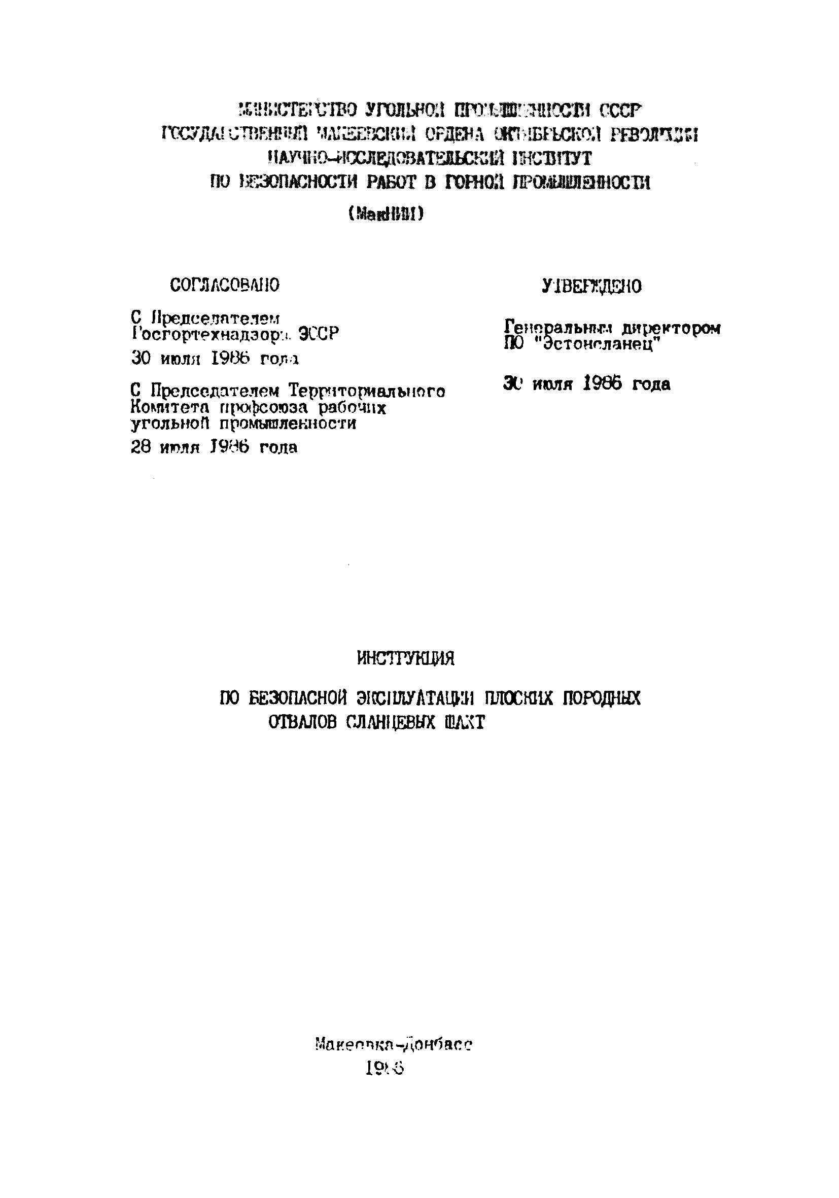 | Принят: | 30.07.1986 Госгортехнадзор ЭССР 28.07.1986 Комитет профсоюза рабочих угольной промышленности