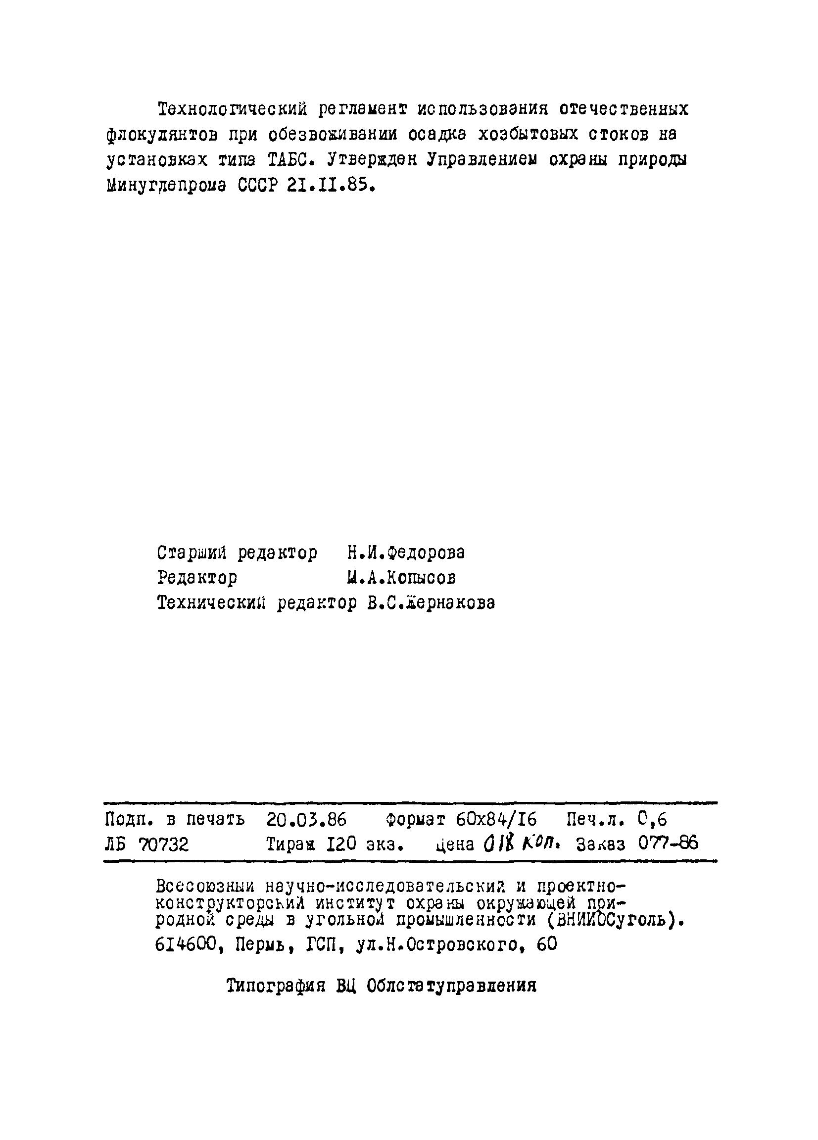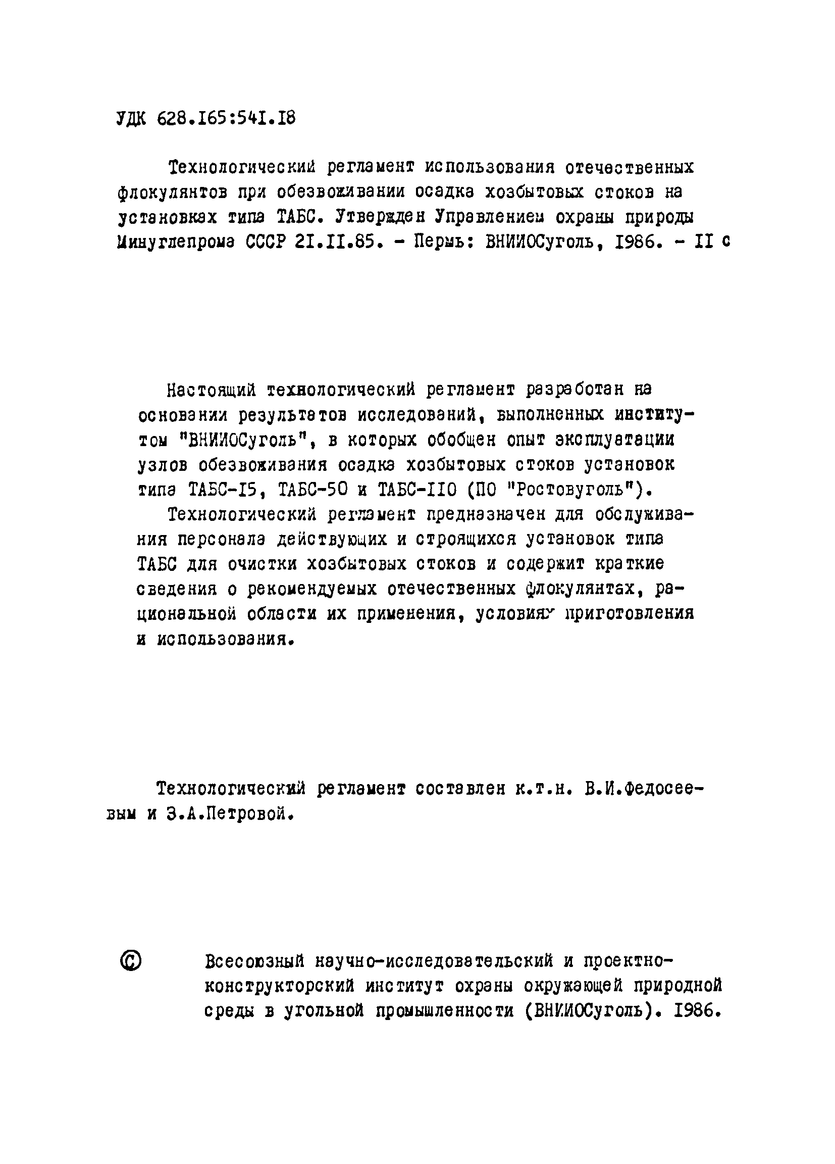 | Название рус.: | Технологический регламент использования отечественных флокулянтов при обезвоживании осадка хозбытовых стоков на установках типа ТАБС |