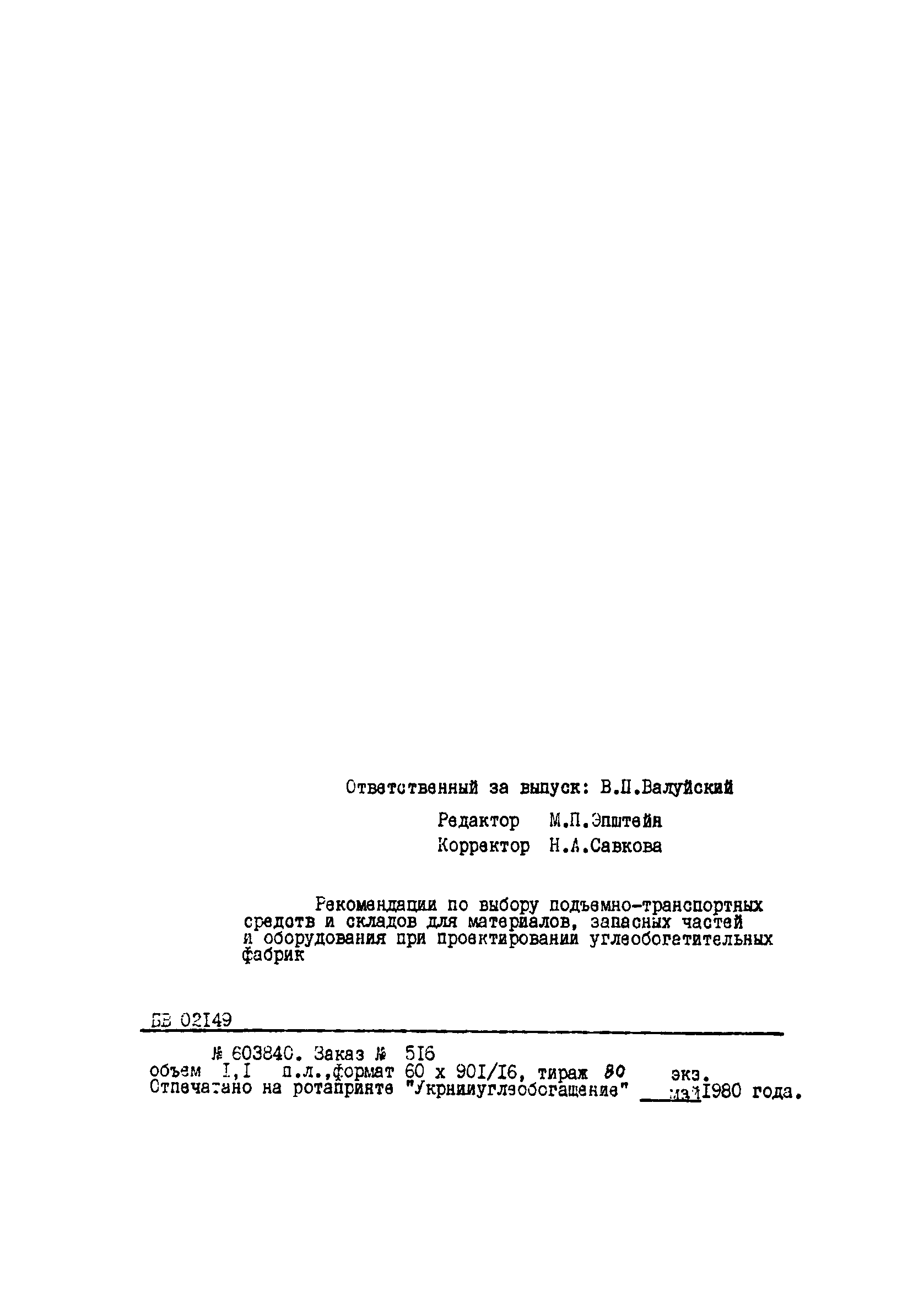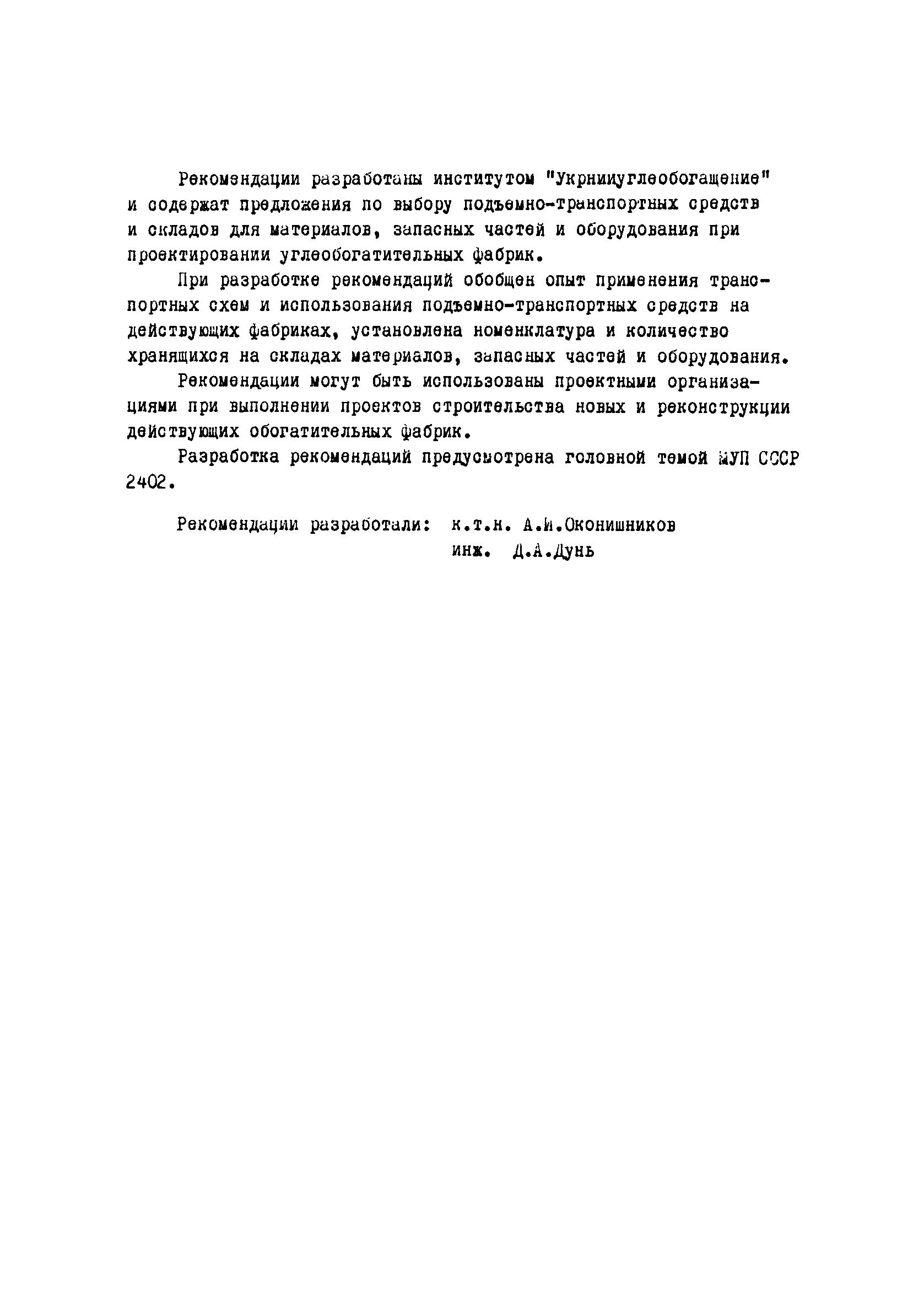 Рекомендации по выбору подъемно-транспортных средств и складов для материалов, запасных частей и оборудования при проектировании углеобогатительных фабрик| Статус: | справочные материалы, мп, тпр | | Название рус.: | Рекомендации по выбору подъемно-транспортных средств и складов для материалов, запасных частей и оборудования при проектировании углеобогатительных фабрик | | Дата добавления в базу: | 01.02.2020 | | Дата актуализации: | 01.01.2021 | | Область применения: | Рекомендации могут быть использованы проекными организациями при выполнении проектов строиетльства новых и реконструкции действующих обогатительных фабрик | | Оглавление: | 1 Введение 2 Общие положения 3 Подъемно-транспортные средства 4 Склады материалов, запасных частей и оборудования Приложение 1. Исходные данные для проектирования складов | | Разработан: | УкрНИИуглеобогащение