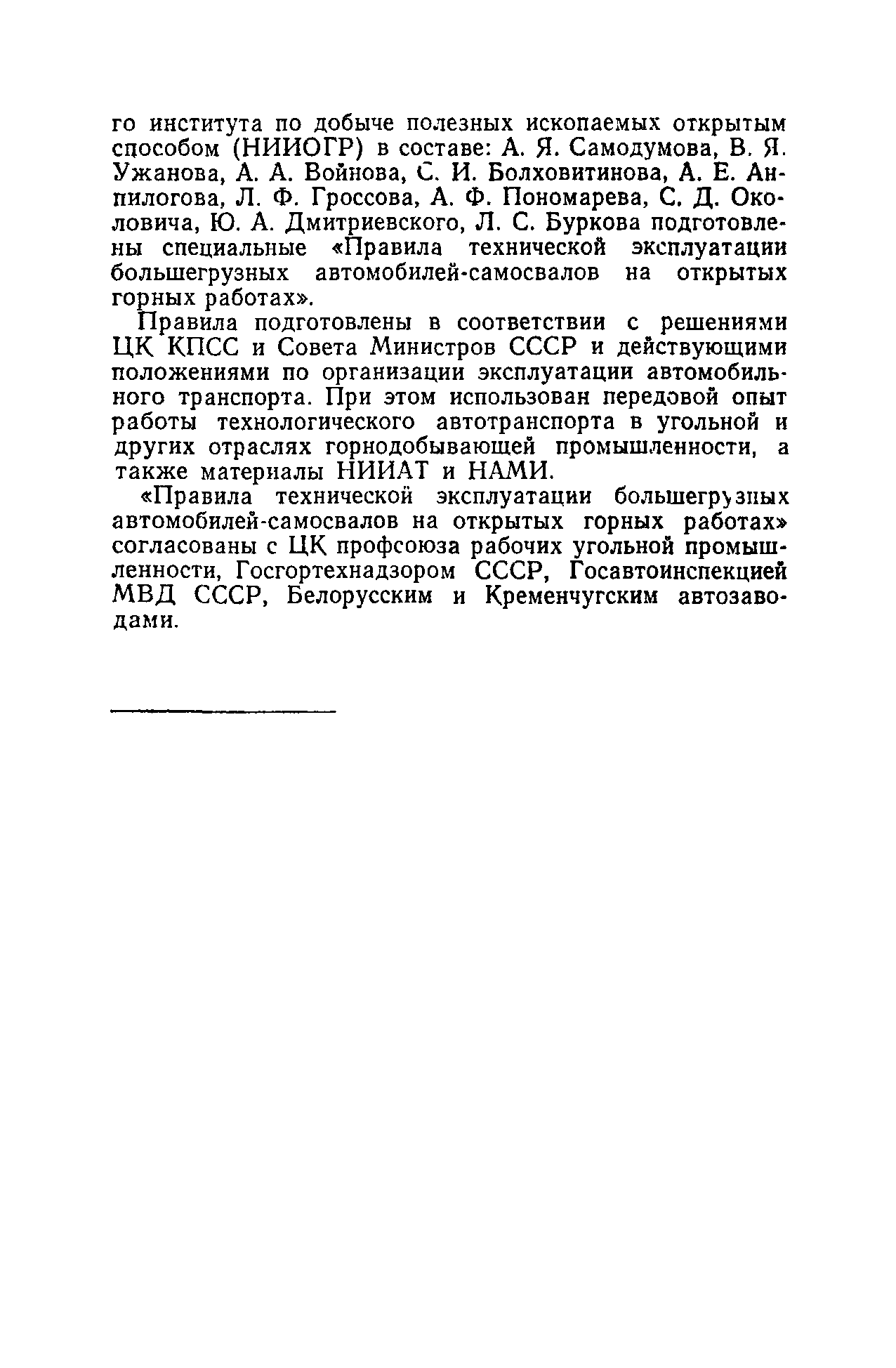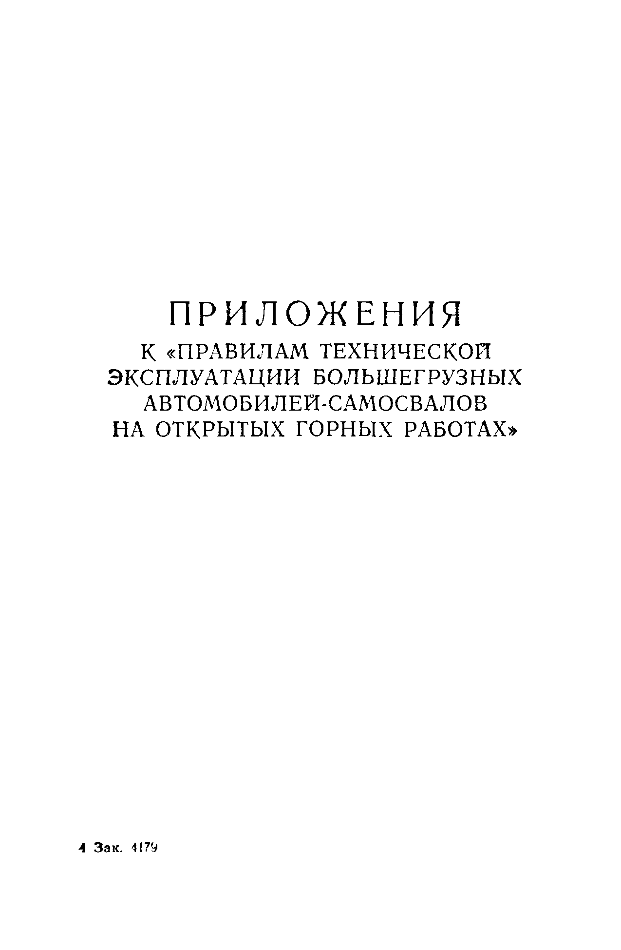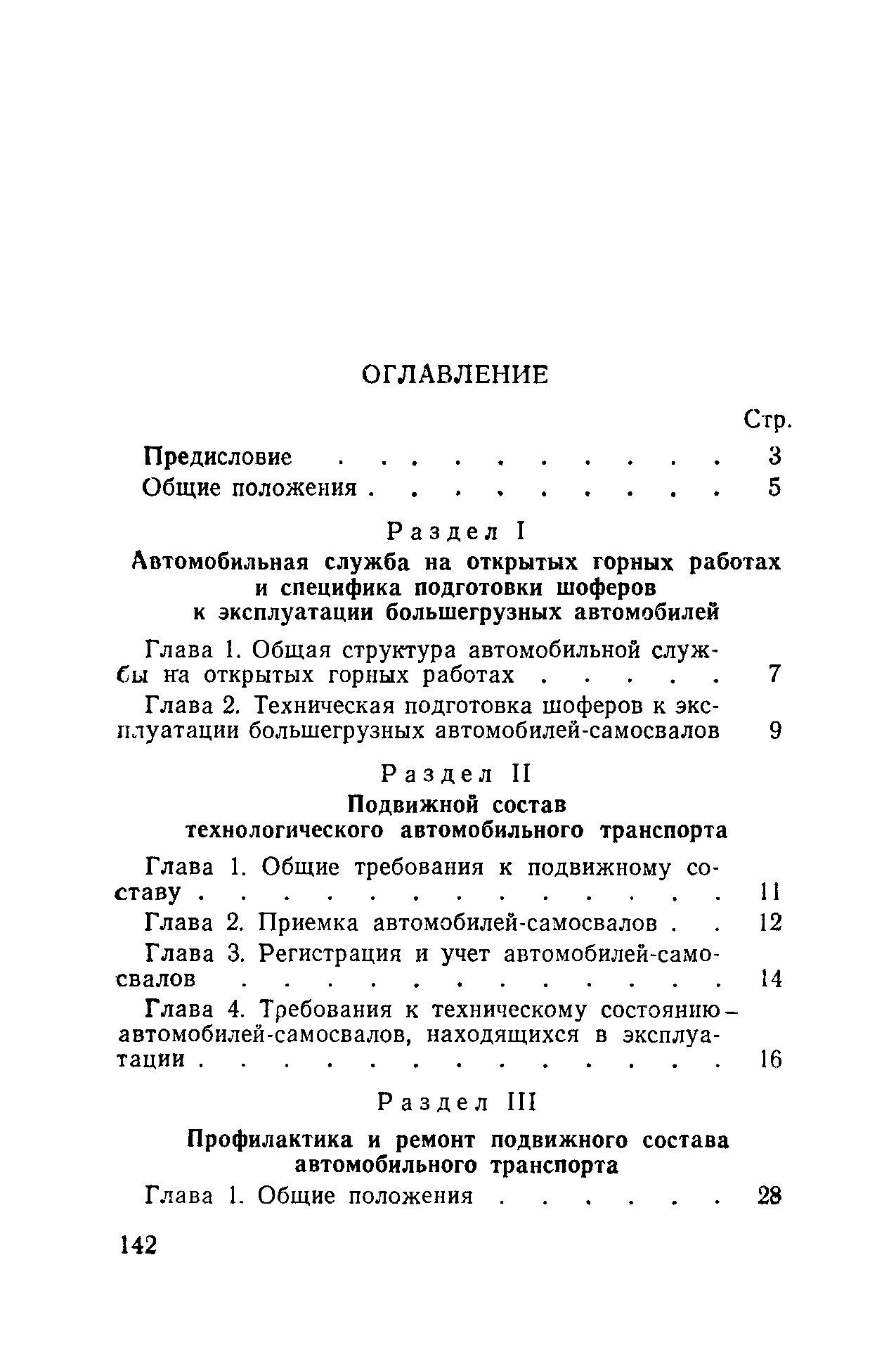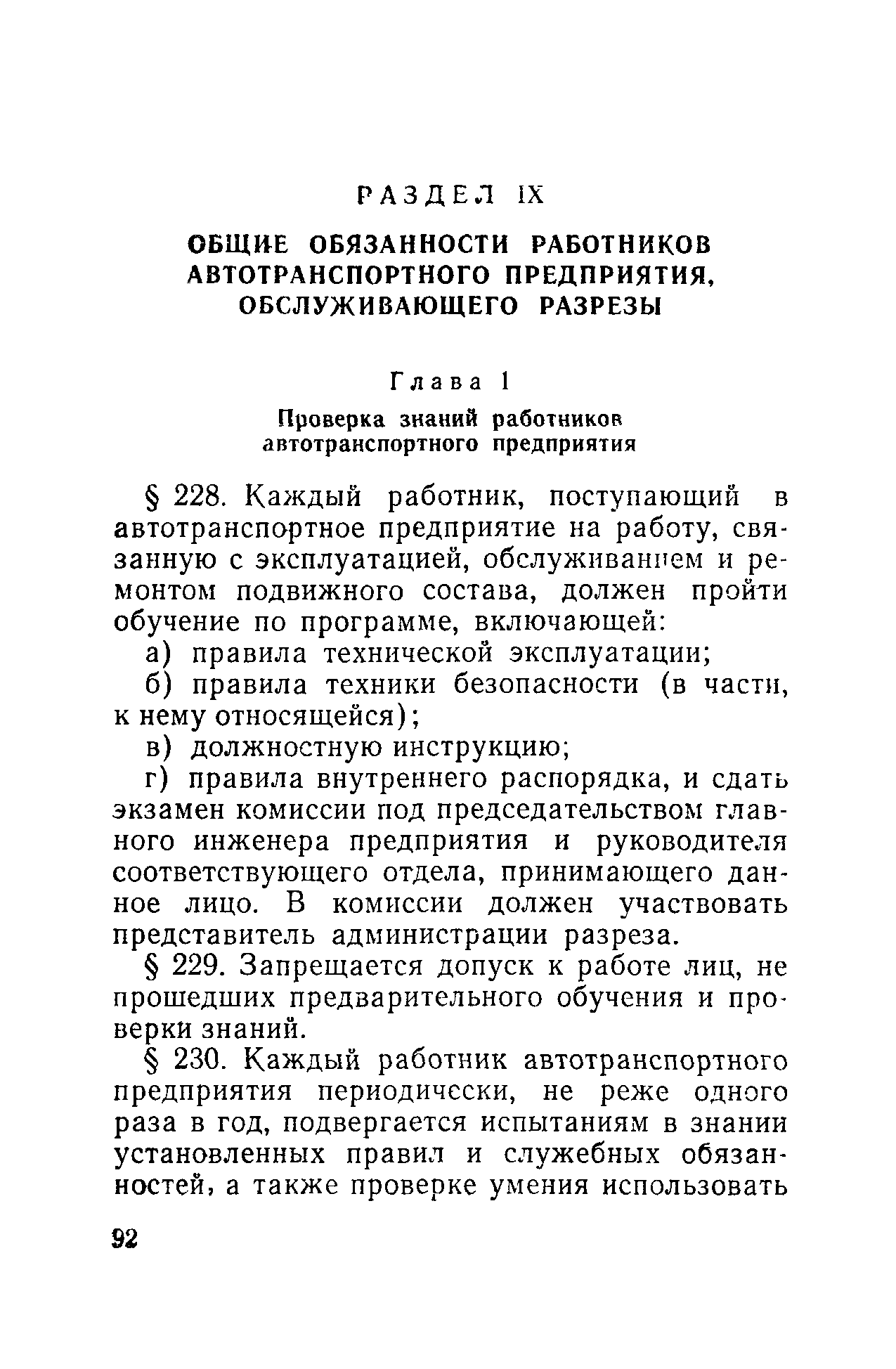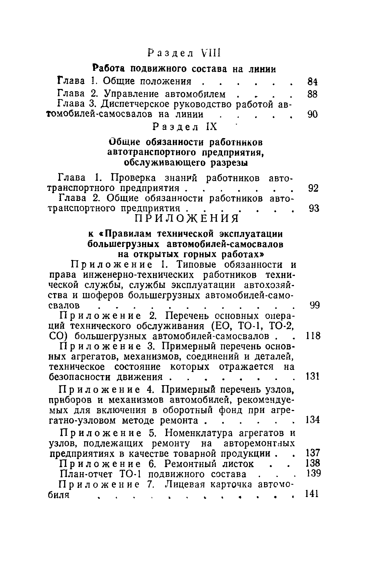д) основные обязанности работников автомобильного транспорта. | | Оглавление: | Общие положения Раздел I Автомобильная служба на открытых горных работах и специфика подготовки шоферов к эксплуатации большегрузных автомобилей Глава 1. Общая структура автомобильной службы па открытых горных работах Глава 2. Техническая подготовка шоферов к эксплуатации большегрузных автомобилей-самосвалов Раздел II Подвижной состав технологического автомобильного транспорта Глава 1. Общие требования к подвижному составу Глава 2. Приемка автомобилей-самосвалов Глава 3. Регистрация и учет автомобилей-самосвалов Глава 4. Требования к техническому состоянию автомобилей-самосвалов, находящихся в эксплуатации Раздел III Профилактика и ремонт подвижного состава автомобильного транспорта Глава 1. Общие положения Глава 2. Профилактика подвижного состава Глава 3. Ремонт подвижного состава Глава 4. Порядок сдачи в капитальный ремонт и приема из ремонта автомобилей и агрегатов Глава 5. Организация профилактики и ремонта в автотранспортных предприятиях Глава 6. Устранение неисправностей подвижного состава на линии . Раздел IV Эксплуатационные материалы, аккумуляторные батареи и шины Глава 1. Топливо и смазочные материалы Глава 2. Охлаждающие жидкости Глава 3. Аккумуляторные батареи Глава 4. Автомобильные шины Раздел V Особенности подготовки и эксплуатации автомобилей-самосвалов в зимних условиях Раздел VI Здания, сооружения и технические средства автотранспортного предприятия Глава 1. Общие положения Глава 2. Сооружения для хранения автомобилей-самосвалов Глава 3. Сооружения для технического обслуживания и ремонта автомобилей-самосвалов Глава 4. Складские помещения Глава 5. Сооружения для обслуживания личного состава Раздел VII Автомобильные дороги разрезов Глава 1. Общие положения Глава 2. Устройство и обслуживание автомобильных дорог на разрезах Глава 3. Погрузочно-разгрузочные пункты Раздел VIII Работа подвижного состава на линии Глава 1. Общие положения Глава 2. Управление автомобилем Глава 3. диспетчерское руководство работой автомобилей-самосвалов на линии Раздел IХ Общие обязанности работников автотранспортного предприятия, обслуживающего разрезы Глава 1. Проверка знаний работников автотранспортного предприятия Глава 2. Общие обязанности работников автотранспортного предприятии Приложение 1. Типовые обязанности и права инженерно-технических работников технической службы, службы эксплуатации автохозяйства и шоферов большегрузных автомобилей-самосвалов Приложение 2. Перечень основных операций технического обслуживания (ЕО, ТО-1, ТО-2, СО) большегрузных автомобилей-самосвалов . . Приложение 3. Примерный перечень основных агрегатов, механизмов, соединений и деталей, техническое состояние которых отражается на безопасности движения Приложение 4. Примерный перечень узлов, приборов и механизмов автомобилей, рекомендуемых для включения в оборотный фонд при агрегатно-узловом методе ремонта Приложение 5. Номенклатура агрегатов и узлов, подлежащих ремонту на авторемонтных предприятиях в качестве товарной продукции Приложение 6. Ремонтный листок Приложение 7. Лицевая карточка автомобиля | | Разработан: | НИИОГР