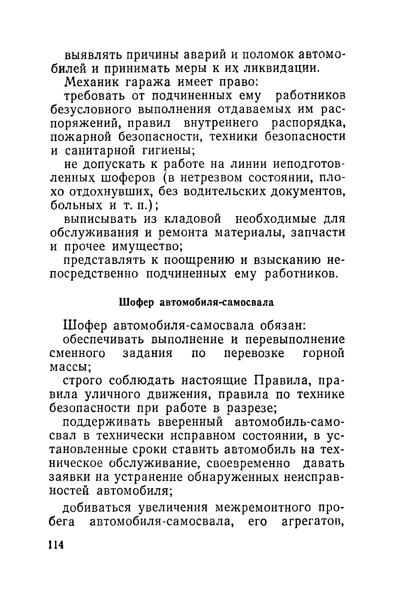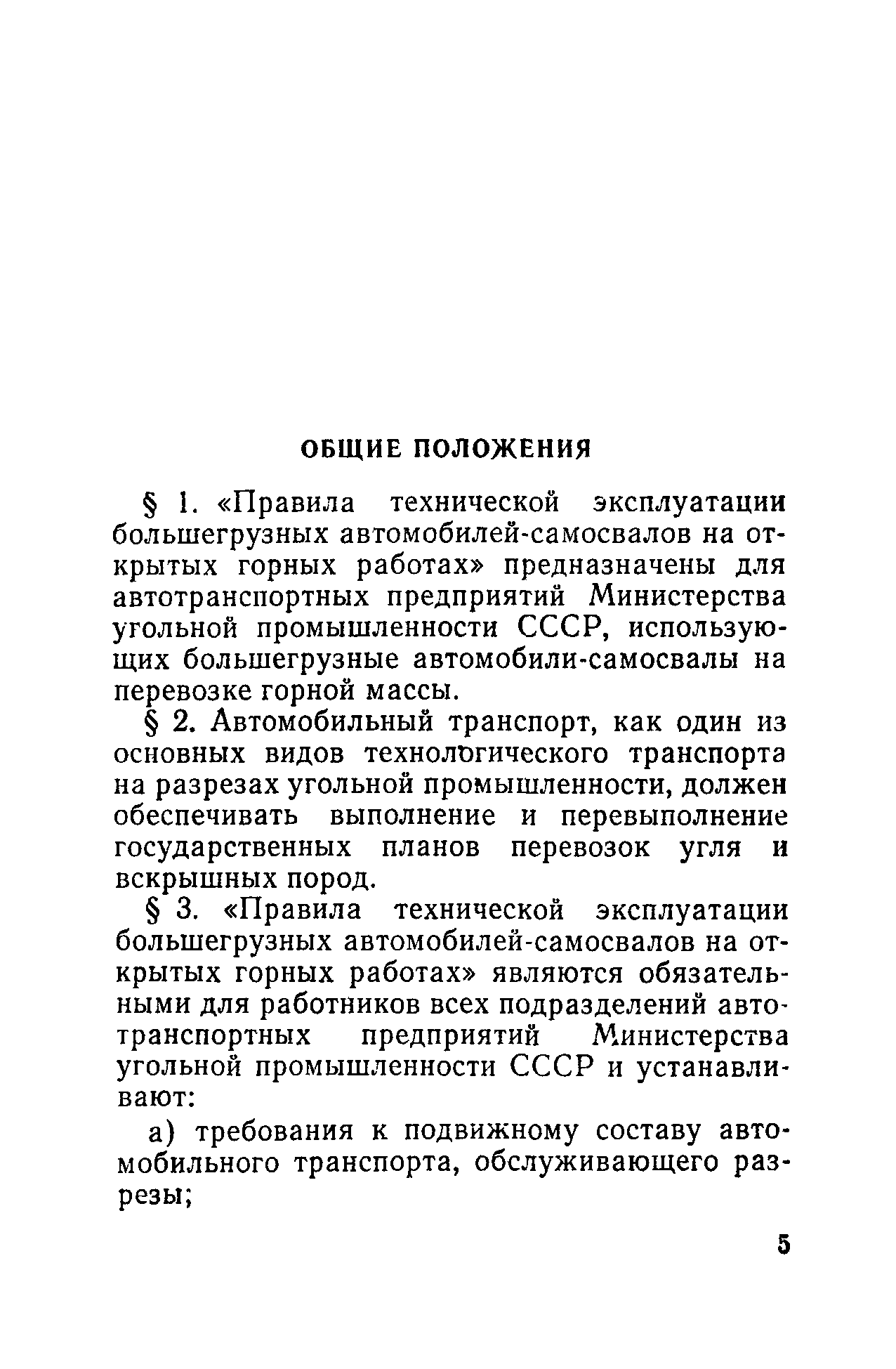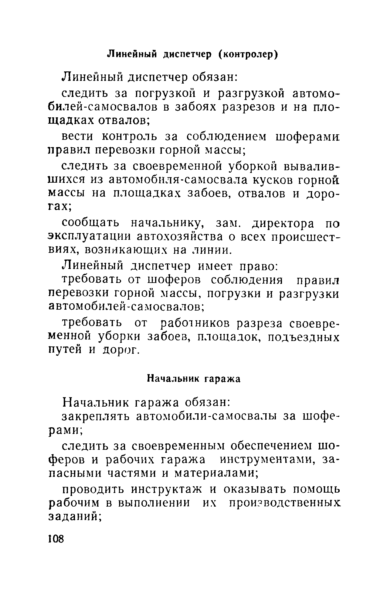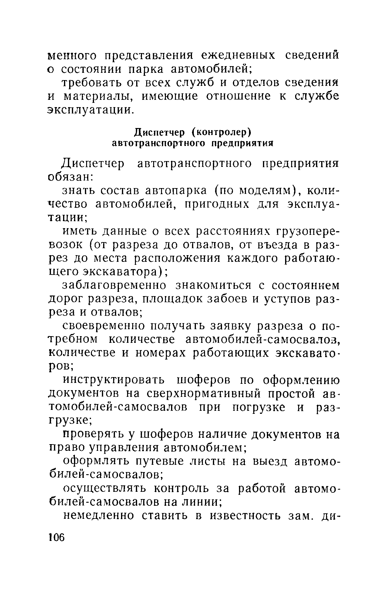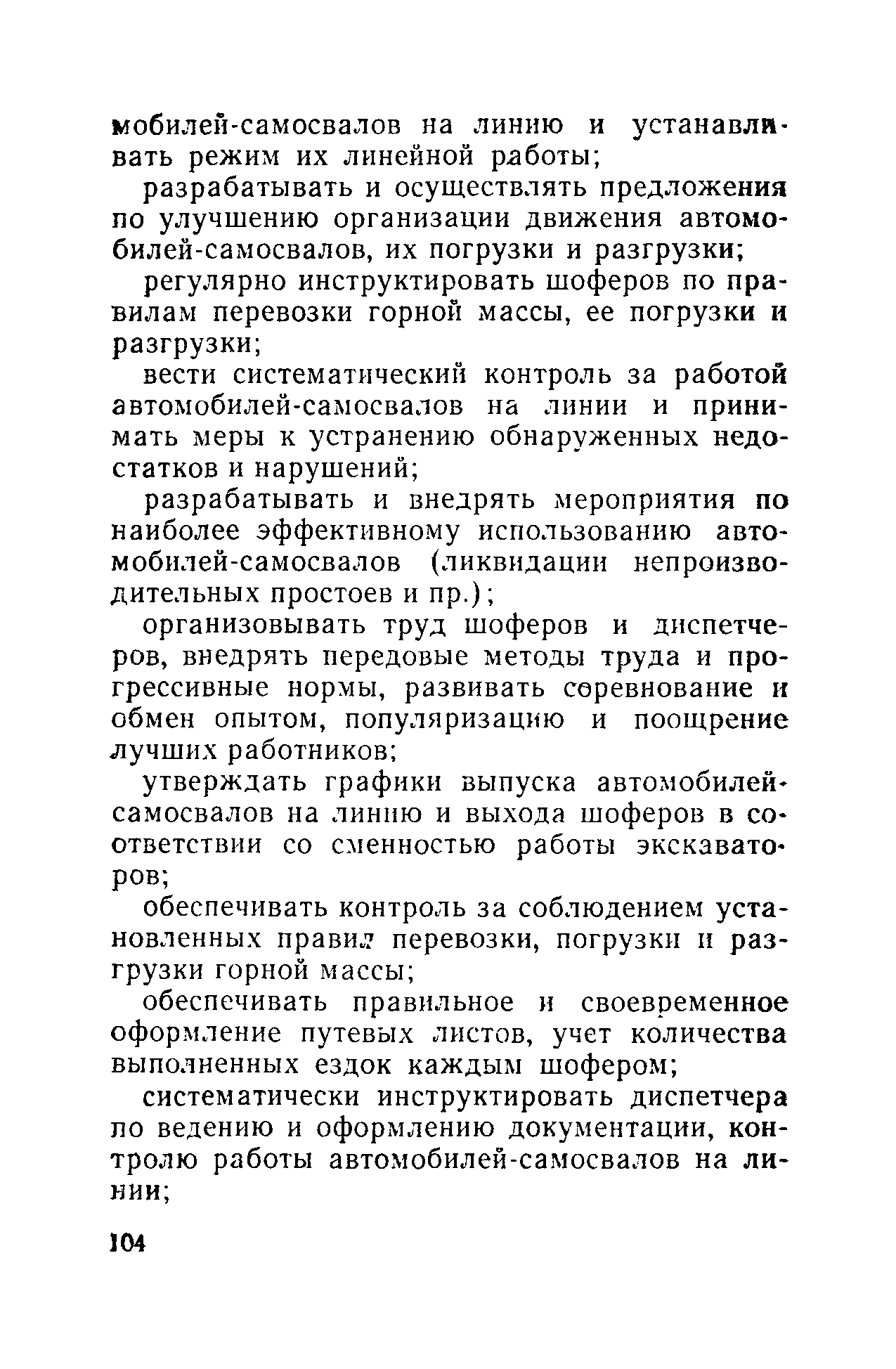 д) основные обязанности работников автомобильного транспорта. | | Оглавление: | Общие положения Раздел I Автомобильная служба на открытых горных работах и специфика подготовки шоферов к эксплуатации большегрузных автомобилей Глава 1. Общая структура автомобильной службы па открытых горных работах Глава 2. Техническая подготовка шоферов к эксплуатации большегрузных автомобилей-самосвалов Раздел II Подвижной состав технологического автомобильного транспорта Глава 1. Общие требования к подвижному составу Глава 2. Приемка автомобилей-самосвалов Глава 3. Регистрация и учет автомобилей-самосвалов Глава 4. Требования к техническому состоянию автомобилей-самосвалов, находящихся в эксплуатации Раздел III Профилактика и ремонт подвижного состава автомобильного транспорта Глава 1. Общие положения Глава 2. Профилактика подвижного состава Глава 3. Ремонт подвижного состава Глава 4. Порядок сдачи в капитальный ремонт и приема из ремонта автомобилей и агрегатов Глава 5. Организация профилактики и ремонта в автотранспортных предприятиях Глава 6. Устранение неисправностей подвижного состава на линии . Раздел IV Эксплуатационные материалы, аккумуляторные батареи и шины Глава 1. Топливо и смазочные материалы Глава 2. Охлаждающие жидкости Глава 3. Аккумуляторные батареи Глава 4. Автомобильные шины Раздел V Особенности подготовки и эксплуатации автомобилей-самосвалов в зимних условиях Раздел VI Здания, сооружения и технические средства автотранспортного предприятия Глава 1. Общие положения Глава 2. Сооружения для хранения автомобилей-самосвалов Глава 3. Сооружения для технического обслуживания и ремонта автомобилей-самосвалов Глава 4. Складские помещения Глава 5. Сооружения для обслуживания личного состава Раздел VII Автомобильные дороги разрезов Глава 1. Общие положения Глава 2. Устройство и обслуживание автомобильных дорог на разрезах Глава 3. Погрузочно-разгрузочные пункты Раздел VIII Работа подвижного состава на линии Глава 1. Общие положения Глава 2. Управление автомобилем Глава 3. диспетчерское руководство работой автомобилей-самосвалов на линии Раздел IХ Общие обязанности работников автотранспортного предприятия, обслуживающего разрезы Глава 1. Проверка знаний работников автотранспортного предприятия Глава 2. Общие обязанности работников автотранспортного предприятии Приложение 1. Типовые обязанности и права инженерно-технических работников технической службы, службы эксплуатации автохозяйства и шоферов большегрузных автомобилей-самосвалов Приложение 2. Перечень основных операций технического обслуживания (ЕО, ТО-1, ТО-2, СО) большегрузных автомобилей-самосвалов . . Приложение 3. Примерный перечень основных агрегатов, механизмов, соединений и деталей, техническое состояние которых отражается на безопасности движения Приложение 4. Примерный перечень узлов, приборов и механизмов автомобилей, рекомендуемых для включения в оборотный фонд при агрегатно-узловом методе ремонта Приложение 5. Номенклатура агрегатов и узлов, подлежащих ремонту на авторемонтных предприятиях в качестве товарной продукции Приложение 6. Ремонтный листок Приложение 7. Лицевая карточка автомобиля | | Разработан: | НИИОГР