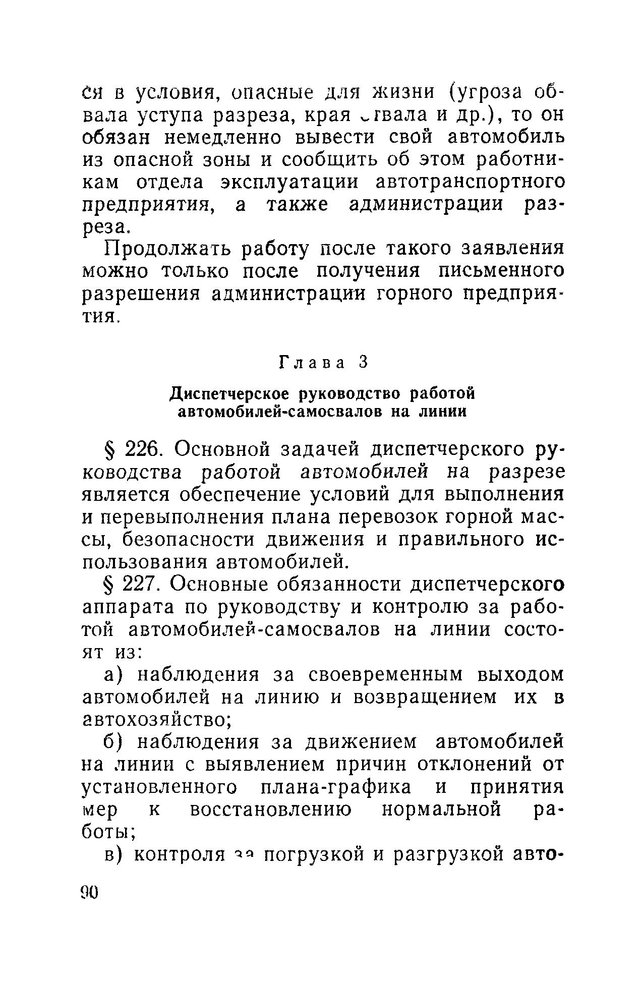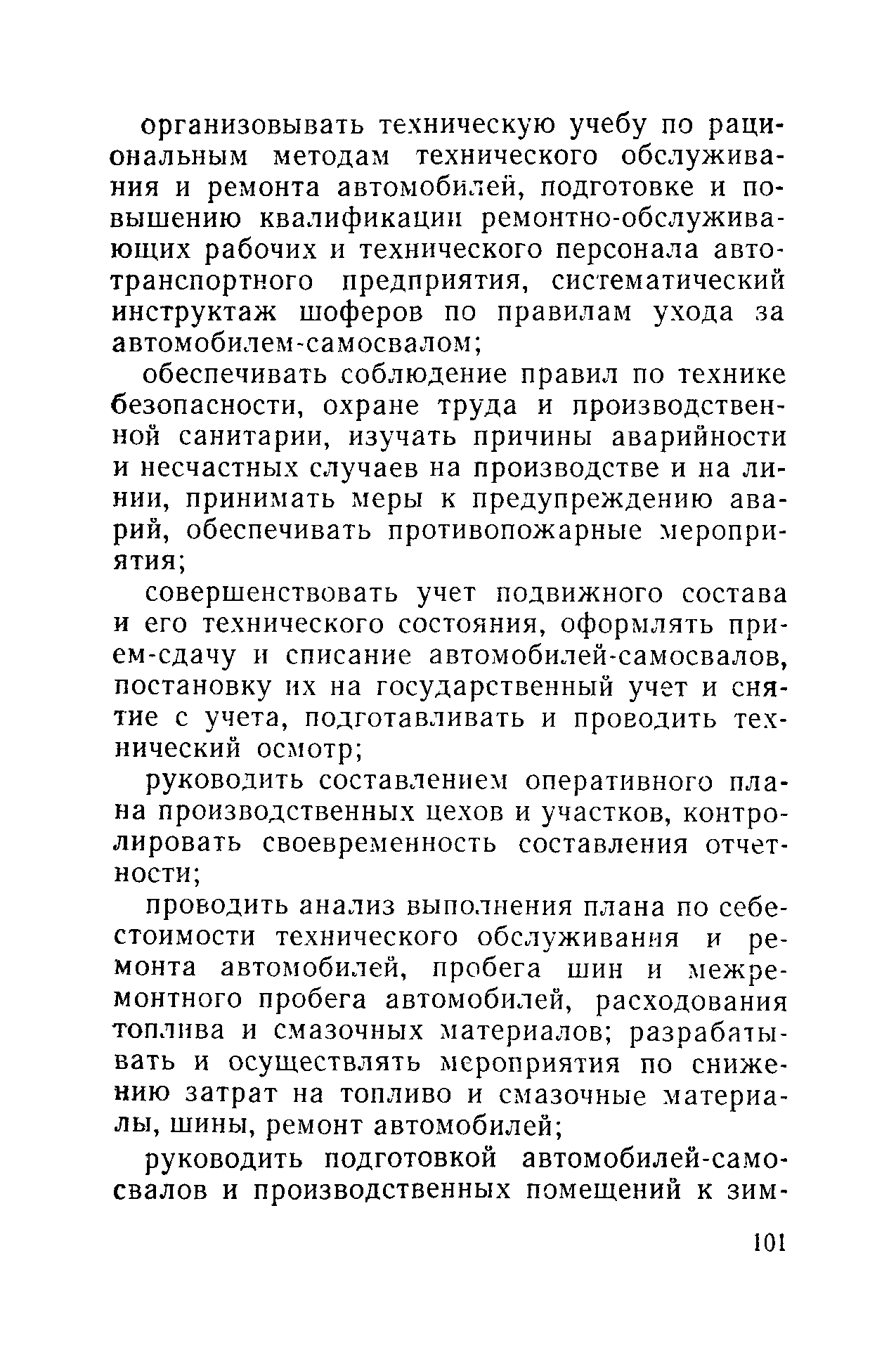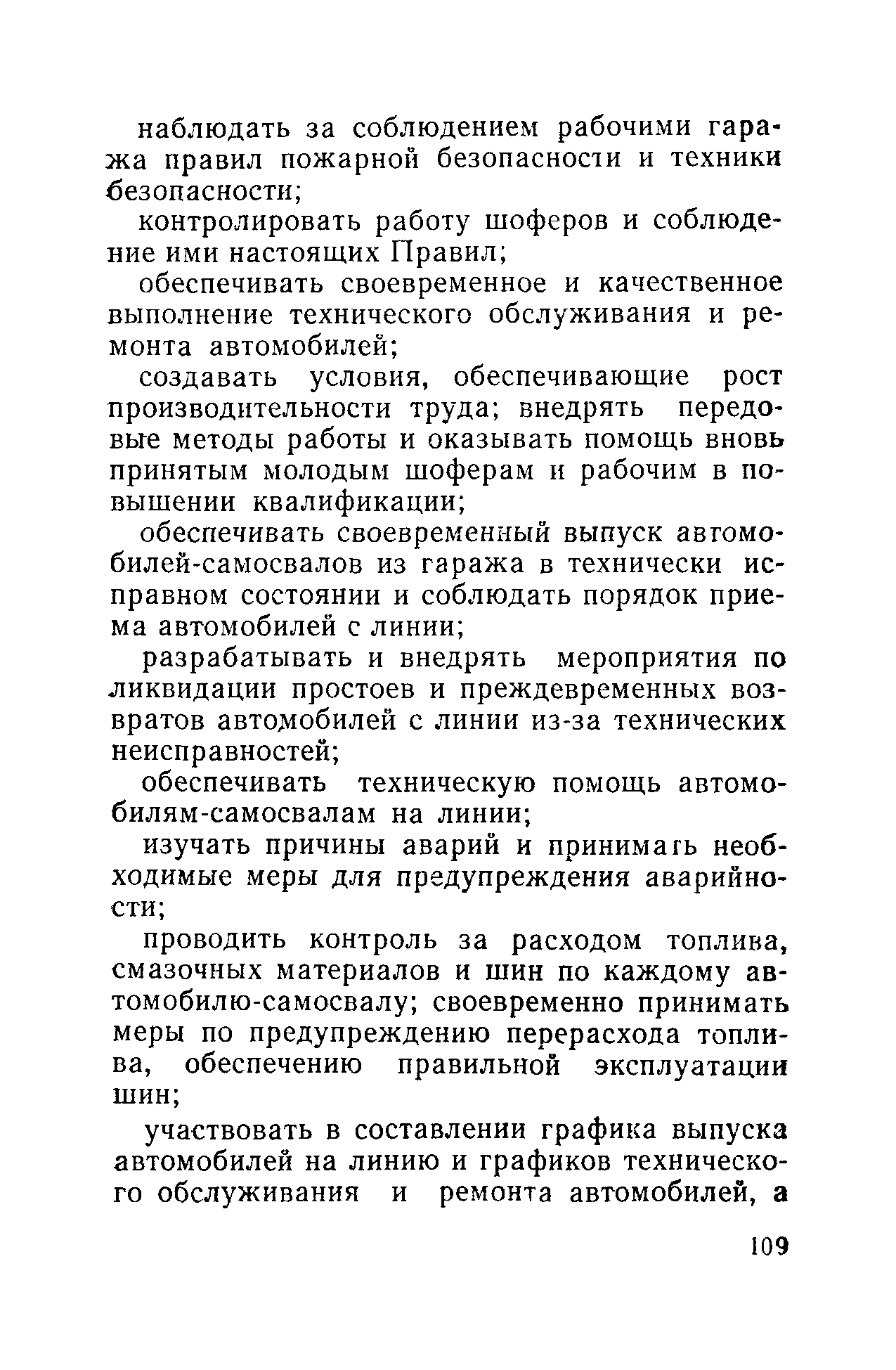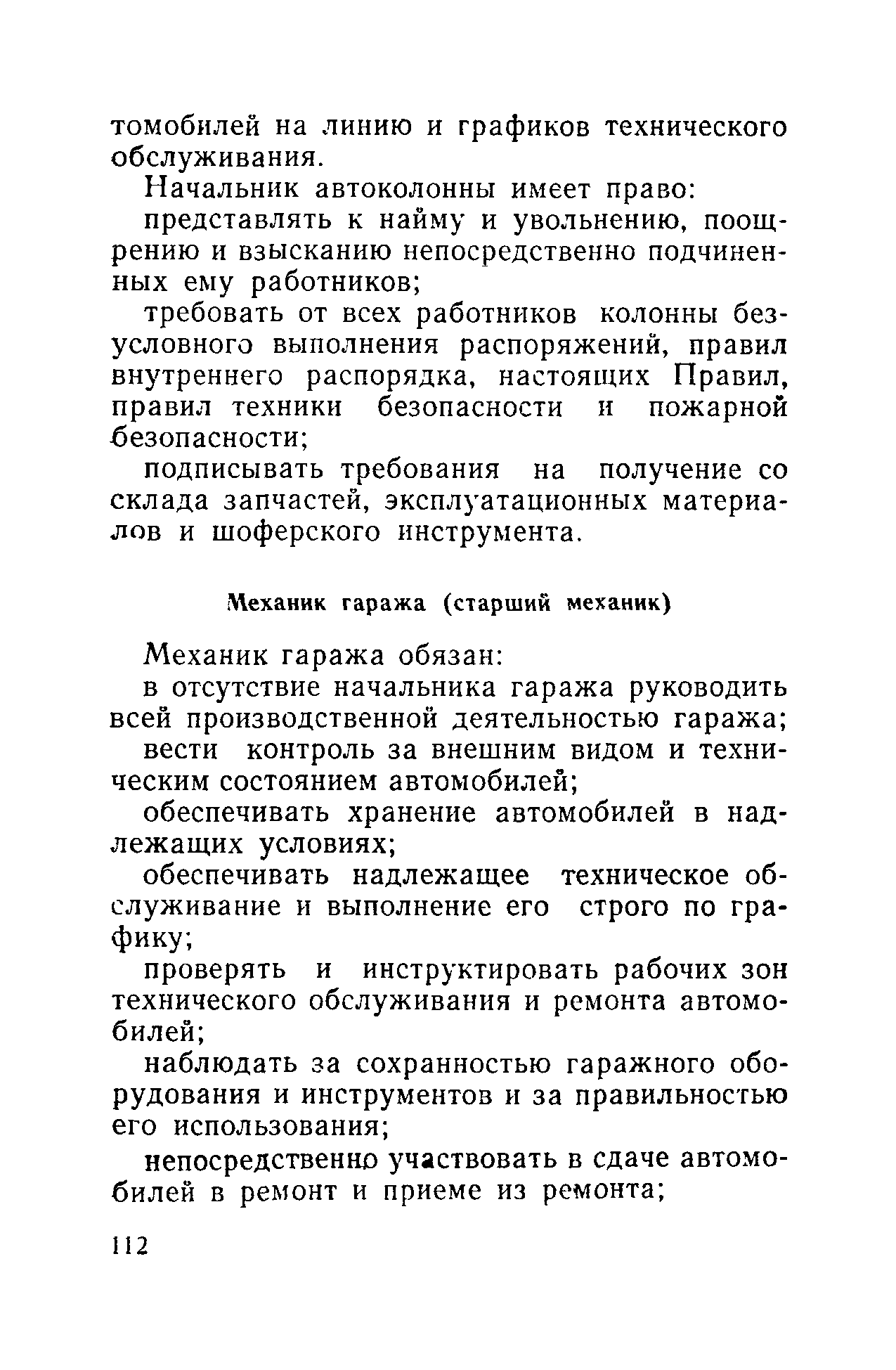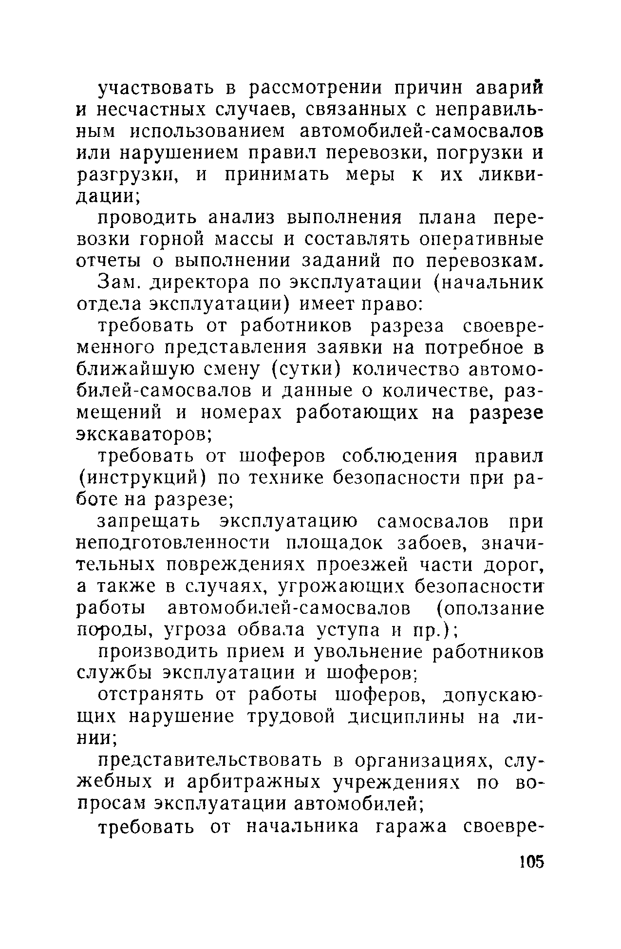 д) основные обязанности работников автомобильного транспорта. | | Оглавление: | Общие положения Раздел I Автомобильная служба на открытых горных работах и специфика подготовки шоферов к эксплуатации большегрузных автомобилей Глава 1. Общая структура автомобильной службы па открытых горных работах Глава 2. Техническая подготовка шоферов к эксплуатации большегрузных автомобилей-самосвалов Раздел II Подвижной состав технологического автомобильного транспорта Глава 1. Общие требования к подвижному составу Глава 2. Приемка автомобилей-самосвалов Глава 3. Регистрация и учет автомобилей-самосвалов Глава 4. Требования к техническому состоянию автомобилей-самосвалов, находящихся в эксплуатации Раздел III Профилактика и ремонт подвижного состава автомобильного транспорта Глава 1. Общие положения Глава 2. Профилактика подвижного состава Глава 3. Ремонт подвижного состава Глава 4. Порядок сдачи в капитальный ремонт и приема из ремонта автомобилей и агрегатов Глава 5. Организация профилактики и ремонта в автотранспортных предприятиях Глава 6. Устранение неисправностей подвижного состава на линии . Раздел IV Эксплуатационные материалы, аккумуляторные батареи и шины Глава 1. Топливо и смазочные материалы Глава 2. Охлаждающие жидкости Глава 3. Аккумуляторные батареи Глава 4. Автомобильные шины Раздел V Особенности подготовки и эксплуатации автомобилей-самосвалов в зимних условиях Раздел VI Здания, сооружения и технические средства автотранспортного предприятия Глава 1. Общие положения Глава 2. Сооружения для хранения автомобилей-самосвалов Глава 3. Сооружения для технического обслуживания и ремонта автомобилей-самосвалов Глава 4. Складские помещения Глава 5. Сооружения для обслуживания личного состава Раздел VII Автомобильные дороги разрезов Глава 1. Общие положения Глава 2. Устройство и обслуживание автомобильных дорог на разрезах Глава 3. Погрузочно-разгрузочные пункты Раздел VIII Работа подвижного состава на линии Глава 1. Общие положения Глава 2. Управление автомобилем Глава 3. диспетчерское руководство работой автомобилей-самосвалов на линии Раздел IХ Общие обязанности работников автотранспортного предприятия, обслуживающего разрезы Глава 1. Проверка знаний работников автотранспортного предприятия Глава 2. Общие обязанности работников автотранспортного предприятии Приложение 1. Типовые обязанности и права инженерно-технических работников технической службы, службы эксплуатации автохозяйства и шоферов большегрузных автомобилей-самосвалов Приложение 2. Перечень основных операций технического обслуживания (ЕО, ТО-1, ТО-2, СО) большегрузных автомобилей-самосвалов . . Приложение 3. Примерный перечень основных агрегатов, механизмов, соединений и деталей, техническое состояние которых отражается на безопасности движения Приложение 4. Примерный перечень узлов, приборов и механизмов автомобилей, рекомендуемых для включения в оборотный фонд при агрегатно-узловом методе ремонта Приложение 5. Номенклатура агрегатов и узлов, подлежащих ремонту на авторемонтных предприятиях в качестве товарной продукции Приложение 6. Ремонтный листок Приложение 7. Лицевая карточка автомобиля | | Разработан: | НИИОГР