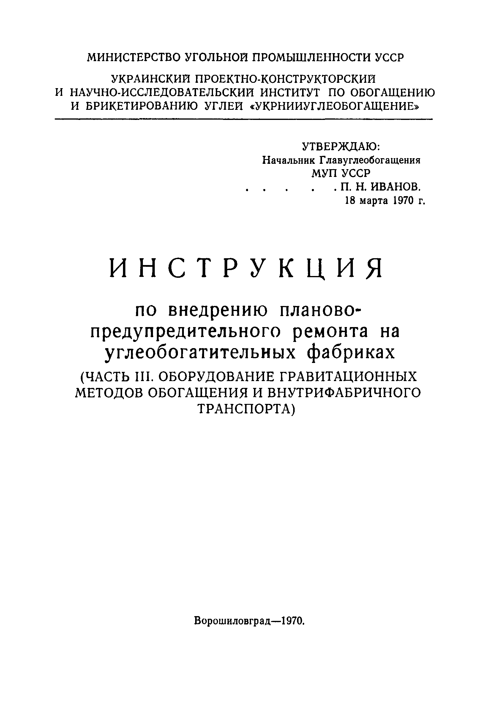 | Название рус.: | Инструкция по внедрению планово-предупредительного ремонта на углеобогатительных фабриках. Часть III. Оборудование гравитационных методов обогащения и внутрифабричного транспорта |