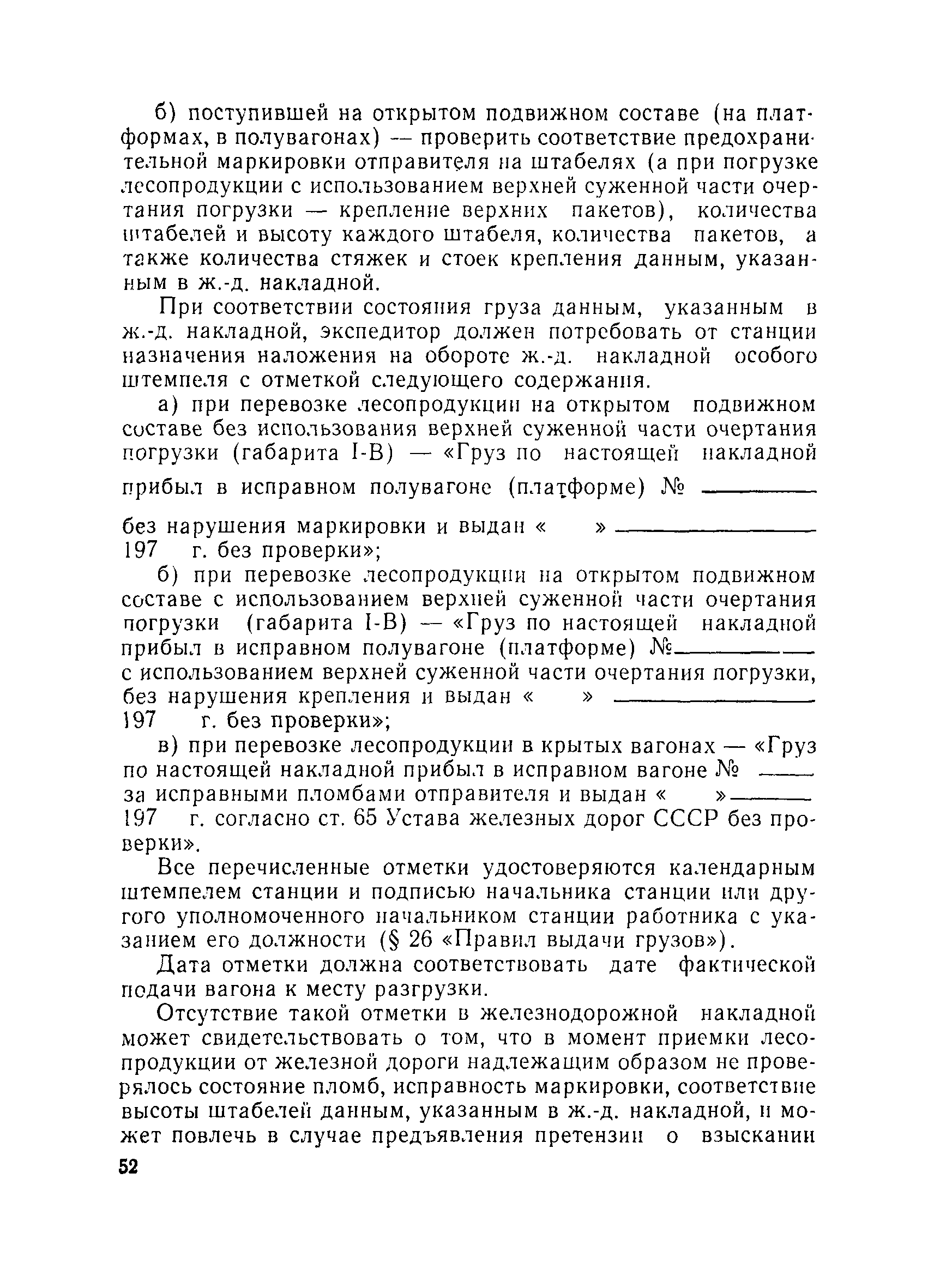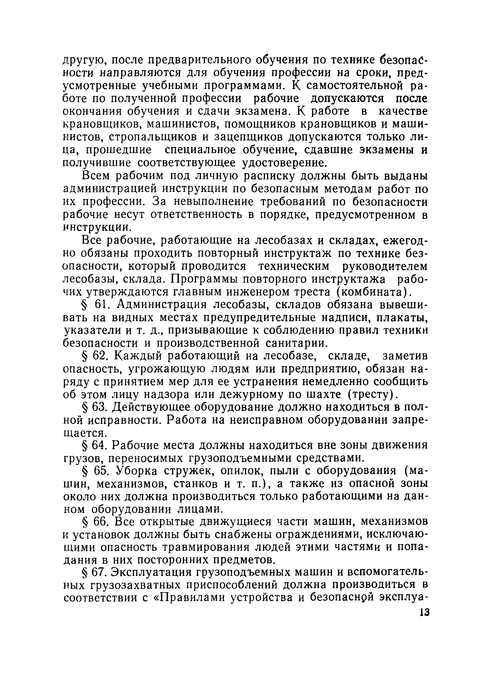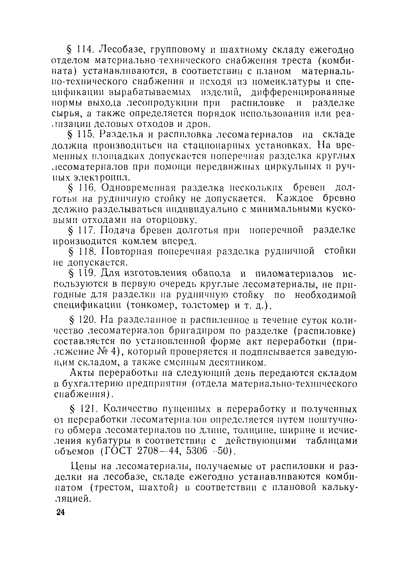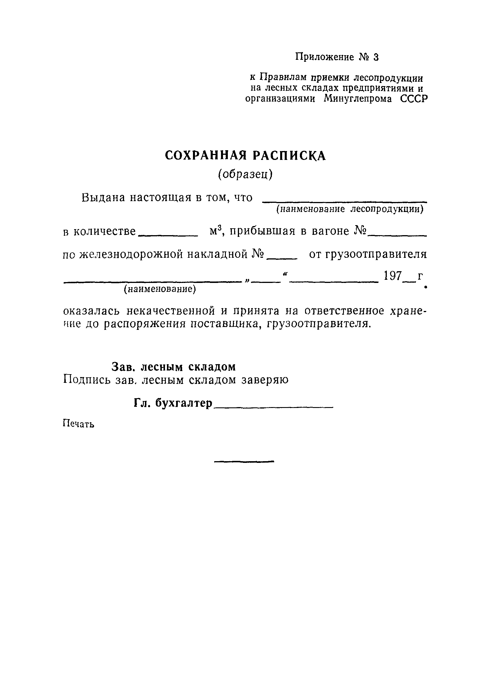 | Оглавление: | Общие положения Организация лесобаз и складов крепежных материалов Благоустройство и санитария Противопожарные мероприятия и режим Техника безопасности Приемка материалов Приемка и возврат увязочных реквизитов Организация работ по выполнению производственных процессе выгрузка материалов разделка и распиловка лесоматериалов укладка и хранение материалов погрузка крепежных материалов производственные запасы Отпуск материалов со склада Учет и отчетность Приложение 1. Нормы искусственного освещения территории лесобазы, склада и мест работы под открытым небом Приложение 2. Таблица противопожарных разрывов Приложение 3. Форма акта о приемке крепежных материалов Приложение 4. Форма акта переработки лесных материалов Приложение 5. Форма лимитно-заборной карточки на получение со склада крепежных материалов Приложение 6. Образец требования на отпуск материалов Приложение 7. Форма реестра регистрации лимитных карточек Приложение 8. Образец сигнального требования на сверхлимитный отпуск материалов Приложение 9. Форма журнала учета поступающих грузов на лесобазу, склад Приложение 10. Образец карточки количественного складского учета материалов Приложение 11. Правила приемки вагонов с лесопродукцией от железной дороги Правила приемки лесопродукции на лесных складах |