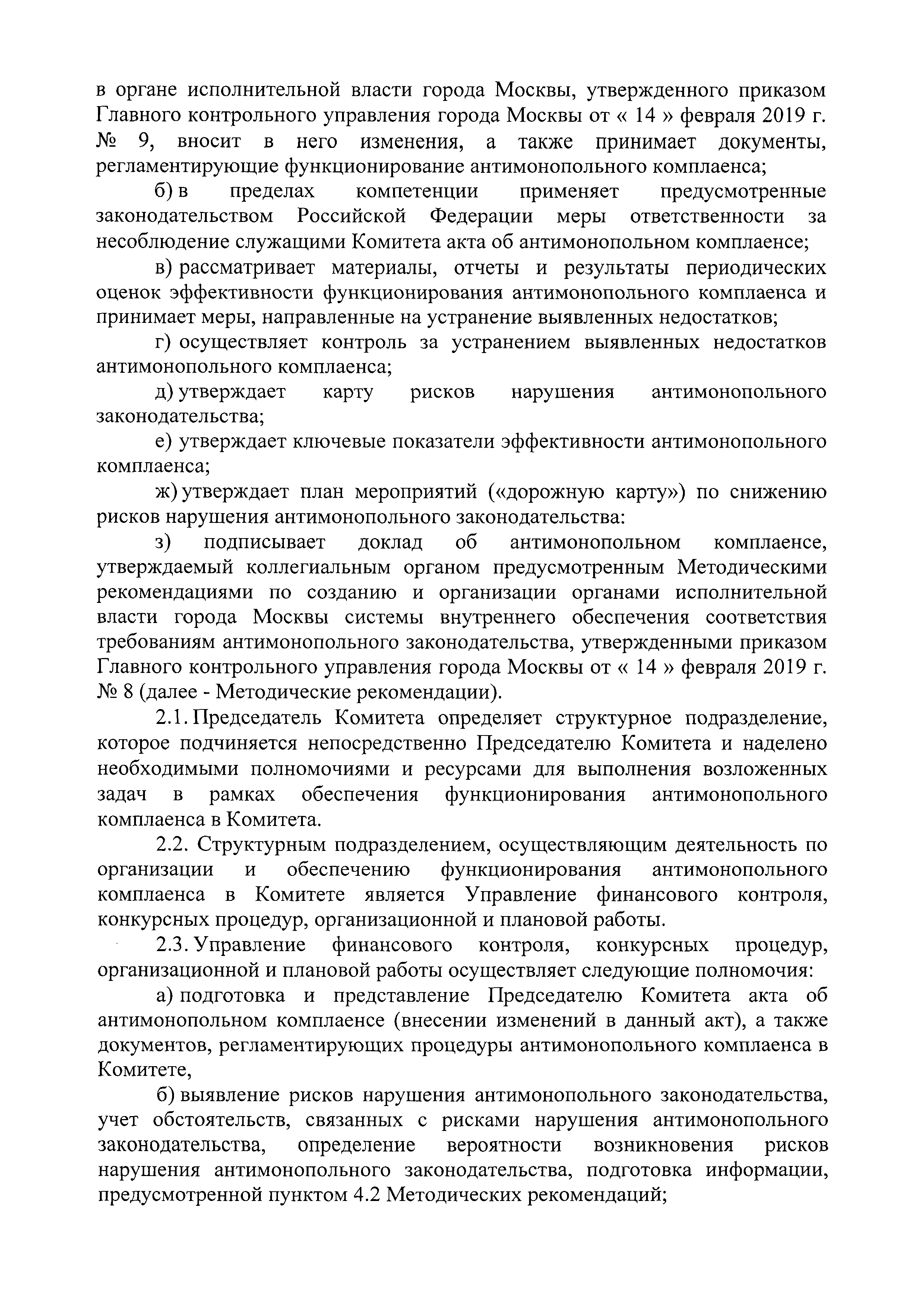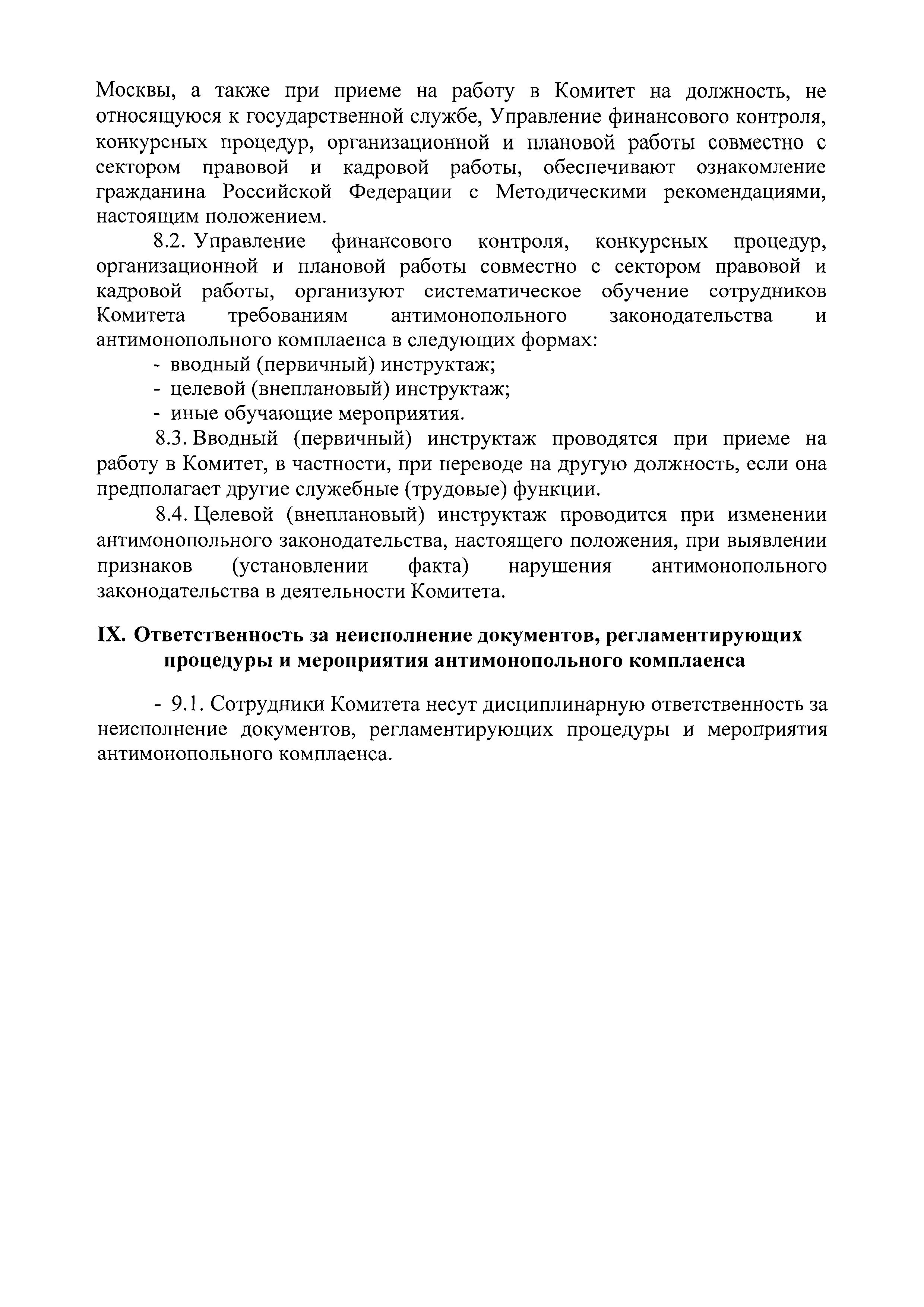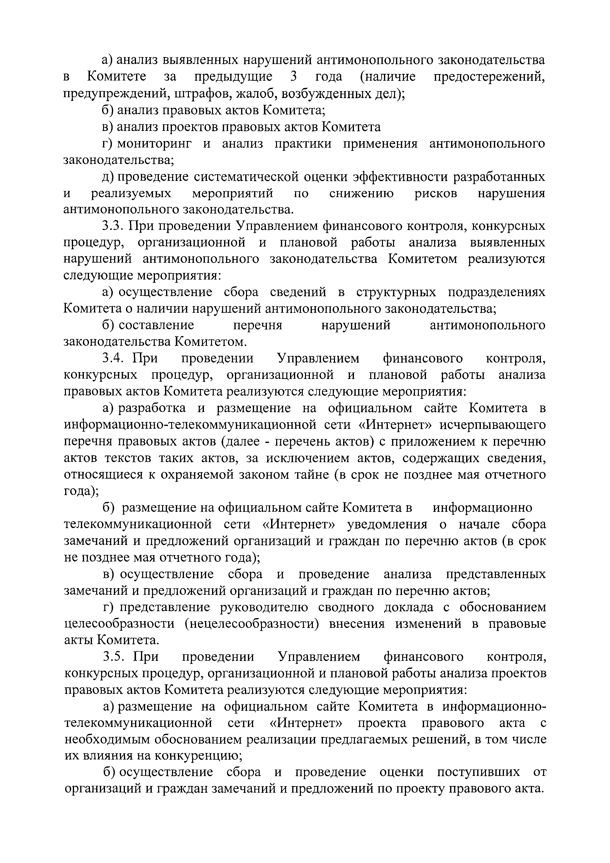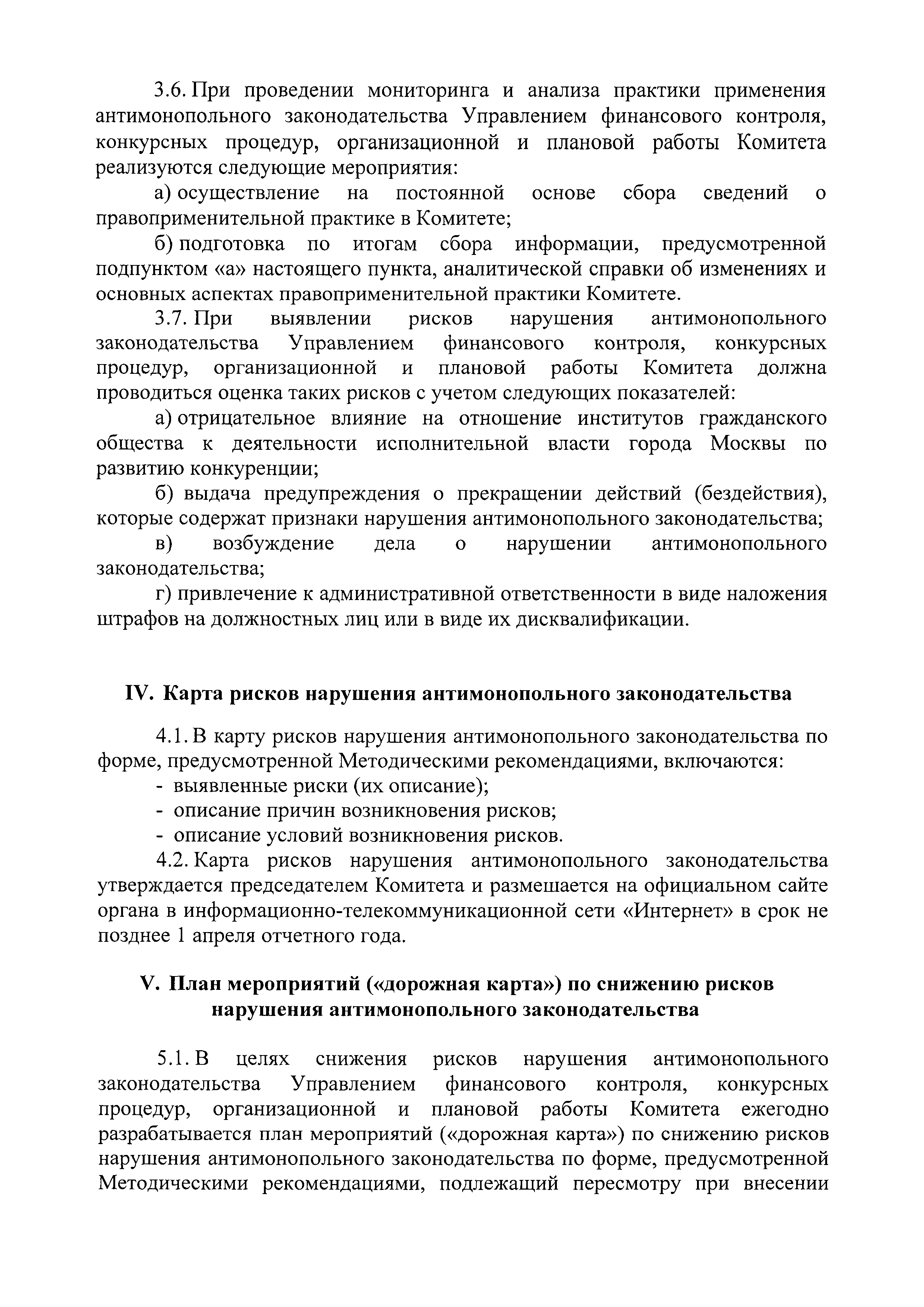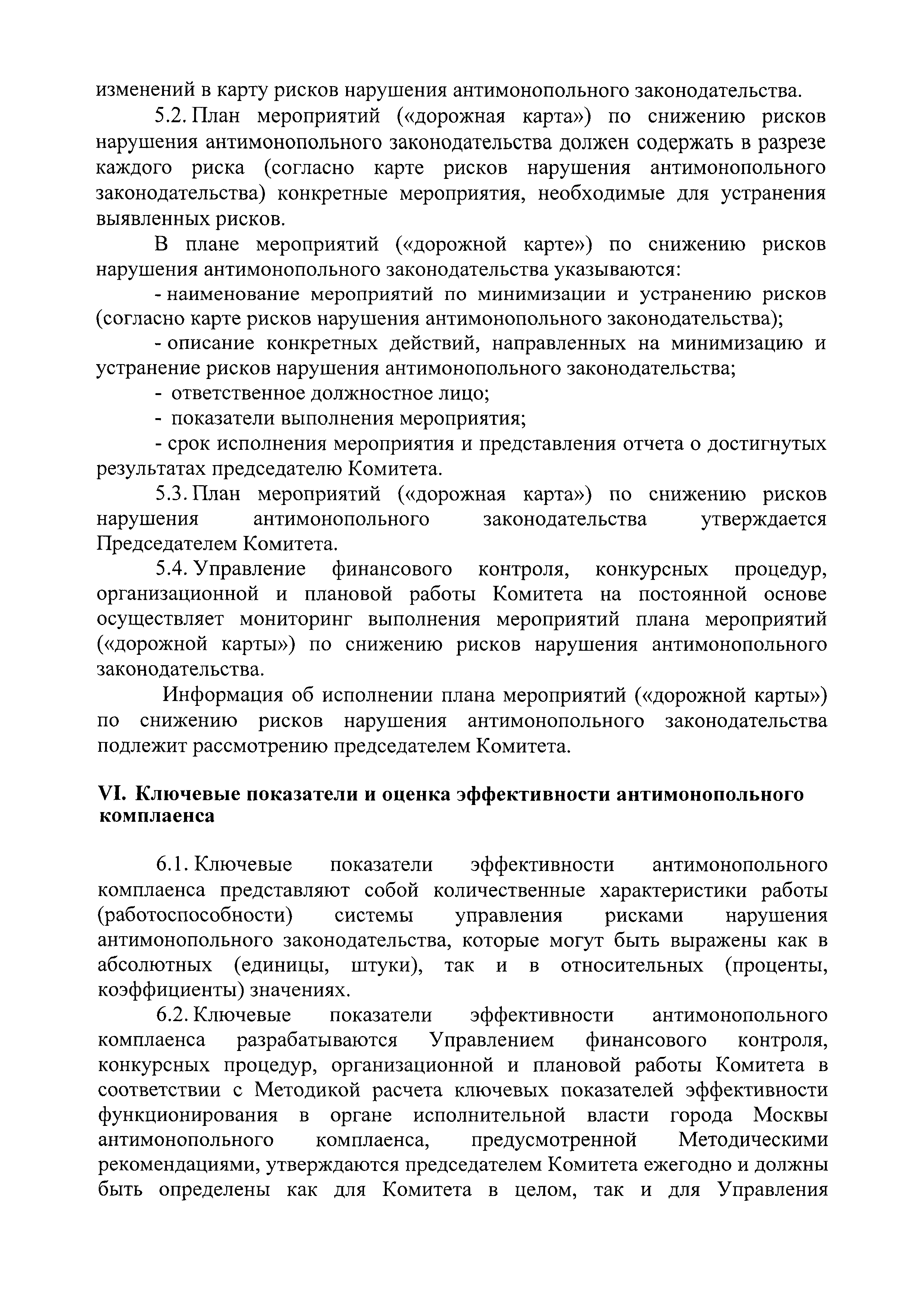 | Оглавление: | I. Цели, задачи и принципы антимонопольного комплаенса II. Структурное подразделение, ответственное за организацию и функционирование антимонопольного комплаенса в Комитете III. Выявление и оценка рисков нарушения антимонопольного законодательства в деятельности Комитета IV. Карта рисков нарушения антимонопольного законодательства V. План мероприятий ("дорожная карта") по снижению рисков нарушения антимонопольного законодательства VI. Ключевые показатели и оценка эффективности антимонопольного комплаенса VII. Доклад об антимонопольном комплаенсе VIII. Ознакомление должностных лиц Комитета с антимонопольным комплаенсом и обучение требованиям антимонопольного законодательства и антимонопольного комплаенса IX. Ответственность за неисполнение документов, регламентирующих процедуры и мероприятия антимонопольного комплаенса |