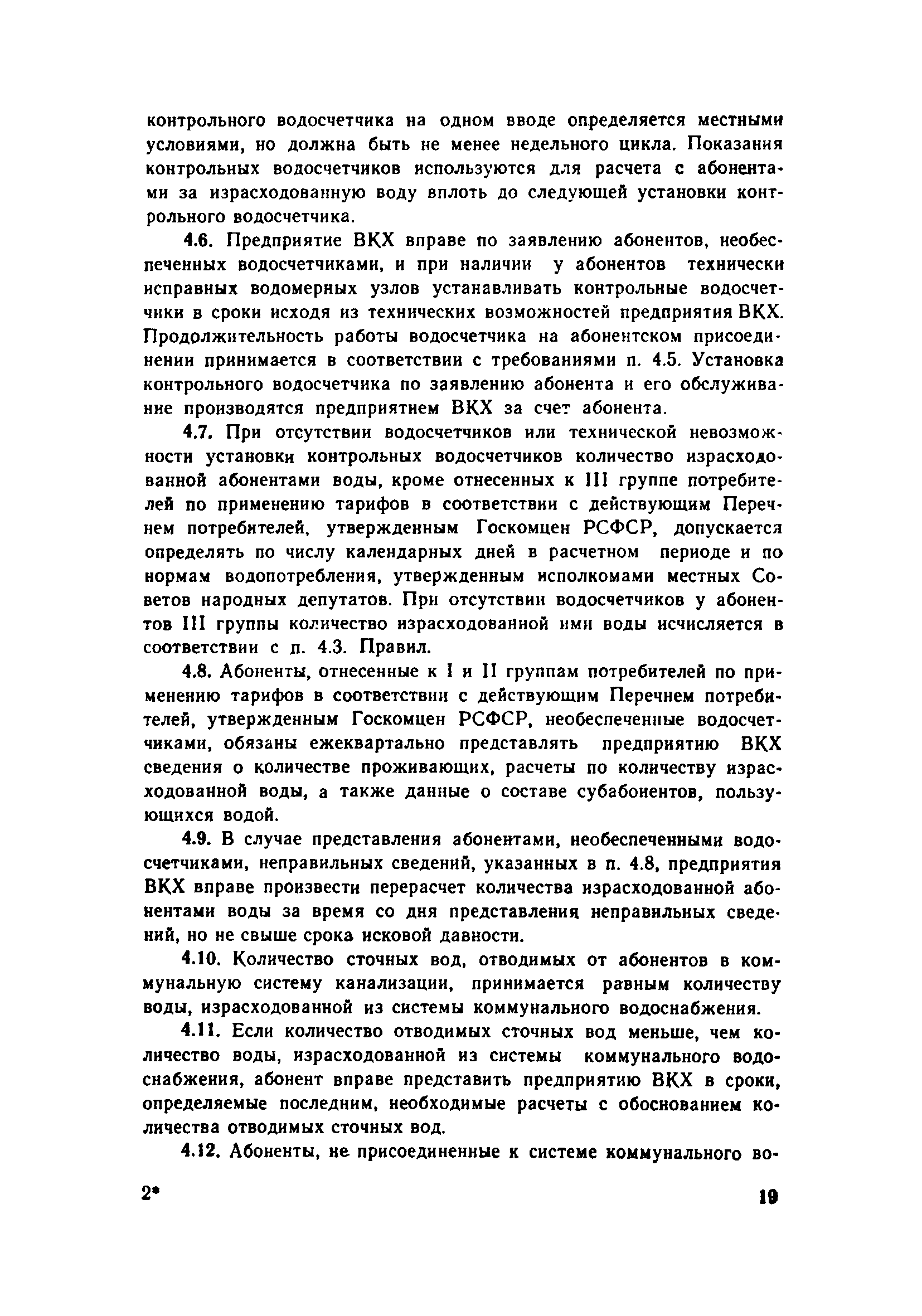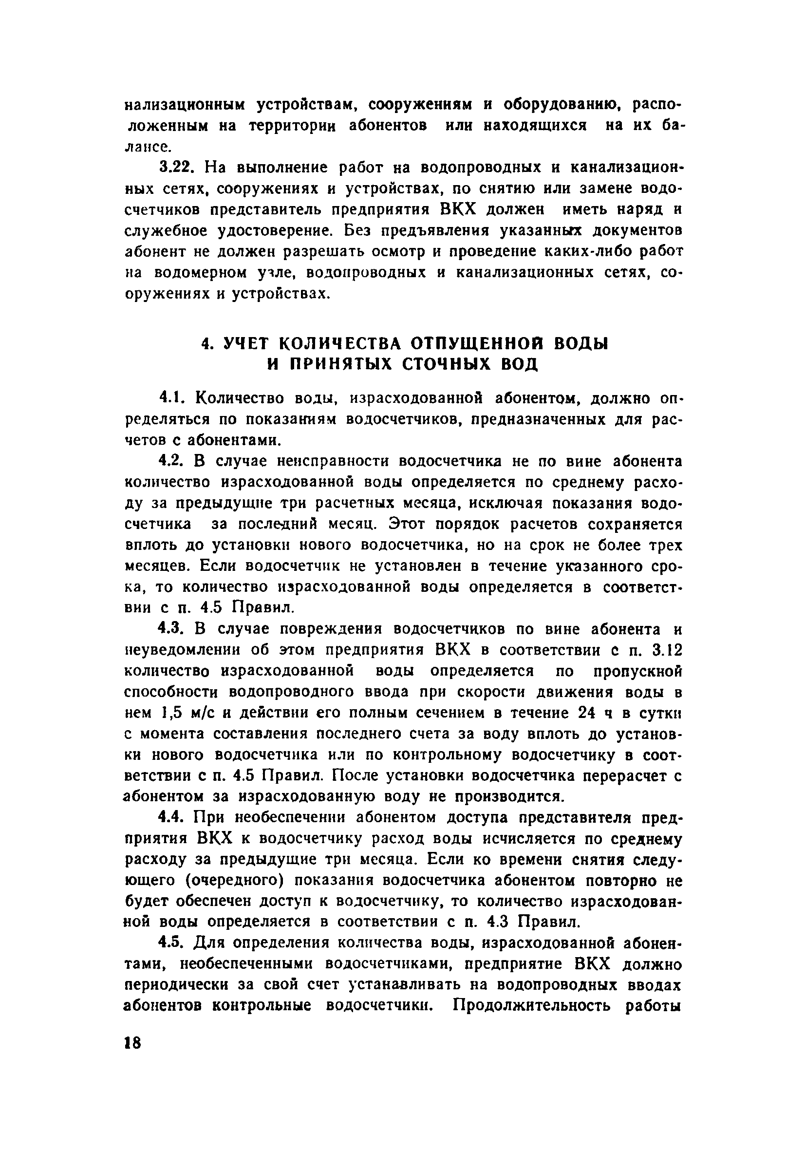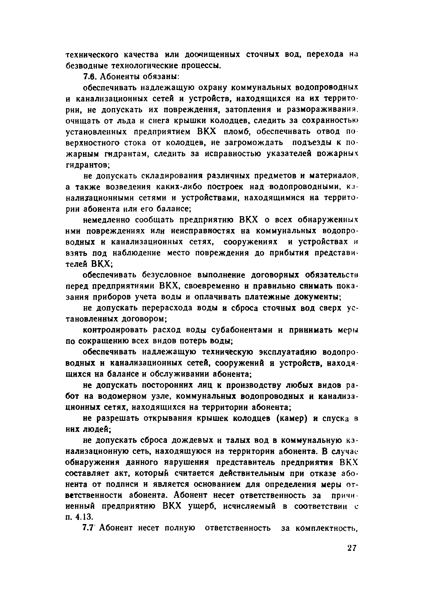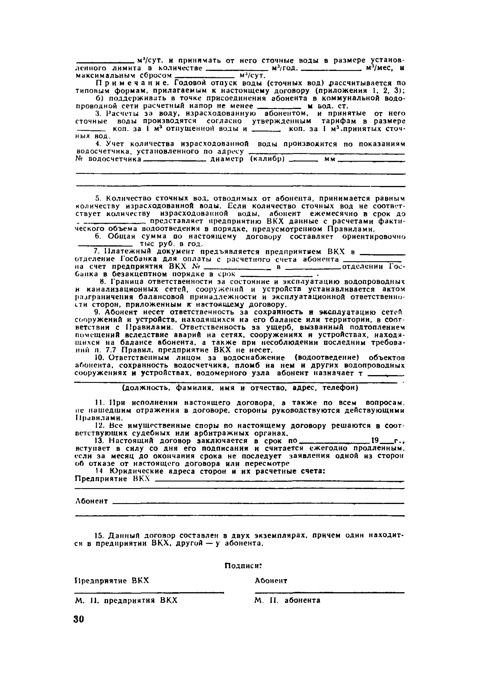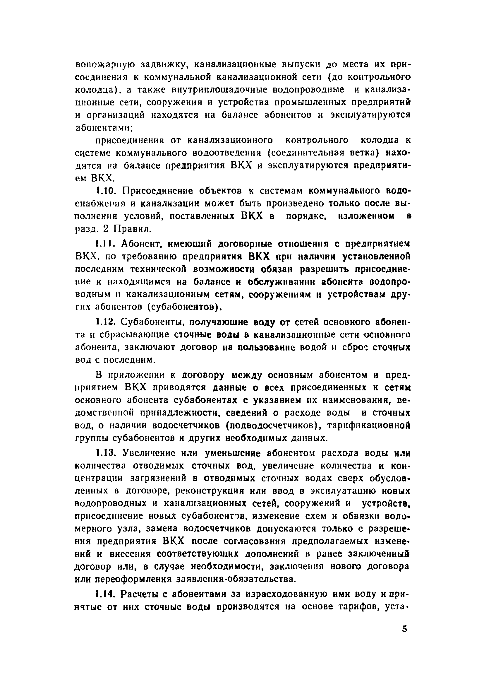 | Оглавление: | 1. Общие положения 2. Порядок присоединения объектов к системам коммунального водоснабжения и канализации 3. Установка и эксплуатация приборов ДЛУ учета отпущенной воды и принятых сточных вод 4. Учет количества отпущенной воды и принятых сточных вод 5. Расчеты за пользование водой и прием сточных вод 6. Условия прекращения подачи воды и приема сточных вод 7. Ответственность предприятия ВКХ и абонентов Приложение 1 Типовой договор на отпуск воды и прием сточных вод Приложение 2 Заявление-обязательство |