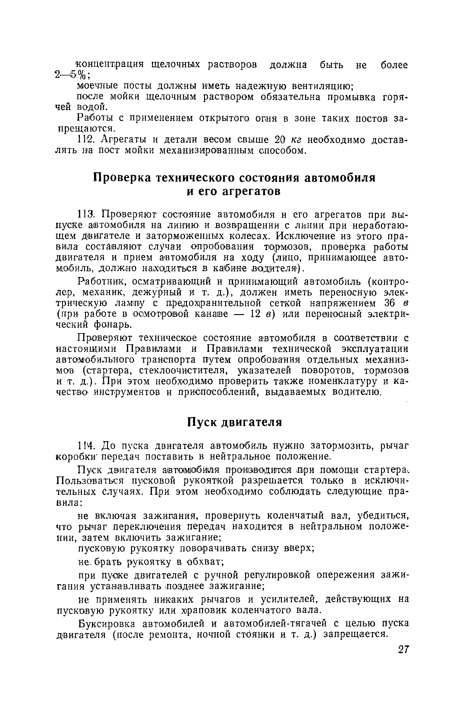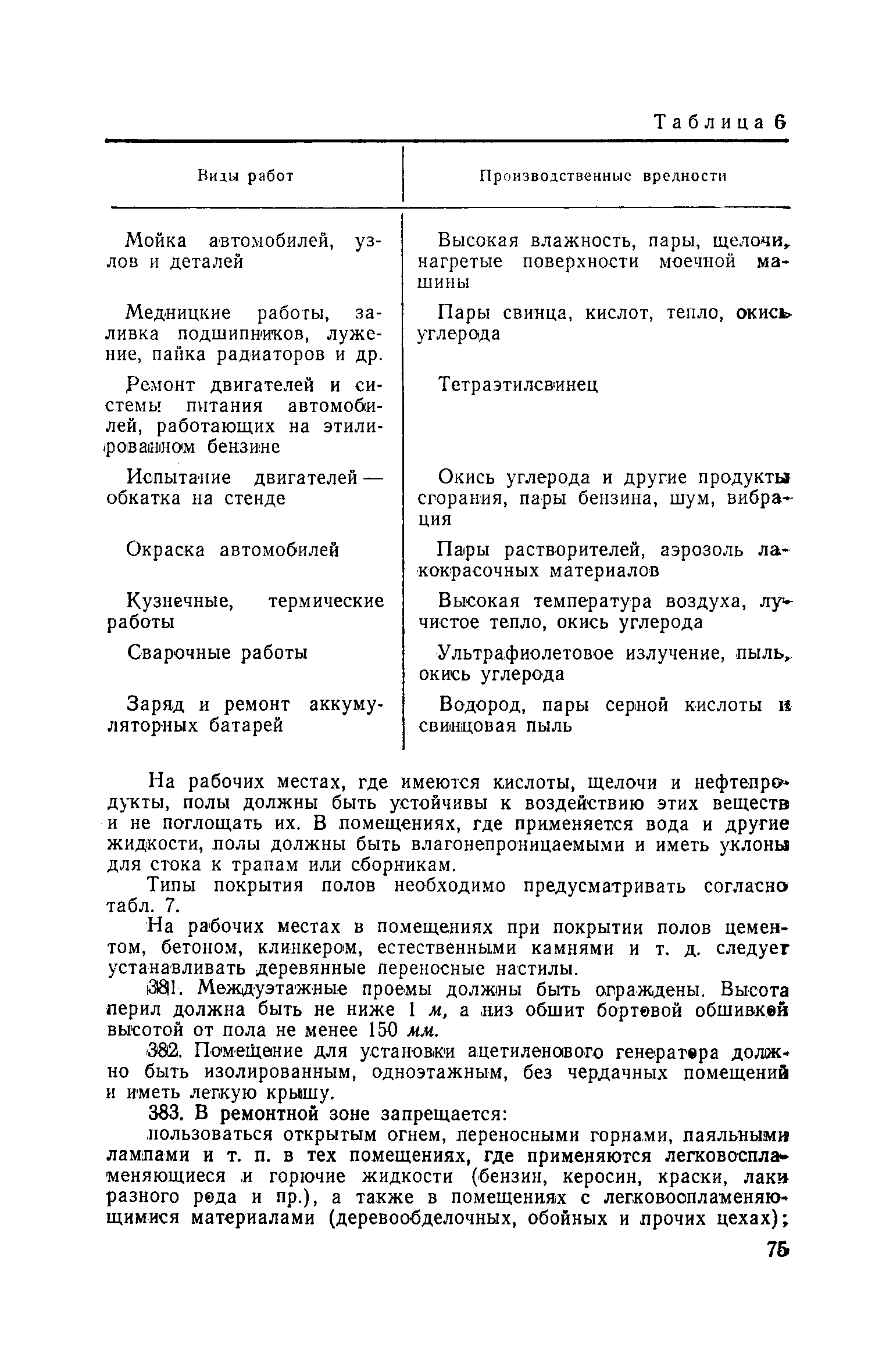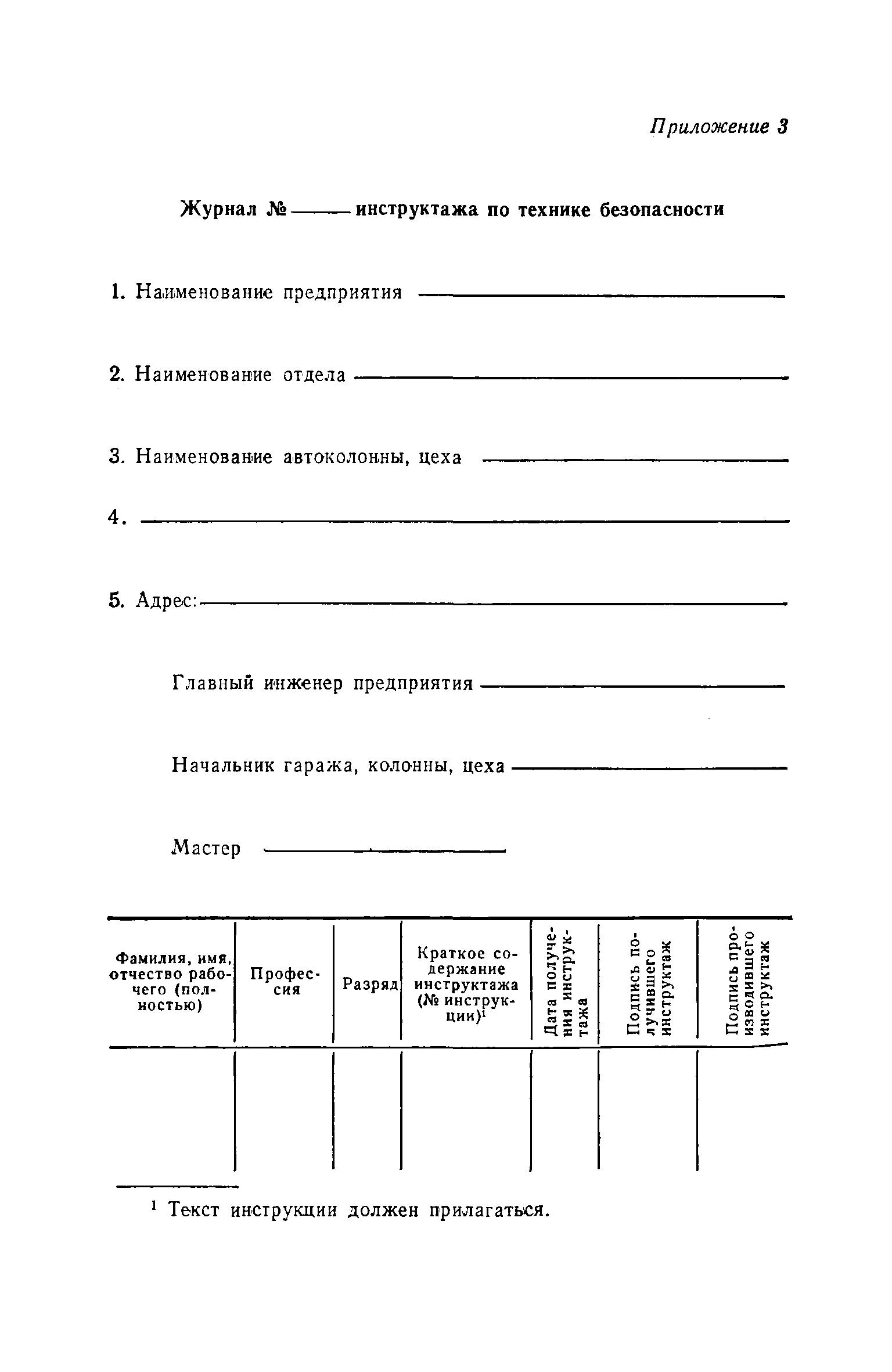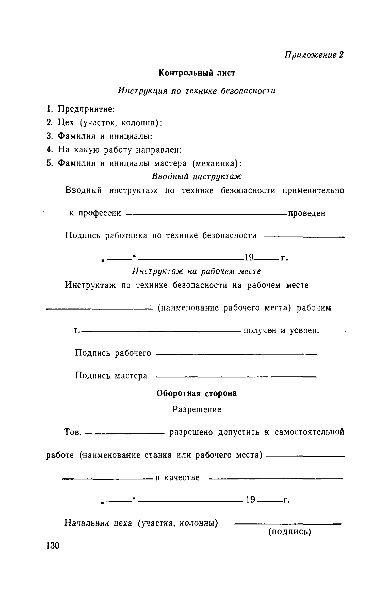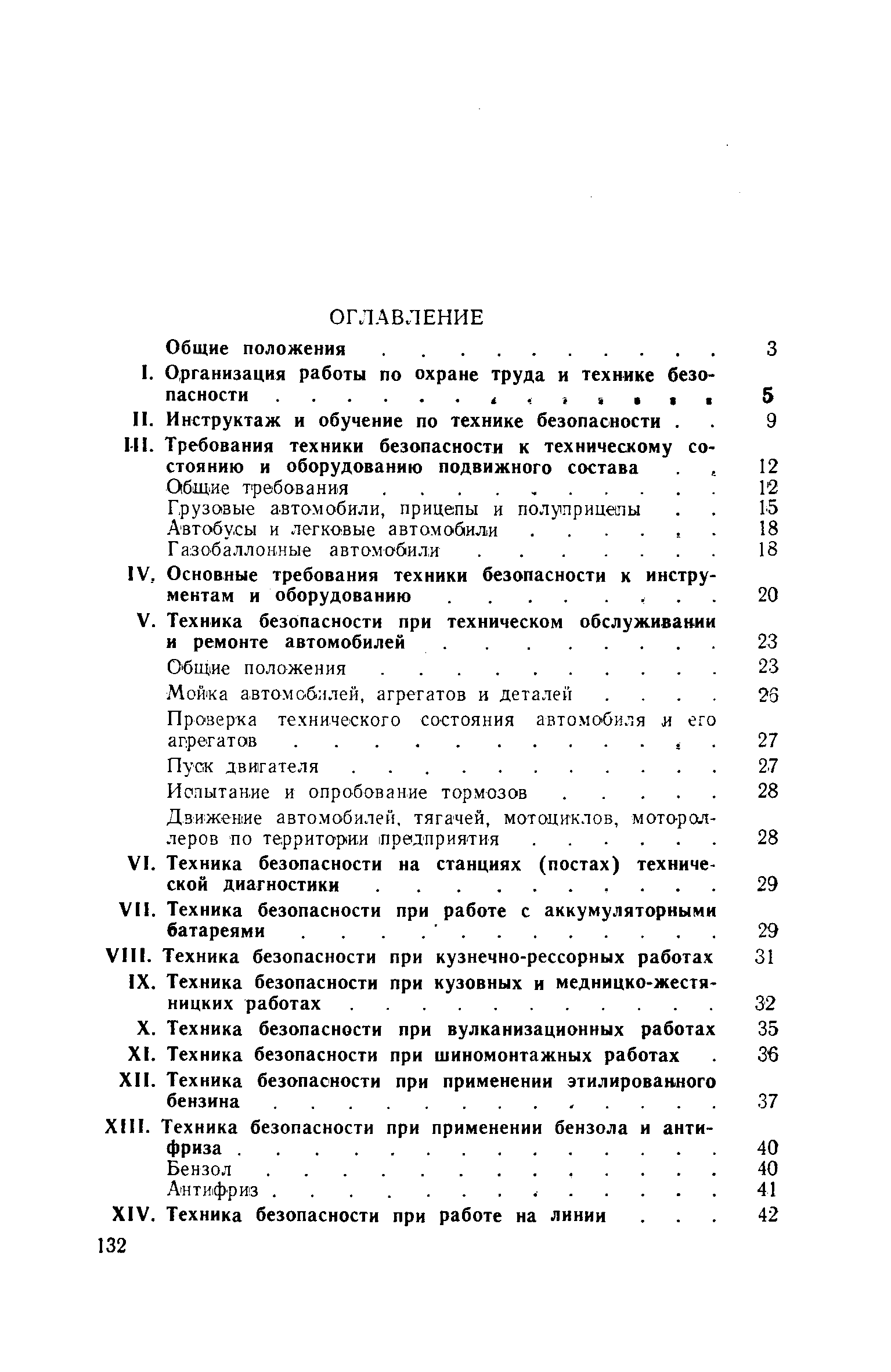 | Оглавление: | Общие положения I. Организация работы по охране труда и технике безопасности II. Инструктаж и обучение по технике безопасности III. Требования техники безопасности к техническому состоянию и оборудованию подвижного состава IV. Основные требования техники безопасности к инструментам и оборудованию V. Техника безопасности при техническом обслуживании и ремонте автомобилей VI. Техника безопасности на станциях (постах) технической диагностики VII. Техника безопасности при работе с аккумуляторными батареями VIII. Техника безопасности при кузнечно-рессорных работах IX. Техника безопасности при кузовных и медницко-жестяницких работах X. Техника безопасности при вулканизационных работах XI. Техника безопасности при шиномонтажных работах XII. Техника безопасности при применении этилированного бензина XIII. Техника безопасности при применении бензола и антифриза XIV. Техника безопасности при работе на линии XV. Техника безопасности при погрузочно-разгрузочных работах XVI. Правила и требования техники безопасности и производственной санитарии, предъявляемые к помещениям и площадкам для обслуживания, ремонта и хранения автомобилей XVII. Требования пожарной безопасности XVIII. Отопление и вентиляция XIX. Освещение помещений, площадок и подъездных путей. Требования к электрооборудованию и проводке XX. Водоснабжение и канализация XXI. Санитарно-бытовые помещения и производственная санитария XXII. Основные требования техники безопасности при работе на станках XXIII. Основные требования техники безопасности для предприятий промышленного железнодорожного транспорта Приложение 1 Перечень действующих правил и норм по технике безопасности и производственной санитарии для предприятий автомобильного транспорта, промышленности, строительства и эксплуатации автомобильных дорог Приложение 2 Инструкция по технике безопасности Приложение 3 Журнал инструктажа по технике безопасности |