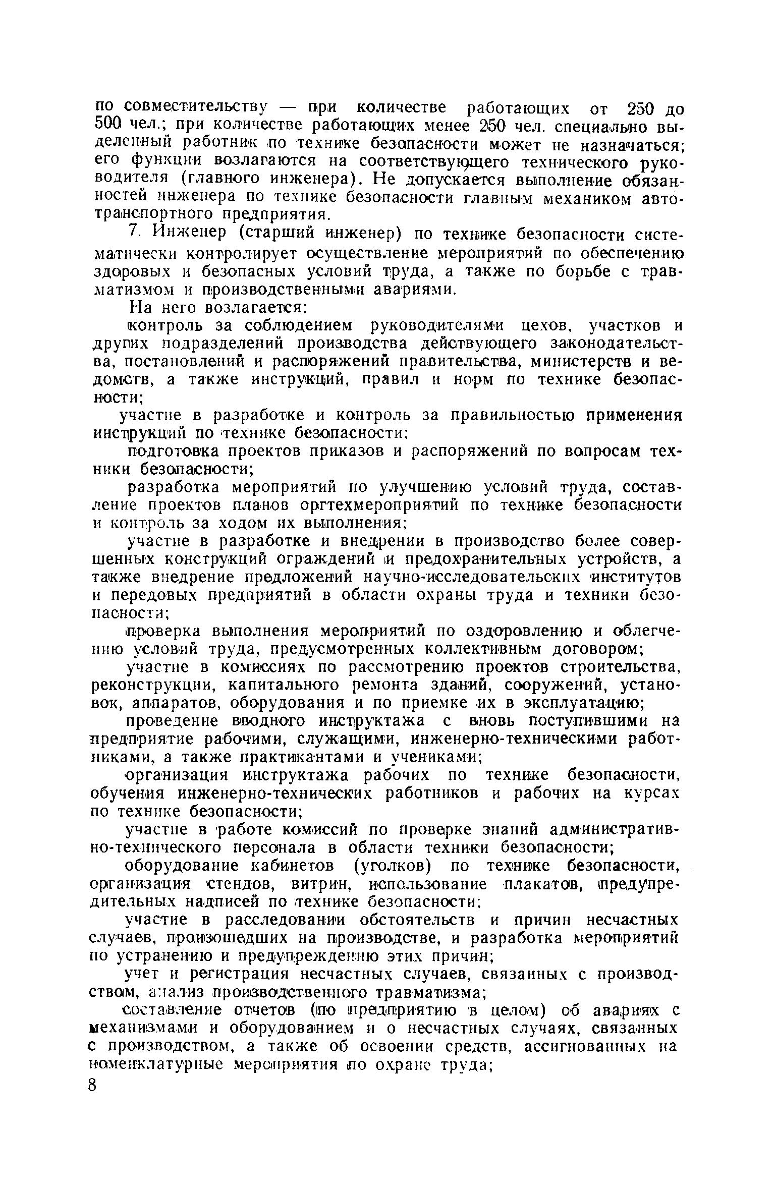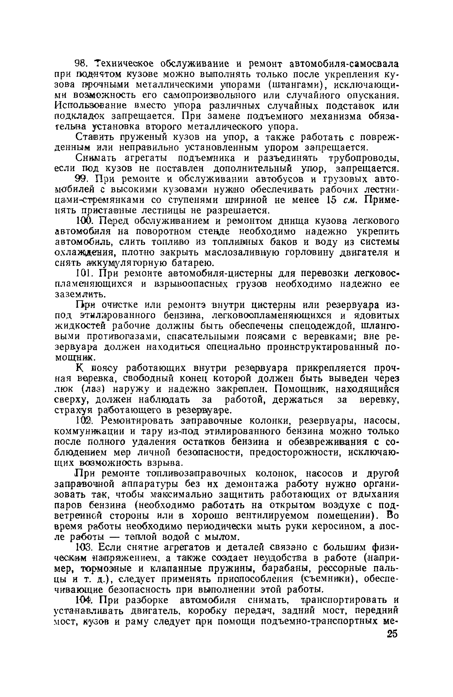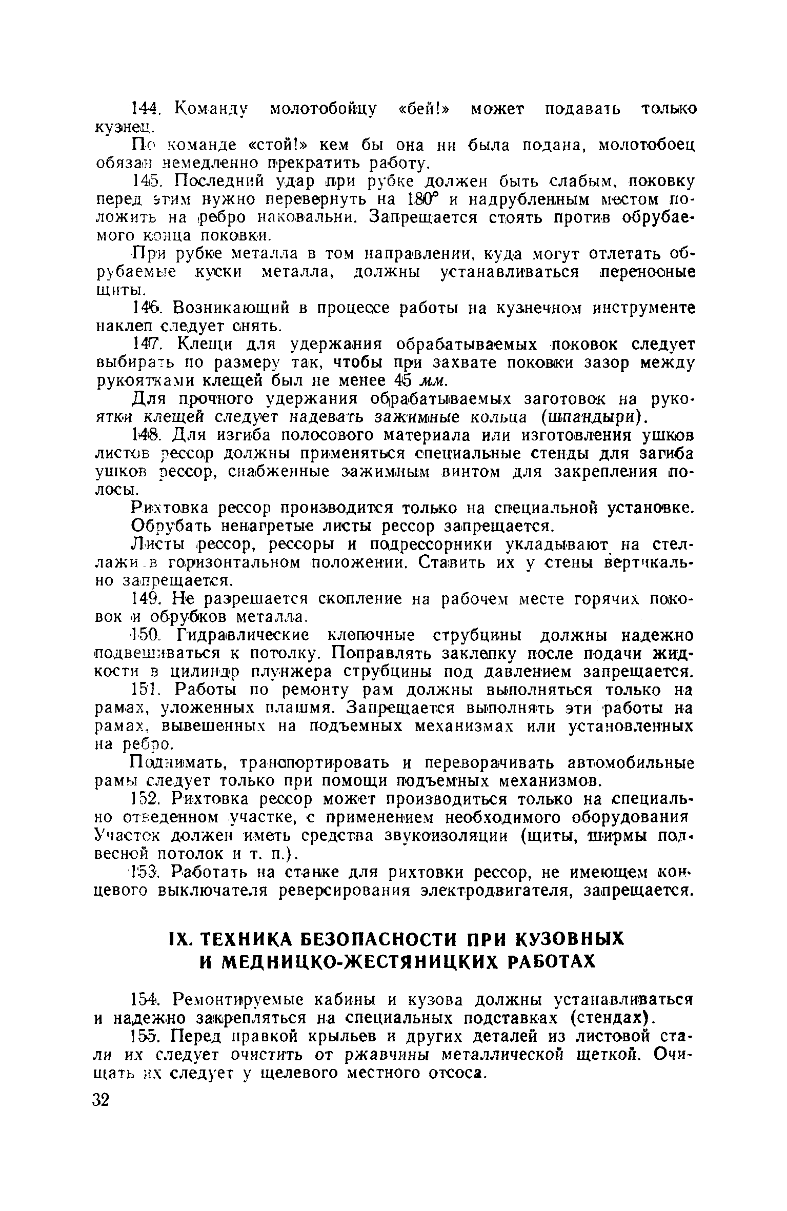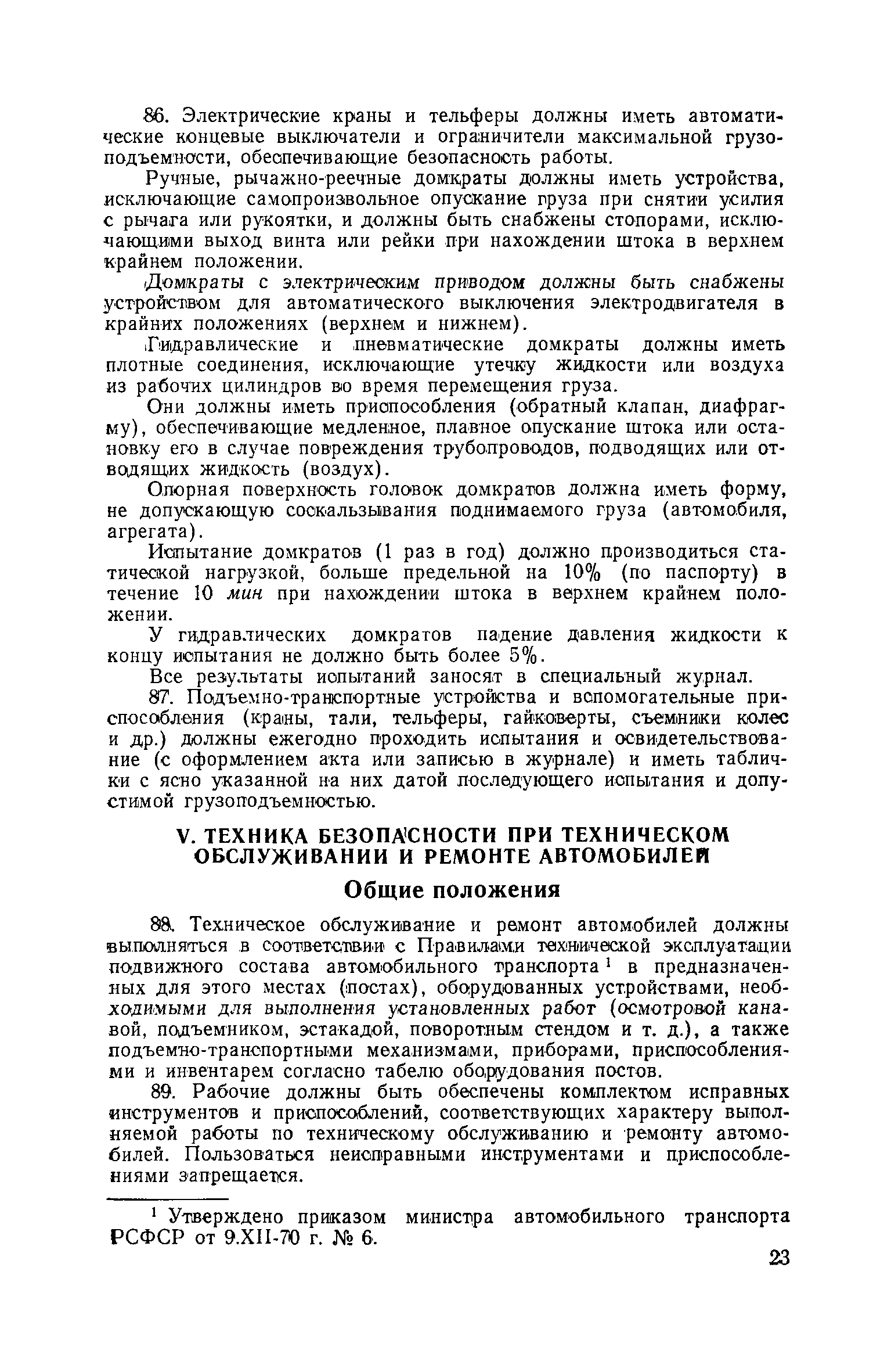 | Оглавление: | Общие положения I. Организация работы по охране труда и технике безопасности II. Инструктаж и обучение по технике безопасности III. Требования техники безопасности к техническому состоянию и оборудованию подвижного состава IV. Основные требования техники безопасности к инструментам и оборудованию V. Техника безопасности при техническом обслуживании и ремонте автомобилей VI. Техника безопасности на станциях (постах) технической диагностики VII. Техника безопасности при работе с аккумуляторными батареями VIII. Техника безопасности при кузнечно-рессорных работах IX. Техника безопасности при кузовных и медницко-жестяницких работах X. Техника безопасности при вулканизационных работах XI. Техника безопасности при шиномонтажных работах XII. Техника безопасности при применении этилированного бензина XIII. Техника безопасности при применении бензола и антифриза XIV. Техника безопасности при работе на линии XV. Техника безопасности при погрузочно-разгрузочных работах XVI. Правила и требования техники безопасности и производственной санитарии, предъявляемые к помещениям и площадкам для обслуживания, ремонта и хранения автомобилей XVII. Требования пожарной безопасности XVIII. Отопление и вентиляция XIX. Освещение помещений, площадок и подъездных путей. Требования к электрооборудованию и проводке XX. Водоснабжение и канализация XXI. Санитарно-бытовые помещения и производственная санитария XXII. Основные требования техники безопасности при работе на станках XXIII. Основные требования техники безопасности для предприятий промышленного железнодорожного транспорта Приложение 1 Перечень действующих правил и норм по технике безопасности и производственной санитарии для предприятий автомобильного транспорта, промышленности, строительства и эксплуатации автомобильных дорог Приложение 2 Инструкция по технике безопасности Приложение 3 Журнал инструктажа по технике безопасности |