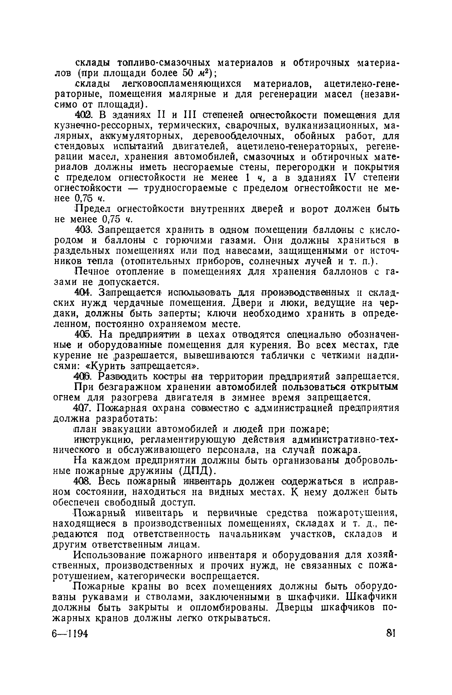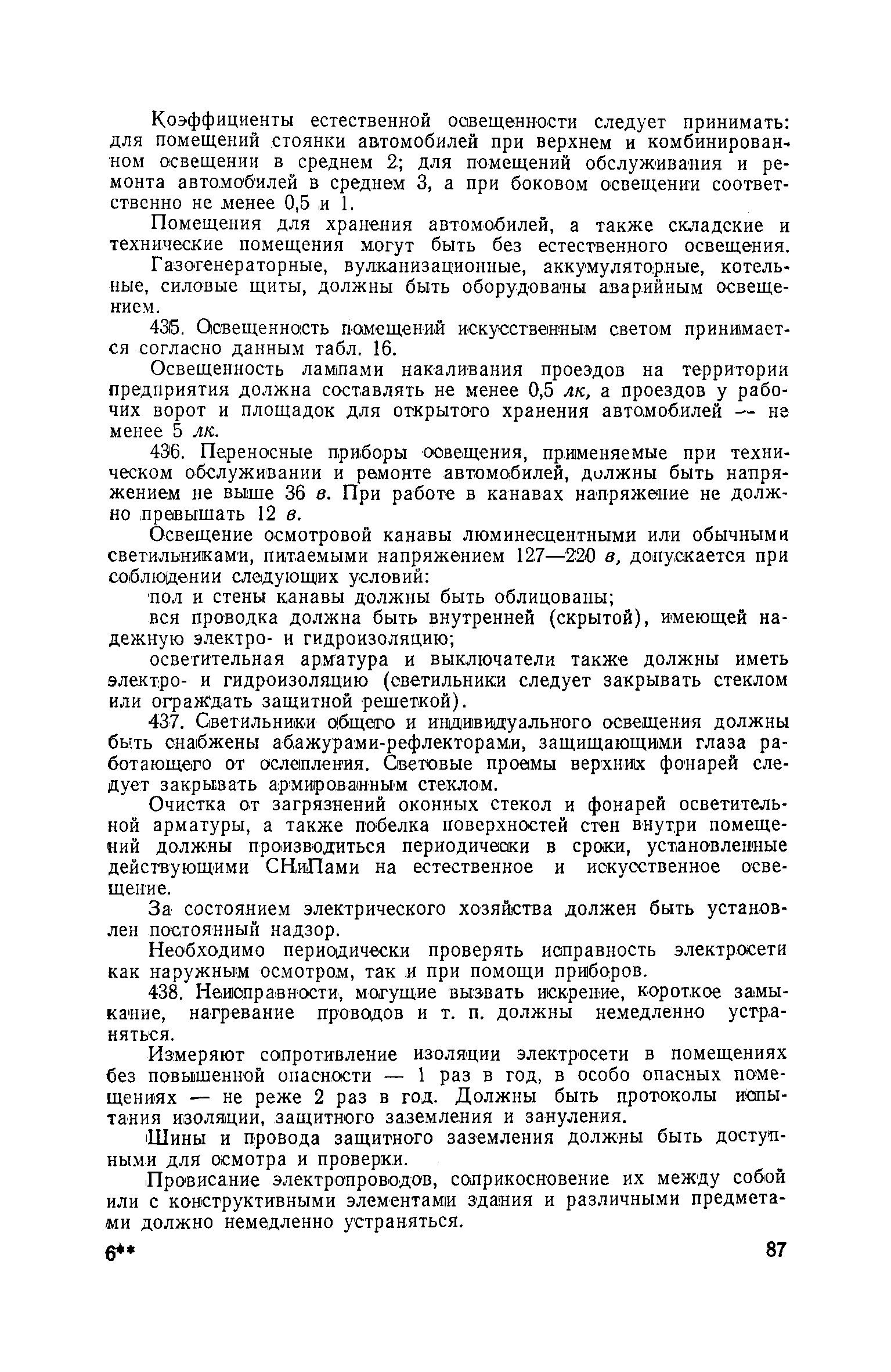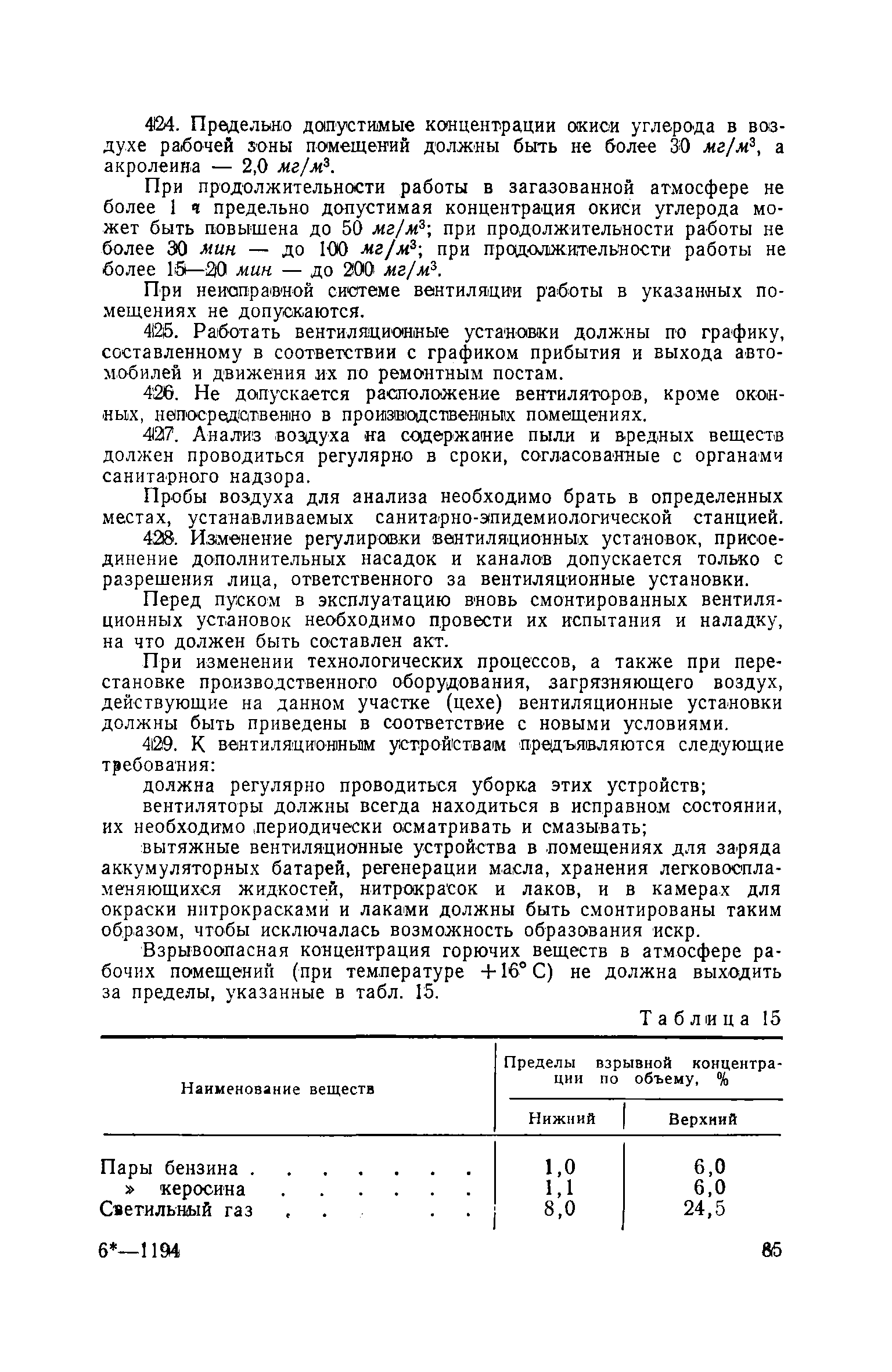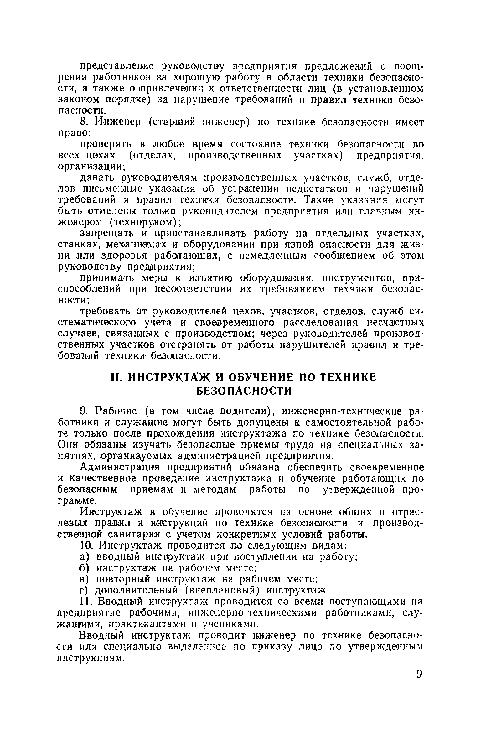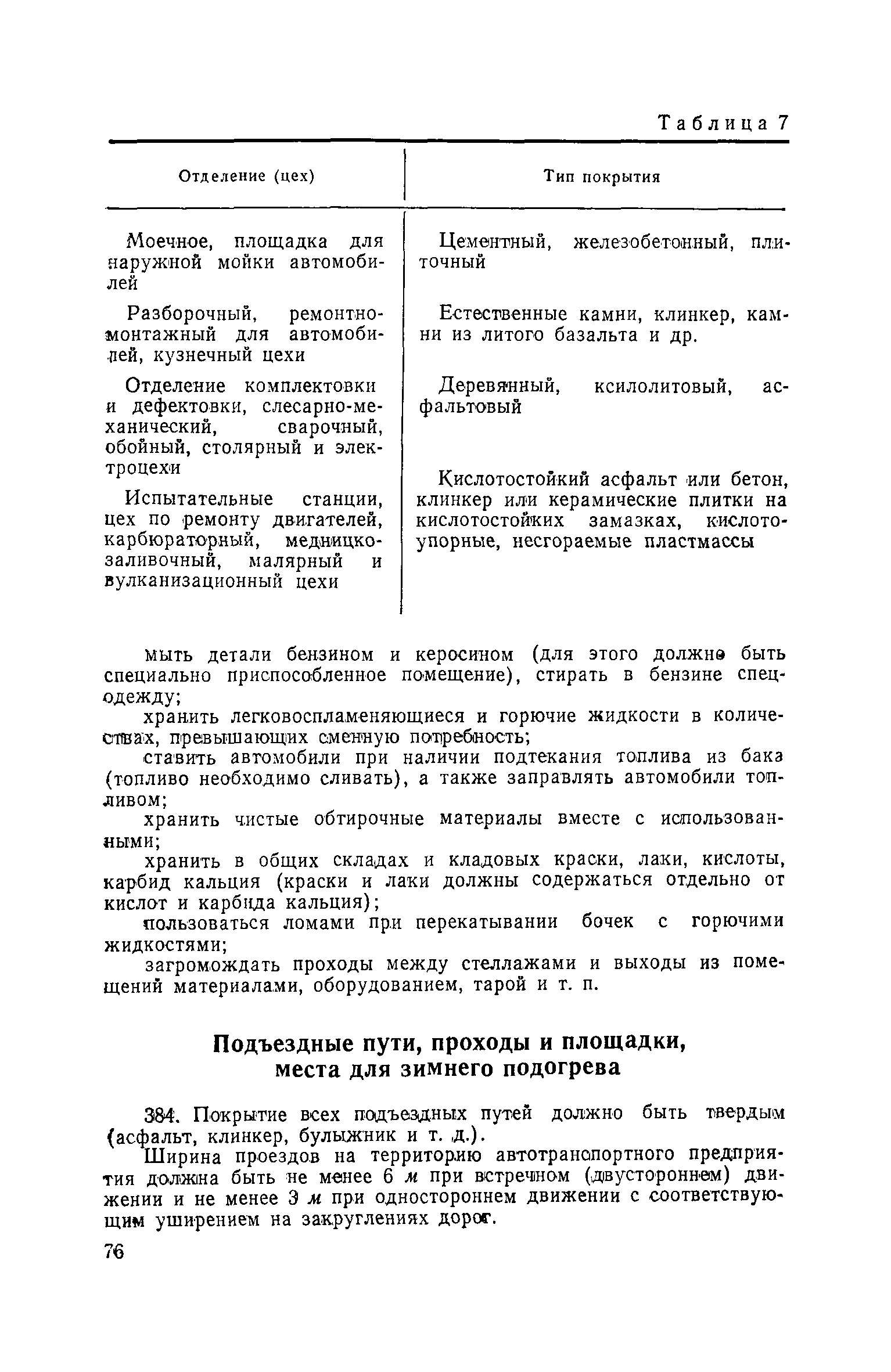 | Оглавление: | Общие положения I. Организация работы по охране труда и технике безопасности II. Инструктаж и обучение по технике безопасности III. Требования техники безопасности к техническому состоянию и оборудованию подвижного состава IV. Основные требования техники безопасности к инструментам и оборудованию V. Техника безопасности при техническом обслуживании и ремонте автомобилей VI. Техника безопасности на станциях (постах) технической диагностики VII. Техника безопасности при работе с аккумуляторными батареями VIII. Техника безопасности при кузнечно-рессорных работах IX. Техника безопасности при кузовных и медницко-жестяницких работах X. Техника безопасности при вулканизационных работах XI. Техника безопасности при шиномонтажных работах XII. Техника безопасности при применении этилированного бензина XIII. Техника безопасности при применении бензола и антифриза XIV. Техника безопасности при работе на линии XV. Техника безопасности при погрузочно-разгрузочных работах XVI. Правила и требования техники безопасности и производственной санитарии, предъявляемые к помещениям и площадкам для обслуживания, ремонта и хранения автомобилей XVII. Требования пожарной безопасности XVIII. Отопление и вентиляция XIX. Освещение помещений, площадок и подъездных путей. Требования к электрооборудованию и проводке XX. Водоснабжение и канализация XXI. Санитарно-бытовые помещения и производственная санитария XXII. Основные требования техники безопасности при работе на станках XXIII. Основные требования техники безопасности для предприятий промышленного железнодорожного транспорта Приложение 1 Перечень действующих правил и норм по технике безопасности и производственной санитарии для предприятий автомобильного транспорта, промышленности, строительства и эксплуатации автомобильных дорог Приложение 2 Инструкция по технике безопасности Приложение 3 Журнал инструктажа по технике безопасности |