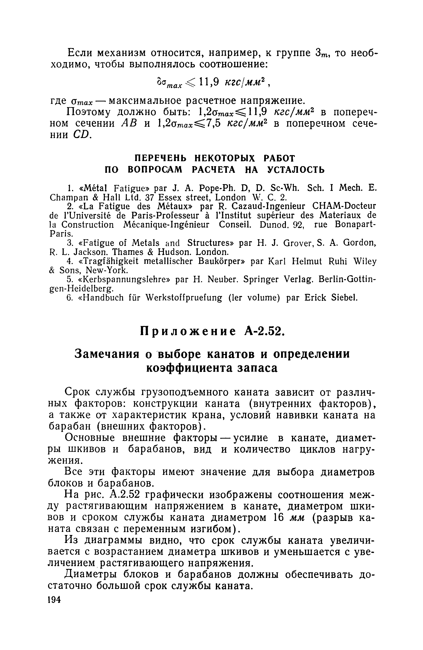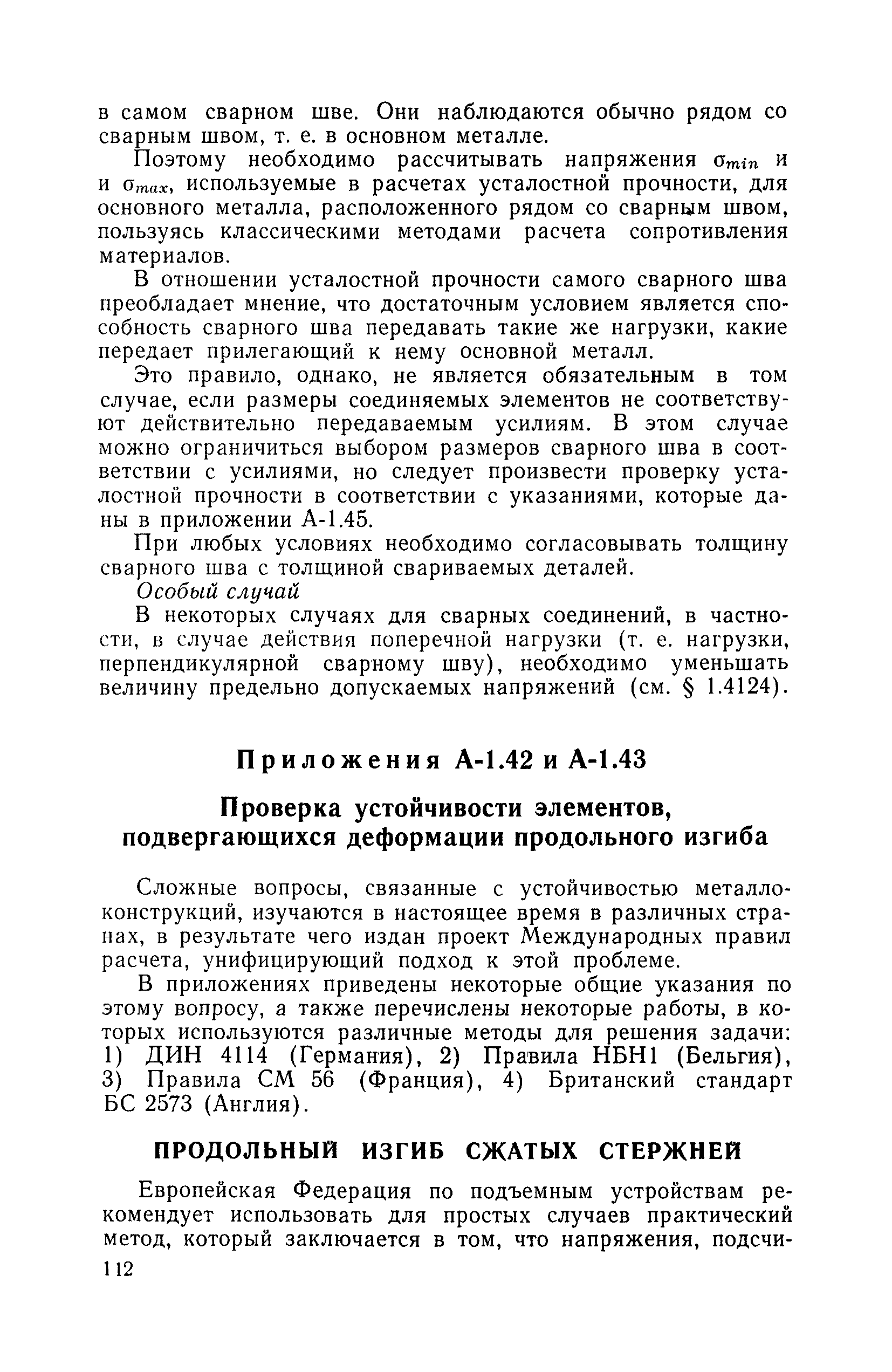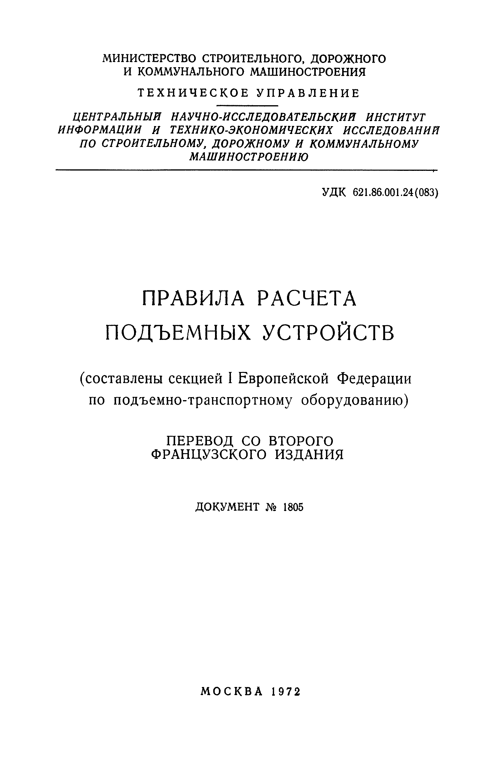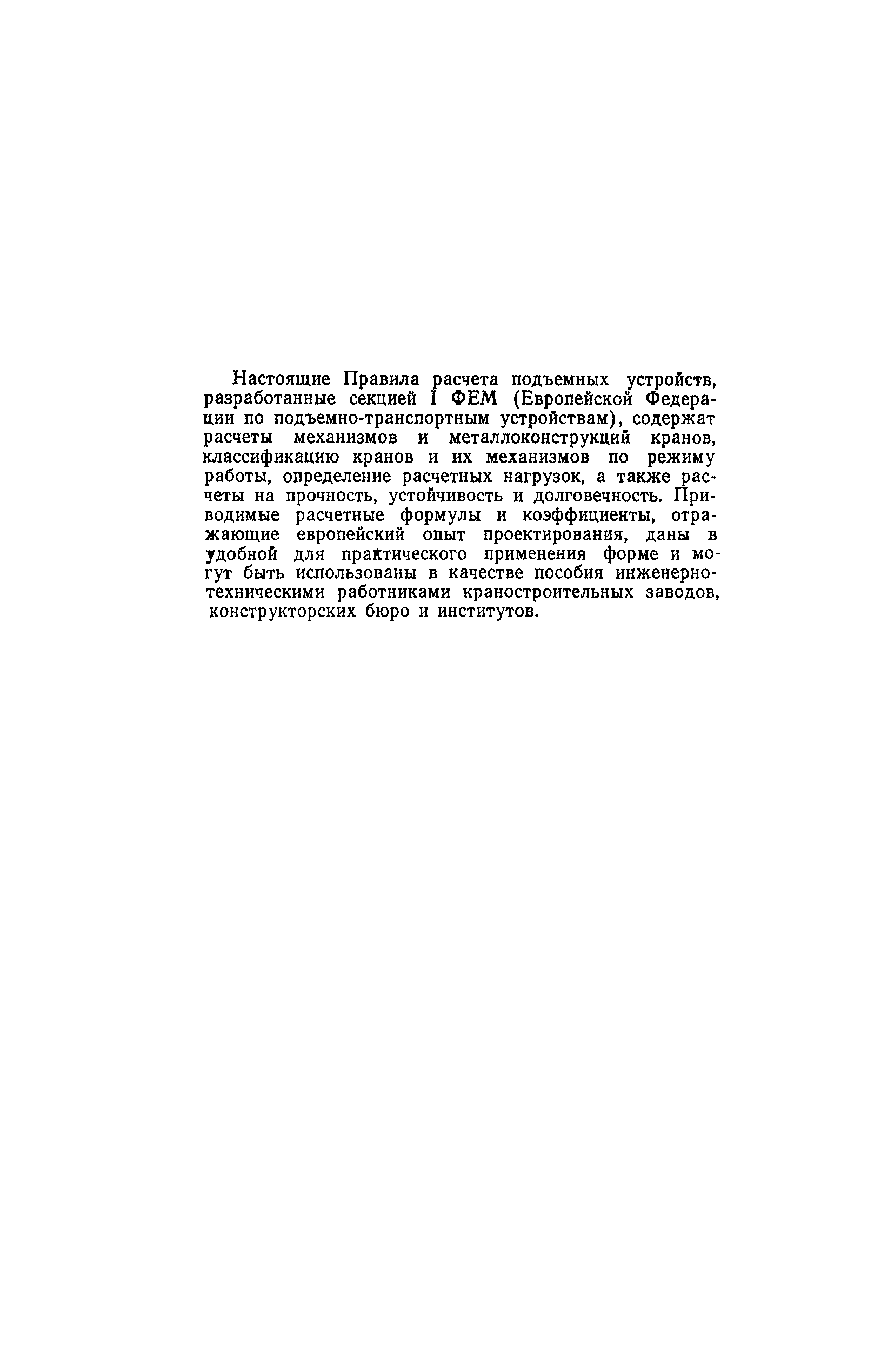 Правила расчета подъемных устройств. Материалы ФЕМ| Статус: | справочные материалы, мп, тпр | | Название рус.: | Правила расчета подъемных устройств. Материалы ФЕМ | | Дата добавления в базу: | 01.02.2020 | | Дата актуализации: | 01.01.2021 | | Область применения: | Правила расчета подъемных устройств, разработанные секцией I ФЕМ, содержат расчеты механизмов и металлоконструкций кранов, классификацию кранов и их механизмов по режиму работы, определение расчетных нагрузок, а также расчеты на прочность, устойчивость и долговечность. Приводимые расчетные формулы и коэффициенты, отражающие европейский опыт проектирования, даны в удобной для практического применения форме и могут быть использованы в качестве пособия инженерно-техническими работниками краностроительных заводов, конструкторских бюро и институтов. | | Оглавление: | 1. Металлоконструкция 2. Механизмы Приложение А-1.11 Установление соотношения классов использования металлоконструкций и классов работы механиков Приложение А-1.23 Определение нагрузок от ускорений горизонтальных движений Приложение А-1.234 Вопросы расчета на удар в тупик Приложение А-1.1423 Выполнение соединений с помощью высокопрочных болтов с контролируемой затяжкой Приложение А-1.42 и А-1.43 Проверка устойчивости элементов, подвергающихся деформации продольного изгиба Приложение А-1.45 Проверка усталостной прочности элементов металлоконструкций Приложение А-1.36 Правила проведения испытаний подъемных устройств в различных странах Европа Приложение А-2.13 Примеры: классификация механизмов - характеристики повторно-кратковременного режима - классы числа включений приводных двигателей Приложение А-2.43 Определение допускаемых напряжений в элементах механизмов с учетом усталости Приложение А-2.52 Замечания о выборе канатов и определении коэффициентов запаса Приложение А-2.53 Замечания об определении минимальных диаметров блоков и барабанов Условные обозначения | | Утверждён: | Министерство строительного, дорожного и коммунального машиностроения СССР