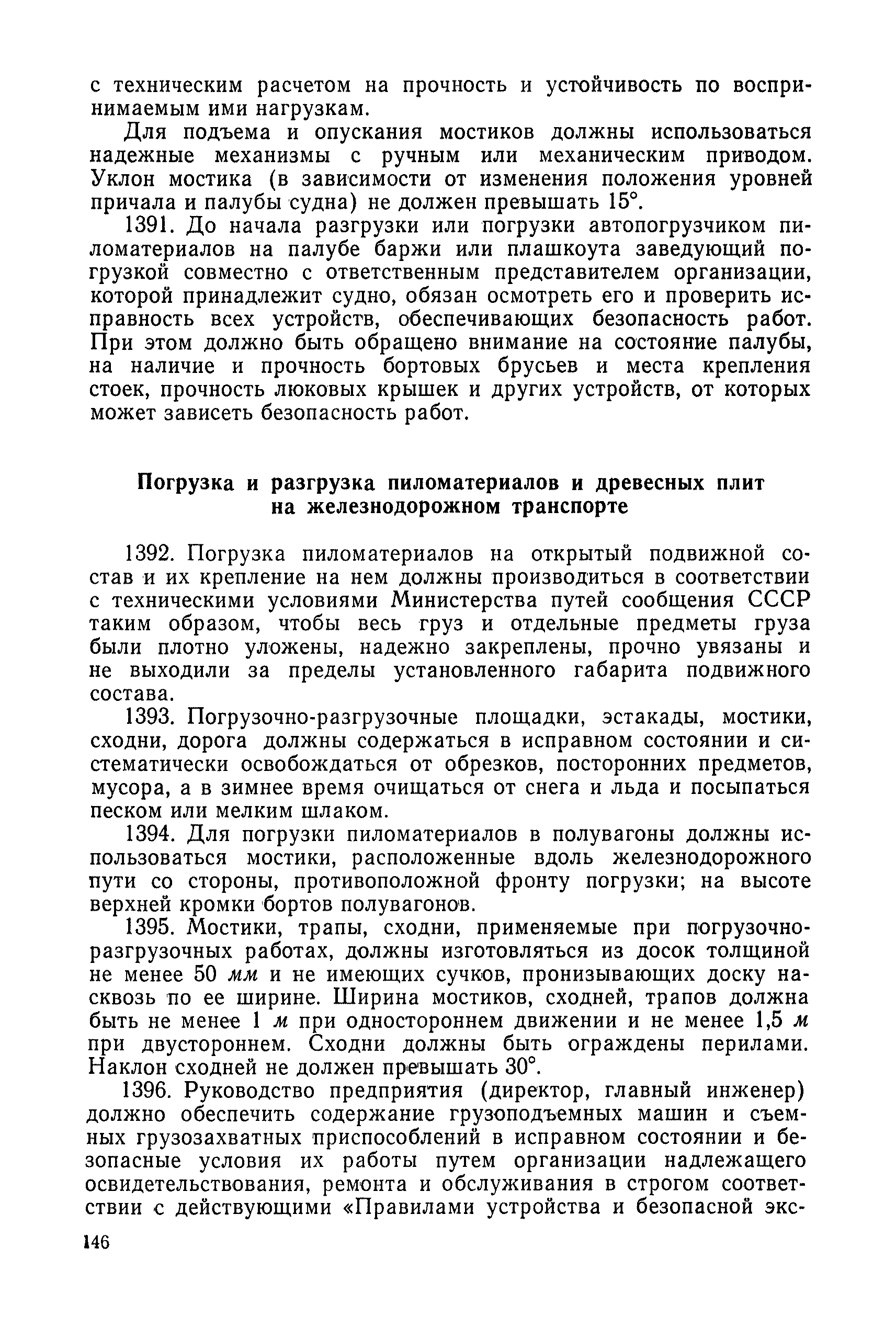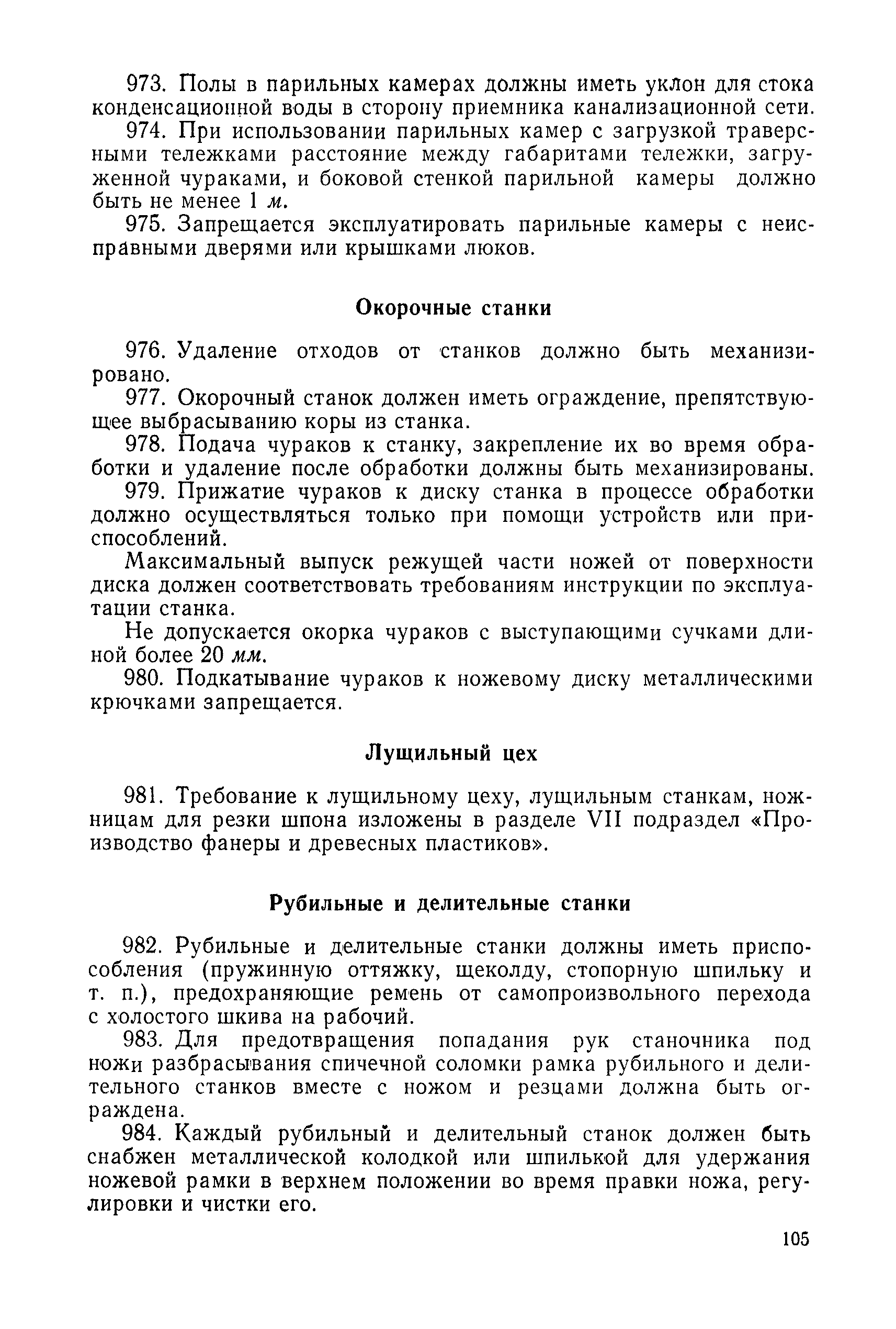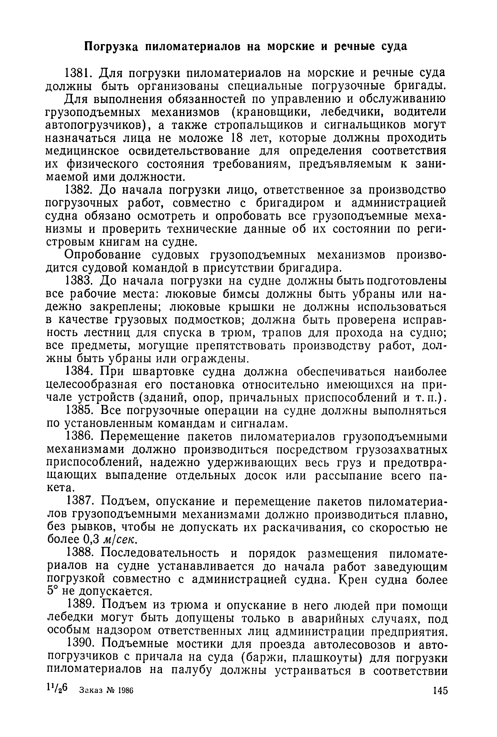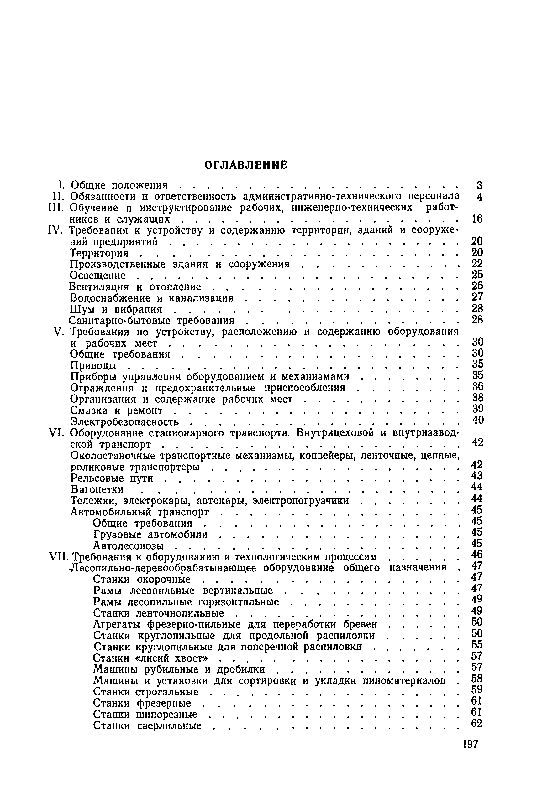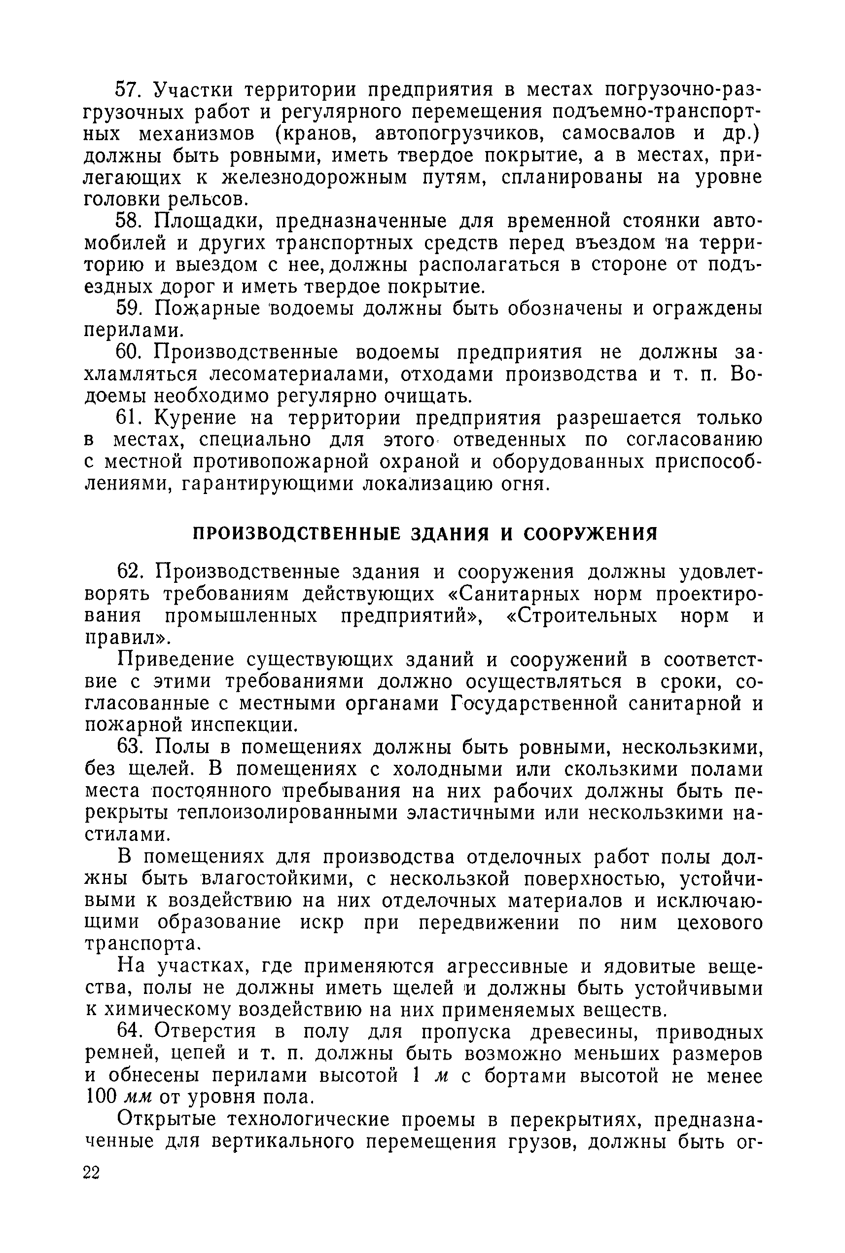 | Оглавление: | I. Общие положения II. Обязанности и ответственность административно-технического персонала III. Обучение и инструктирование рабочих, инженерно-технических работников и служащих IV. Требования к устройству и содержанию территории, зданий и сооружений предприятий V. Требования по устройству, расположению и содержанию оборудования и рабочих мест VI. Оборудование стационарного транспорта. Внутрицеховой и внутризаводской транспорт VII. Требования к оборудованию и технологическим процессам VIII. Инструменты IX. Рейды, бассейны и склады круглых лесоматериалов X. Склады готовой продукции Приложение 1 Перечень официальных руководящих нормативных и общетехнических материалов по технике безопасности и производственной санитарии, применение которых обязательно во всех отраслях промышленности Приложение 2 Методические указания к составлению инструкций по технике безопасности Приложение 3 Структура служб охраны труда в зависимости от числа рабочих Приложение 4 Предписание Приложение 5 Методические указания по созданию и организации работы кабинета охраны труда Приложение 6 Типовые программы инструктажей и курсового обучения рабочих Приложение 7 Журнал регистрации вводного инструктажа по технике безопасности Приложение 8 Удостоверение по технике безопасности Приложение 9 Протокол Приложение 10 Типовая программа для обучения административно-технического персонала Приложение 11 Положение о порядке проверки знаний правил, норм и инструкций по технике безопасности руководящими работниками подведомственных предприятий, организаций и объектов, подконтрольных органам Госгортехнадзора СССР в системе Министерства лесной и деревообрабатывающей промышленности СССР Приложение 12 Предельно допустимые концентрации вредных газов, паров, пыли и других аэрозолей в воздухе рабочей зоны производственных помещений Приложение 13 Состав и нормы санитарно-бытовых помещений Приложение 14 Нормы и сроки испытаний подъемных механизмов и приспособлений Приложение 15 Наименьших допустимый коэффициент запаса прочности канатов и цепей Приложение 16 Нормы и сроки электрических испытаний защитных средств Приложение 17 Классификация производственных помещений по степени взрыво- и пожароопасности с точки зрения применения электрооборудования Приложение 18 Временная инструкция по устройству расходных складов бертолетовой соли и о порядке ее хранения на спичечных фабриках Приложение 19 Нормы браковки стальных канатов Приложение 20 Шкала приближенного определения силы ветра и состояния водной поверхности |
