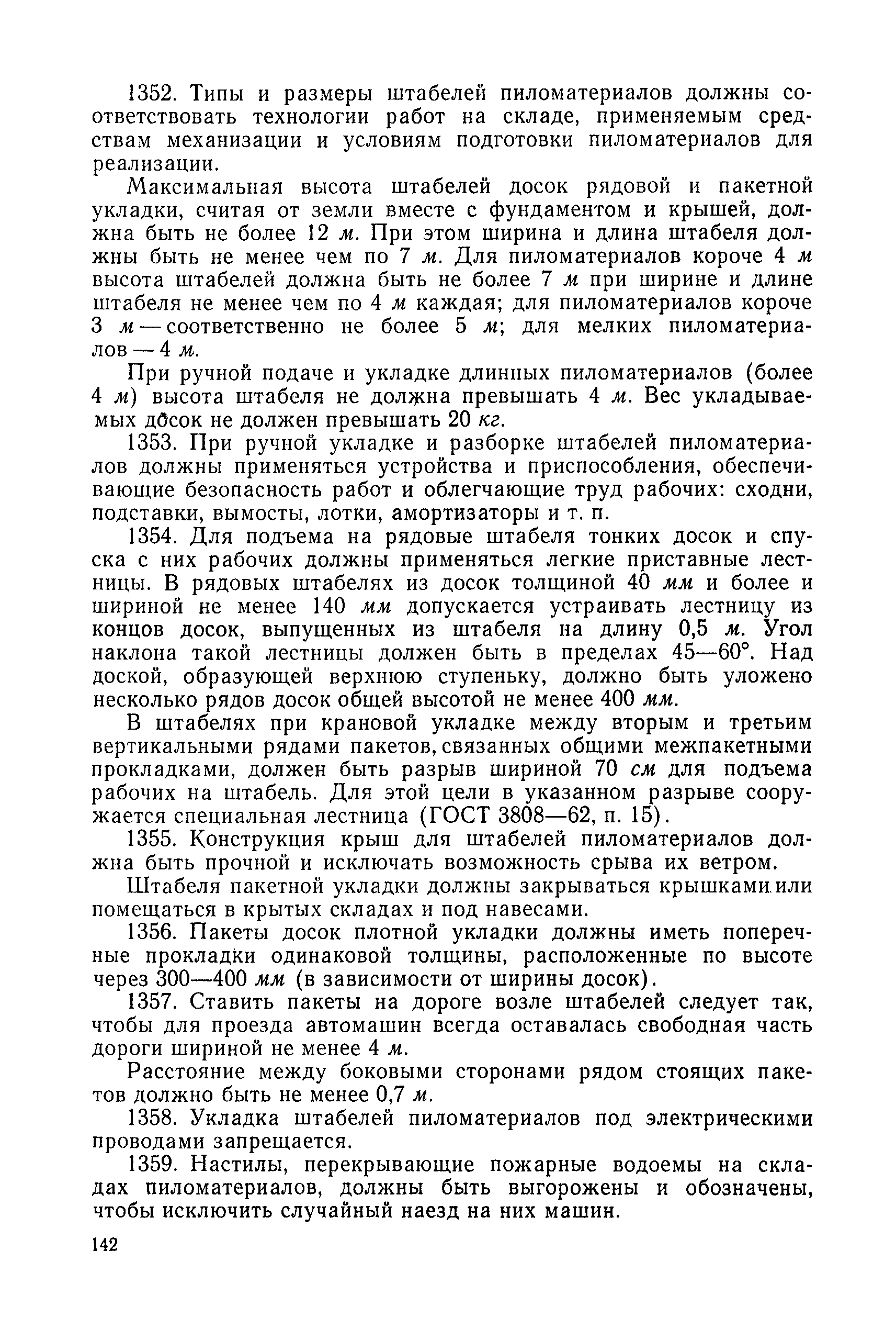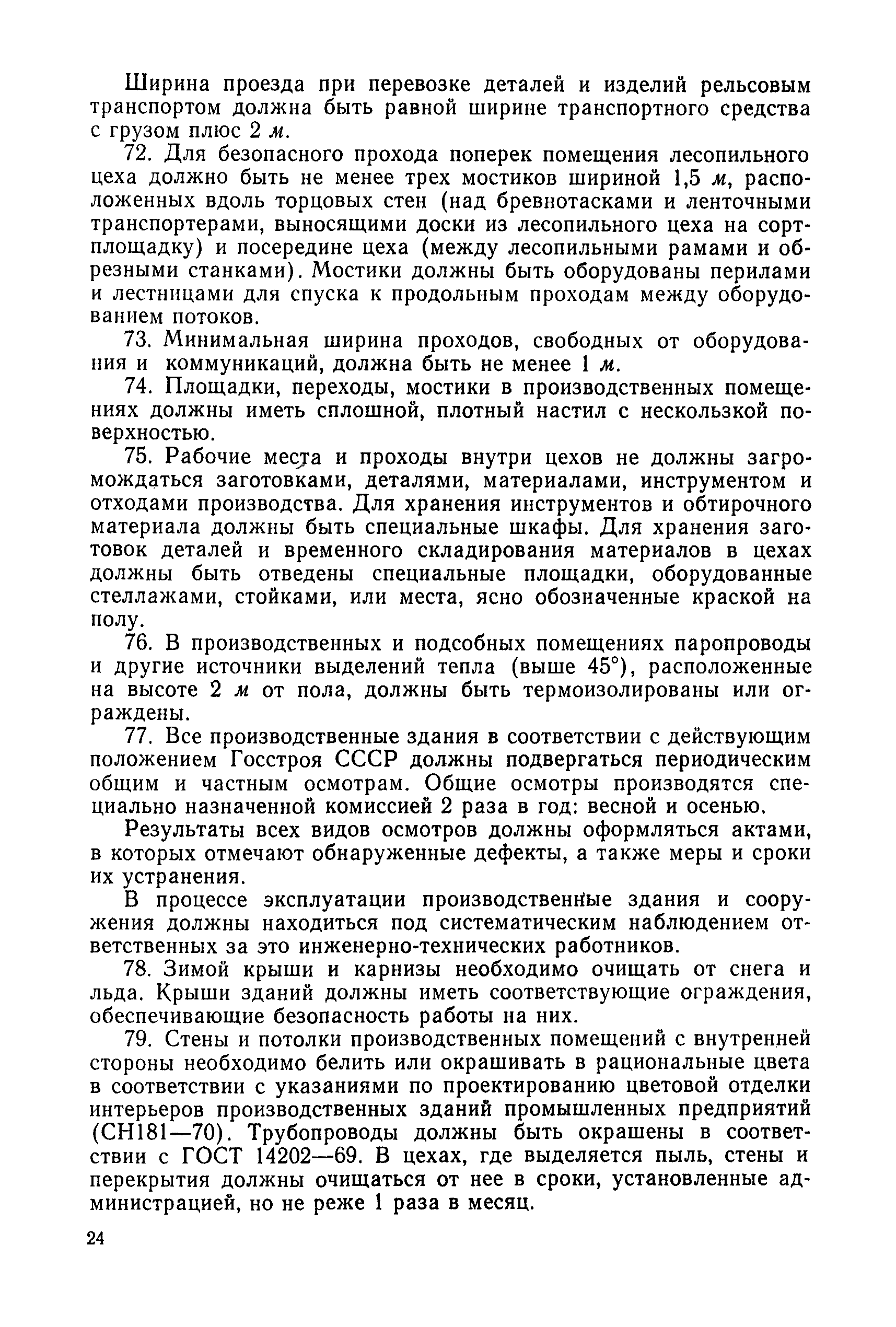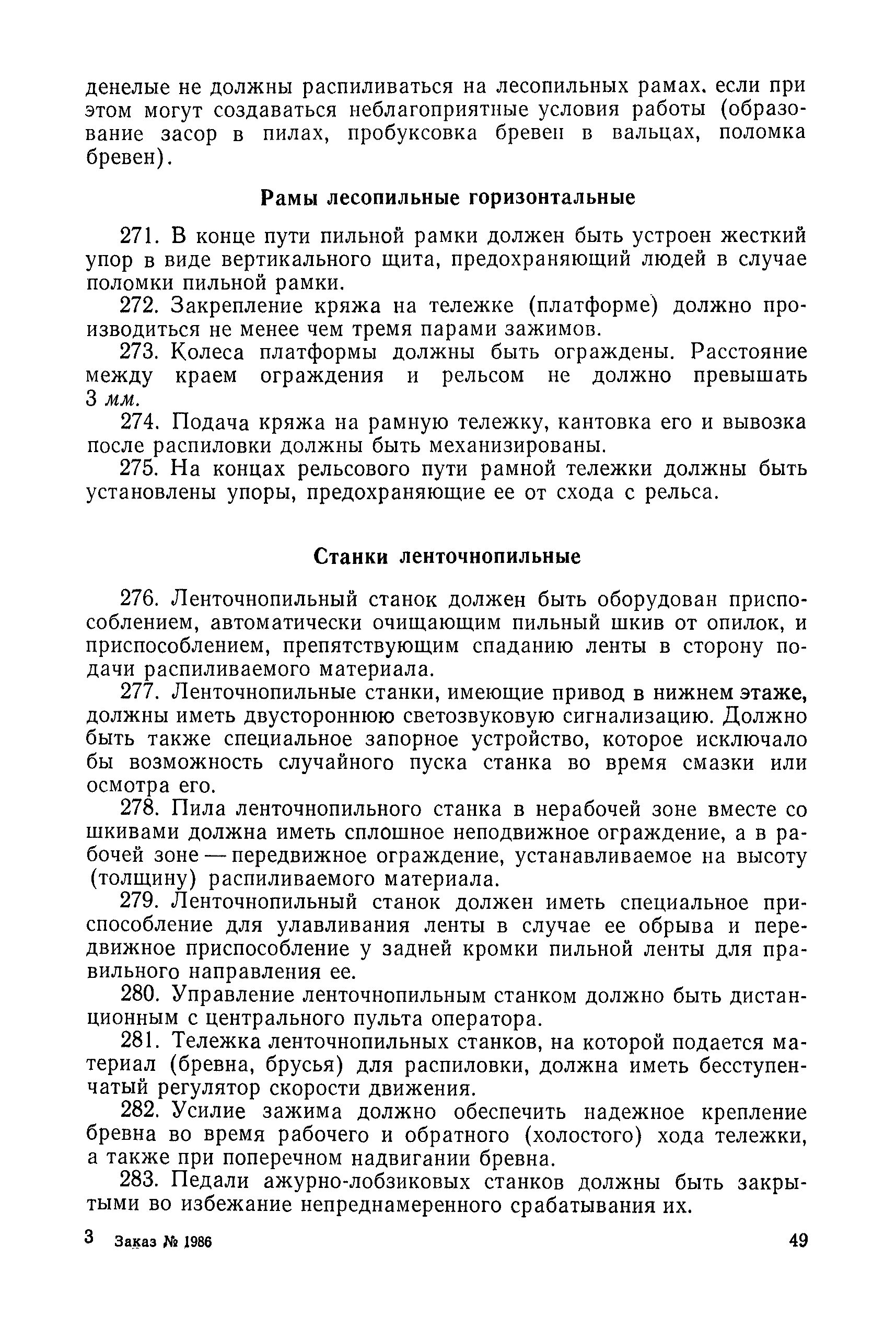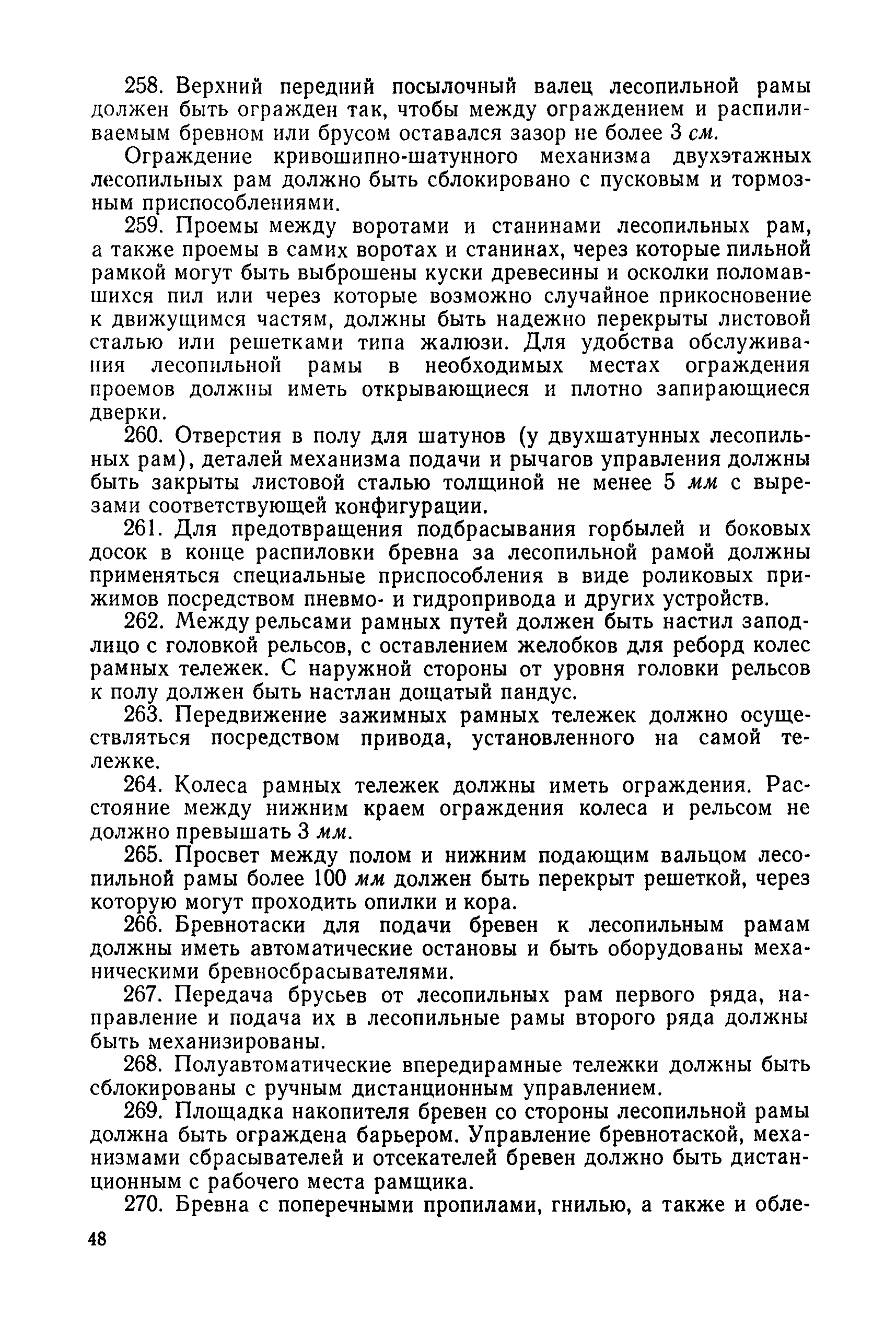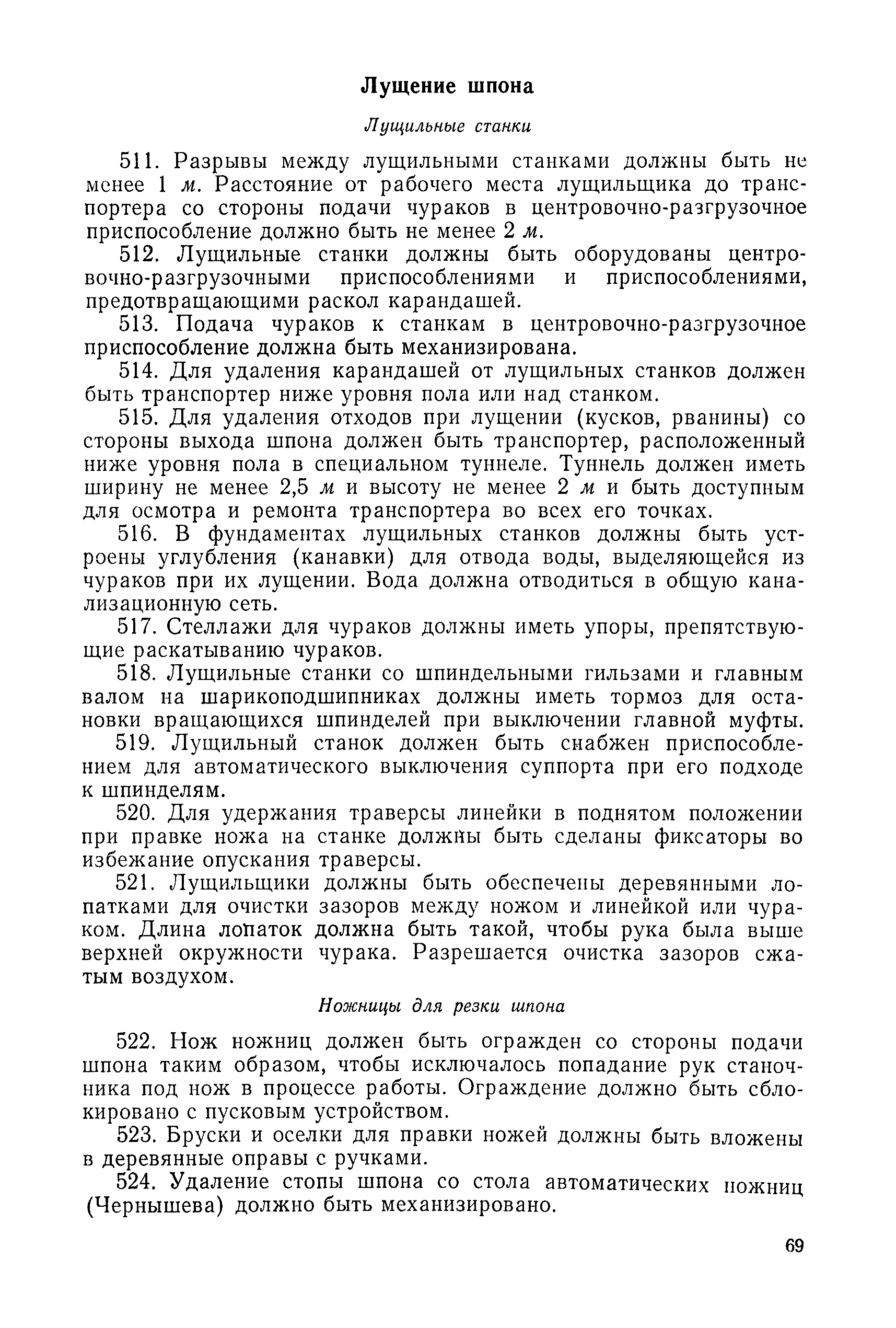 | Оглавление: | I. Общие положения II. Обязанности и ответственность административно-технического персонала III. Обучение и инструктирование рабочих, инженерно-технических работников и служащих IV. Требования к устройству и содержанию территории, зданий и сооружений предприятий V. Требования по устройству, расположению и содержанию оборудования и рабочих мест VI. Оборудование стационарного транспорта. Внутрицеховой и внутризаводской транспорт VII. Требования к оборудованию и технологическим процессам VIII. Инструменты IX. Рейды, бассейны и склады круглых лесоматериалов X. Склады готовой продукции Приложение 1 Перечень официальных руководящих нормативных и общетехнических материалов по технике безопасности и производственной санитарии, применение которых обязательно во всех отраслях промышленности Приложение 2 Методические указания к составлению инструкций по технике безопасности Приложение 3 Структура служб охраны труда в зависимости от числа рабочих Приложение 4 Предписание Приложение 5 Методические указания по созданию и организации работы кабинета охраны труда Приложение 6 Типовые программы инструктажей и курсового обучения рабочих Приложение 7 Журнал регистрации вводного инструктажа по технике безопасности Приложение 8 Удостоверение по технике безопасности Приложение 9 Протокол Приложение 10 Типовая программа для обучения административно-технического персонала Приложение 11 Положение о порядке проверки знаний правил, норм и инструкций по технике безопасности руководящими работниками подведомственных предприятий, организаций и объектов, подконтрольных органам Госгортехнадзора СССР в системе Министерства лесной и деревообрабатывающей промышленности СССР Приложение 12 Предельно допустимые концентрации вредных газов, паров, пыли и других аэрозолей в воздухе рабочей зоны производственных помещений Приложение 13 Состав и нормы санитарно-бытовых помещений Приложение 14 Нормы и сроки испытаний подъемных механизмов и приспособлений Приложение 15 Наименьших допустимый коэффициент запаса прочности канатов и цепей Приложение 16 Нормы и сроки электрических испытаний защитных средств Приложение 17 Классификация производственных помещений по степени взрыво- и пожароопасности с точки зрения применения электрооборудования Приложение 18 Временная инструкция по устройству расходных складов бертолетовой соли и о порядке ее хранения на спичечных фабриках Приложение 19 Нормы браковки стальных канатов Приложение 20 Шкала приближенного определения силы ветра и состояния водной поверхности |