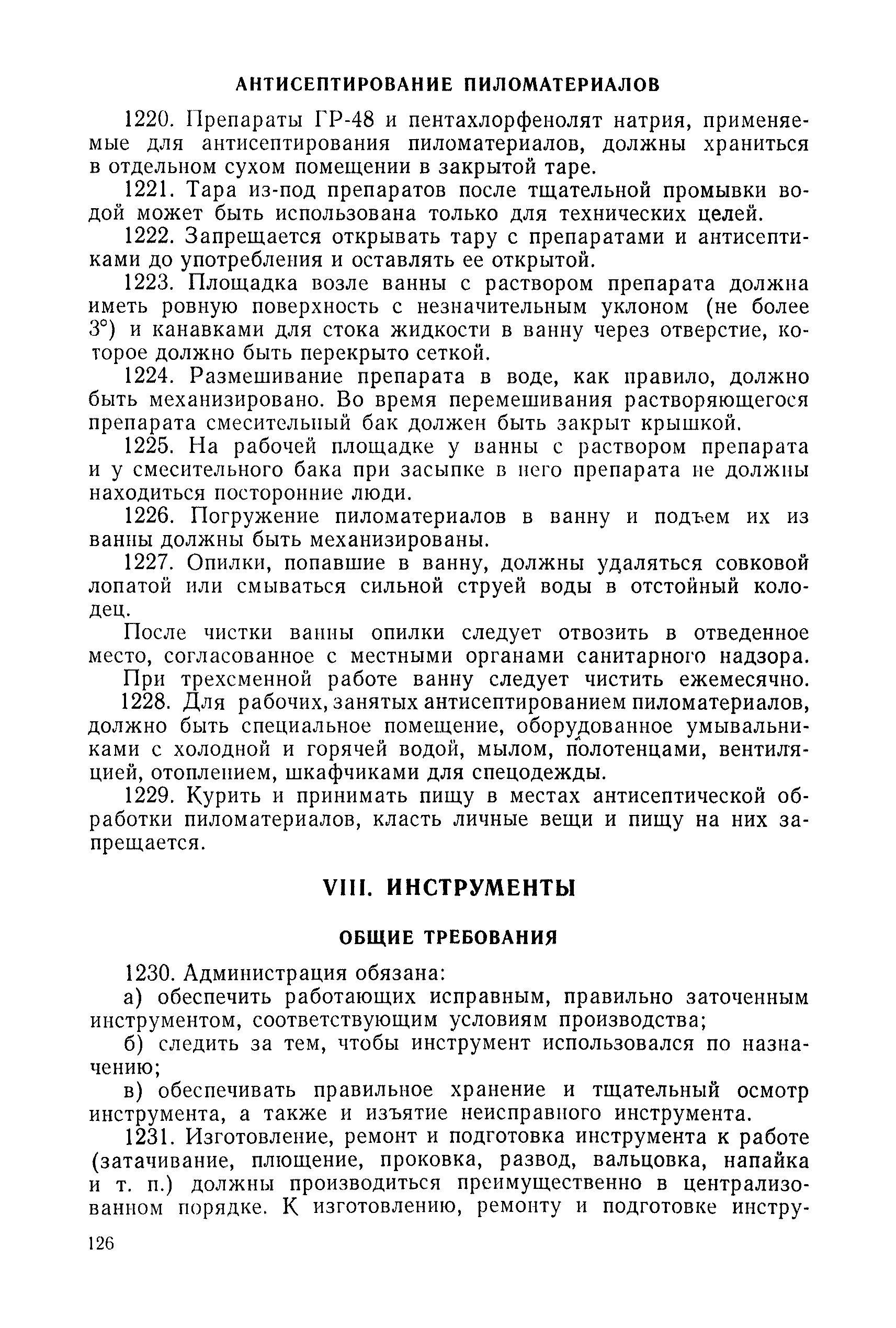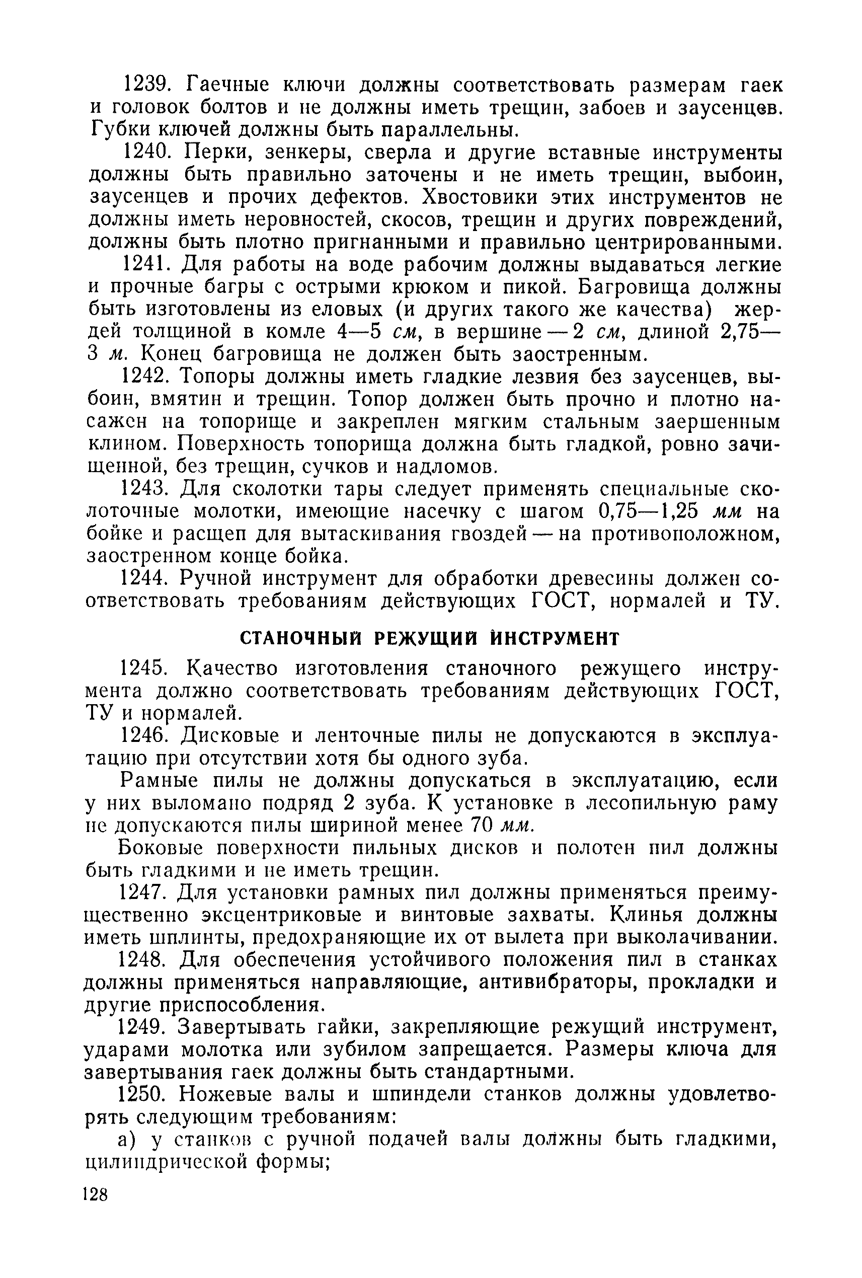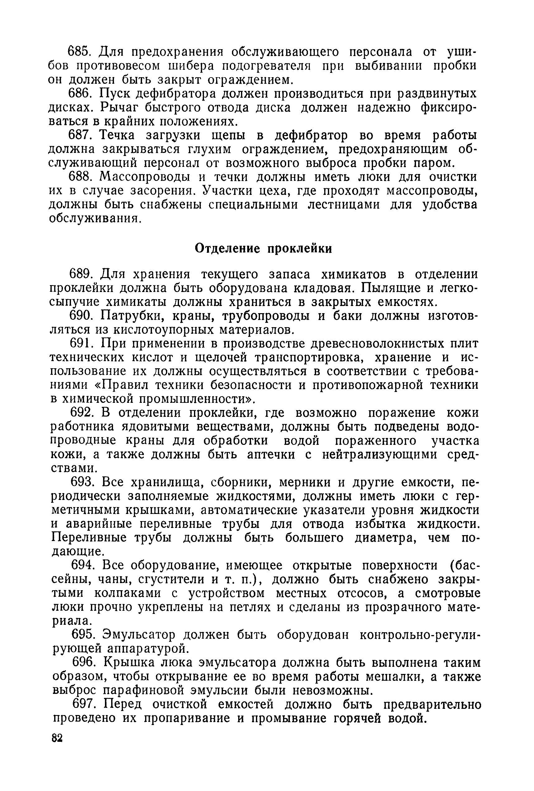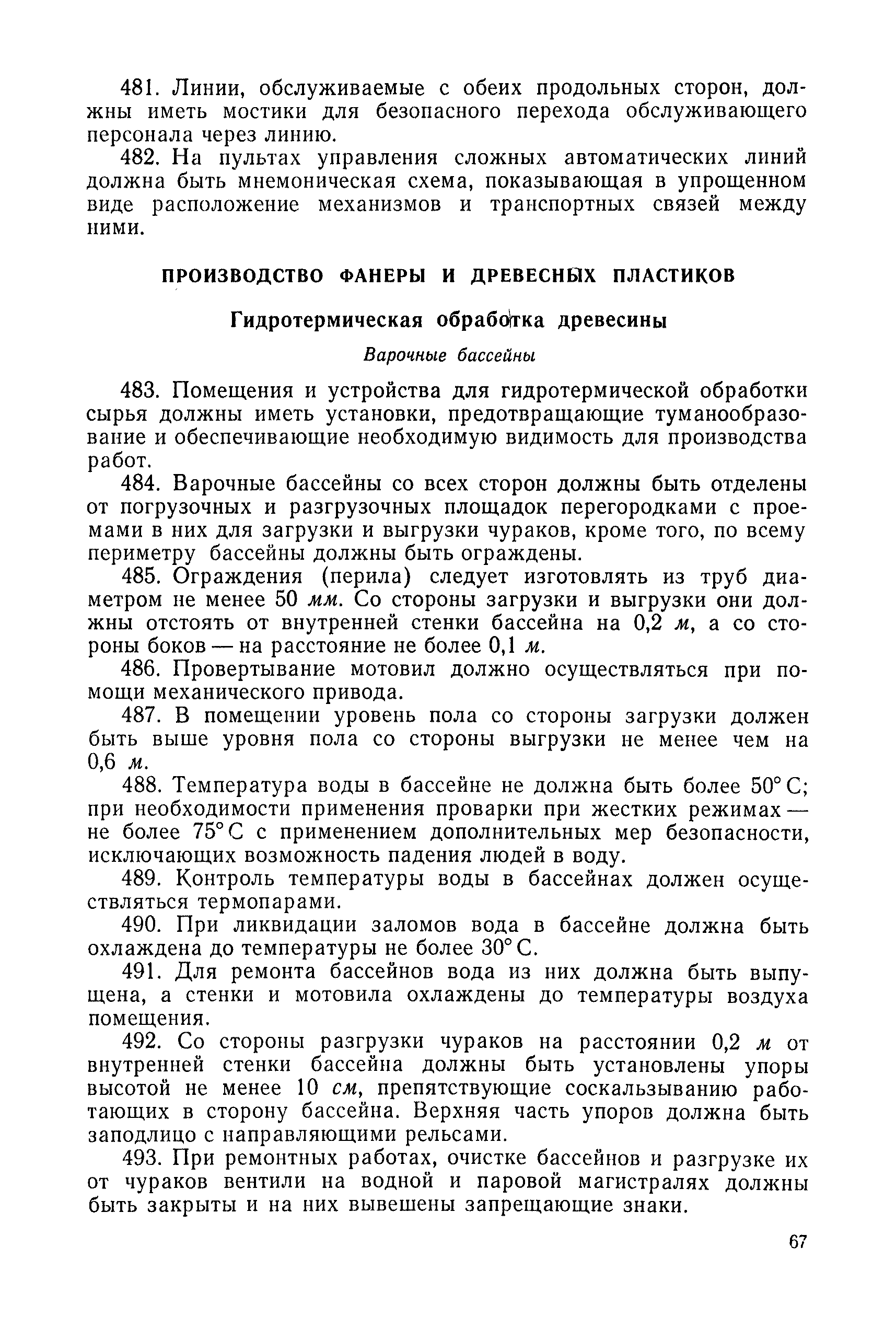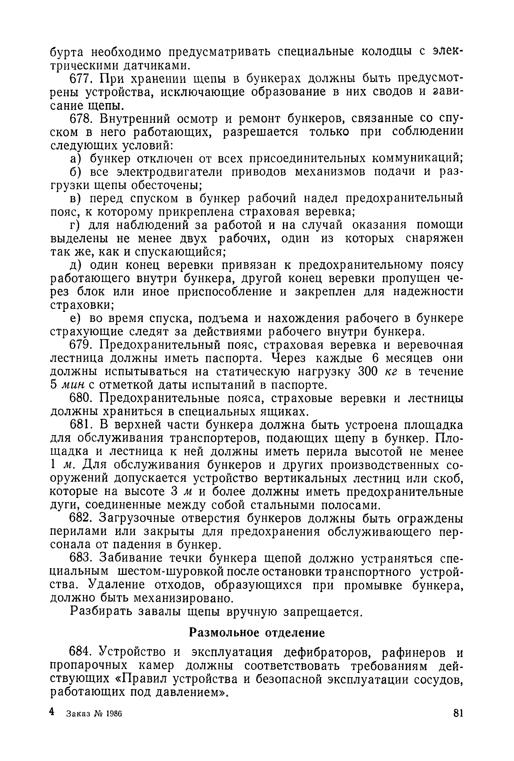 | Оглавление: | I. Общие положения II. Обязанности и ответственность административно-технического персонала III. Обучение и инструктирование рабочих, инженерно-технических работников и служащих IV. Требования к устройству и содержанию территории, зданий и сооружений предприятий V. Требования по устройству, расположению и содержанию оборудования и рабочих мест VI. Оборудование стационарного транспорта. Внутрицеховой и внутризаводской транспорт VII. Требования к оборудованию и технологическим процессам VIII. Инструменты IX. Рейды, бассейны и склады круглых лесоматериалов X. Склады готовой продукции Приложение 1 Перечень официальных руководящих нормативных и общетехнических материалов по технике безопасности и производственной санитарии, применение которых обязательно во всех отраслях промышленности Приложение 2 Методические указания к составлению инструкций по технике безопасности Приложение 3 Структура служб охраны труда в зависимости от числа рабочих Приложение 4 Предписание Приложение 5 Методические указания по созданию и организации работы кабинета охраны труда Приложение 6 Типовые программы инструктажей и курсового обучения рабочих Приложение 7 Журнал регистрации вводного инструктажа по технике безопасности Приложение 8 Удостоверение по технике безопасности Приложение 9 Протокол Приложение 10 Типовая программа для обучения административно-технического персонала Приложение 11 Положение о порядке проверки знаний правил, норм и инструкций по технике безопасности руководящими работниками подведомственных предприятий, организаций и объектов, подконтрольных органам Госгортехнадзора СССР в системе Министерства лесной и деревообрабатывающей промышленности СССР Приложение 12 Предельно допустимые концентрации вредных газов, паров, пыли и других аэрозолей в воздухе рабочей зоны производственных помещений Приложение 13 Состав и нормы санитарно-бытовых помещений Приложение 14 Нормы и сроки испытаний подъемных механизмов и приспособлений Приложение 15 Наименьших допустимый коэффициент запаса прочности канатов и цепей Приложение 16 Нормы и сроки электрических испытаний защитных средств Приложение 17 Классификация производственных помещений по степени взрыво- и пожароопасности с точки зрения применения электрооборудования Приложение 18 Временная инструкция по устройству расходных складов бертолетовой соли и о порядке ее хранения на спичечных фабриках Приложение 19 Нормы браковки стальных канатов Приложение 20 Шкала приближенного определения силы ветра и состояния водной поверхности |