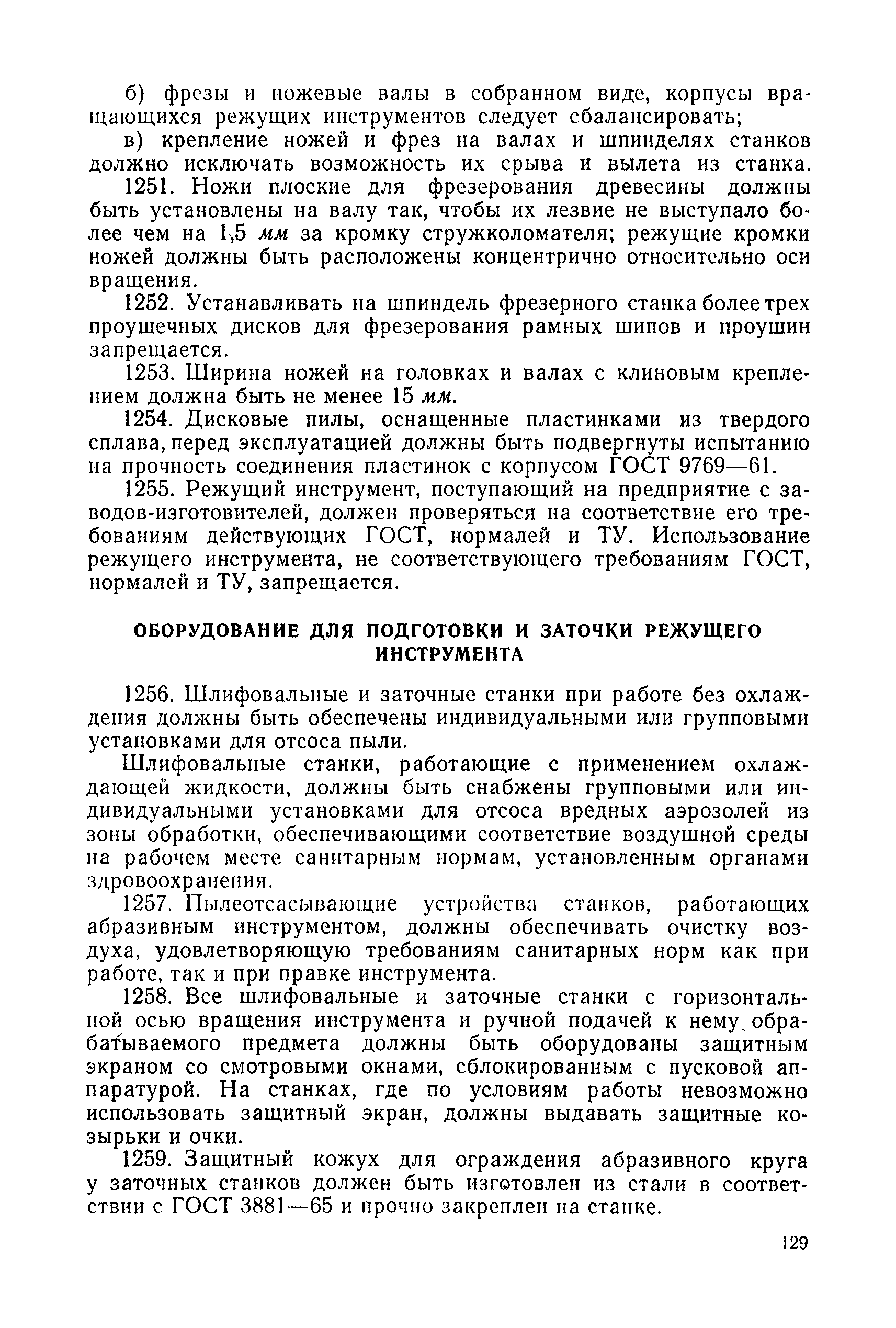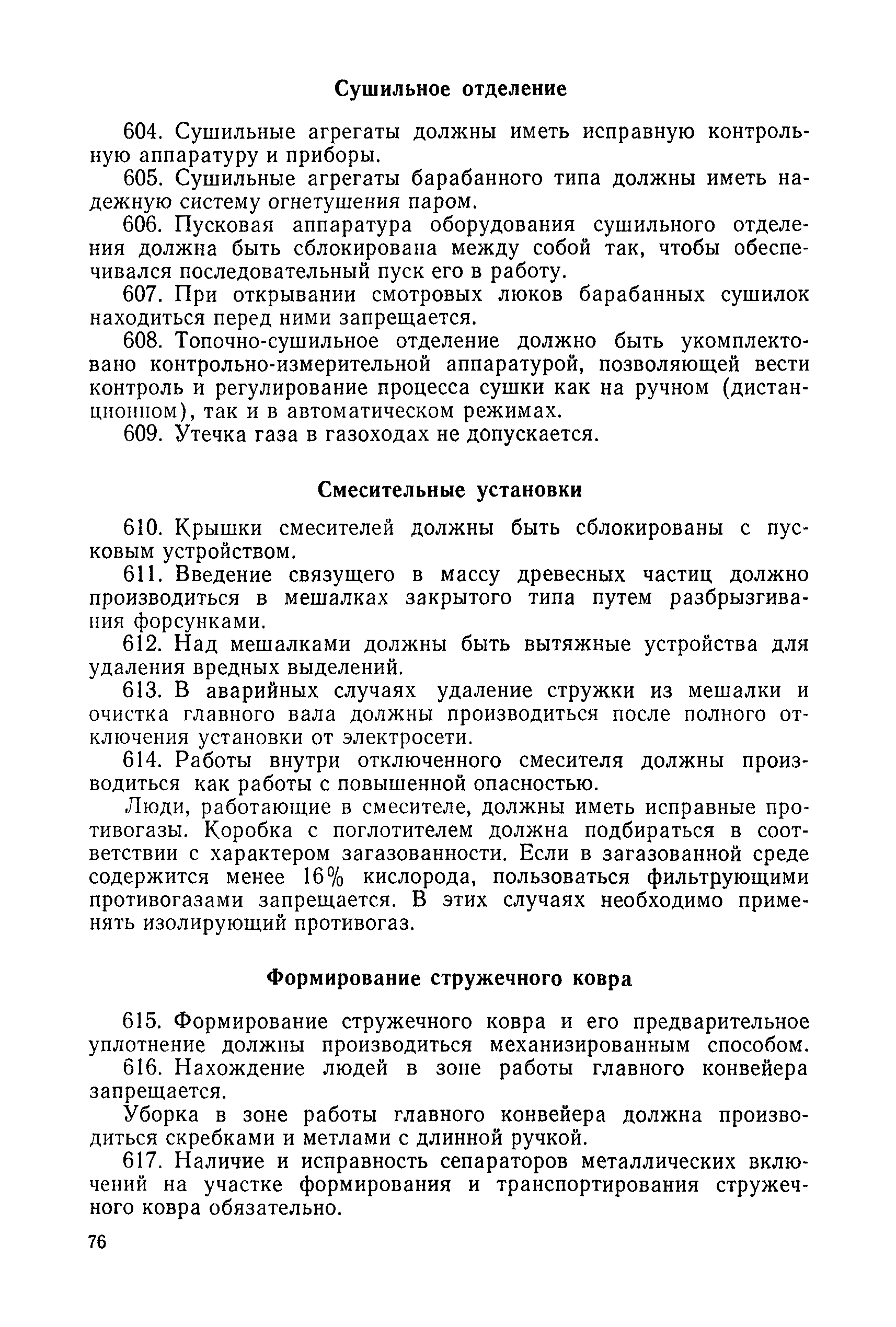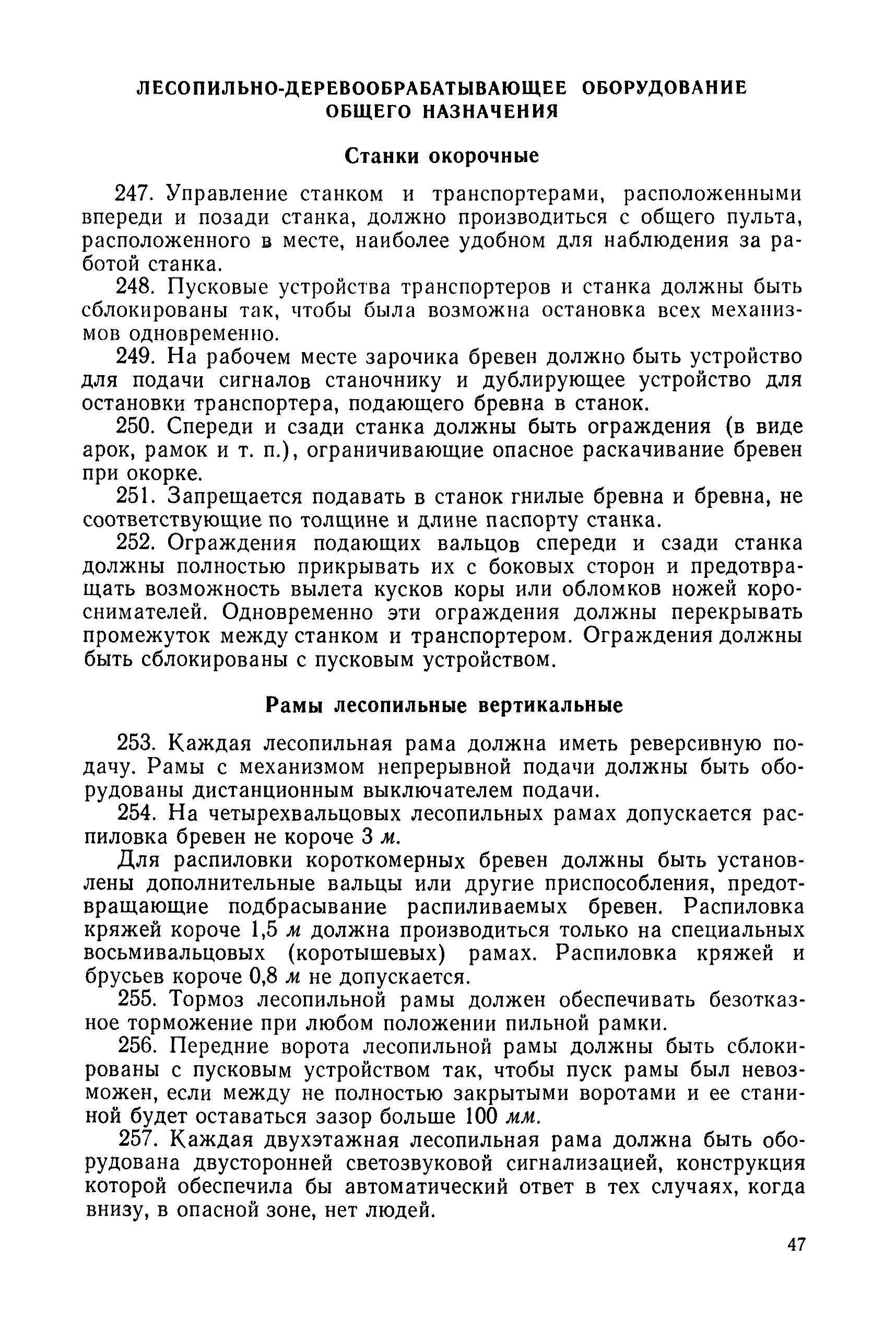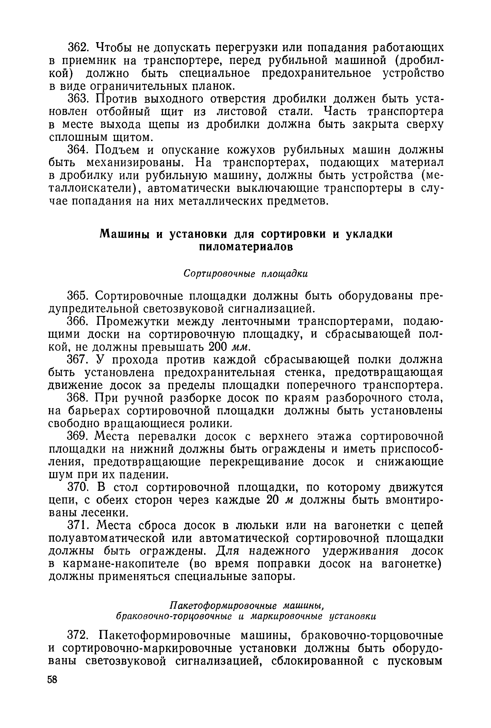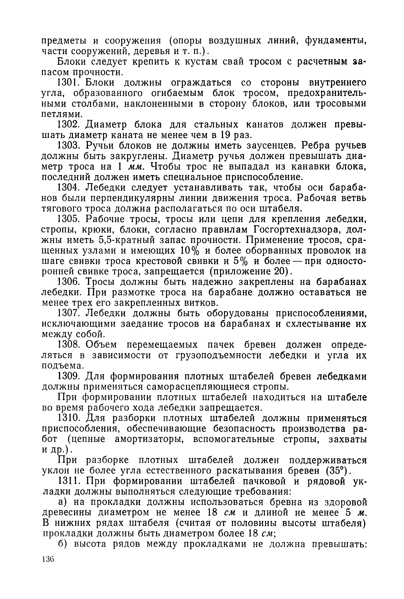 | Оглавление: | I. Общие положения II. Обязанности и ответственность административно-технического персонала III. Обучение и инструктирование рабочих, инженерно-технических работников и служащих IV. Требования к устройству и содержанию территории, зданий и сооружений предприятий V. Требования по устройству, расположению и содержанию оборудования и рабочих мест VI. Оборудование стационарного транспорта. Внутрицеховой и внутризаводской транспорт VII. Требования к оборудованию и технологическим процессам VIII. Инструменты IX. Рейды, бассейны и склады круглых лесоматериалов X. Склады готовой продукции Приложение 1 Перечень официальных руководящих нормативных и общетехнических материалов по технике безопасности и производственной санитарии, применение которых обязательно во всех отраслях промышленности Приложение 2 Методические указания к составлению инструкций по технике безопасности Приложение 3 Структура служб охраны труда в зависимости от числа рабочих Приложение 4 Предписание Приложение 5 Методические указания по созданию и организации работы кабинета охраны труда Приложение 6 Типовые программы инструктажей и курсового обучения рабочих Приложение 7 Журнал регистрации вводного инструктажа по технике безопасности Приложение 8 Удостоверение по технике безопасности Приложение 9 Протокол Приложение 10 Типовая программа для обучения административно-технического персонала Приложение 11 Положение о порядке проверки знаний правил, норм и инструкций по технике безопасности руководящими работниками подведомственных предприятий, организаций и объектов, подконтрольных органам Госгортехнадзора СССР в системе Министерства лесной и деревообрабатывающей промышленности СССР Приложение 12 Предельно допустимые концентрации вредных газов, паров, пыли и других аэрозолей в воздухе рабочей зоны производственных помещений Приложение 13 Состав и нормы санитарно-бытовых помещений Приложение 14 Нормы и сроки испытаний подъемных механизмов и приспособлений Приложение 15 Наименьших допустимый коэффициент запаса прочности канатов и цепей Приложение 16 Нормы и сроки электрических испытаний защитных средств Приложение 17 Классификация производственных помещений по степени взрыво- и пожароопасности с точки зрения применения электрооборудования Приложение 18 Временная инструкция по устройству расходных складов бертолетовой соли и о порядке ее хранения на спичечных фабриках Приложение 19 Нормы браковки стальных канатов Приложение 20 Шкала приближенного определения силы ветра и состояния водной поверхности |