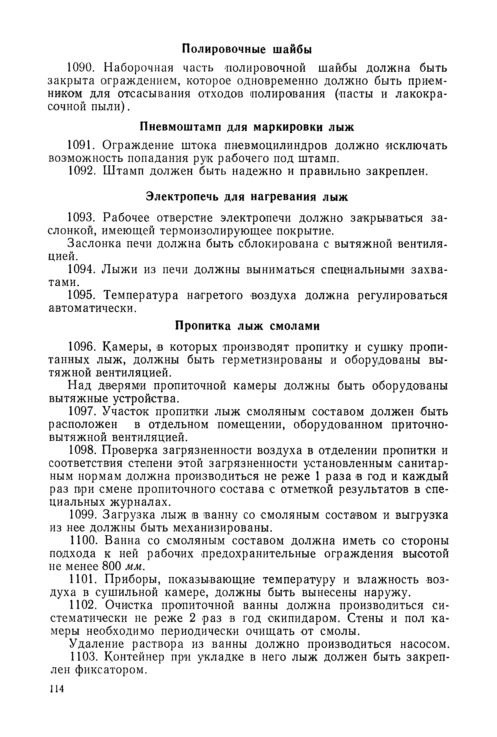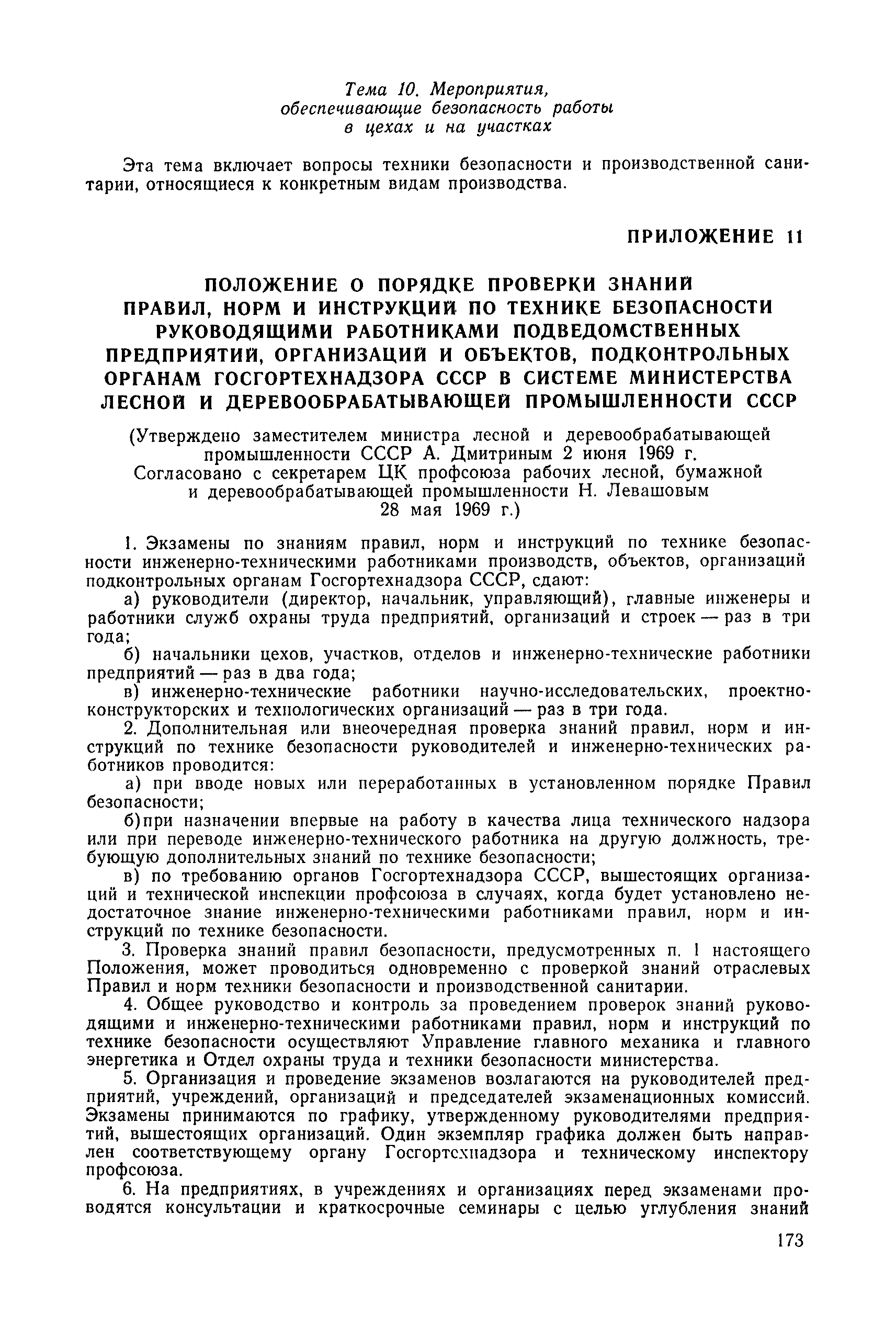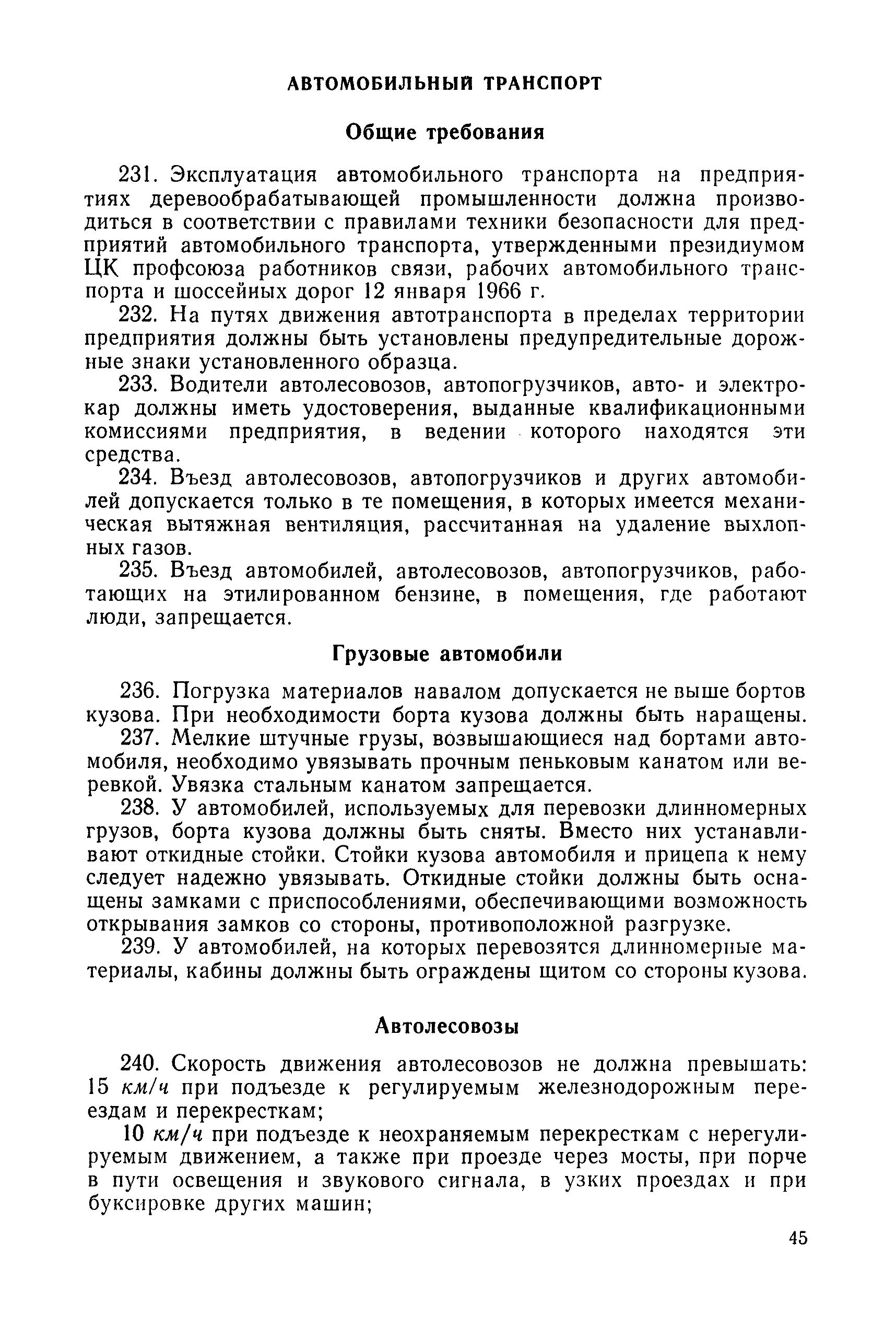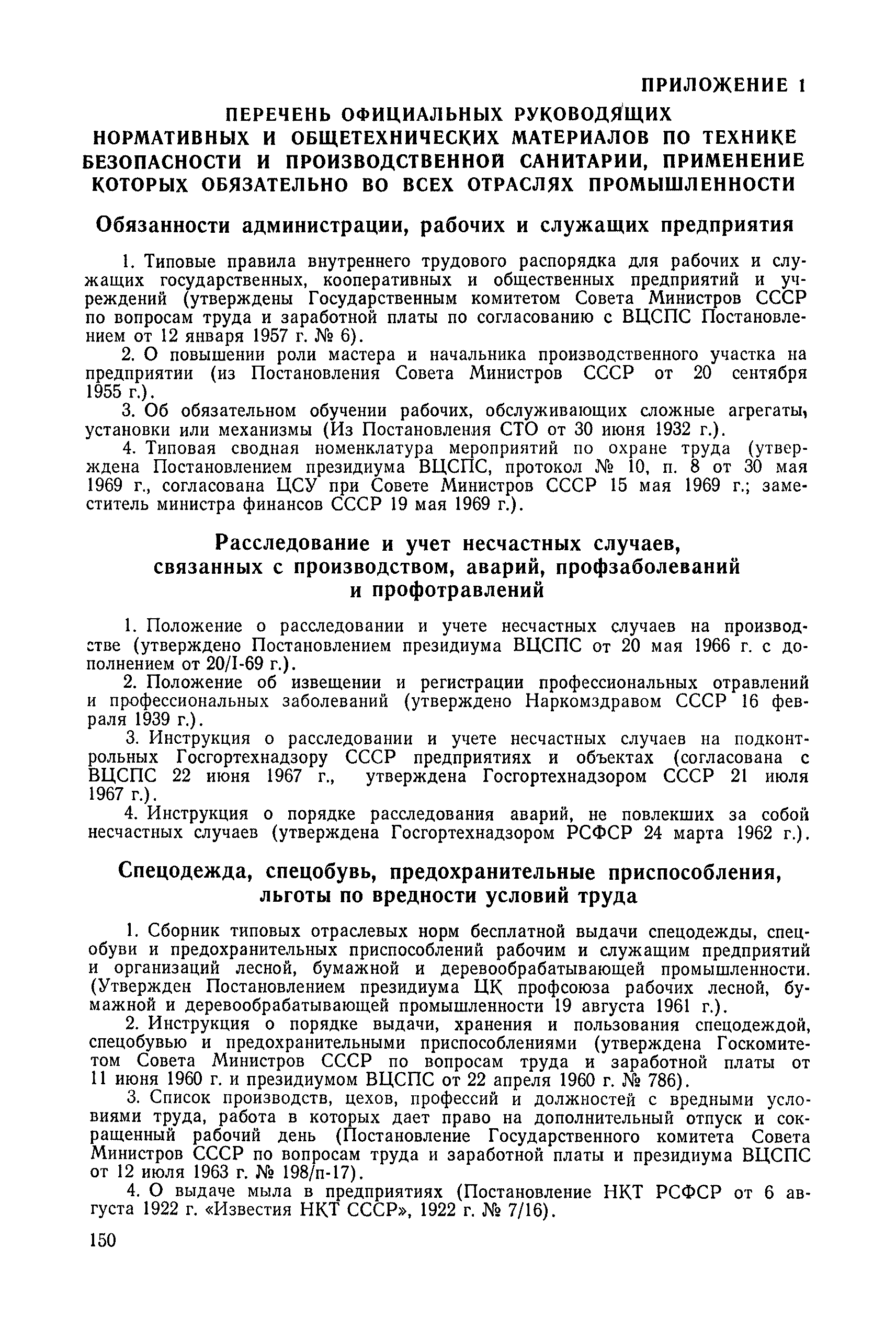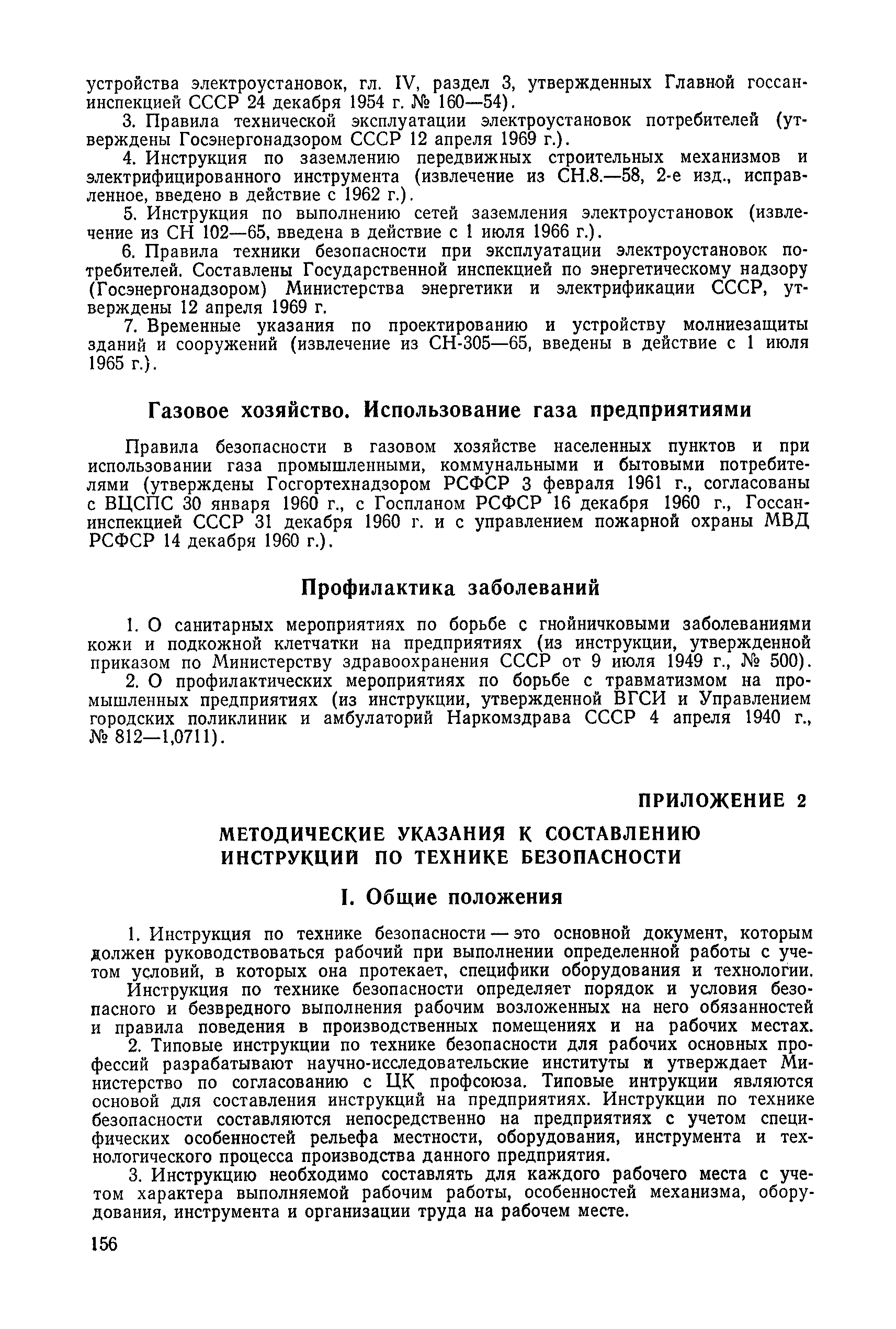 | Оглавление: | I. Общие положения II. Обязанности и ответственность административно-технического персонала III. Обучение и инструктирование рабочих, инженерно-технических работников и служащих IV. Требования к устройству и содержанию территории, зданий и сооружений предприятий V. Требования по устройству, расположению и содержанию оборудования и рабочих мест VI. Оборудование стационарного транспорта. Внутрицеховой и внутризаводской транспорт VII. Требования к оборудованию и технологическим процессам VIII. Инструменты IX. Рейды, бассейны и склады круглых лесоматериалов X. Склады готовой продукции Приложение 1 Перечень официальных руководящих нормативных и общетехнических материалов по технике безопасности и производственной санитарии, применение которых обязательно во всех отраслях промышленности Приложение 2 Методические указания к составлению инструкций по технике безопасности Приложение 3 Структура служб охраны труда в зависимости от числа рабочих Приложение 4 Предписание Приложение 5 Методические указания по созданию и организации работы кабинета охраны труда Приложение 6 Типовые программы инструктажей и курсового обучения рабочих Приложение 7 Журнал регистрации вводного инструктажа по технике безопасности Приложение 8 Удостоверение по технике безопасности Приложение 9 Протокол Приложение 10 Типовая программа для обучения административно-технического персонала Приложение 11 Положение о порядке проверки знаний правил, норм и инструкций по технике безопасности руководящими работниками подведомственных предприятий, организаций и объектов, подконтрольных органам Госгортехнадзора СССР в системе Министерства лесной и деревообрабатывающей промышленности СССР Приложение 12 Предельно допустимые концентрации вредных газов, паров, пыли и других аэрозолей в воздухе рабочей зоны производственных помещений Приложение 13 Состав и нормы санитарно-бытовых помещений Приложение 14 Нормы и сроки испытаний подъемных механизмов и приспособлений Приложение 15 Наименьших допустимый коэффициент запаса прочности канатов и цепей Приложение 16 Нормы и сроки электрических испытаний защитных средств Приложение 17 Классификация производственных помещений по степени взрыво- и пожароопасности с точки зрения применения электрооборудования Приложение 18 Временная инструкция по устройству расходных складов бертолетовой соли и о порядке ее хранения на спичечных фабриках Приложение 19 Нормы браковки стальных канатов Приложение 20 Шкала приближенного определения силы ветра и состояния водной поверхности |