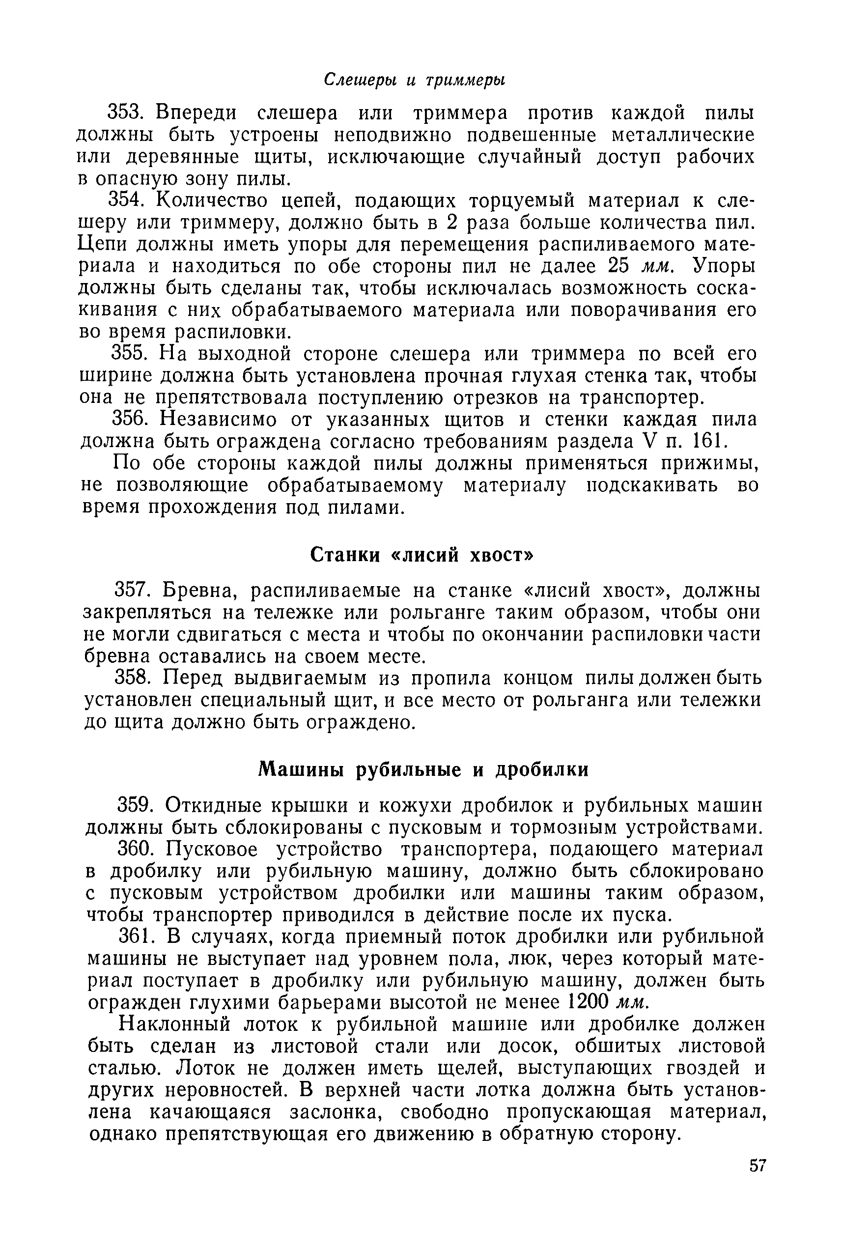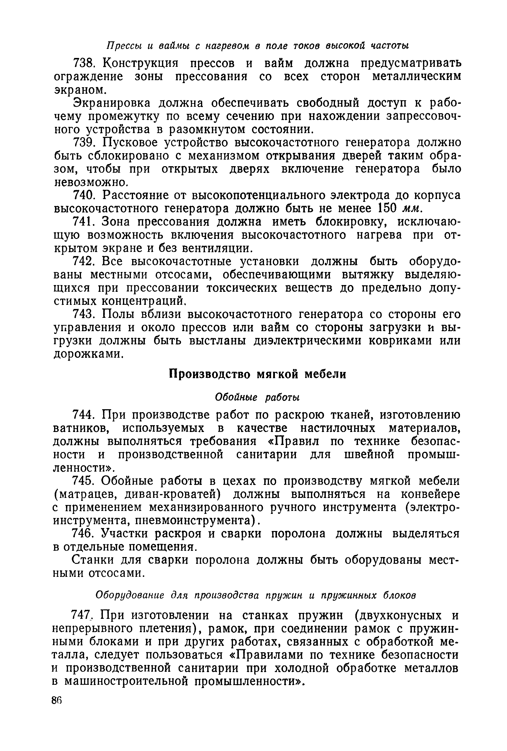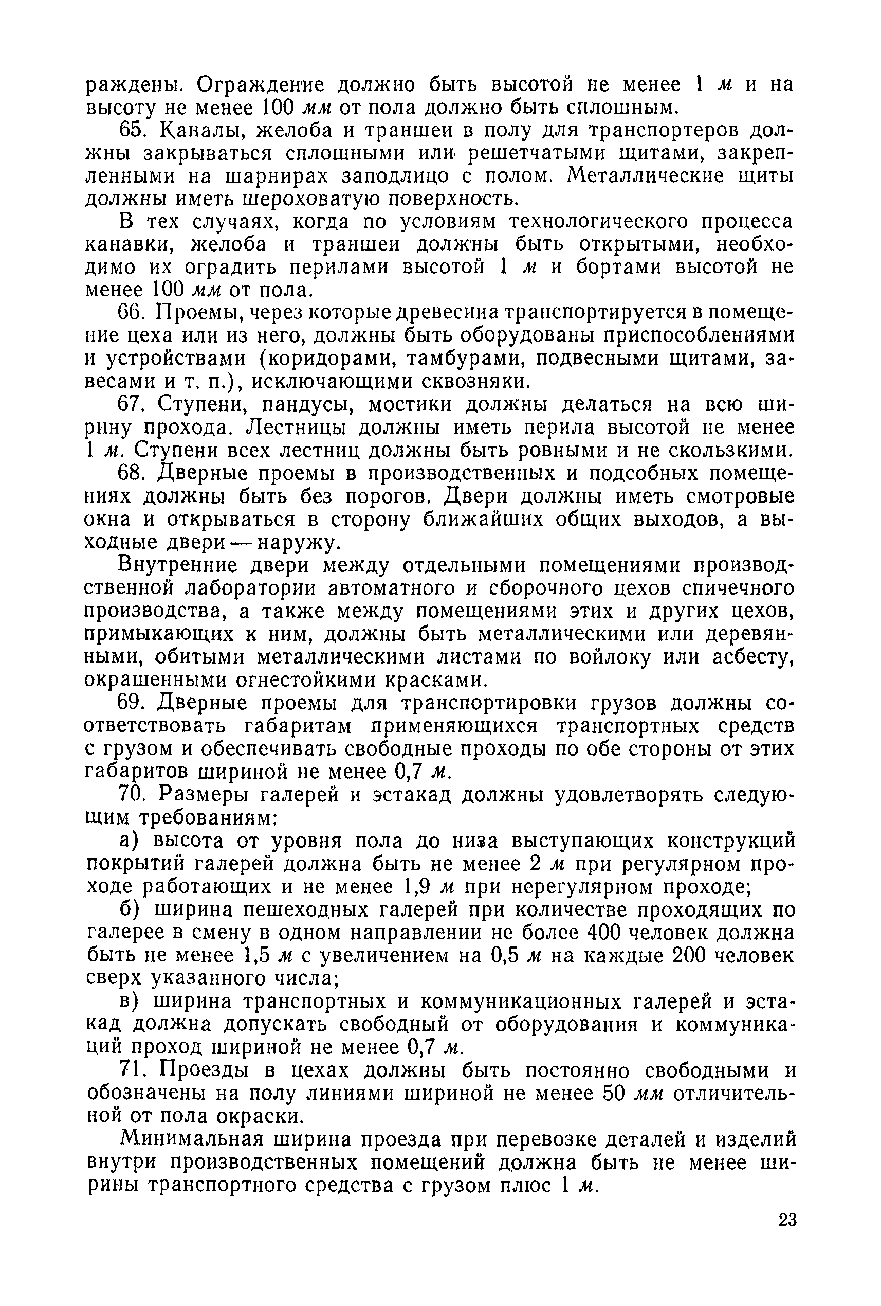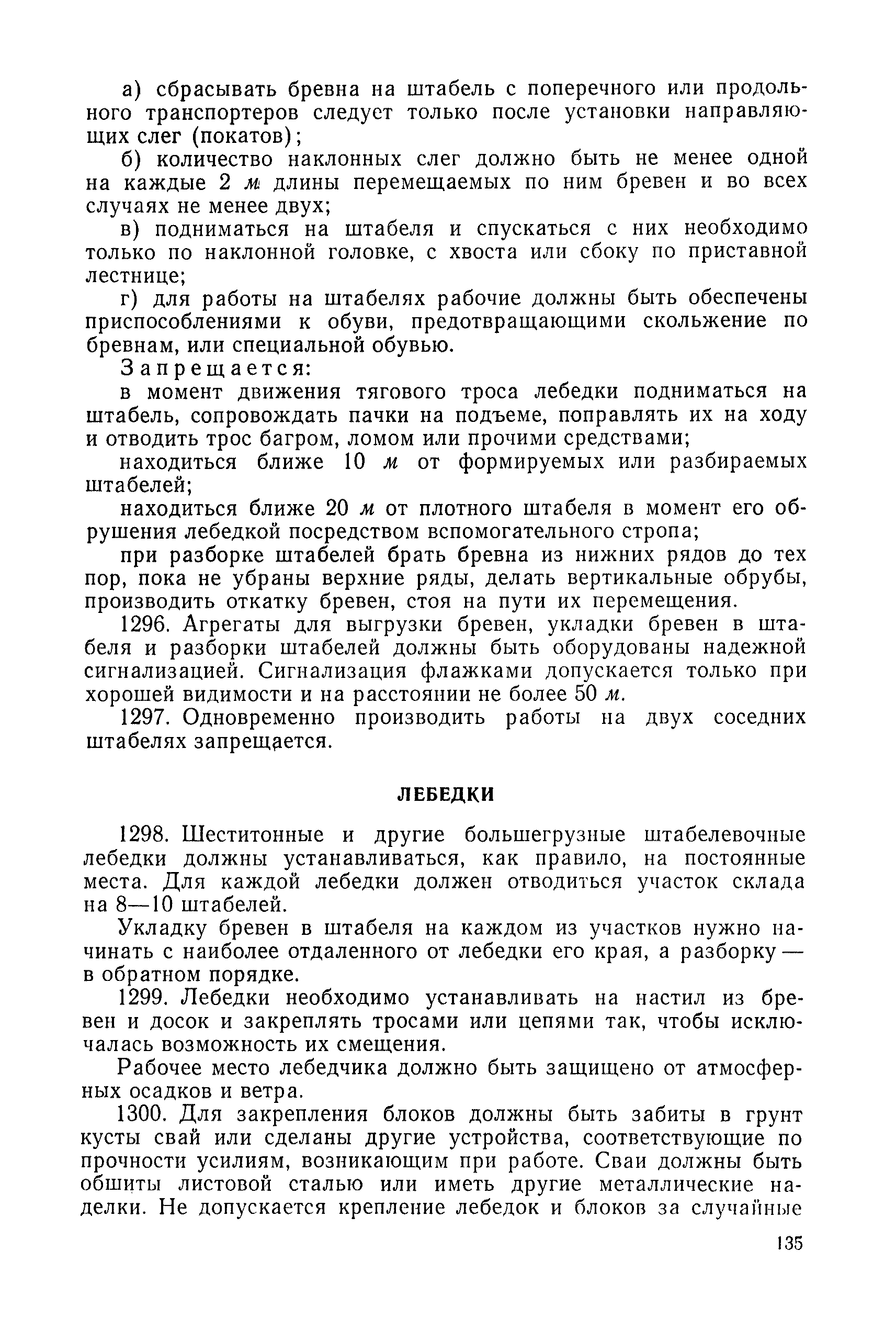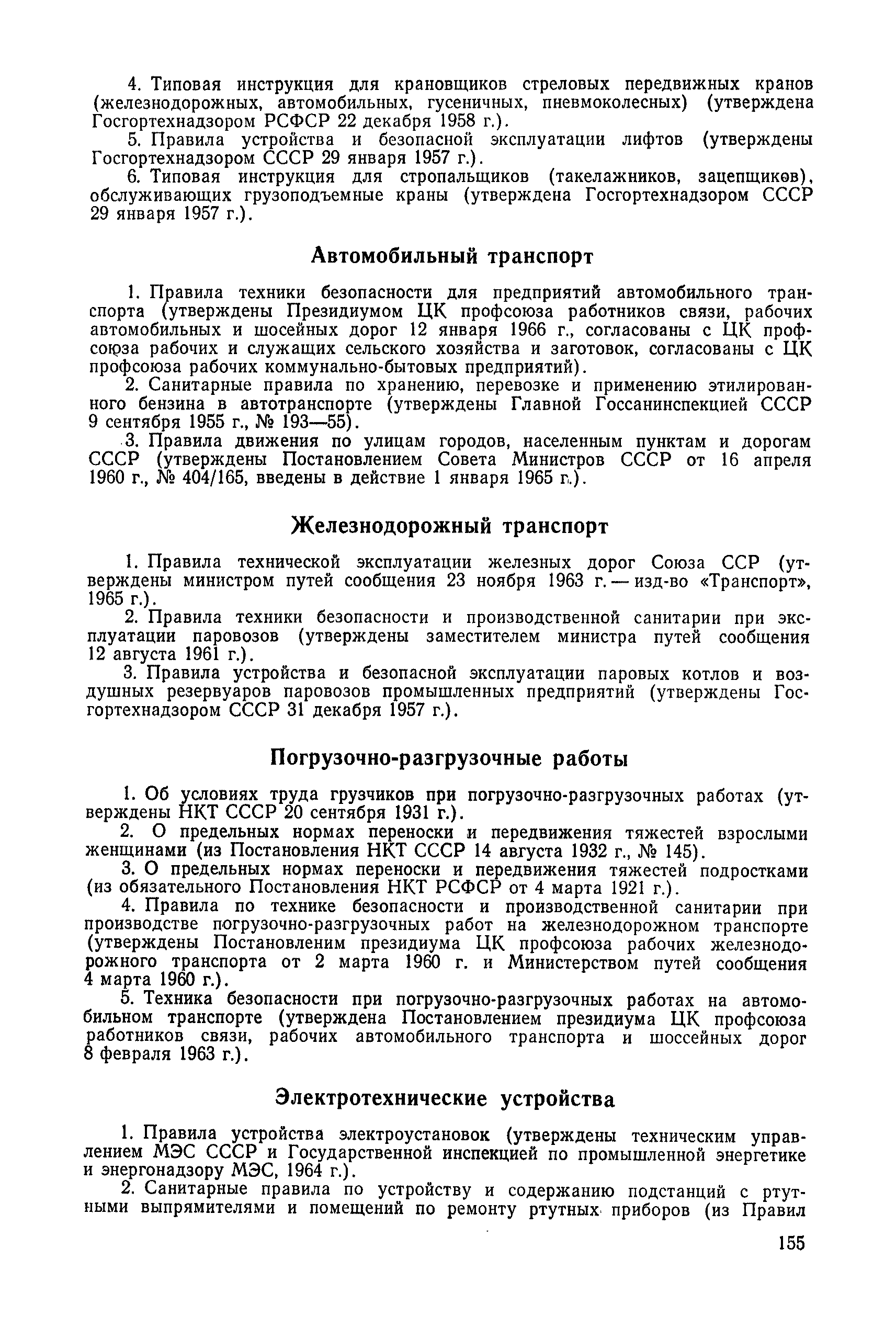 | Оглавление: | I. Общие положения II. Обязанности и ответственность административно-технического персонала III. Обучение и инструктирование рабочих, инженерно-технических работников и служащих IV. Требования к устройству и содержанию территории, зданий и сооружений предприятий V. Требования по устройству, расположению и содержанию оборудования и рабочих мест VI. Оборудование стационарного транспорта. Внутрицеховой и внутризаводской транспорт VII. Требования к оборудованию и технологическим процессам VIII. Инструменты IX. Рейды, бассейны и склады круглых лесоматериалов X. Склады готовой продукции Приложение 1 Перечень официальных руководящих нормативных и общетехнических материалов по технике безопасности и производственной санитарии, применение которых обязательно во всех отраслях промышленности Приложение 2 Методические указания к составлению инструкций по технике безопасности Приложение 3 Структура служб охраны труда в зависимости от числа рабочих Приложение 4 Предписание Приложение 5 Методические указания по созданию и организации работы кабинета охраны труда Приложение 6 Типовые программы инструктажей и курсового обучения рабочих Приложение 7 Журнал регистрации вводного инструктажа по технике безопасности Приложение 8 Удостоверение по технике безопасности Приложение 9 Протокол Приложение 10 Типовая программа для обучения административно-технического персонала Приложение 11 Положение о порядке проверки знаний правил, норм и инструкций по технике безопасности руководящими работниками подведомственных предприятий, организаций и объектов, подконтрольных органам Госгортехнадзора СССР в системе Министерства лесной и деревообрабатывающей промышленности СССР Приложение 12 Предельно допустимые концентрации вредных газов, паров, пыли и других аэрозолей в воздухе рабочей зоны производственных помещений Приложение 13 Состав и нормы санитарно-бытовых помещений Приложение 14 Нормы и сроки испытаний подъемных механизмов и приспособлений Приложение 15 Наименьших допустимый коэффициент запаса прочности канатов и цепей Приложение 16 Нормы и сроки электрических испытаний защитных средств Приложение 17 Классификация производственных помещений по степени взрыво- и пожароопасности с точки зрения применения электрооборудования Приложение 18 Временная инструкция по устройству расходных складов бертолетовой соли и о порядке ее хранения на спичечных фабриках Приложение 19 Нормы браковки стальных канатов Приложение 20 Шкала приближенного определения силы ветра и состояния водной поверхности |