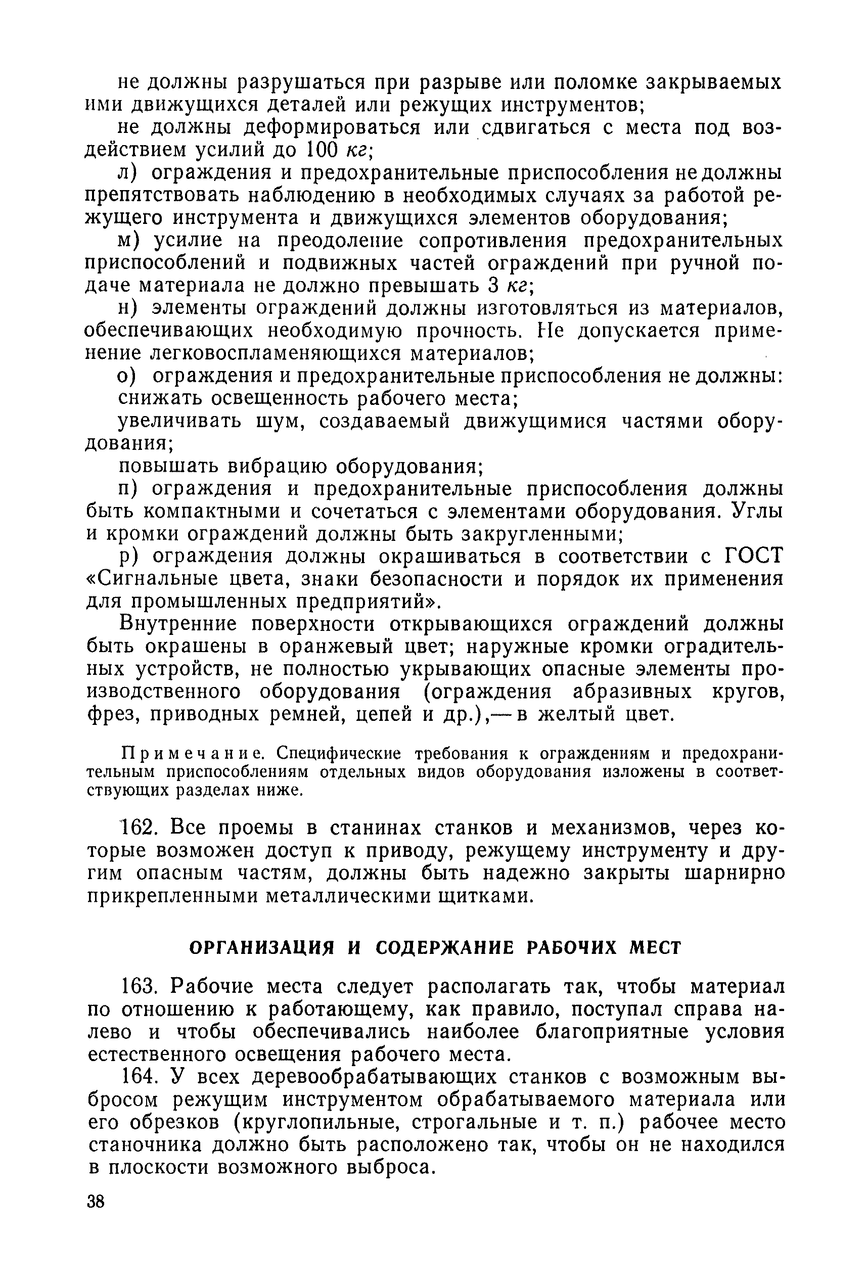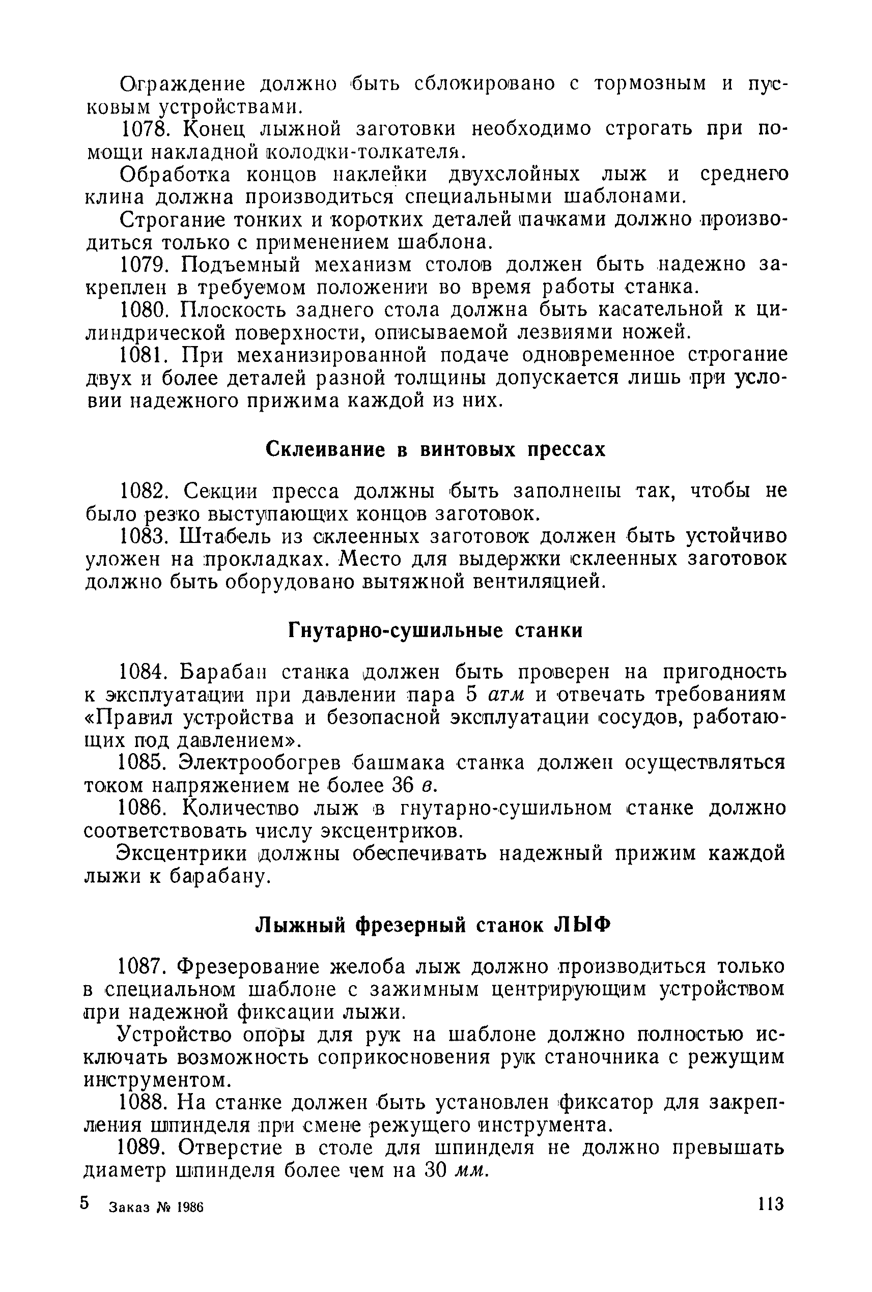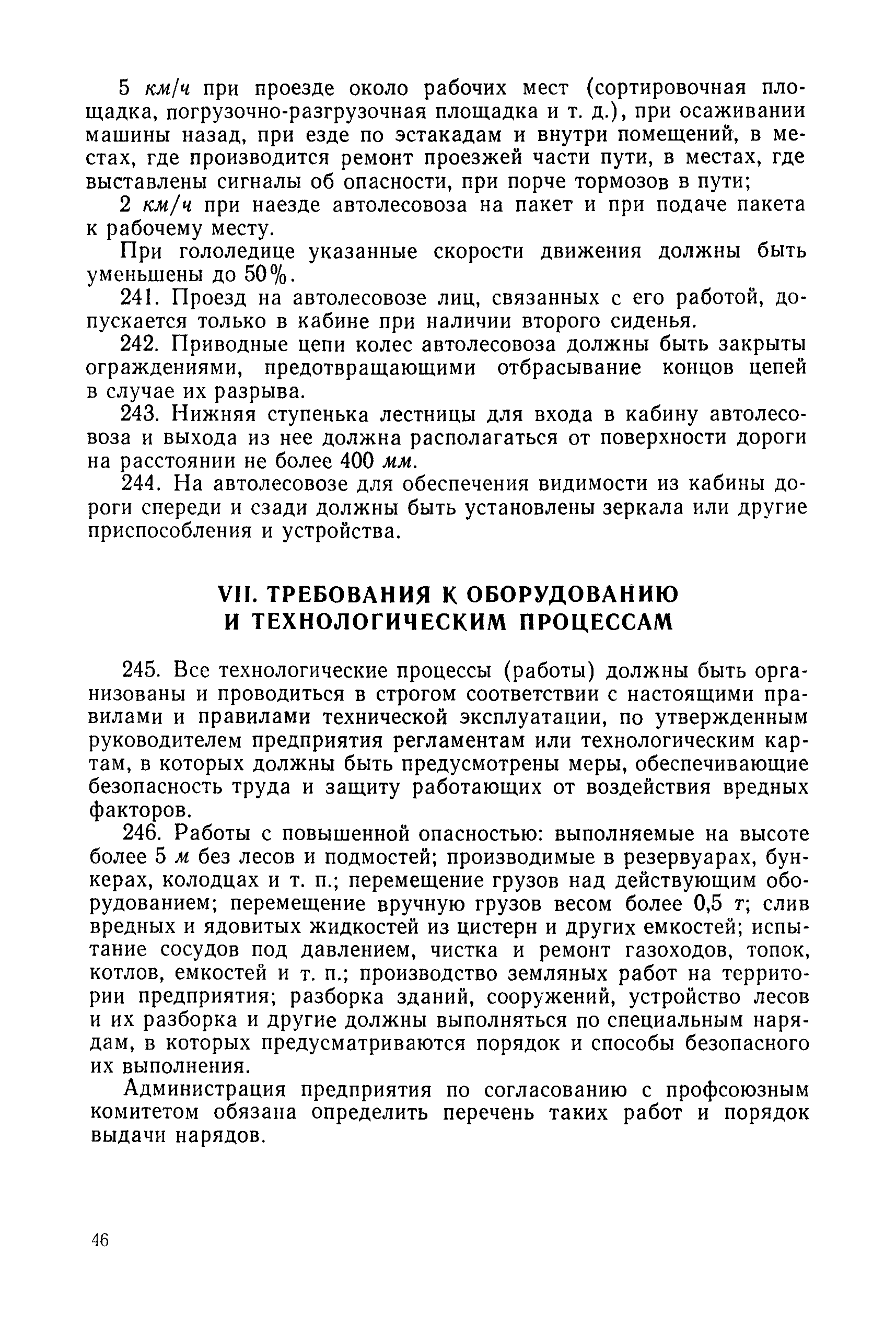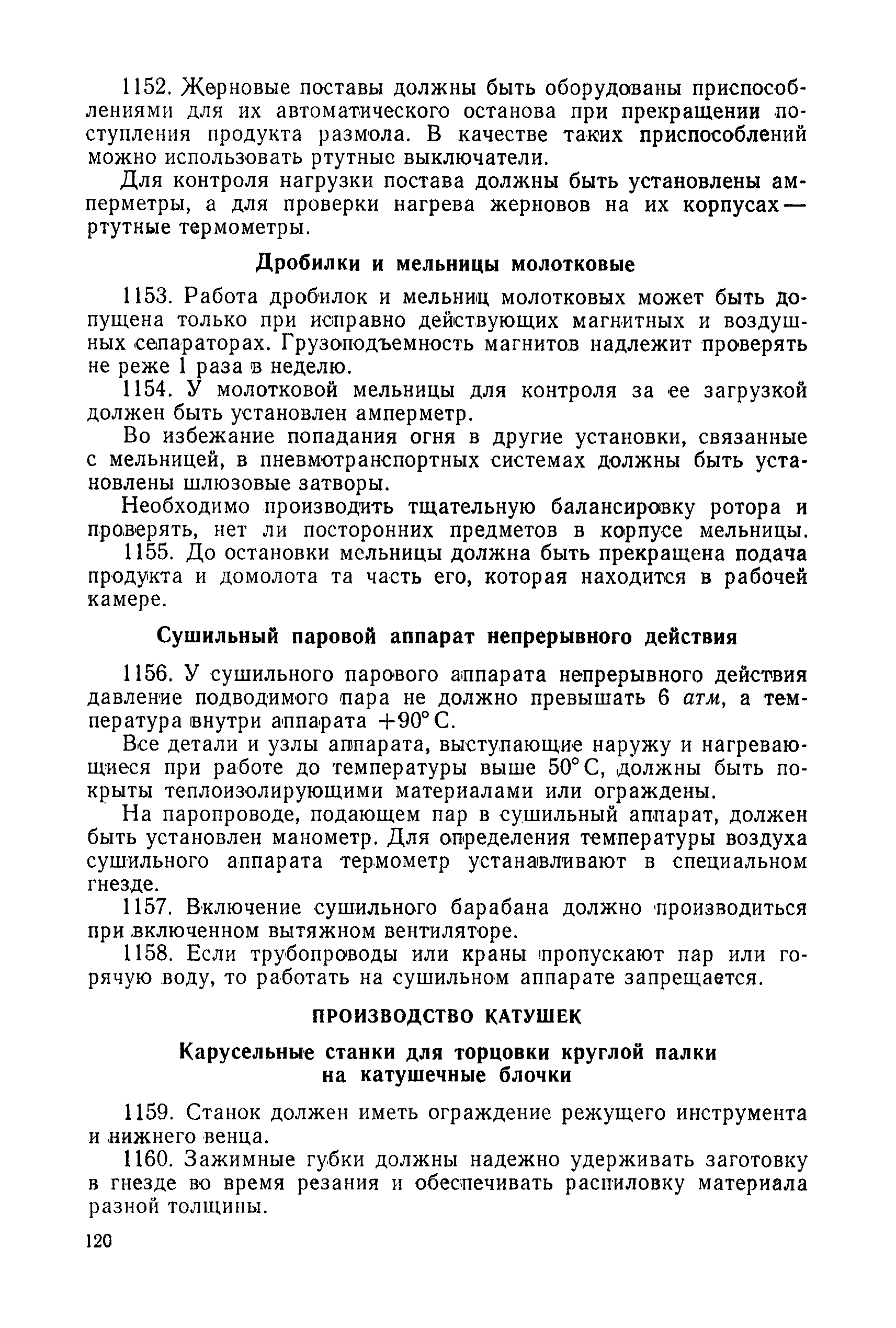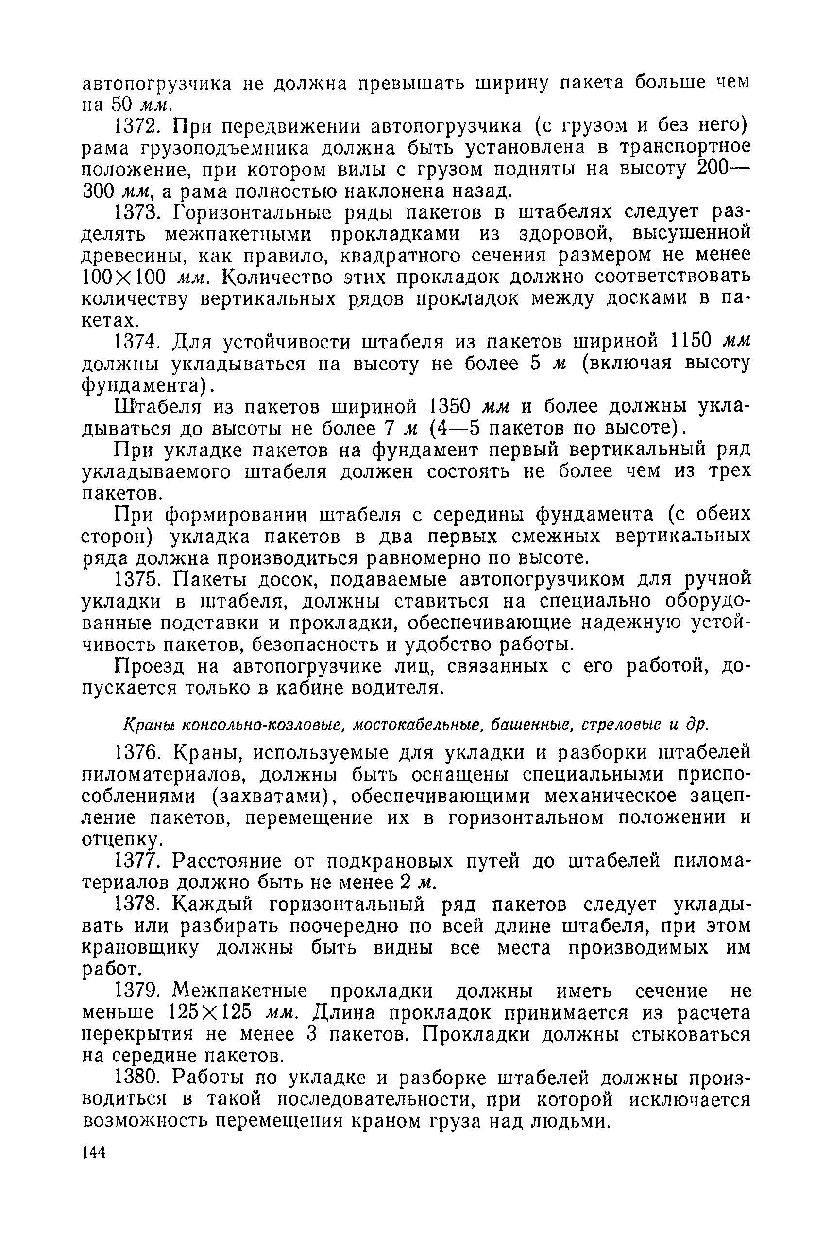 | Оглавление: | I. Общие положения II. Обязанности и ответственность административно-технического персонала III. Обучение и инструктирование рабочих, инженерно-технических работников и служащих IV. Требования к устройству и содержанию территории, зданий и сооружений предприятий V. Требования по устройству, расположению и содержанию оборудования и рабочих мест VI. Оборудование стационарного транспорта. Внутрицеховой и внутризаводской транспорт VII. Требования к оборудованию и технологическим процессам VIII. Инструменты IX. Рейды, бассейны и склады круглых лесоматериалов X. Склады готовой продукции Приложение 1 Перечень официальных руководящих нормативных и общетехнических материалов по технике безопасности и производственной санитарии, применение которых обязательно во всех отраслях промышленности Приложение 2 Методические указания к составлению инструкций по технике безопасности Приложение 3 Структура служб охраны труда в зависимости от числа рабочих Приложение 4 Предписание Приложение 5 Методические указания по созданию и организации работы кабинета охраны труда Приложение 6 Типовые программы инструктажей и курсового обучения рабочих Приложение 7 Журнал регистрации вводного инструктажа по технике безопасности Приложение 8 Удостоверение по технике безопасности Приложение 9 Протокол Приложение 10 Типовая программа для обучения административно-технического персонала Приложение 11 Положение о порядке проверки знаний правил, норм и инструкций по технике безопасности руководящими работниками подведомственных предприятий, организаций и объектов, подконтрольных органам Госгортехнадзора СССР в системе Министерства лесной и деревообрабатывающей промышленности СССР Приложение 12 Предельно допустимые концентрации вредных газов, паров, пыли и других аэрозолей в воздухе рабочей зоны производственных помещений Приложение 13 Состав и нормы санитарно-бытовых помещений Приложение 14 Нормы и сроки испытаний подъемных механизмов и приспособлений Приложение 15 Наименьших допустимый коэффициент запаса прочности канатов и цепей Приложение 16 Нормы и сроки электрических испытаний защитных средств Приложение 17 Классификация производственных помещений по степени взрыво- и пожароопасности с точки зрения применения электрооборудования Приложение 18 Временная инструкция по устройству расходных складов бертолетовой соли и о порядке ее хранения на спичечных фабриках Приложение 19 Нормы браковки стальных канатов Приложение 20 Шкала приближенного определения силы ветра и состояния водной поверхности |