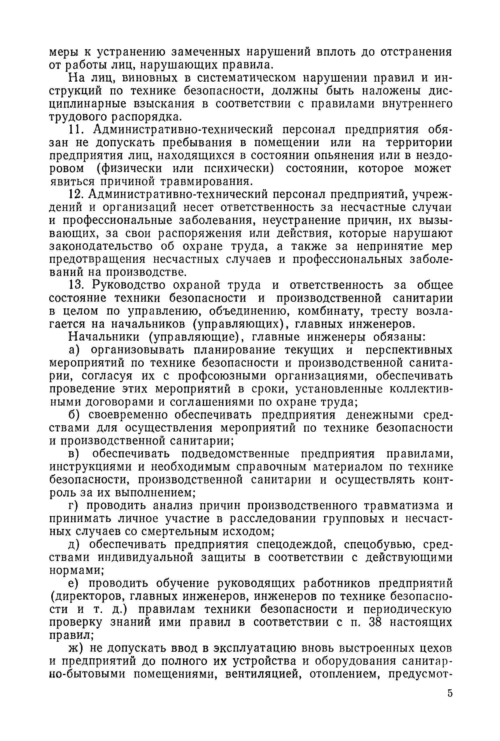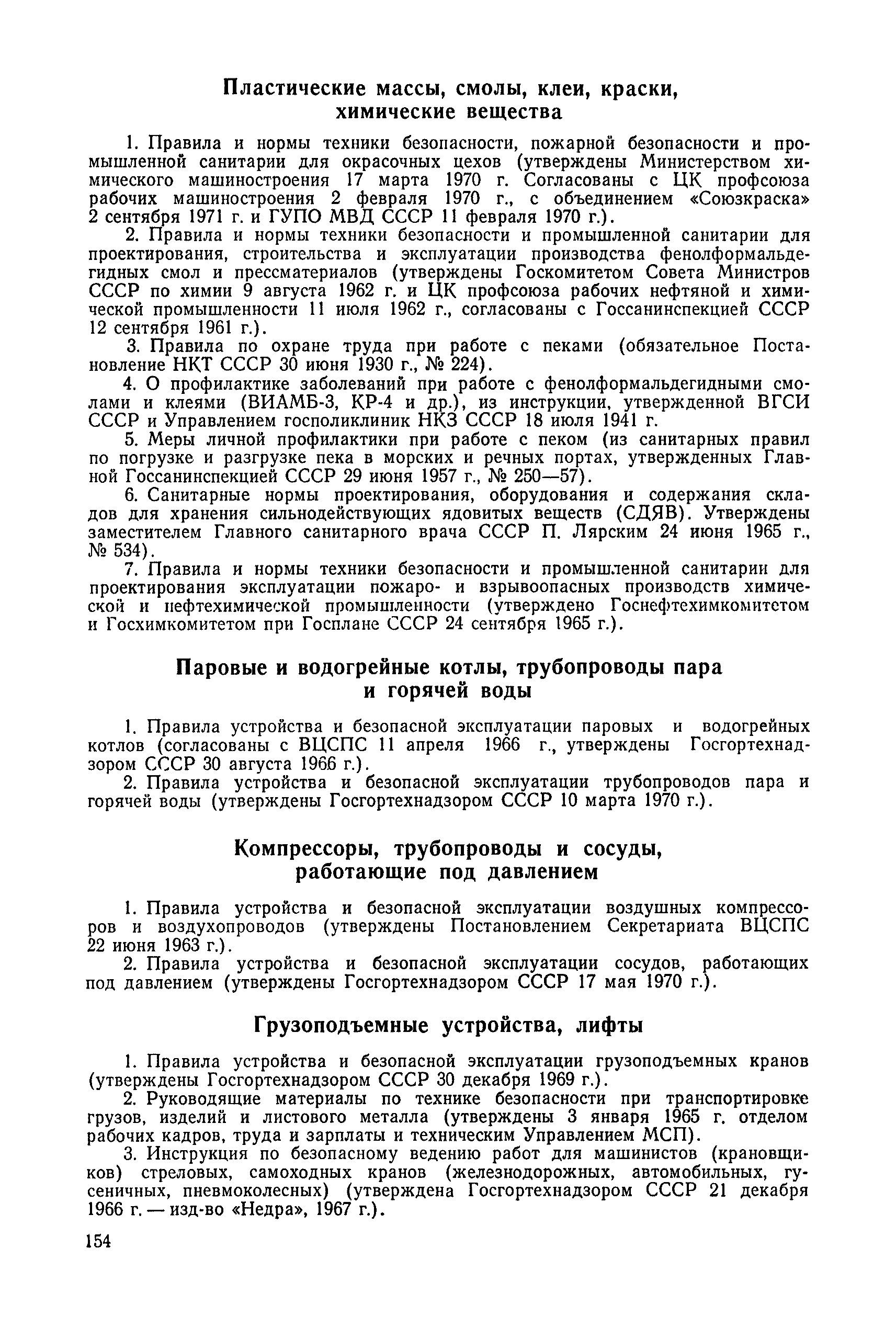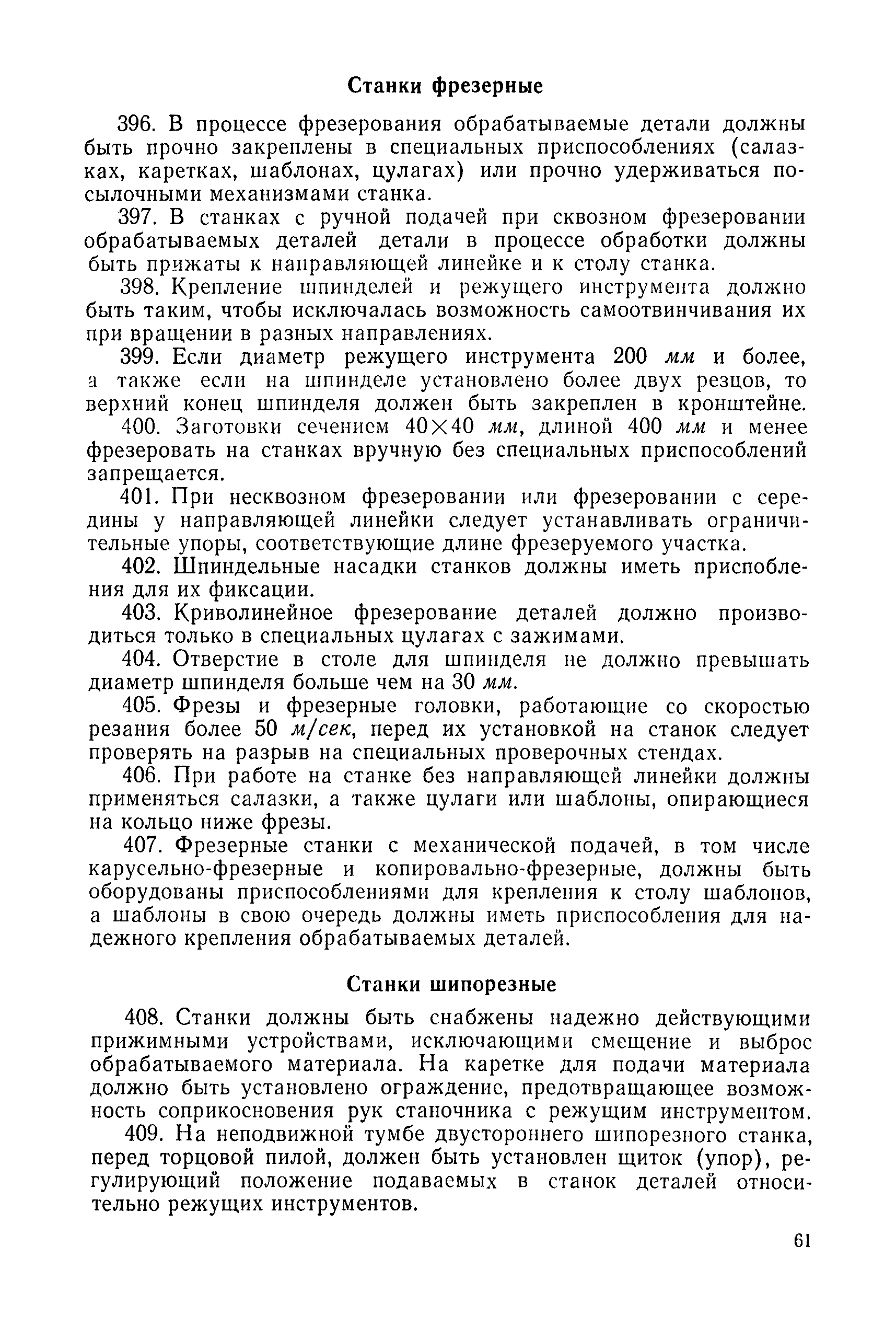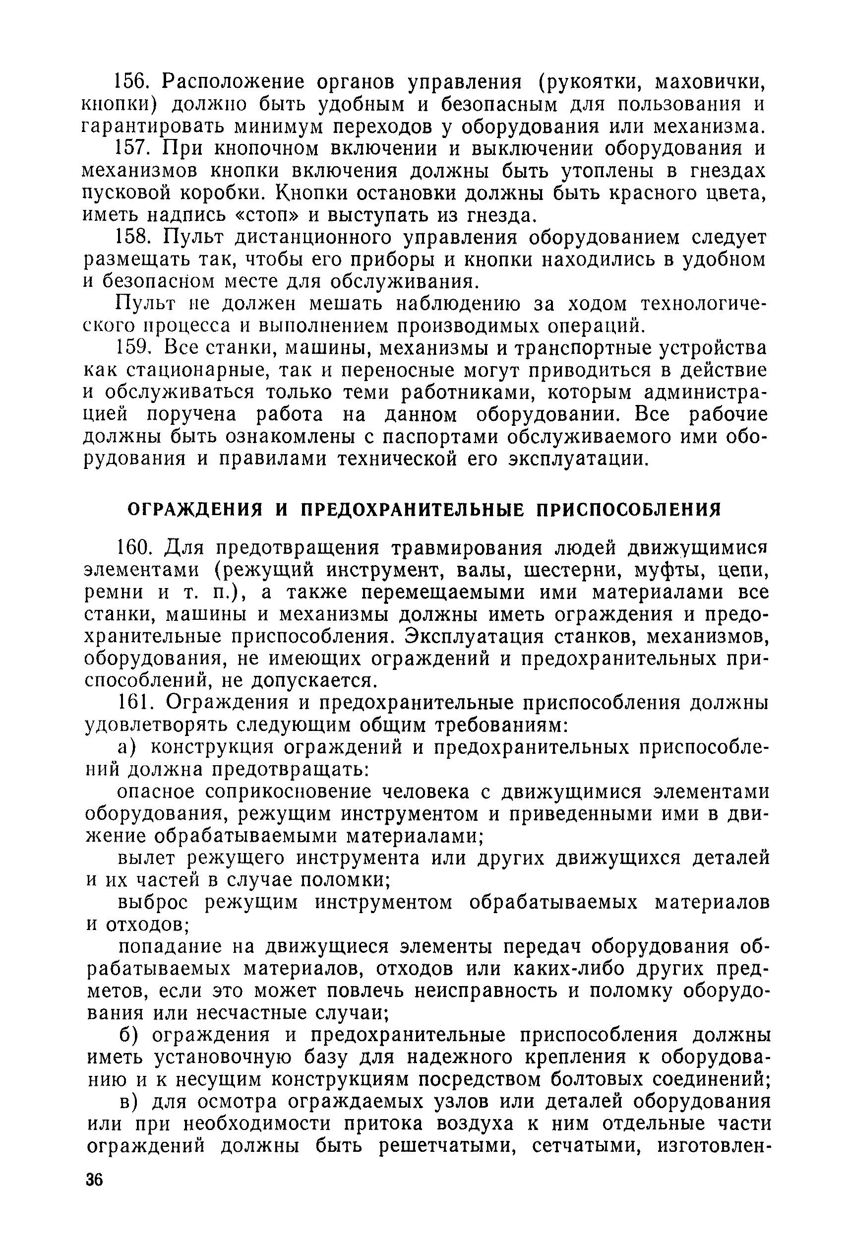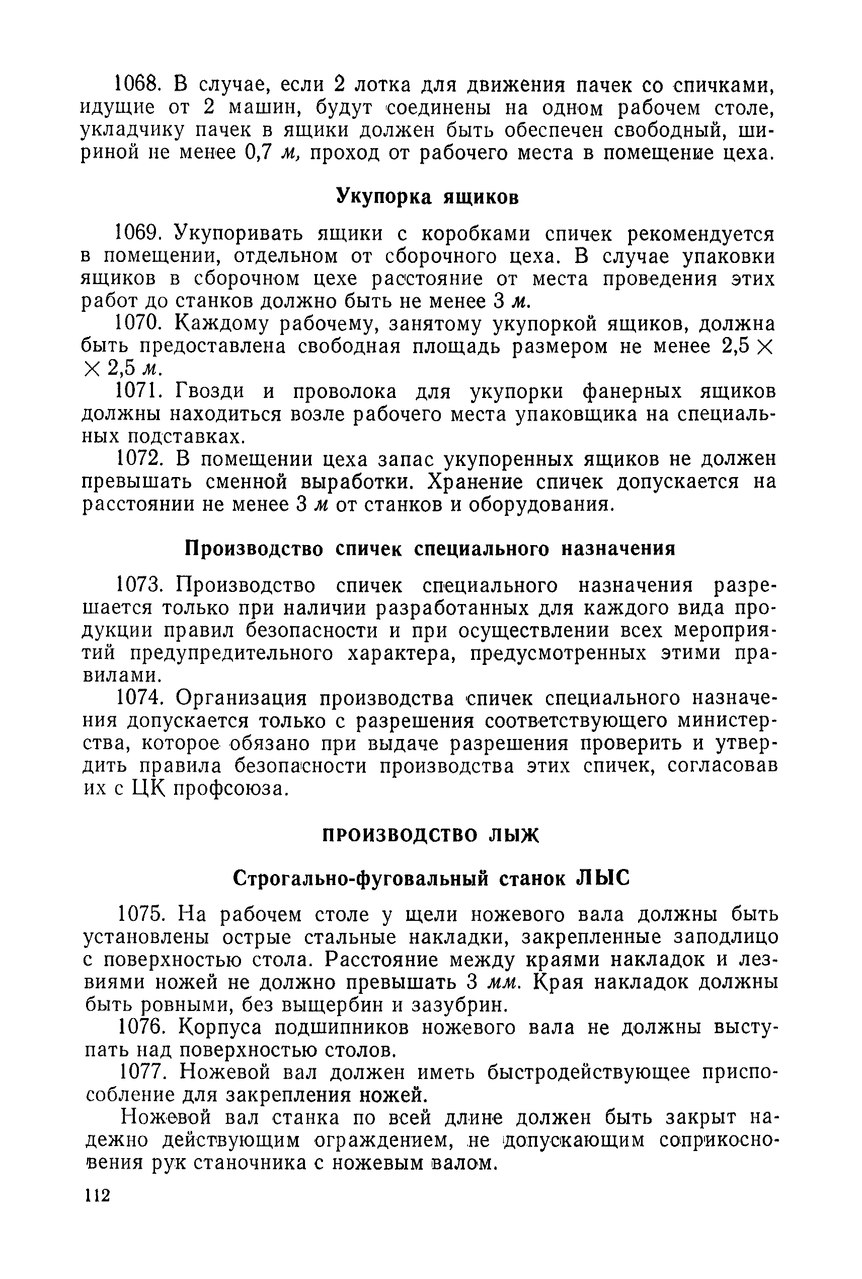 | Оглавление: | I. Общие положения II. Обязанности и ответственность административно-технического персонала III. Обучение и инструктирование рабочих, инженерно-технических работников и служащих IV. Требования к устройству и содержанию территории, зданий и сооружений предприятий V. Требования по устройству, расположению и содержанию оборудования и рабочих мест VI. Оборудование стационарного транспорта. Внутрицеховой и внутризаводской транспорт VII. Требования к оборудованию и технологическим процессам VIII. Инструменты IX. Рейды, бассейны и склады круглых лесоматериалов X. Склады готовой продукции Приложение 1 Перечень официальных руководящих нормативных и общетехнических материалов по технике безопасности и производственной санитарии, применение которых обязательно во всех отраслях промышленности Приложение 2 Методические указания к составлению инструкций по технике безопасности Приложение 3 Структура служб охраны труда в зависимости от числа рабочих Приложение 4 Предписание Приложение 5 Методические указания по созданию и организации работы кабинета охраны труда Приложение 6 Типовые программы инструктажей и курсового обучения рабочих Приложение 7 Журнал регистрации вводного инструктажа по технике безопасности Приложение 8 Удостоверение по технике безопасности Приложение 9 Протокол Приложение 10 Типовая программа для обучения административно-технического персонала Приложение 11 Положение о порядке проверки знаний правил, норм и инструкций по технике безопасности руководящими работниками подведомственных предприятий, организаций и объектов, подконтрольных органам Госгортехнадзора СССР в системе Министерства лесной и деревообрабатывающей промышленности СССР Приложение 12 Предельно допустимые концентрации вредных газов, паров, пыли и других аэрозолей в воздухе рабочей зоны производственных помещений Приложение 13 Состав и нормы санитарно-бытовых помещений Приложение 14 Нормы и сроки испытаний подъемных механизмов и приспособлений Приложение 15 Наименьших допустимый коэффициент запаса прочности канатов и цепей Приложение 16 Нормы и сроки электрических испытаний защитных средств Приложение 17 Классификация производственных помещений по степени взрыво- и пожароопасности с точки зрения применения электрооборудования Приложение 18 Временная инструкция по устройству расходных складов бертолетовой соли и о порядке ее хранения на спичечных фабриках Приложение 19 Нормы браковки стальных канатов Приложение 20 Шкала приближенного определения силы ветра и состояния водной поверхности |